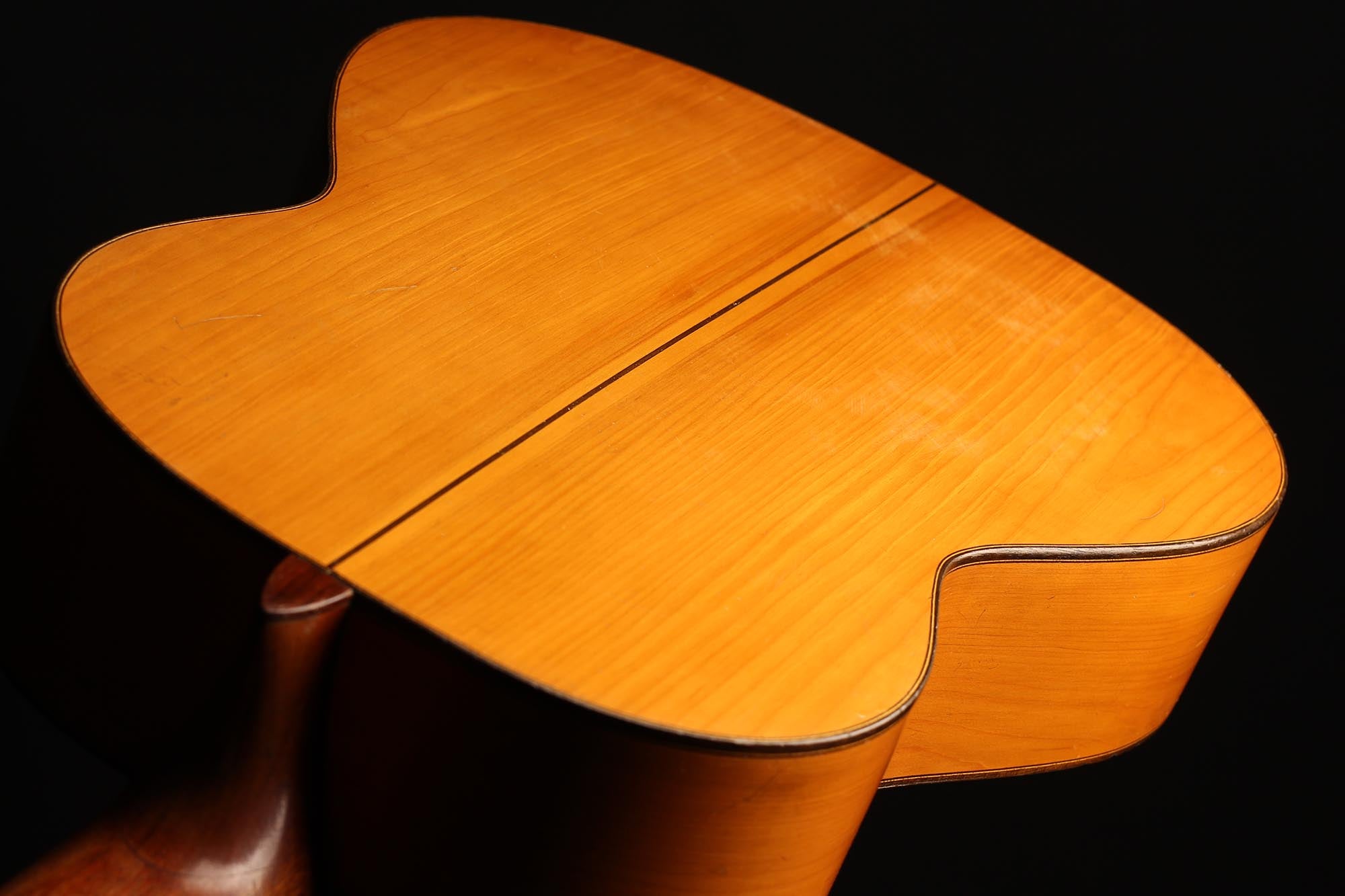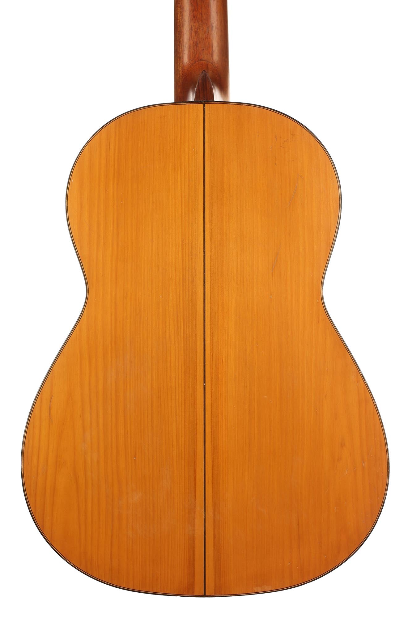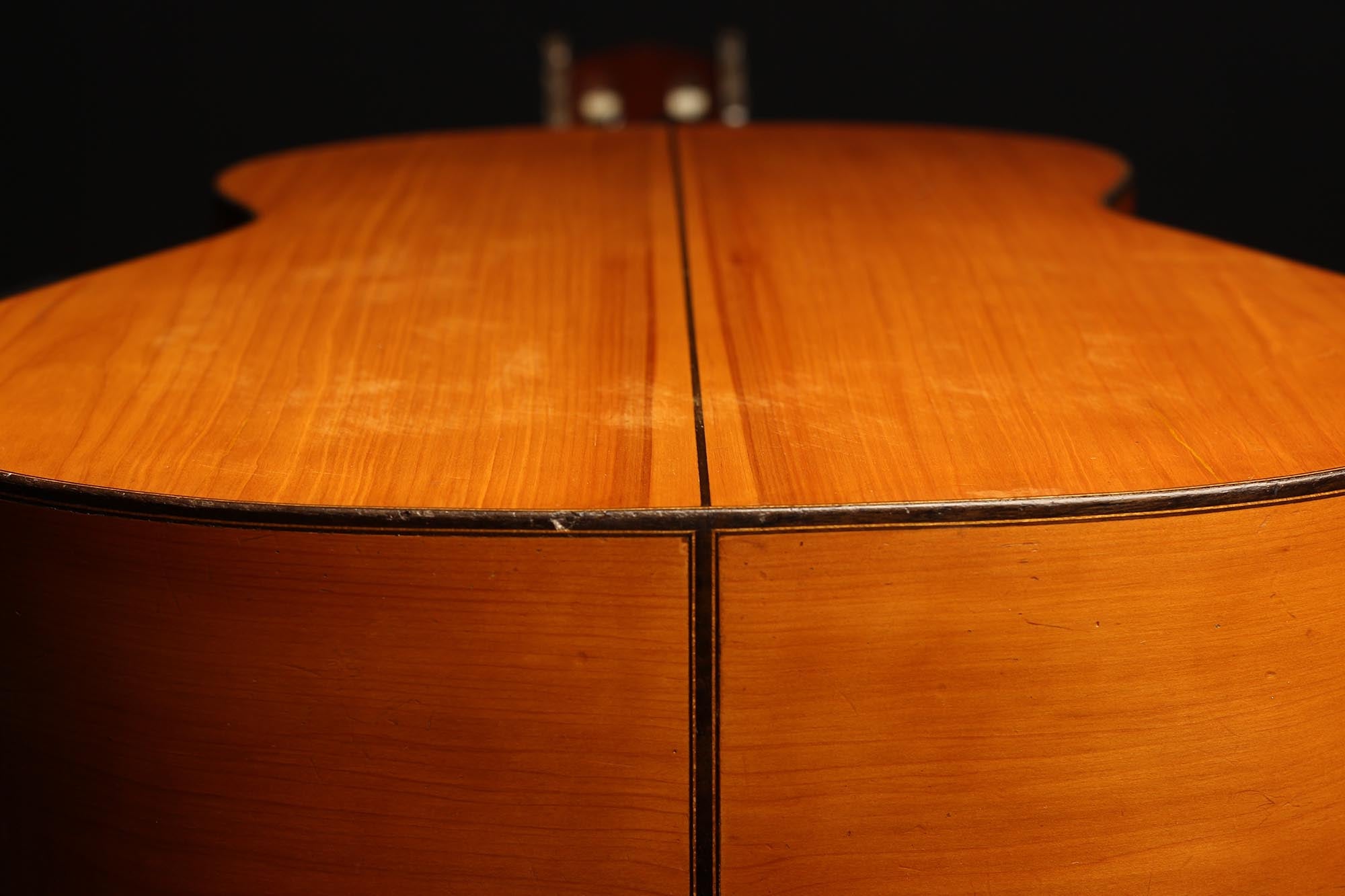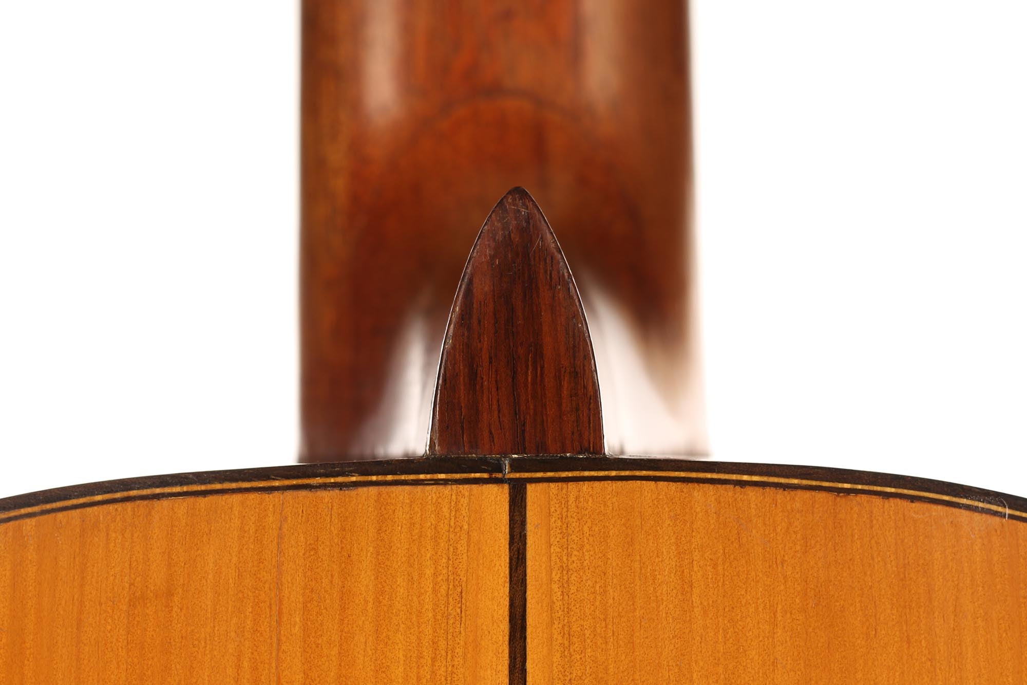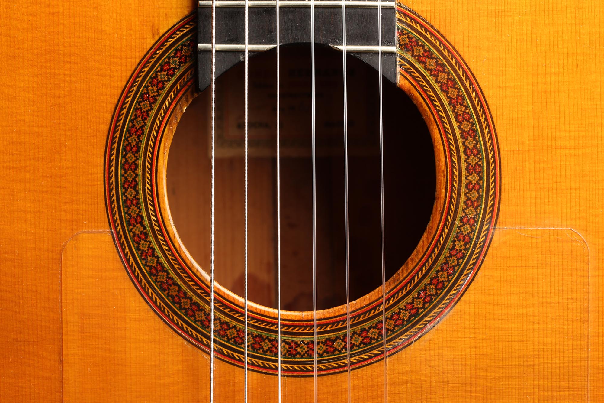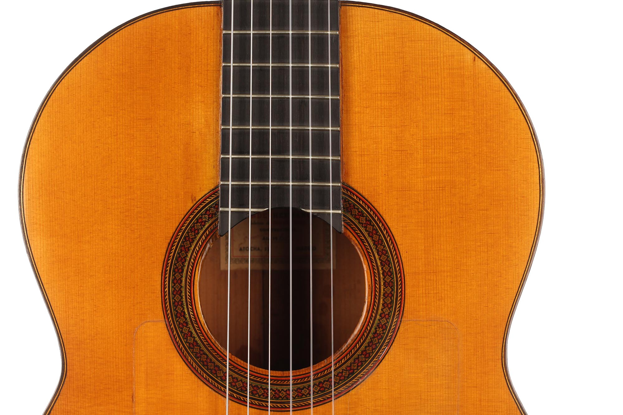 This 1961 guitar is very interesting. It has a Domingo Esteso-style head, very typical of the legendary luthiers from Madrid such as Manuel Ramirez and Santos Hernandez. This beautiful guitar has an extraordinary charisma. Three repaired cracks are visible on the soundboard: one at the central joint and one on each side of the ebony fingerboard. A small reinforcement bar has been added inside at the fan bracing at the central joint. Three small repaired cracks are also visible on the back. This guitar is in perfect playing condition and wears the original engraved Fustero tuners.