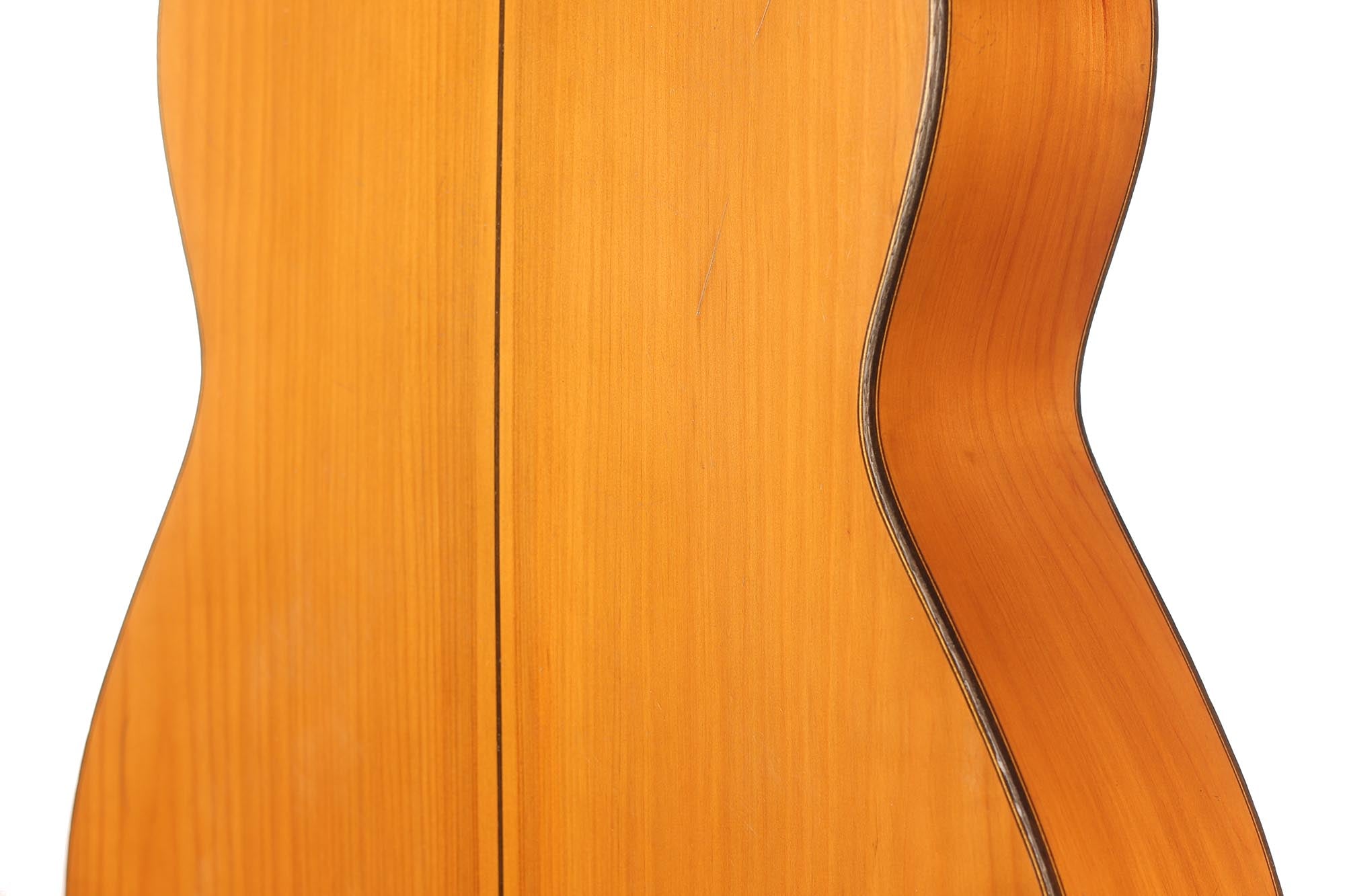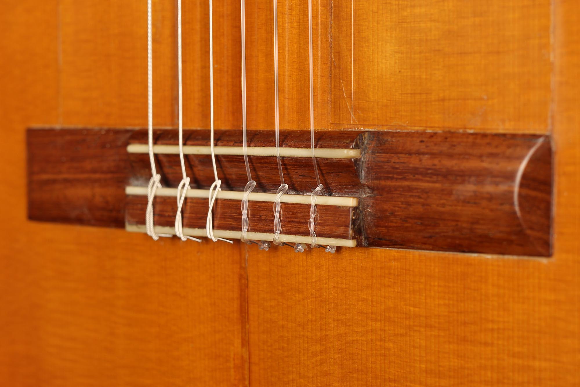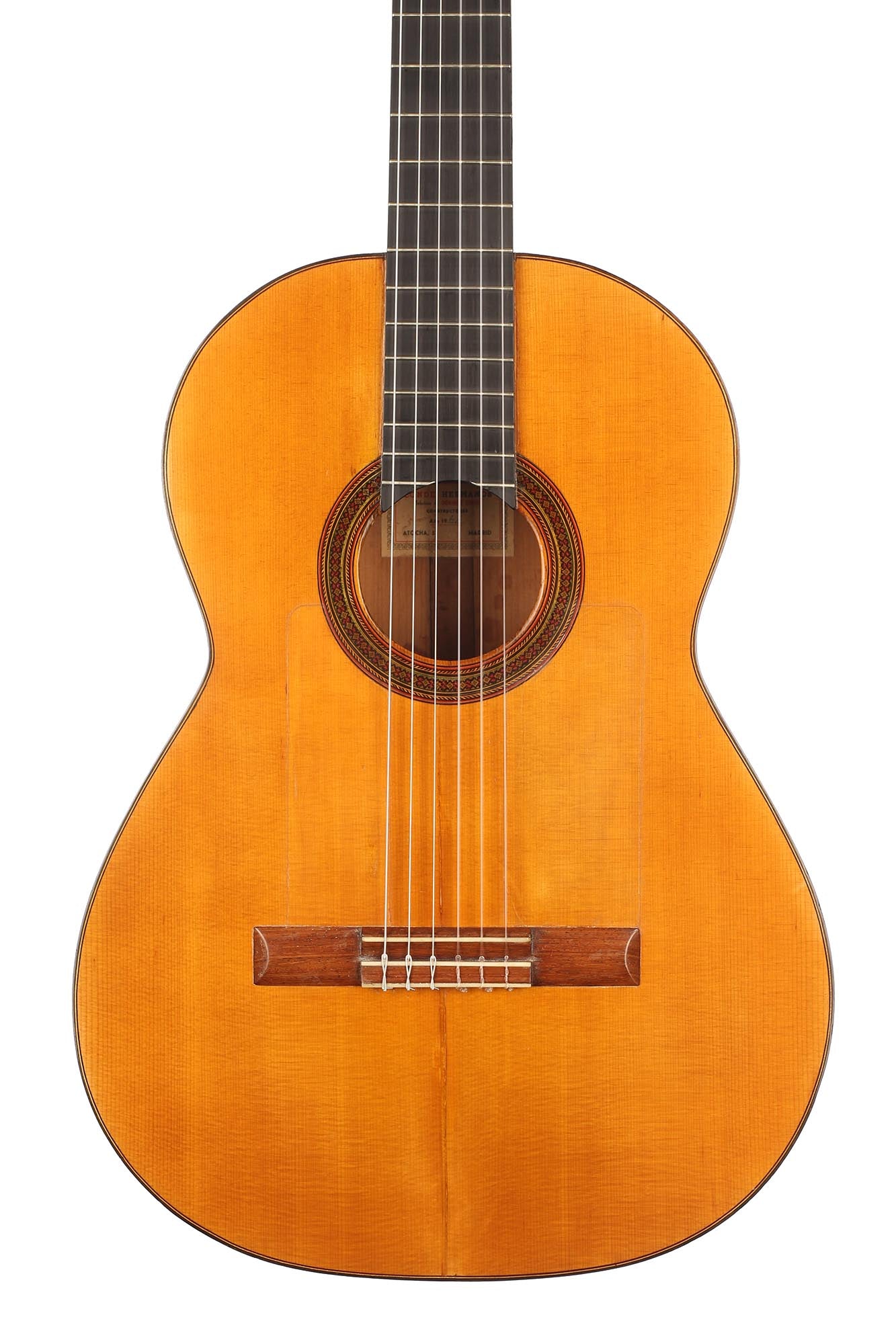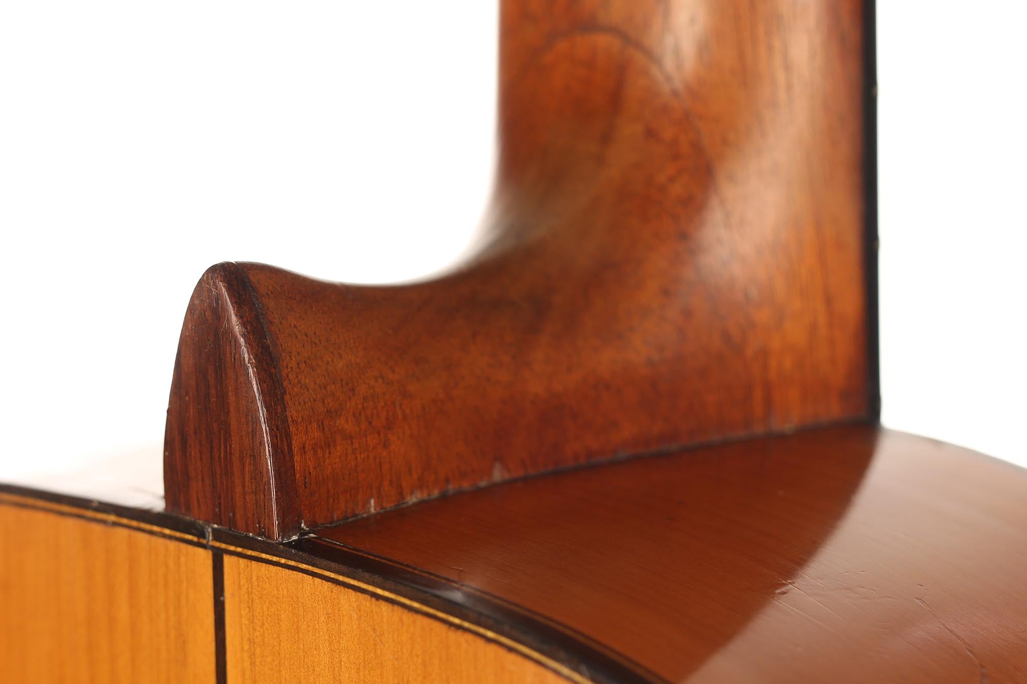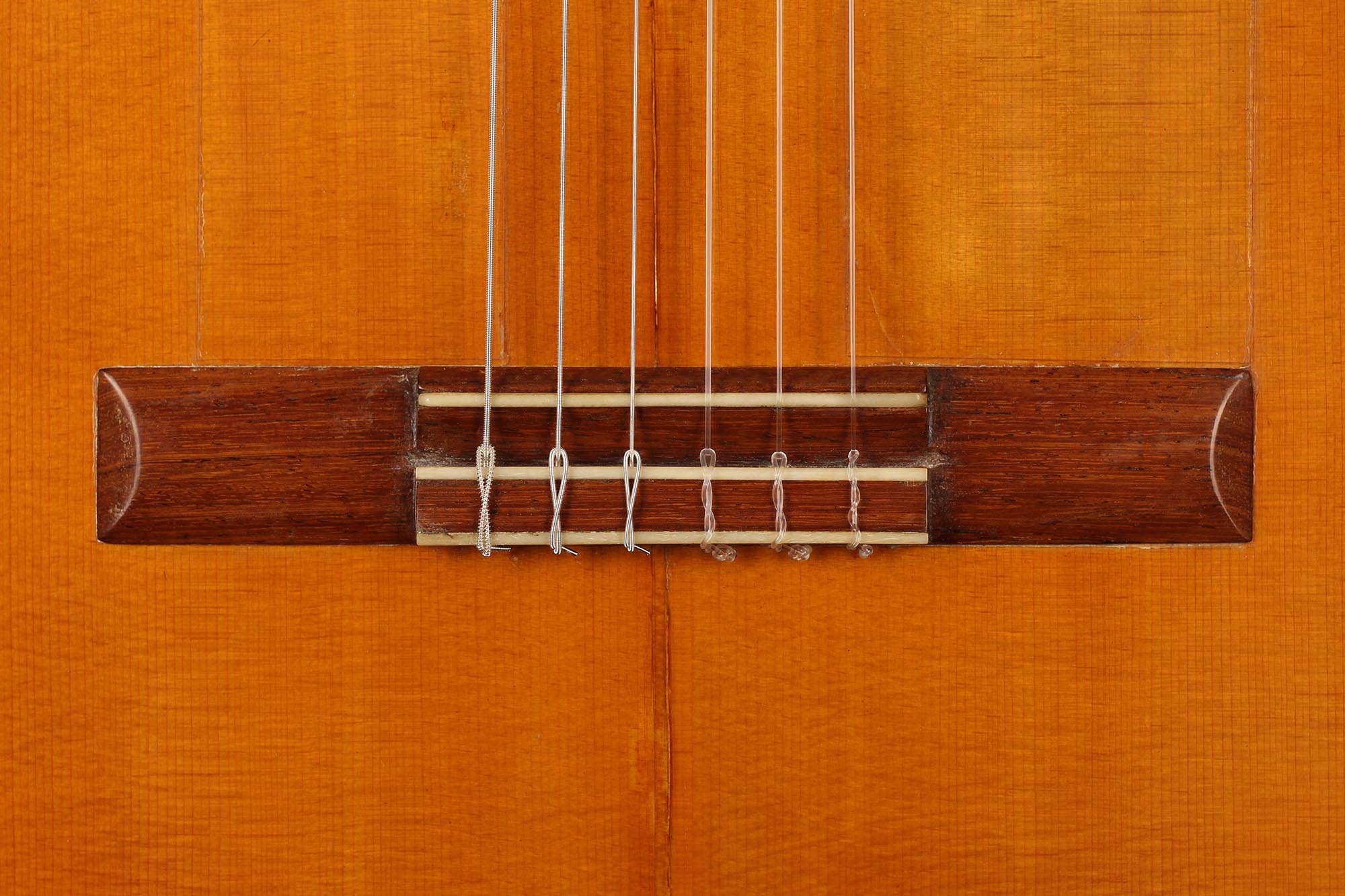 This 1961 guitar is very interesting. It has a Domingo Esteso-style head, very typical of the legendary luthiers from Madrid such as Manuel Ramirez and Santos Hernandez. This beautiful guitar has an extraordinary charisma. Three repaired cracks are visible on the soundboard: one at the central joint and one on each side of the ebony fingerboard. A small reinforcement bar has been added inside at the fan bracing at the central joint. Three small repaired cracks are also visible on the back. This guitar is in perfect playing condition and wears the original engraved Fustero tuners.