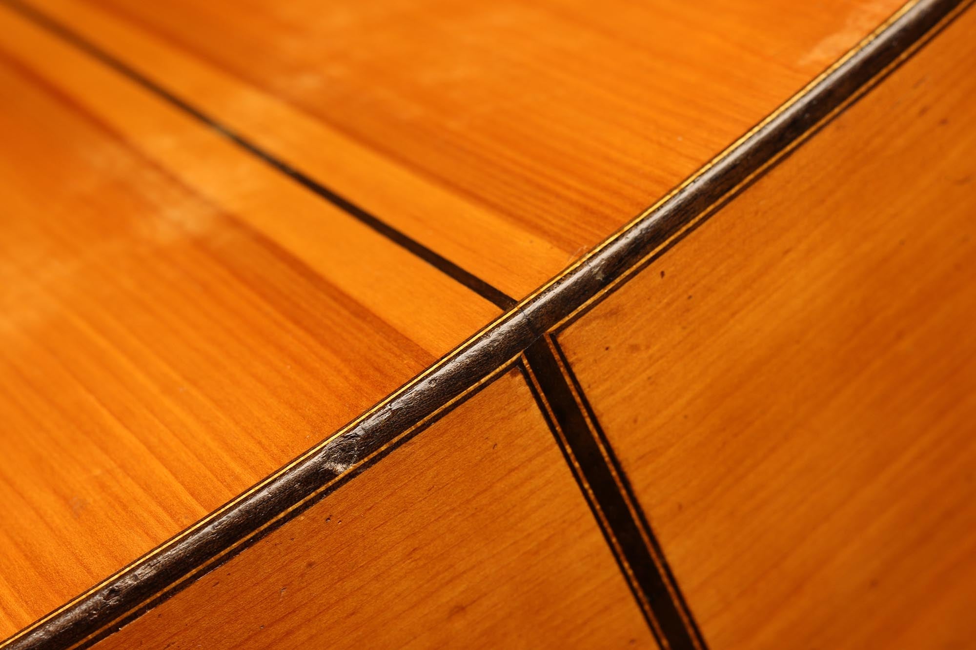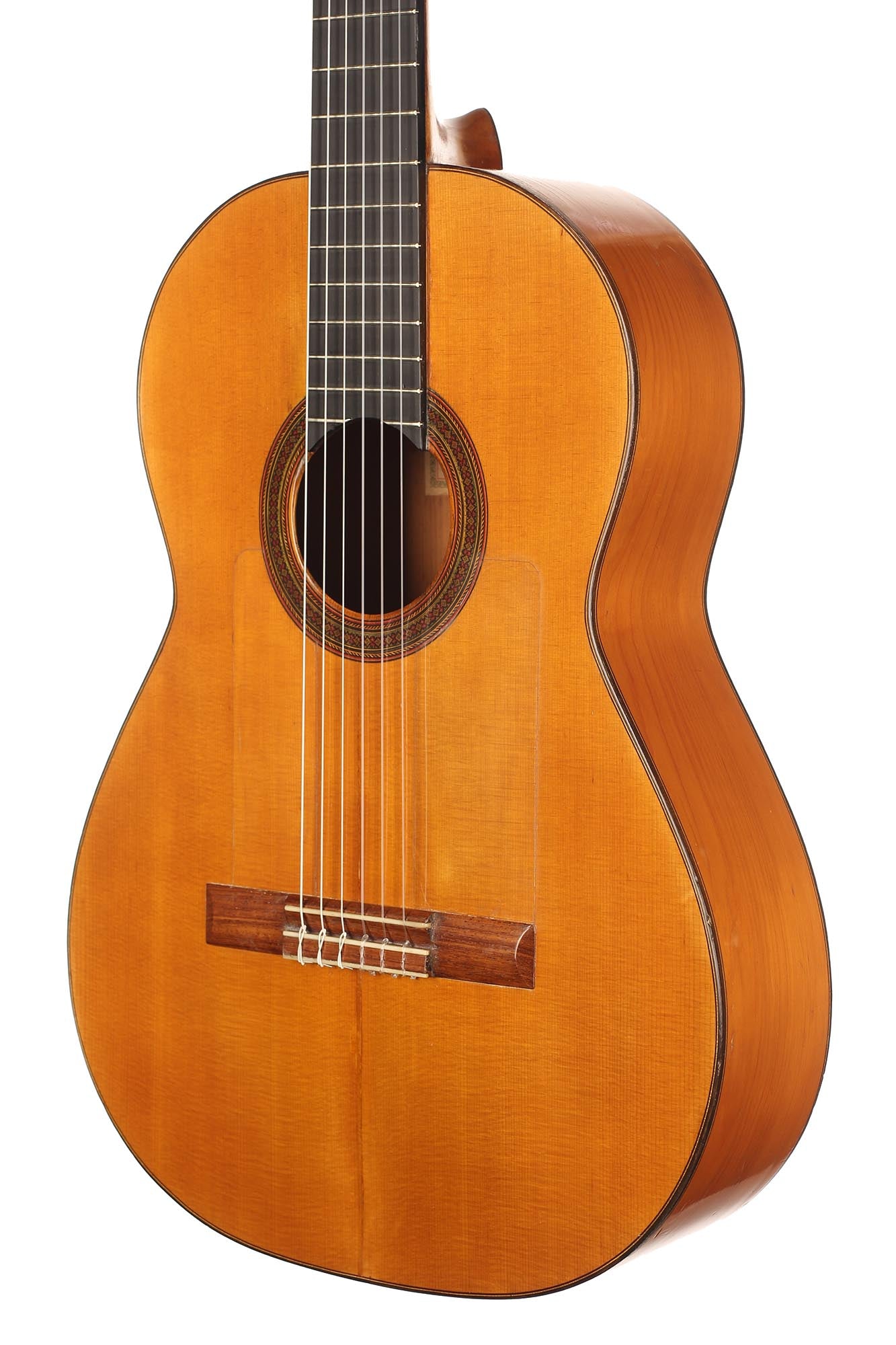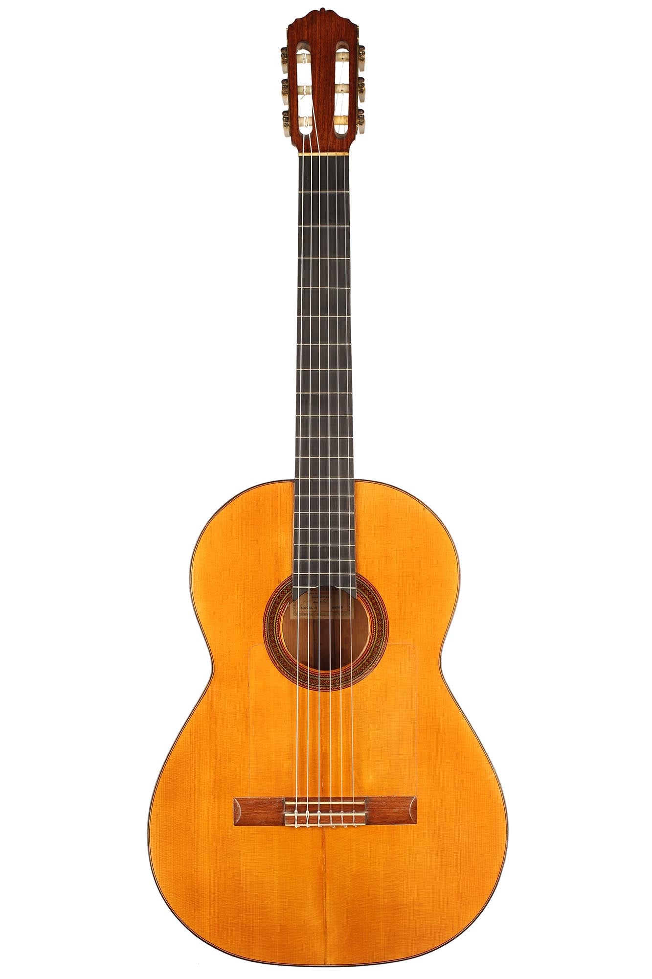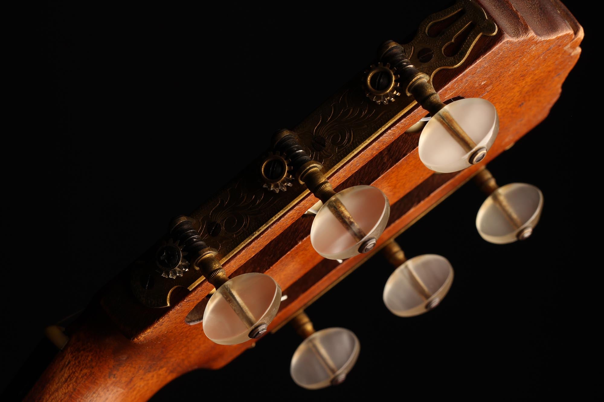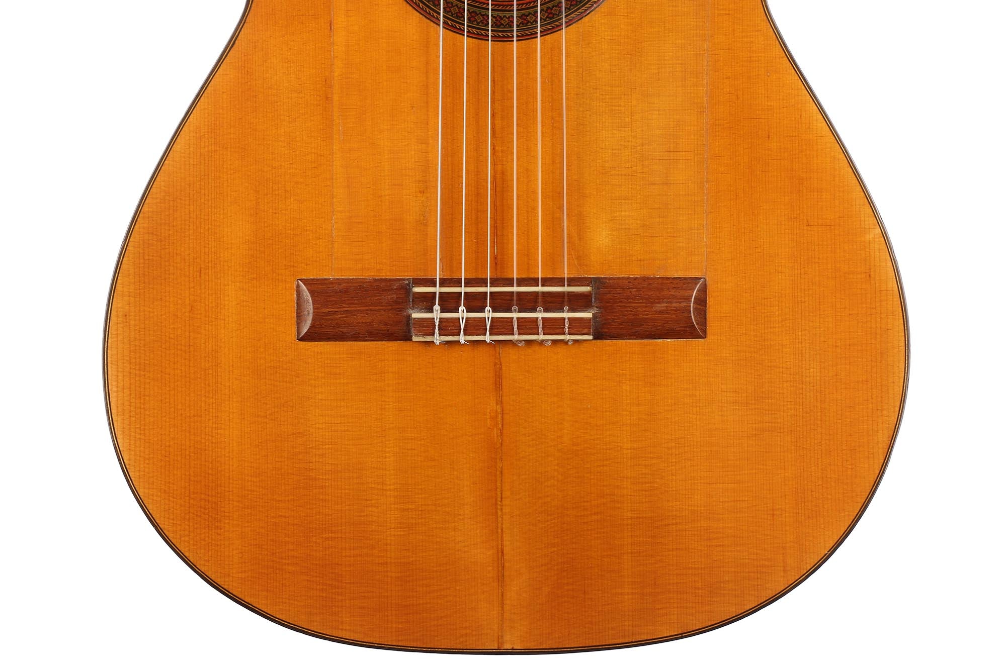This 1961 guitar is very interesting. It has a Domingo Esteso-style head, very typical of the legendary luthiers from Madrid such as Manuel Ramirez and Santos Hernandez. This beautiful guitar has an extraordinary charisma. Three repaired cracks are visible on the soundboard: one at the central joint and one on each side of the ebony fingerboard. A small reinforcement bar has been added inside at the fan bracing at the central joint. Three small repaired cracks are also visible on the back. This guitar is in perfect playing condition and wears the original engraved Fustero tuners.