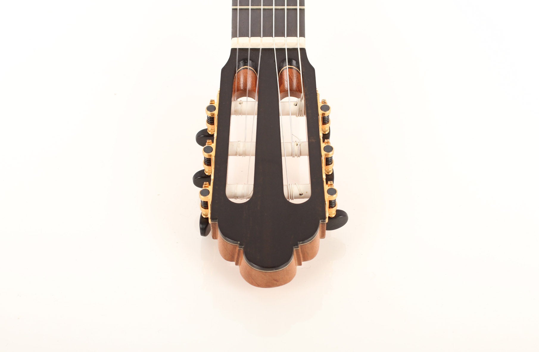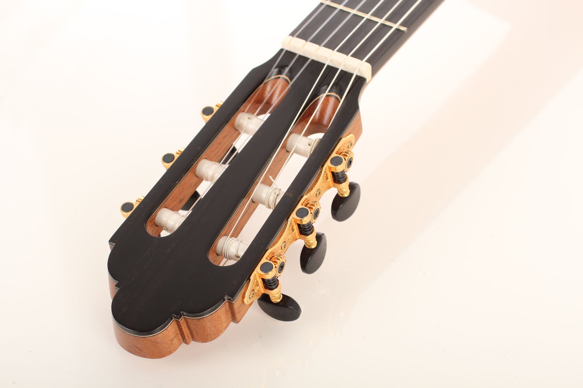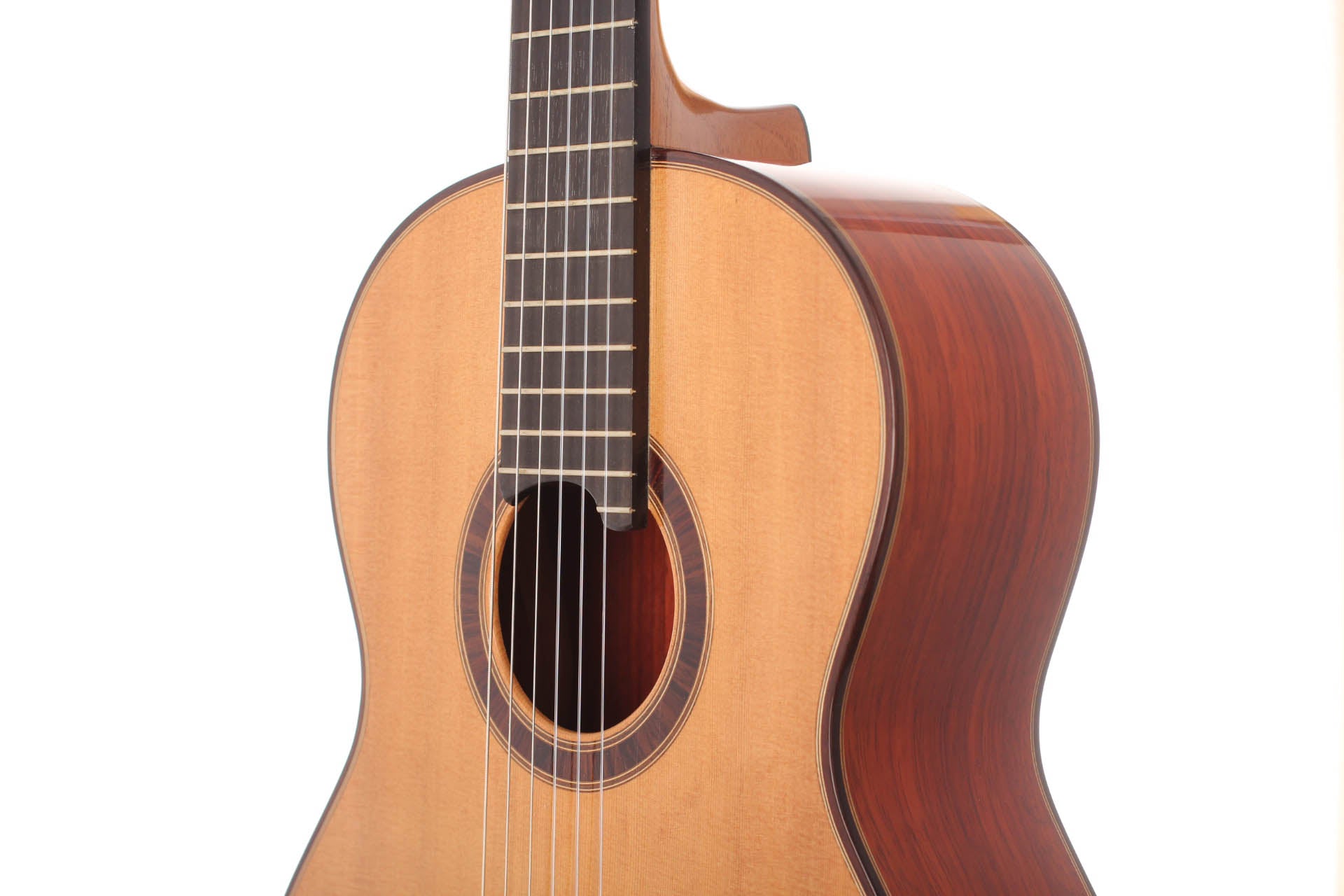 This guitar was made by Constantin Dumitriu in 2012. He developed a new soundboard construction concept as an alternative to the nomex double top. In this case, the soundboard is made of cedar with a second “top” of wooden weave underneath, made of spruce. This system is the result of his personal researches to improve top flexibility as well as the instrument's power and response. The guitar has a great volume and gives warm feedback to the player's body. Everybody who is searching for a guitar with a lot of power and without giving up tone color should try this guitar. The tuning machines are made by Schaller. A hard-shell case is included.