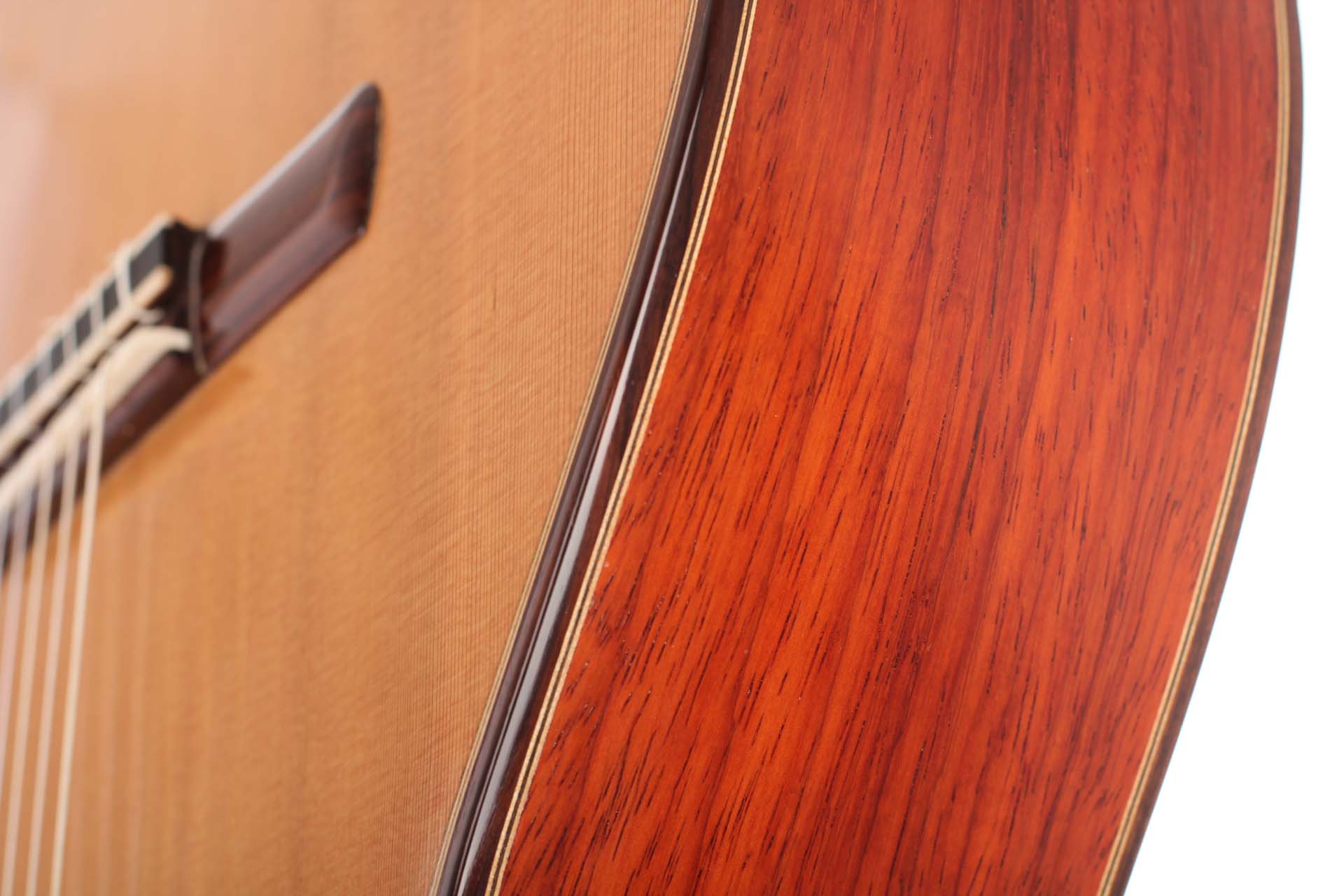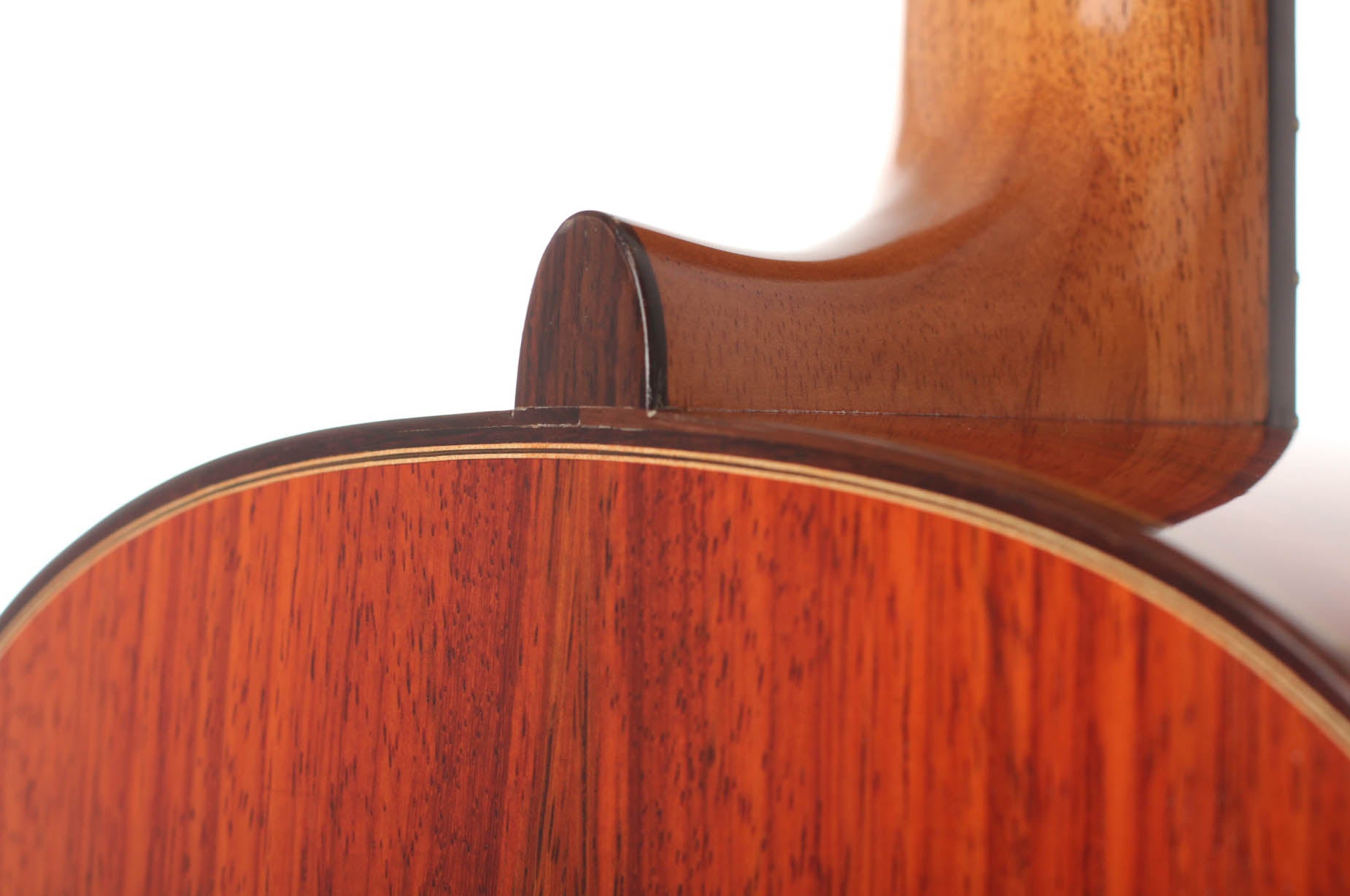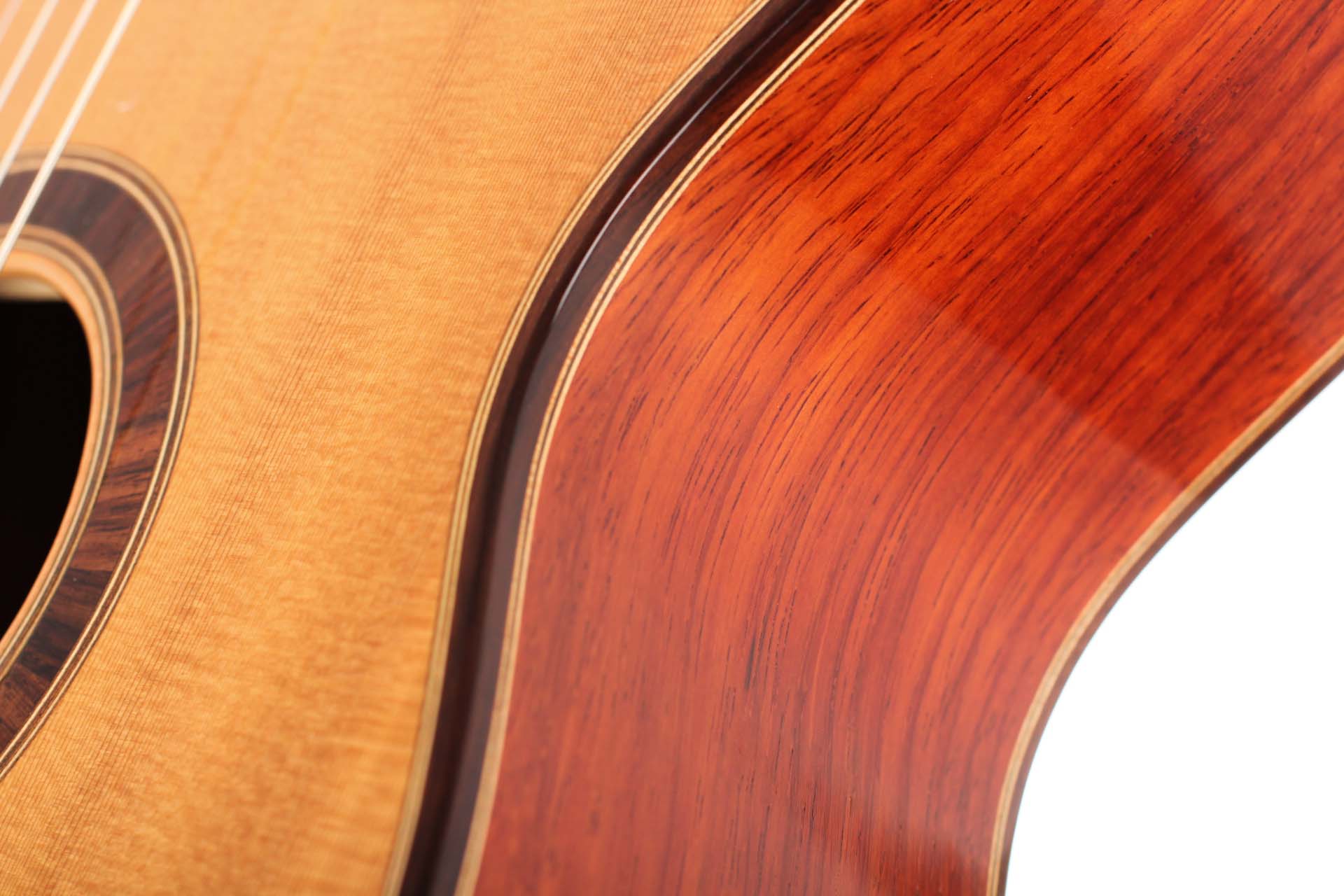 This guitar was made by Constantin Dumitriu in 2012. He developed a new soundboard construction concept as an alternative to the nomex double top. In this case, the soundboard is made of cedar with a second “top” of wooden weave underneath, made of spruce. This system is the result of his personal researches to improve top flexibility as well as the instrument's power and response. The guitar has a great volume and gives warm feedback to the player's body. Everybody who is searching for a guitar with a lot of power and without giving up tone color should try this guitar. The tuning machines are made by Schaller. A hard-shell case is included.