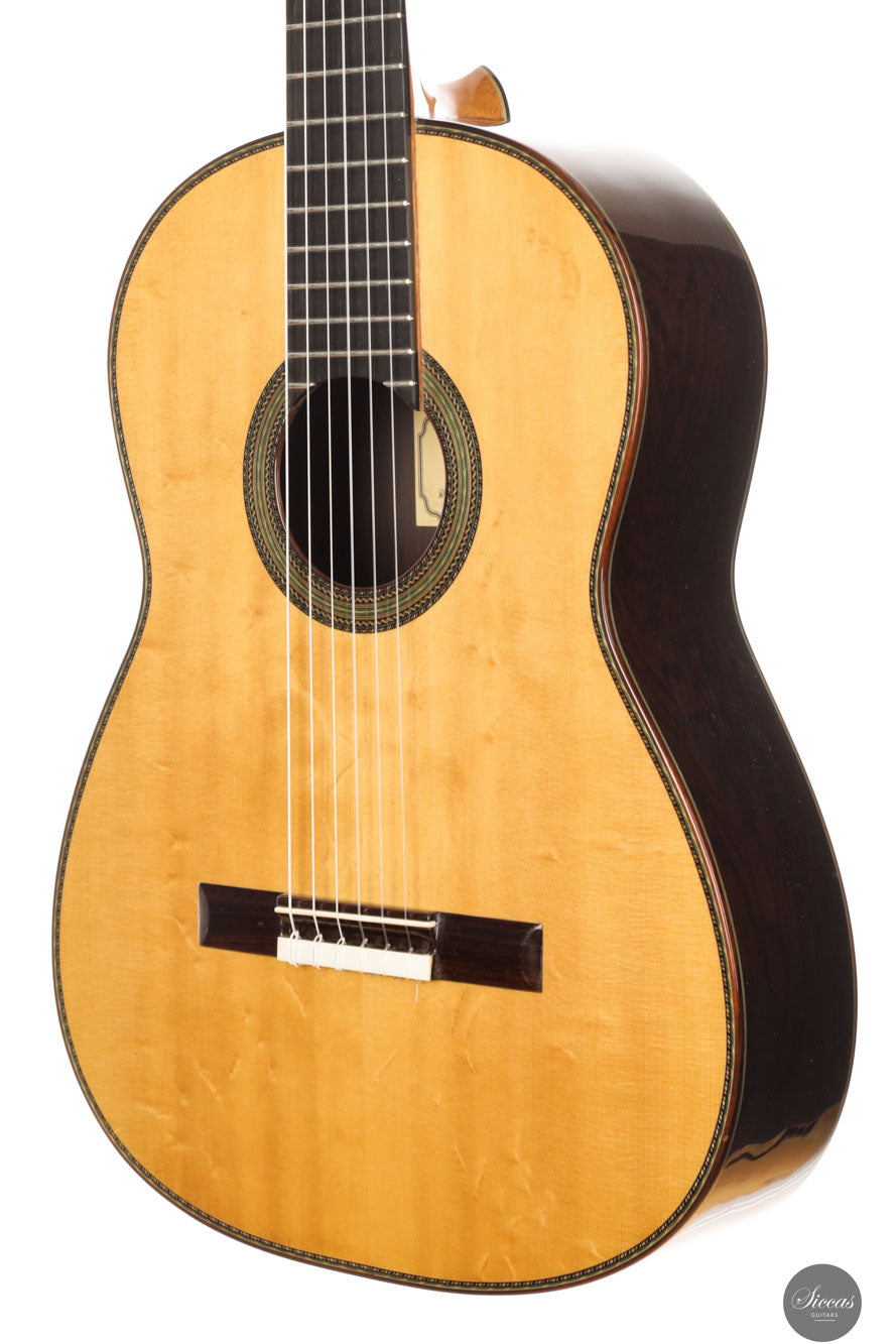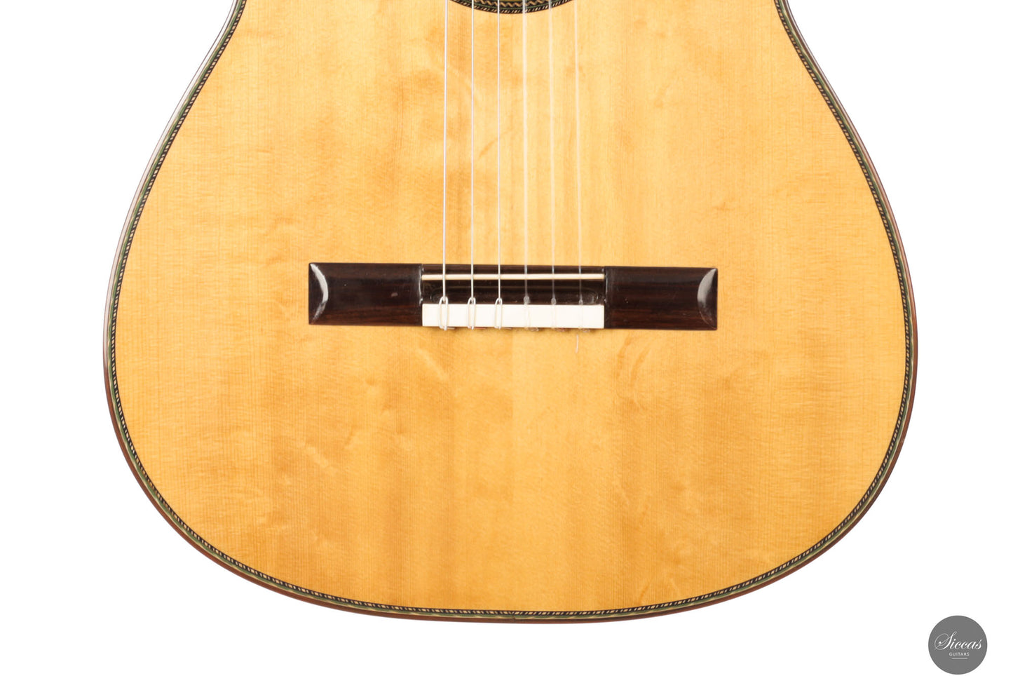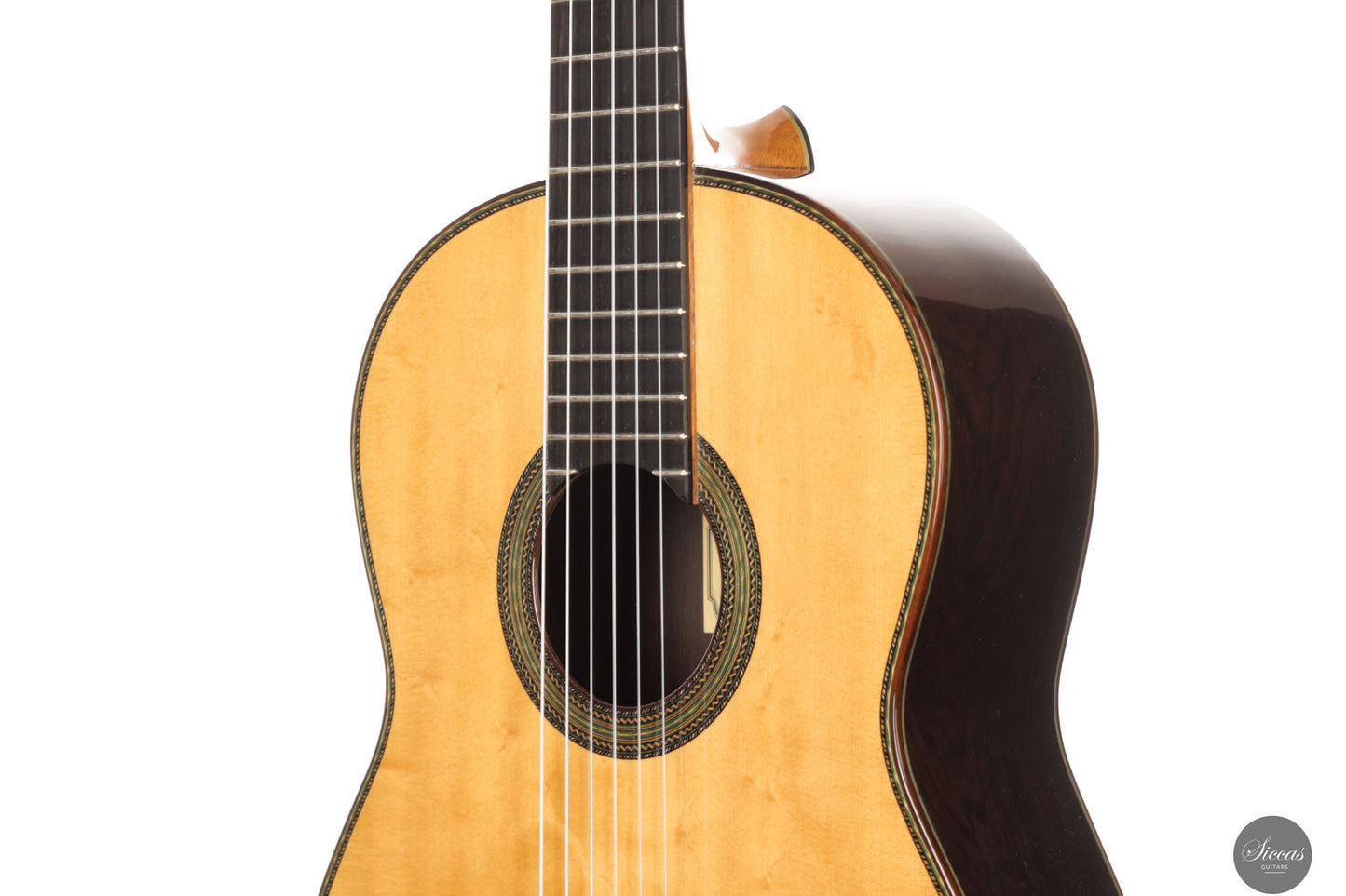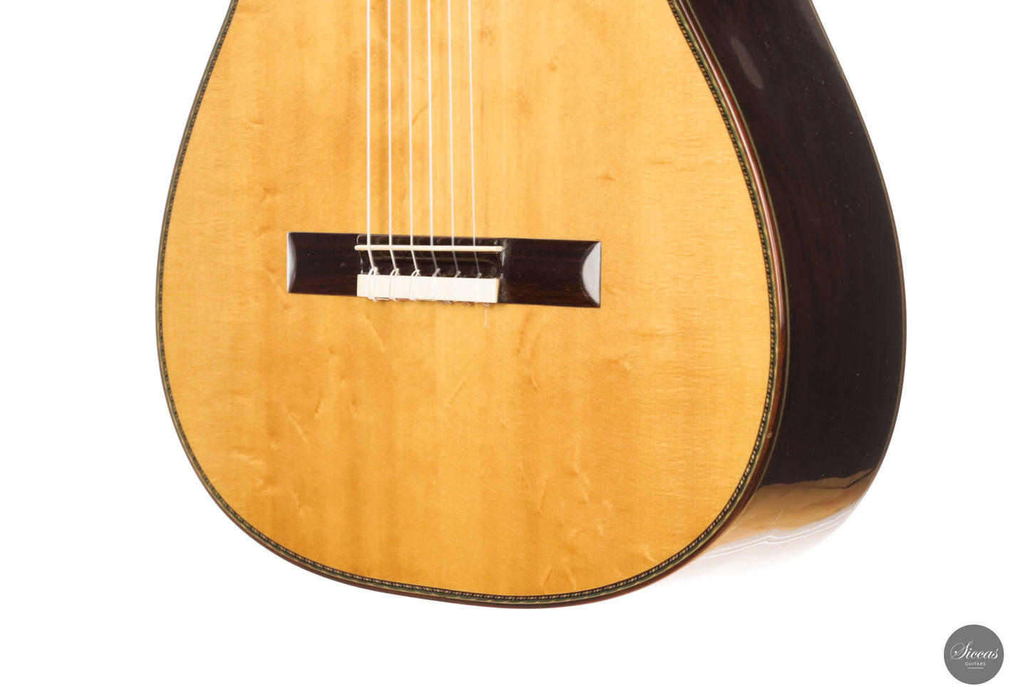 This beautiful guitar is inspired by the work of Antonio de Torres. Aesthetically, it features many ornamental elements reminiscent of Torres’s original instruments, while also incorporating modern touches such as an elevated fingerboard. The spruce soundboard is visually striking, adorned with prominent bearclaw figures. The back and sides are made from straight-grained Brazilian rosewood of the highest quality. Tonally, the guitar offers excellent balance between basses and trebles, with great clarity and warmth. It is easy to play and responds exceptionally well to the right-hand attack. The volume is impressive—an essential characteristic of a modern concert guitar.Condition