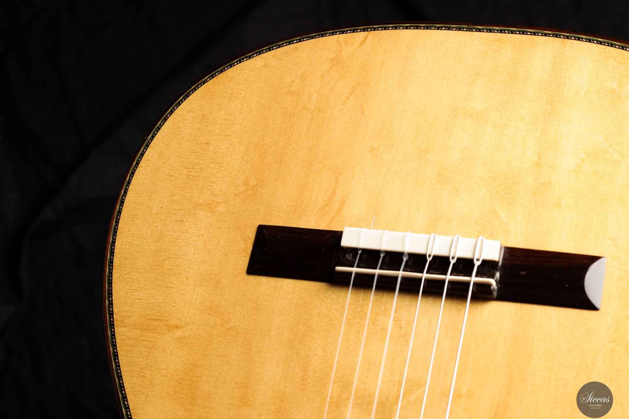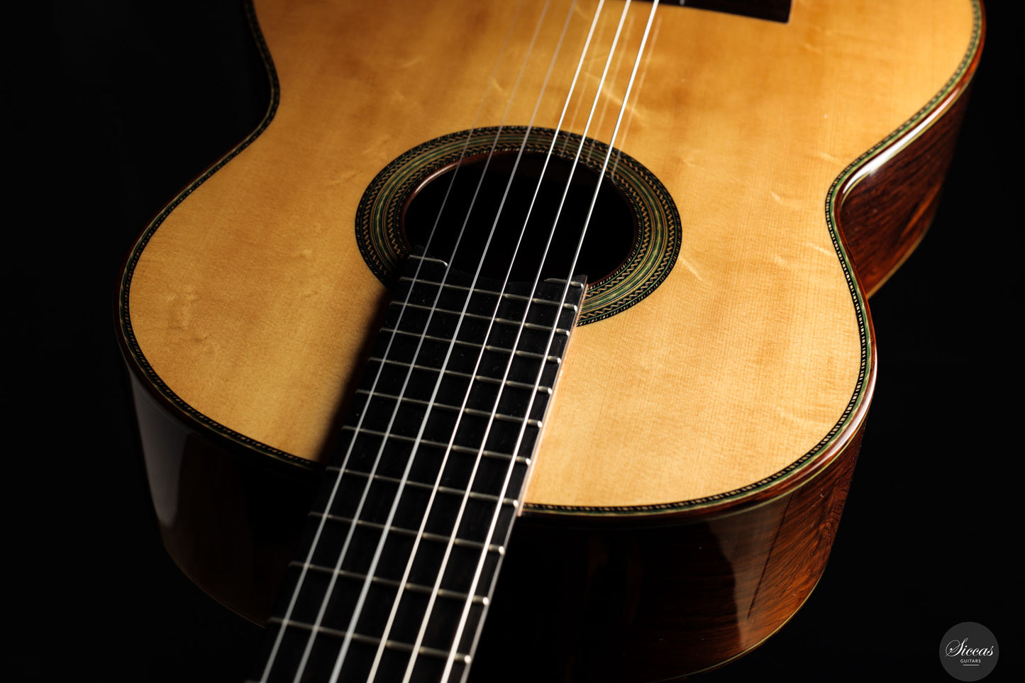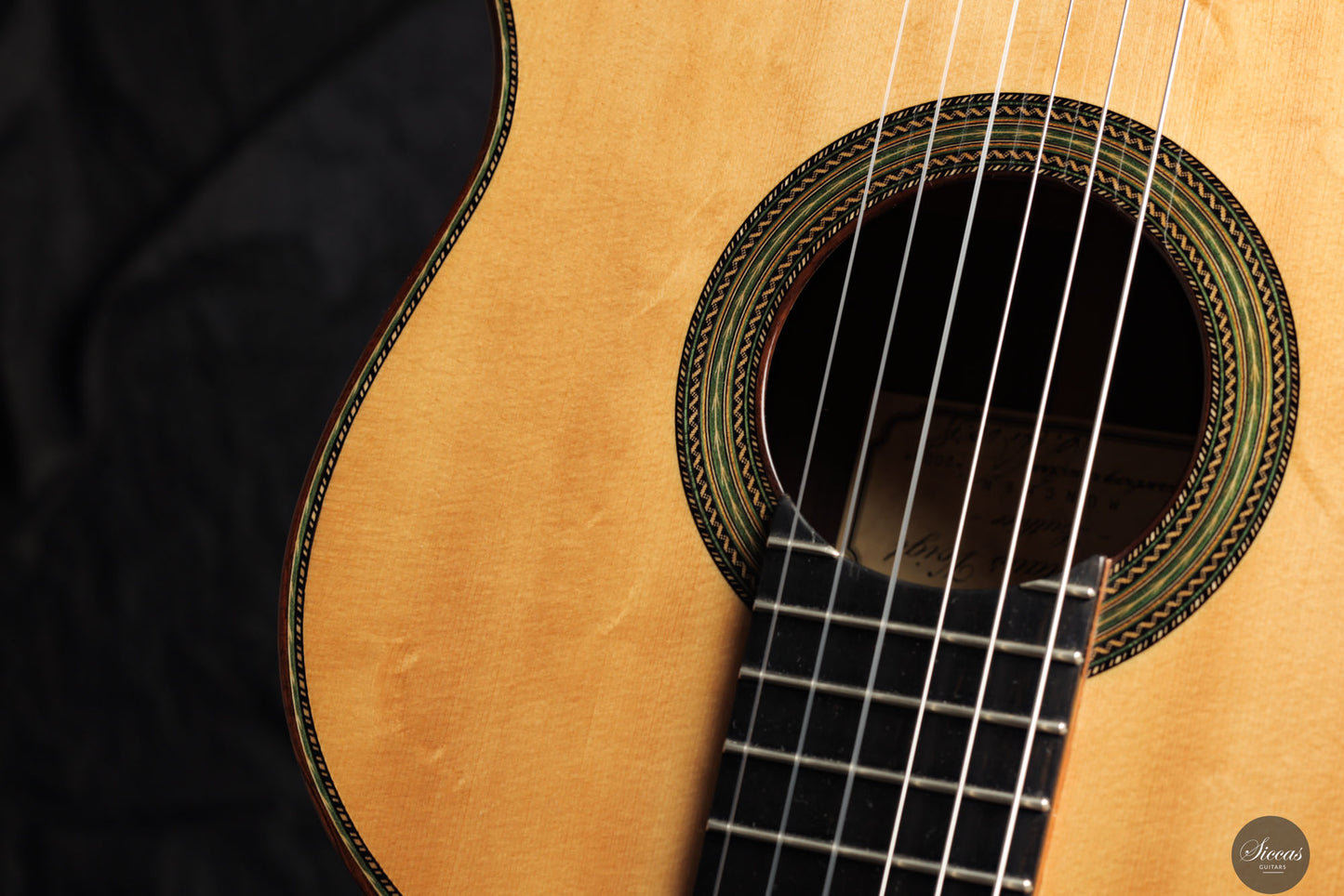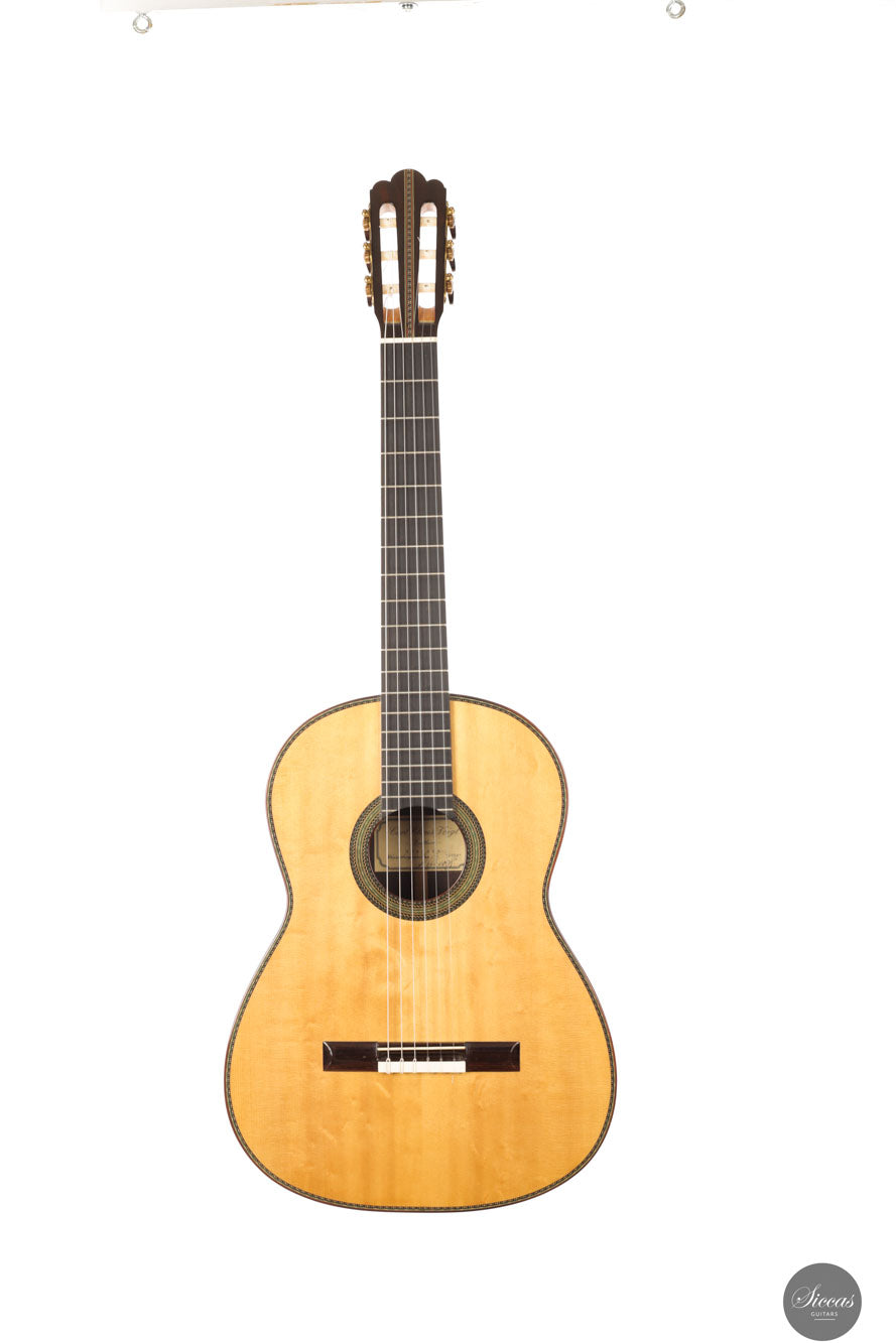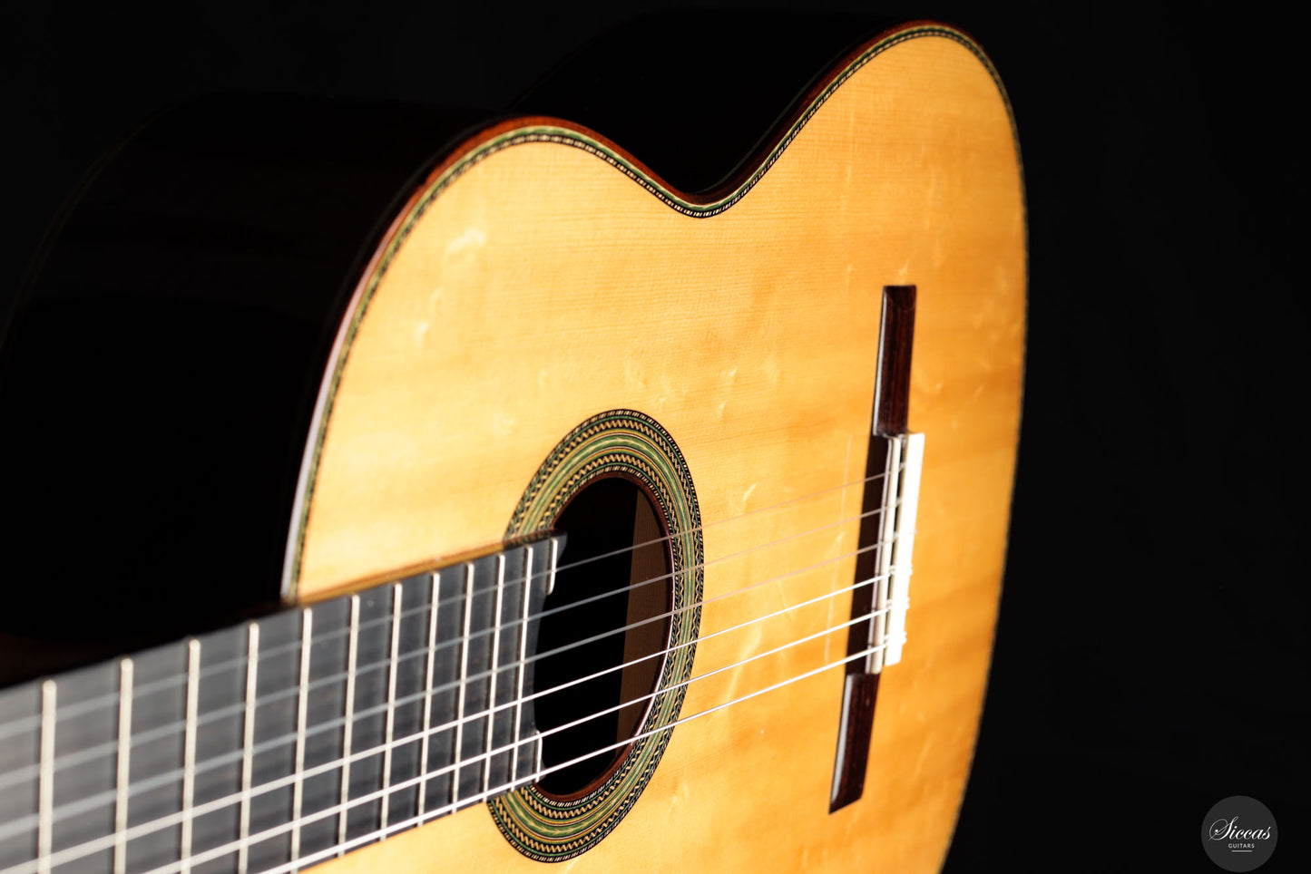 This beautiful guitar is inspired by the work of Antonio de Torres. Aesthetically, it features many ornamental elements reminiscent of Torres’s original instruments, while also incorporating modern touches such as an elevated fingerboard. The spruce soundboard is visually striking, adorned with prominent bearclaw figures. The back and sides are made from straight-grained Brazilian rosewood of the highest quality. Tonally, the guitar offers excellent balance between basses and trebles, with great clarity and warmth. It is easy to play and responds exceptionally well to the right-hand attack. The volume is impressive—an essential characteristic of a modern concert guitar.Condition