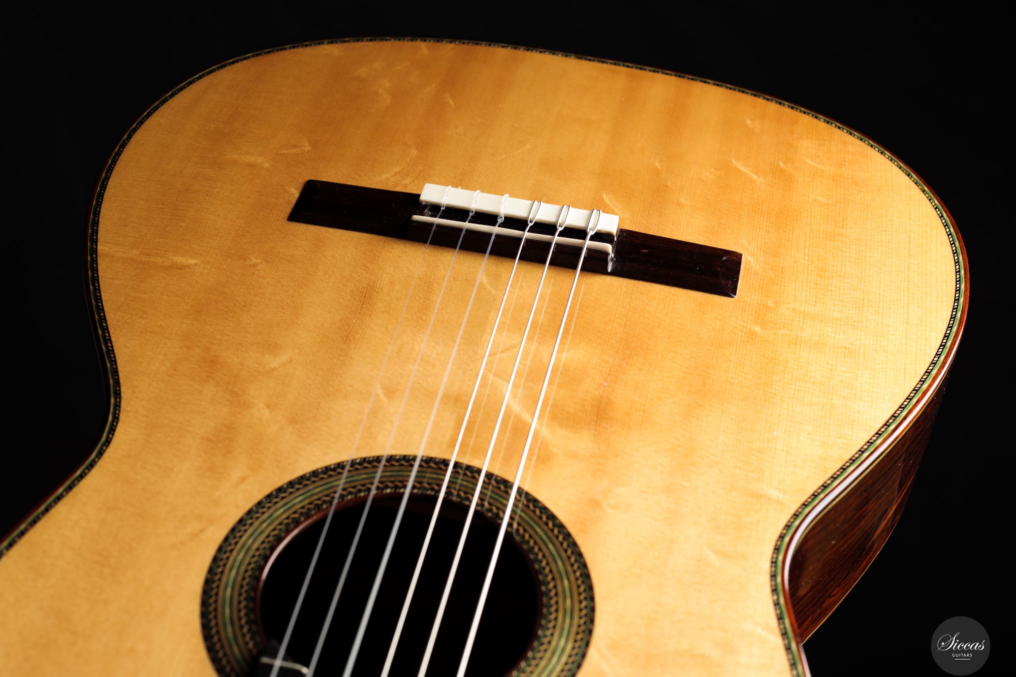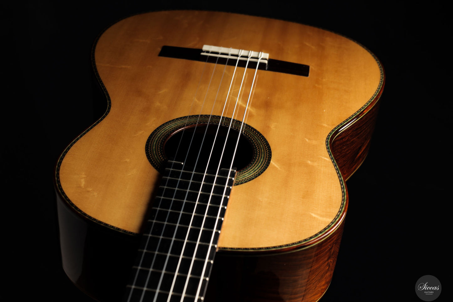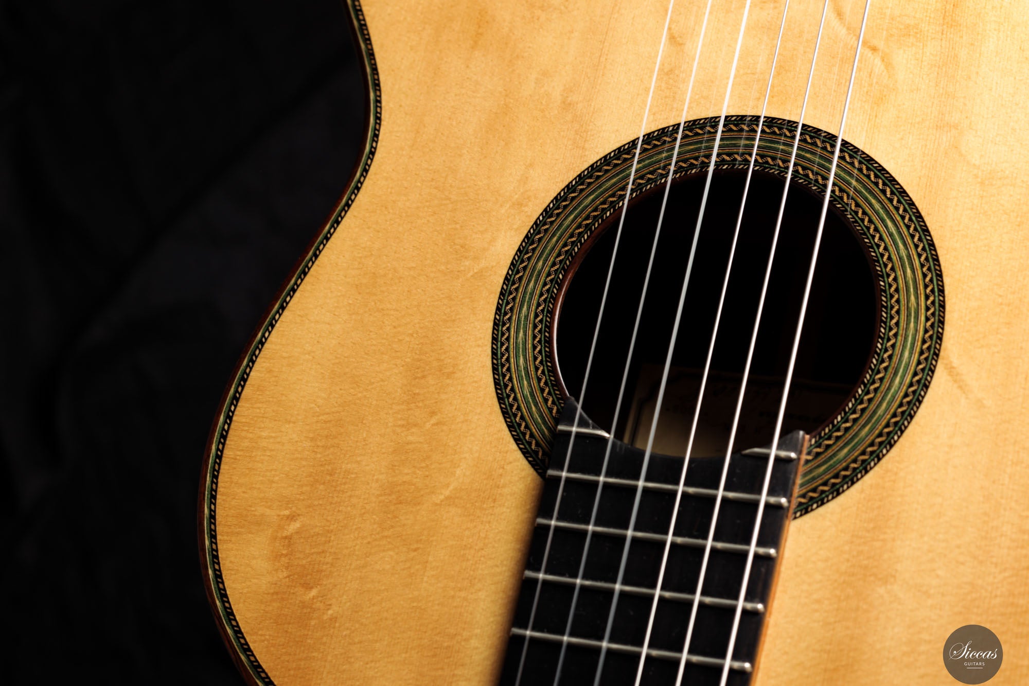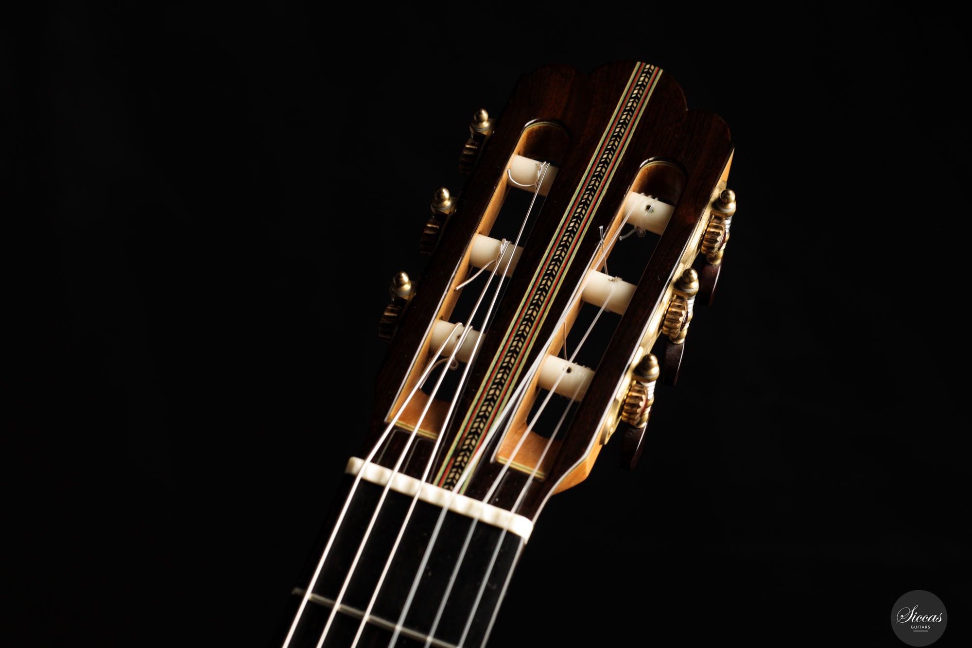 This beautiful guitar is inspired by the work of Antonio de Torres. Aesthetically, it features many ornamental elements reminiscent of Torres’s original instruments, while also incorporating modern touches such as an elevated fingerboard. The spruce soundboard is visually striking, adorned with prominent bearclaw figures. The back and sides are made from straight-grained Brazilian rosewood of the highest quality. Tonally, the guitar offers excellent balance between basses and trebles, with great clarity and warmth. It is easy to play and responds exceptionally well to the right-hand attack. The volume is impressive—an essential characteristic of a modern concert guitar.Condition