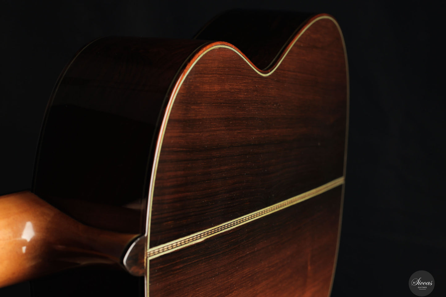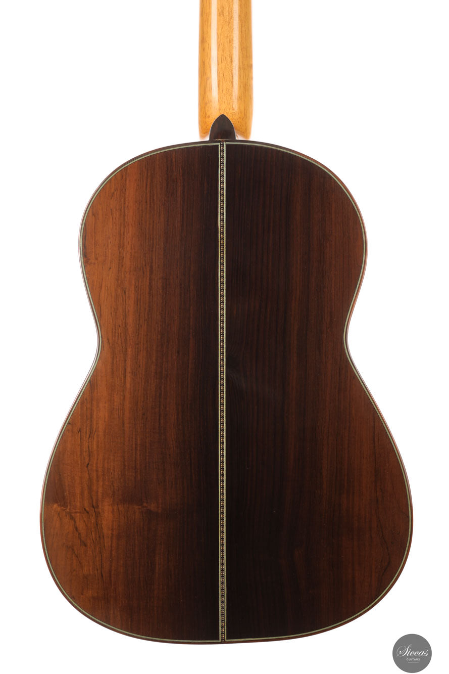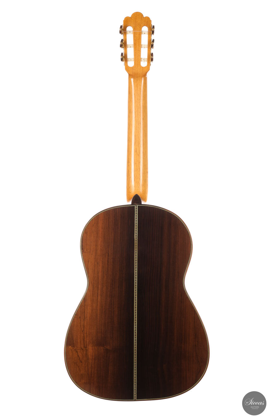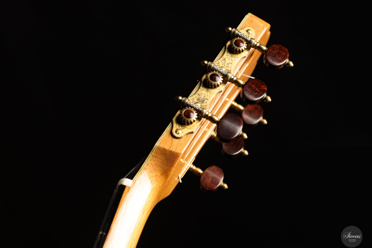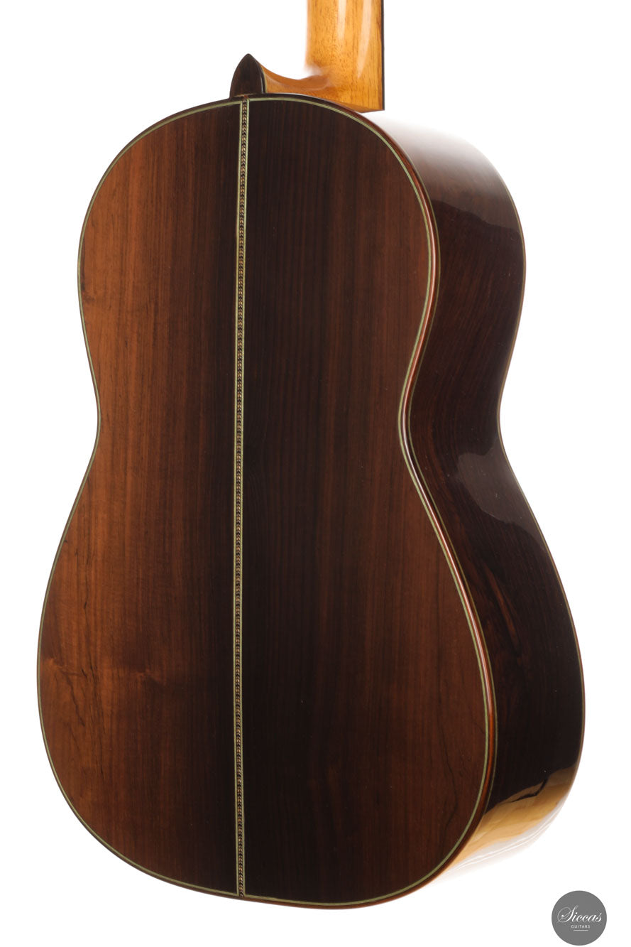 This beautiful guitar is inspired by the work of Antonio de Torres. Aesthetically, it features many ornamental elements reminiscent of Torres’s original instruments, while also incorporating modern touches such as an elevated fingerboard. The spruce soundboard is visually striking, adorned with prominent bearclaw figures. The back and sides are made from straight-grained Brazilian rosewood of the highest quality. Tonally, the guitar offers excellent balance between basses and trebles, with great clarity and warmth. It is easy to play and responds exceptionally well to the right-hand attack. The volume is impressive—an essential characteristic of a modern concert guitar.Condition