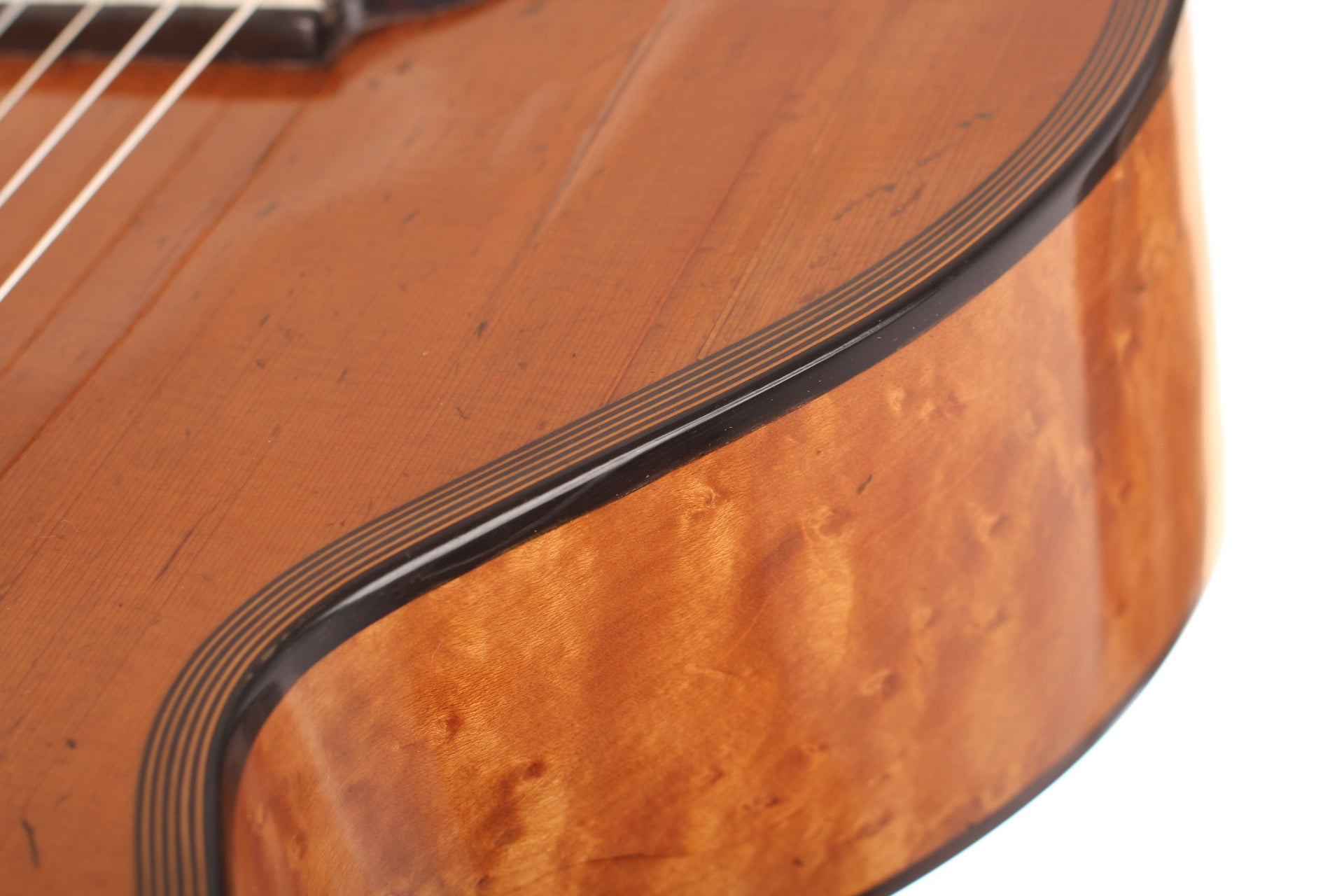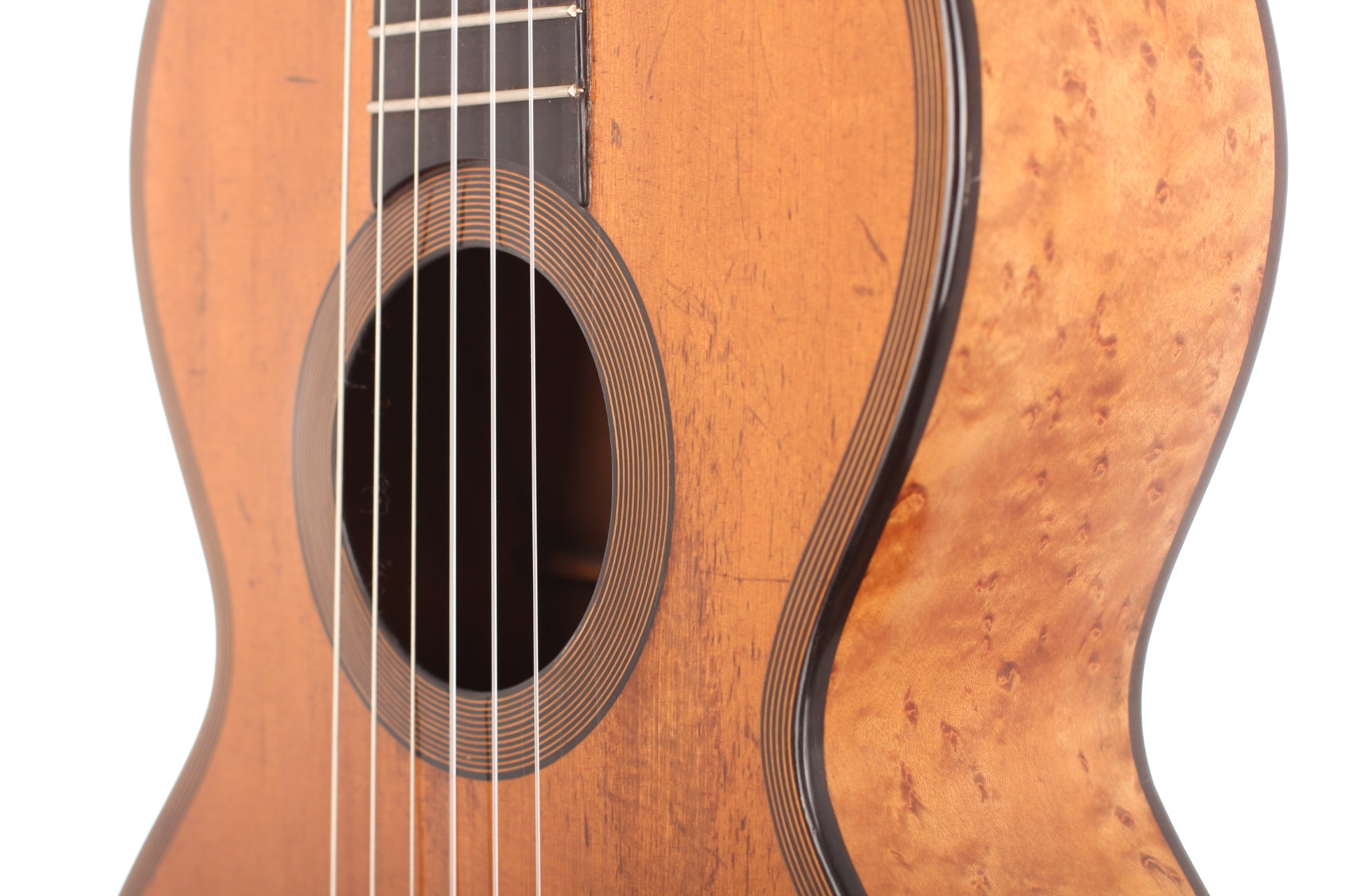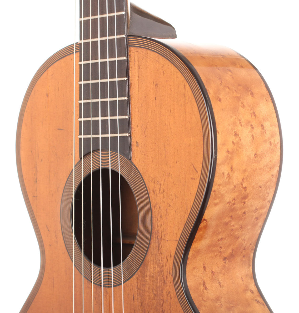 When looking to the high-quality materials that were used for this guitar, and when taking a closer look how elaborated this guitar is from in- and outside, we can estimate what great skills these two artisans had. The top of this guitar is made of spruce. Back and sides are made of impressive looking bird’s eye maple with only some little perfectly repaired cracks which you can hardly see. The high quality tuning machines are not original.