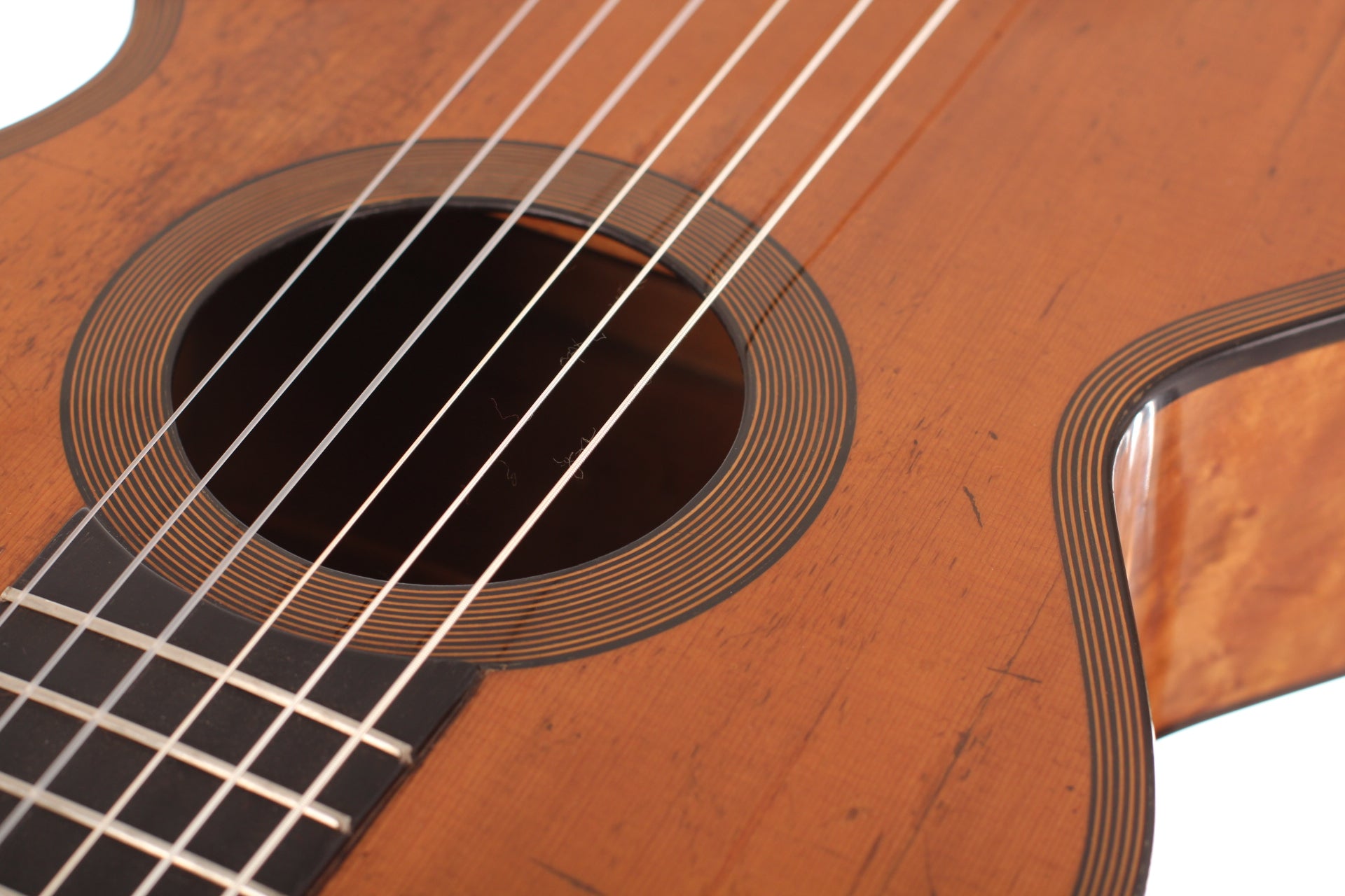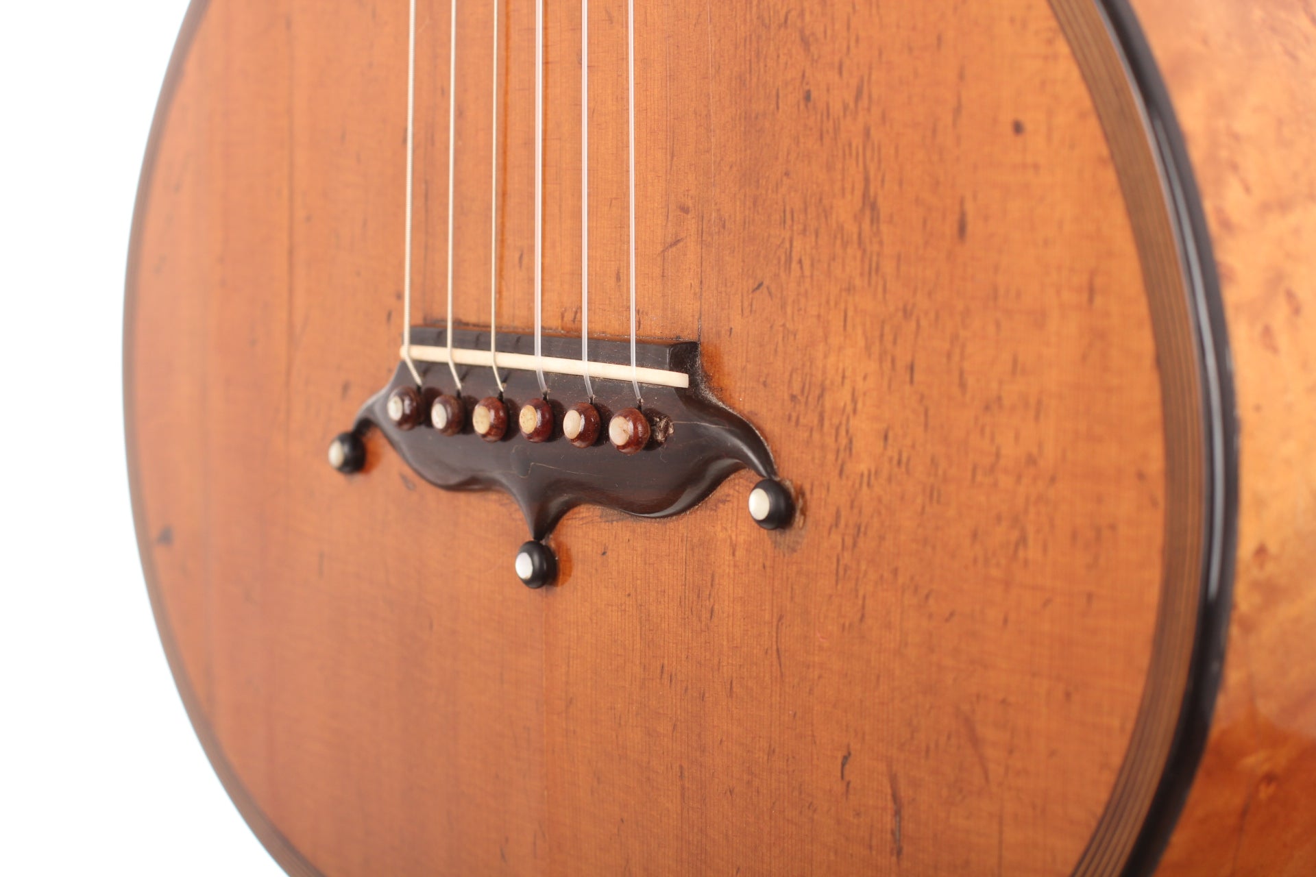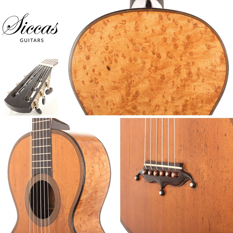 When looking to the high-quality materials that were used for this guitar, and when taking a closer look how elaborated this guitar is from in- and outside, we can estimate what great skills these two artisans had. The top of this guitar is made of spruce. Back and sides are made of impressive looking bird’s eye maple with only some little perfectly repaired cracks which you can hardly see. The high quality tuning machines are not original.