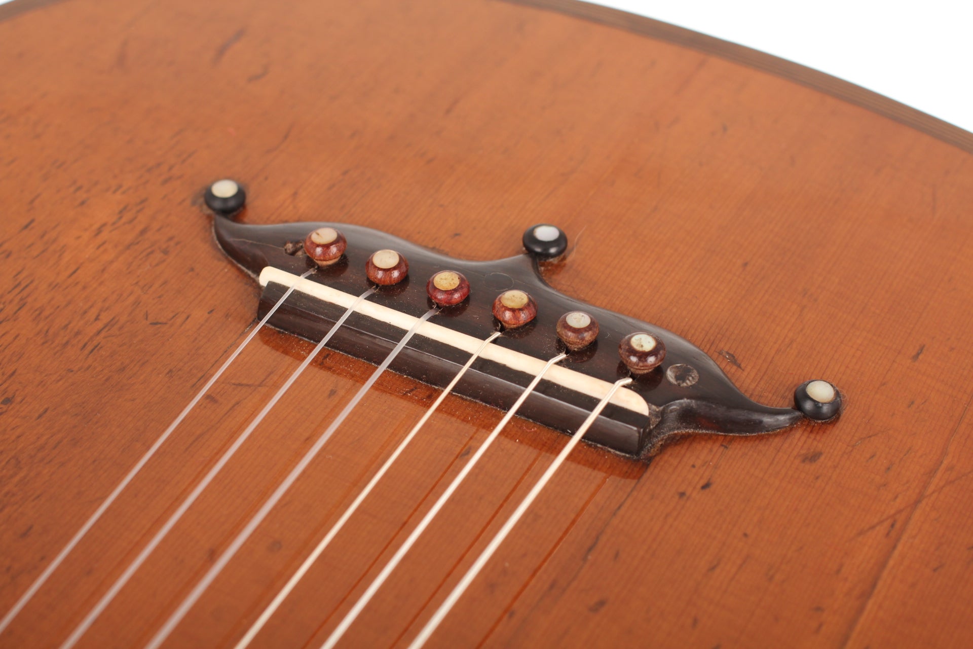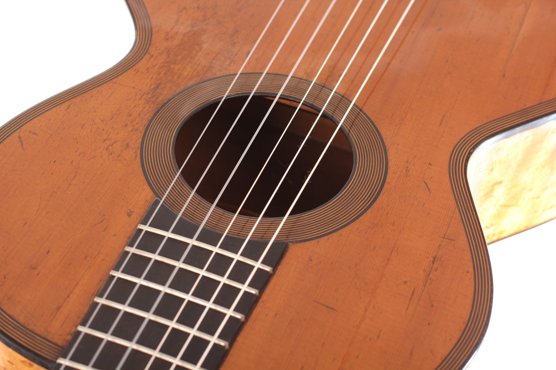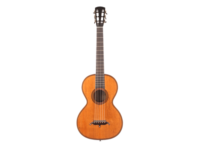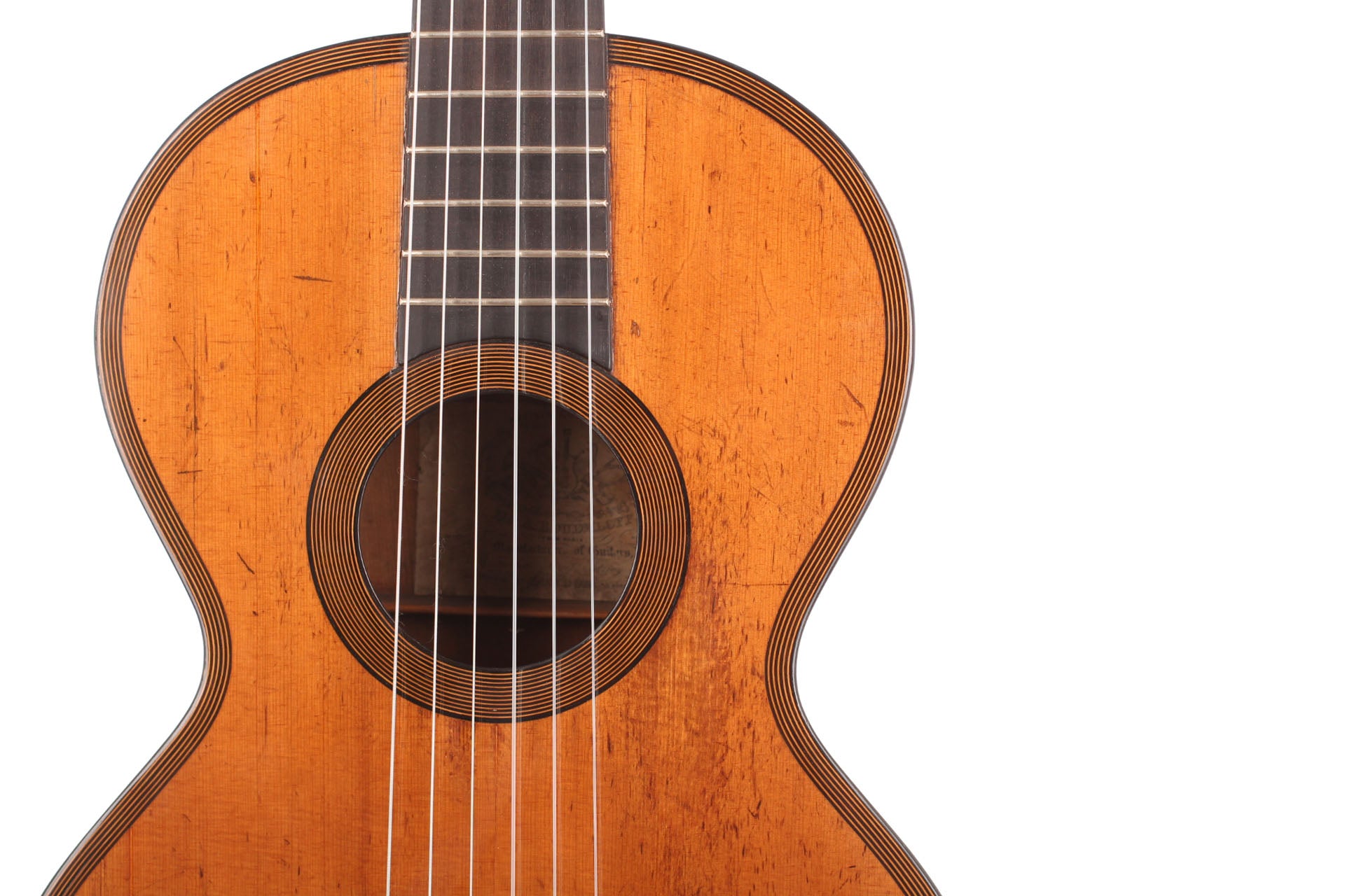 This D&A Roudhloff (Dominique and Arnauld) guitar was built around 1845. Dominique and Arnauld were the sons of Francois Roudhloff, who was a very famous luthier from Mirecourt. His sons went from Mirecourt to London where they worked as guitar makers and as guitar dealers.