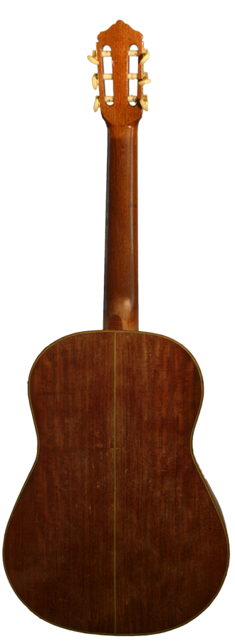 At the beginning of his career as a luthier he built some spruce top guitars, which changed in the 1970’s when he started to devote himself mainly to the construction of guitars with a cedar top. It is easy playable and meets the highest demands of professional guitarists. There are three repaired cracks below the bridge, one above and one beside the fretboard. All repaired cracks are stable. This model is one of the seldom models which have a spruce top and Amaranth back and sides. At this time he hade only this type of guitar model that has seven fan braces with two additional lateral braces. The guitar excels through its outstanding and powerful sound which does not show any weaknesses, not even in the highest registers.