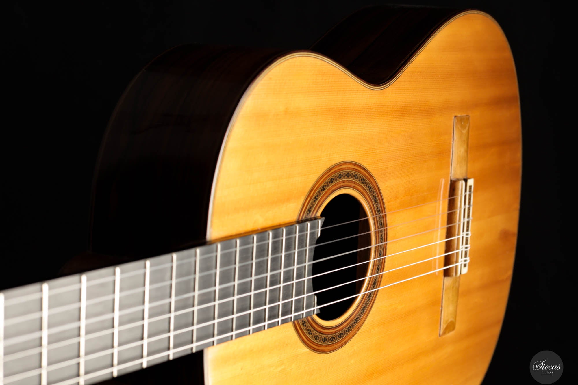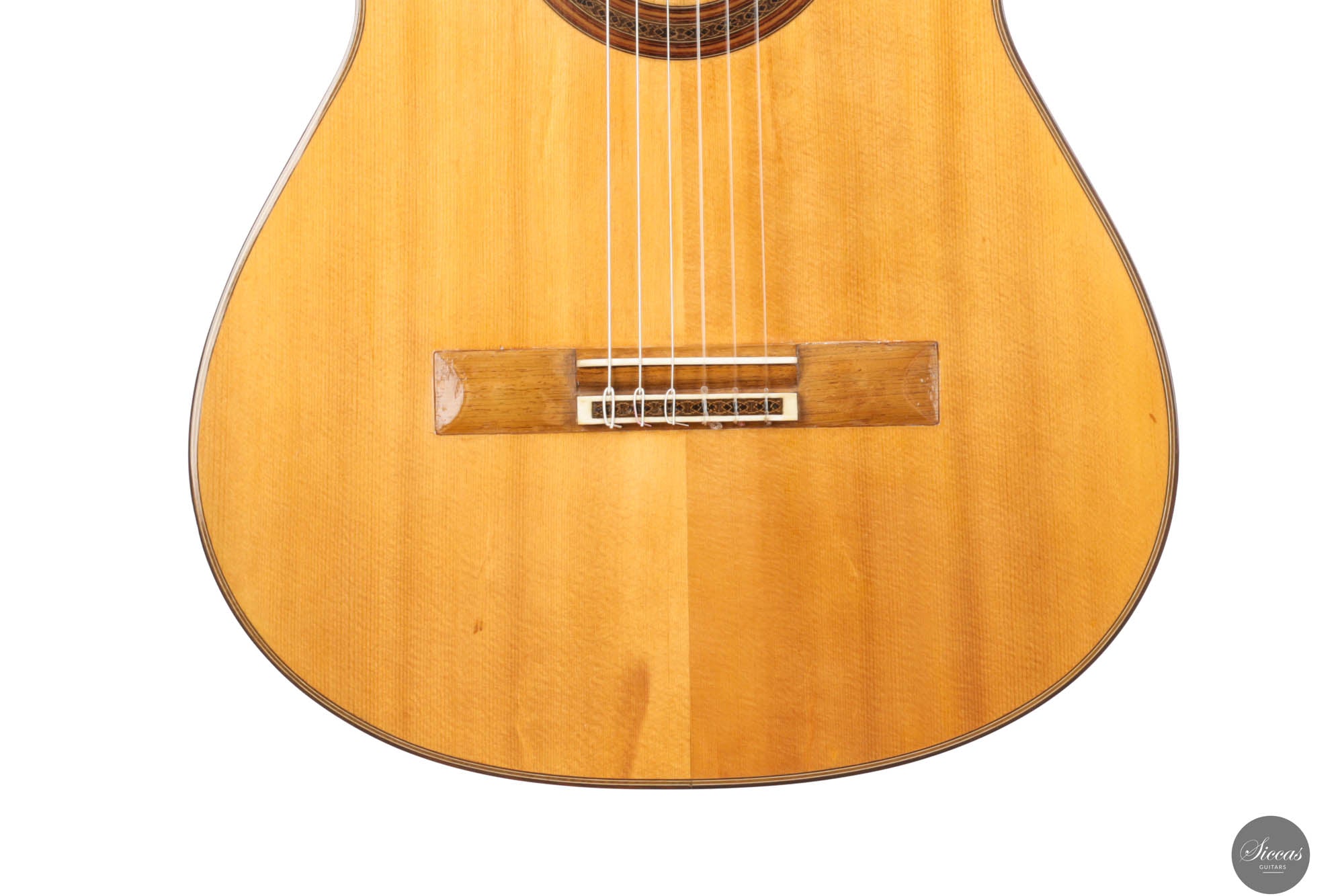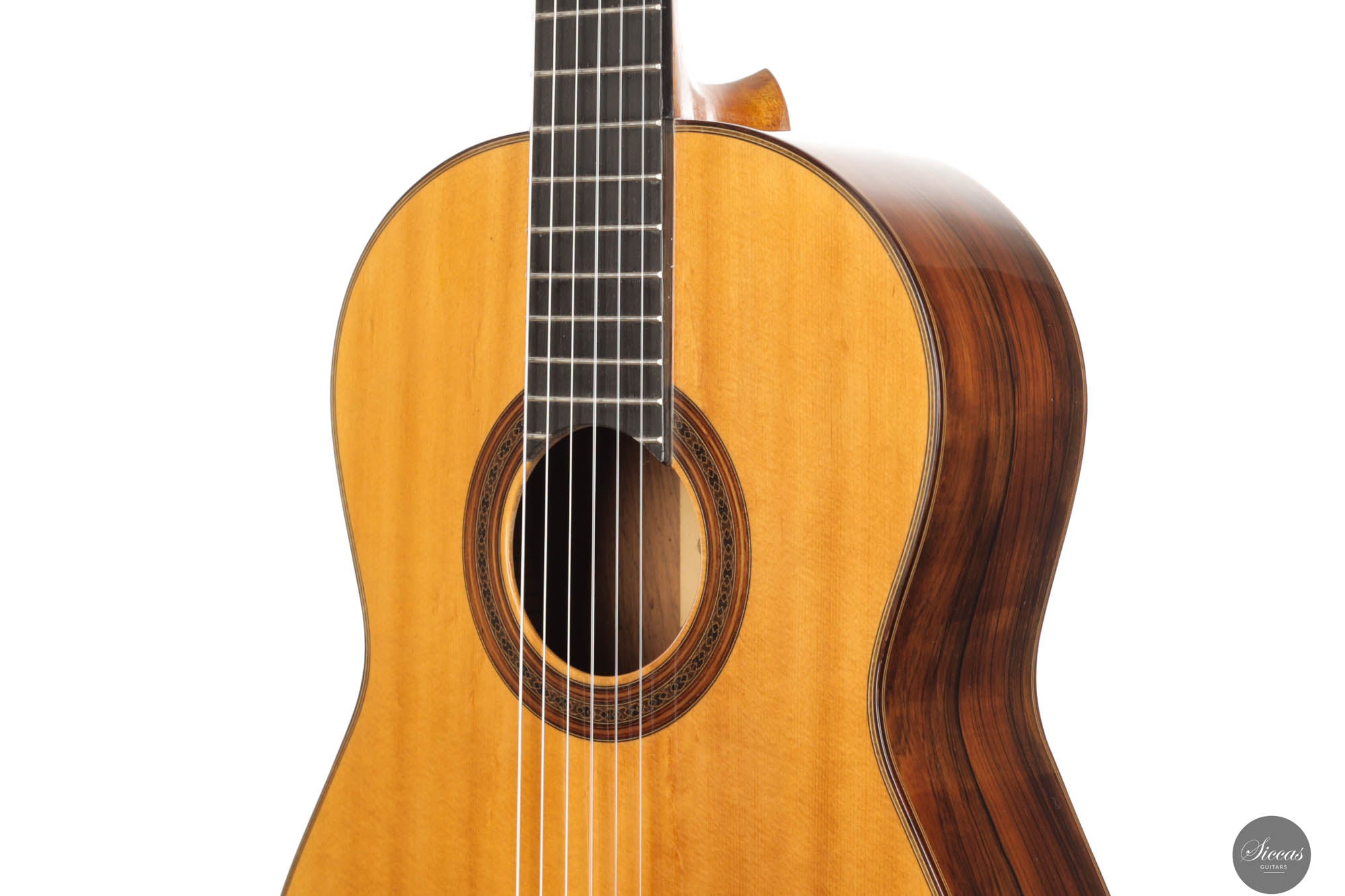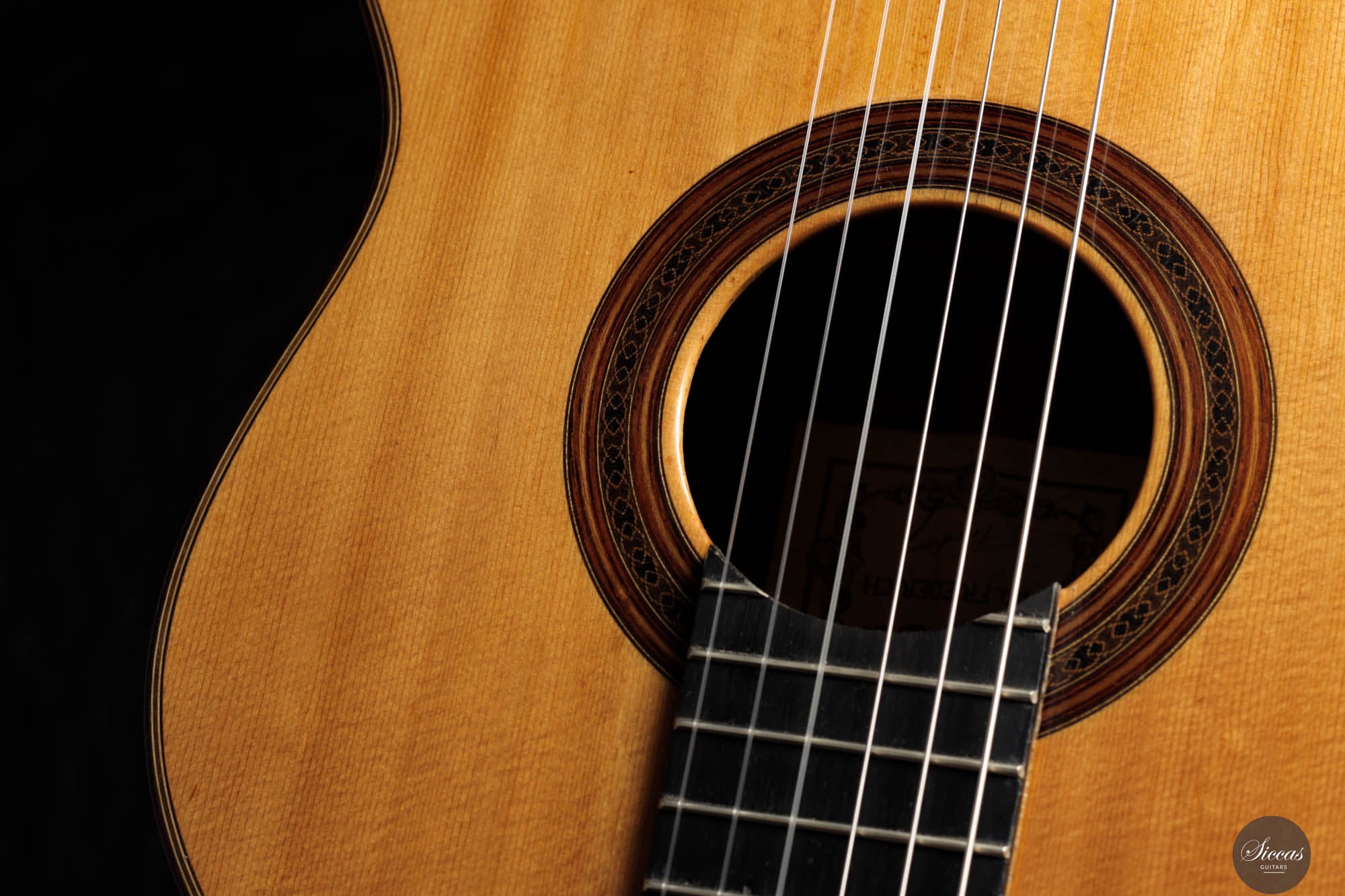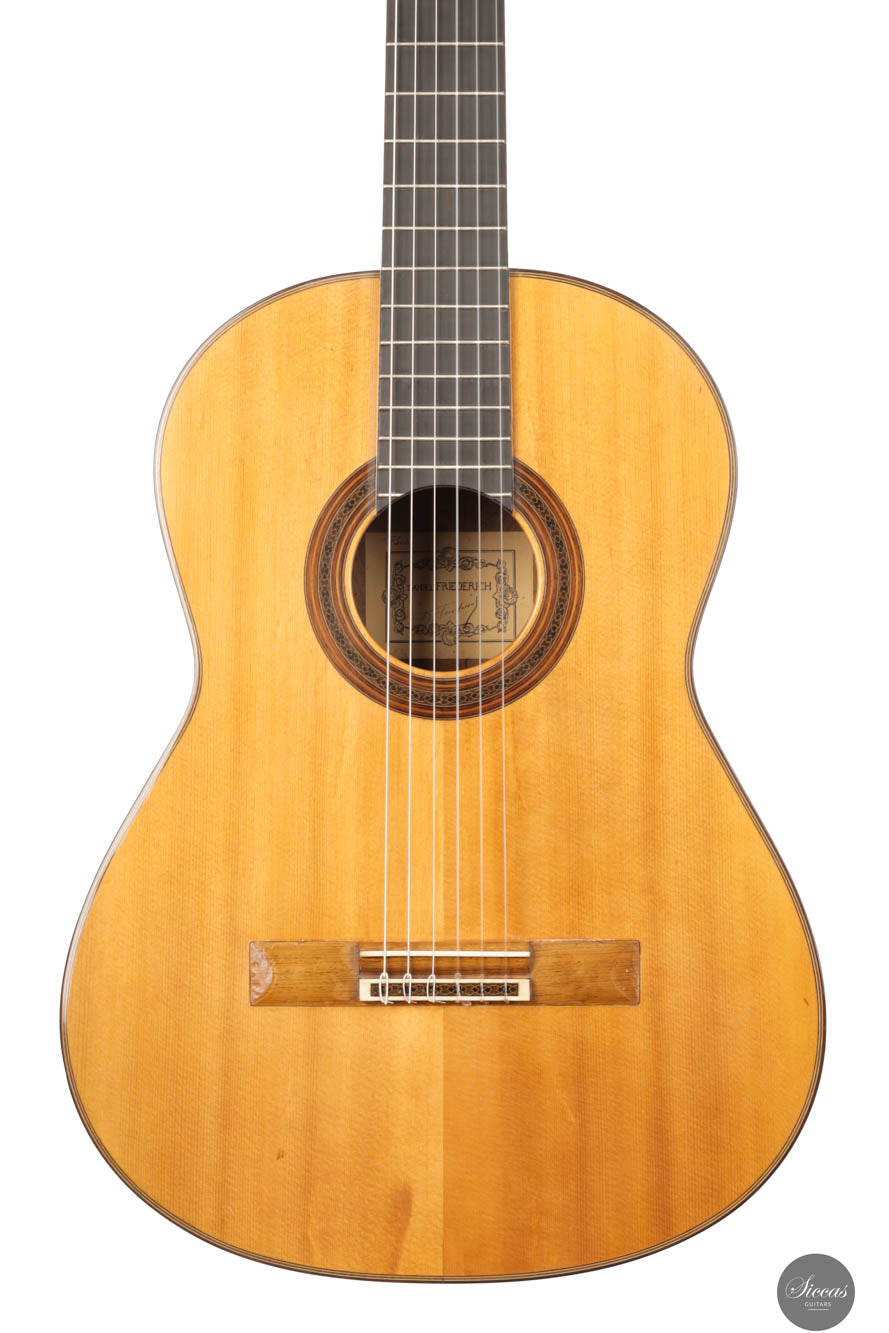 This instrument has been professionally restored and is now in perfect playing condition. The spruce top, with its beautiful grain, is free of cracks or weak spots. A repaired crack on one of the sides is considered stable. The fretboard has been refretted, and the heel block has been reinforced to provide better support for the neck. Finally, the guitar has been repolished with nitrocellulose. The Récital models of the 1960s, known for their refined features and tonal clarity, reflect Friederich’s evolving craftsmanship, making this guitar a testament to his enduring influence in the art of luthiery.