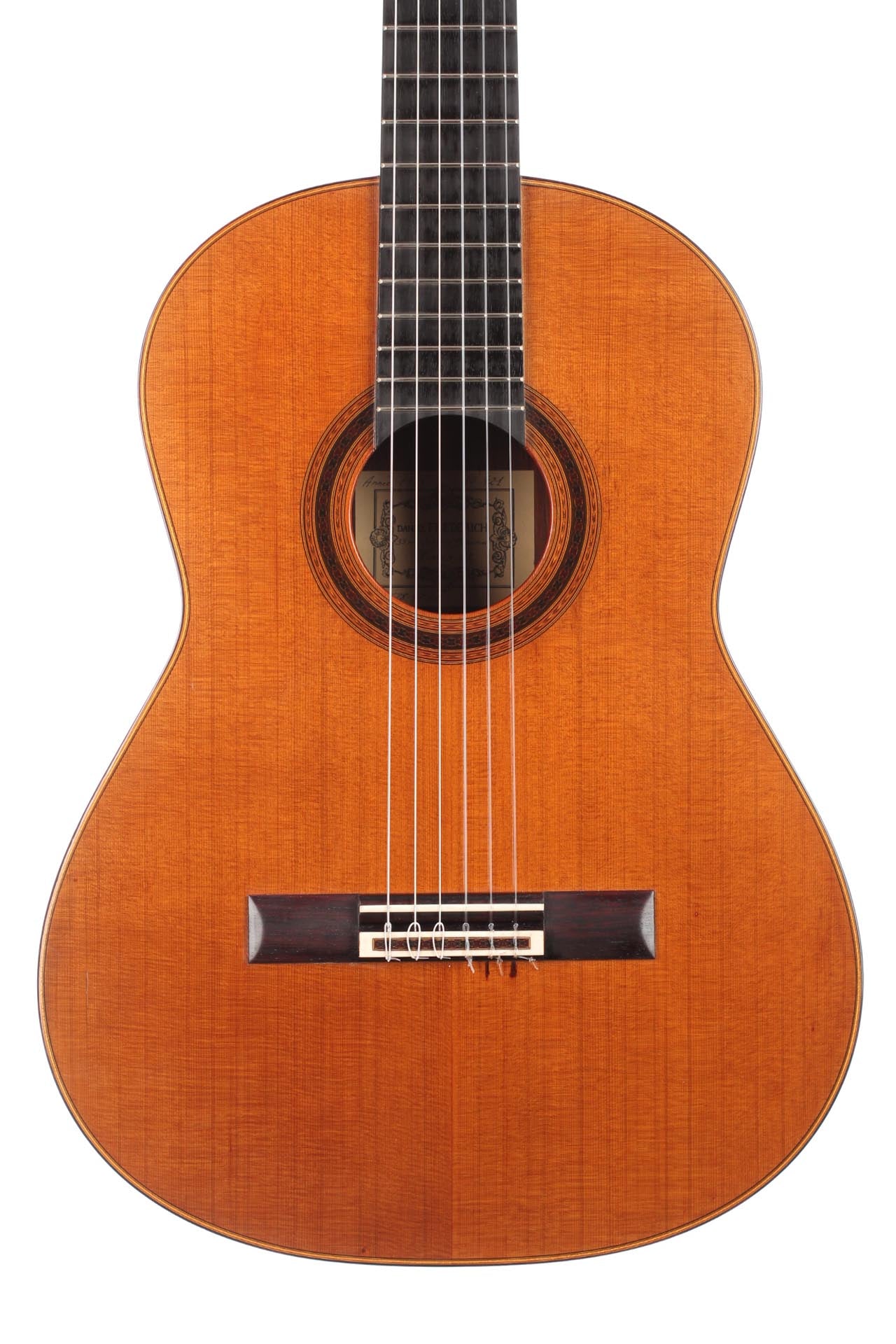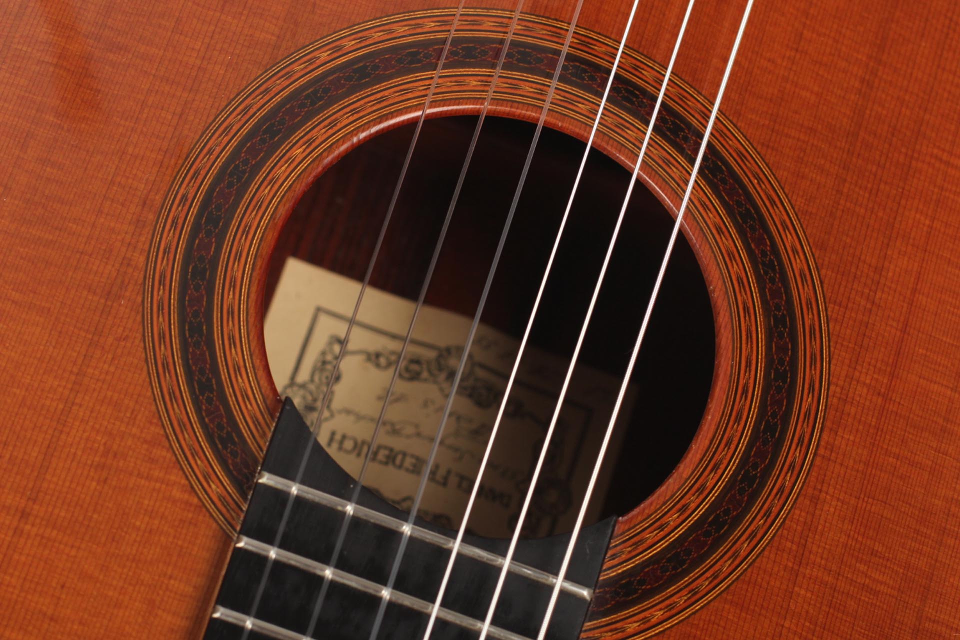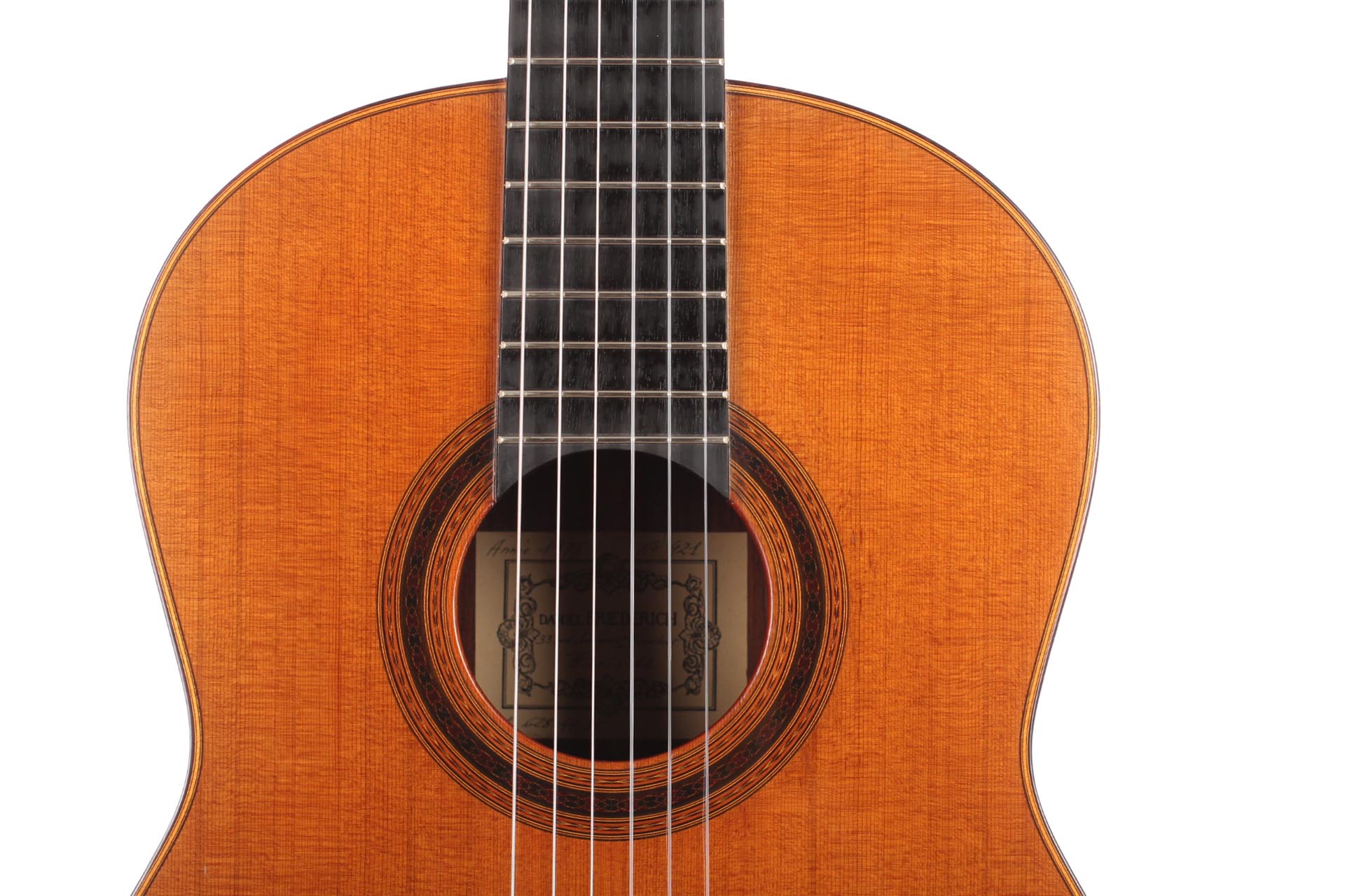 Daniel Friederich was born on January 16, 1932. Although having the strong wish to play guitar, he had to face the shortage of money. However, at the age of 23, Friederich solved this dilemma by building his first guitar himself with the result of a copy of a Simplicio guitar. At the beginning Friederich was helped by his guitar teacher Aubin. Also after the early beginnings of guitar making, Friederich was inspired by the work of his friend Robert Bouchet whose ideas were also further developed by Friederich. For decades, Daniel Friederich has been one of the most important luthiers in the world. In 2015 he stopped to build guitars and sold all his tools.