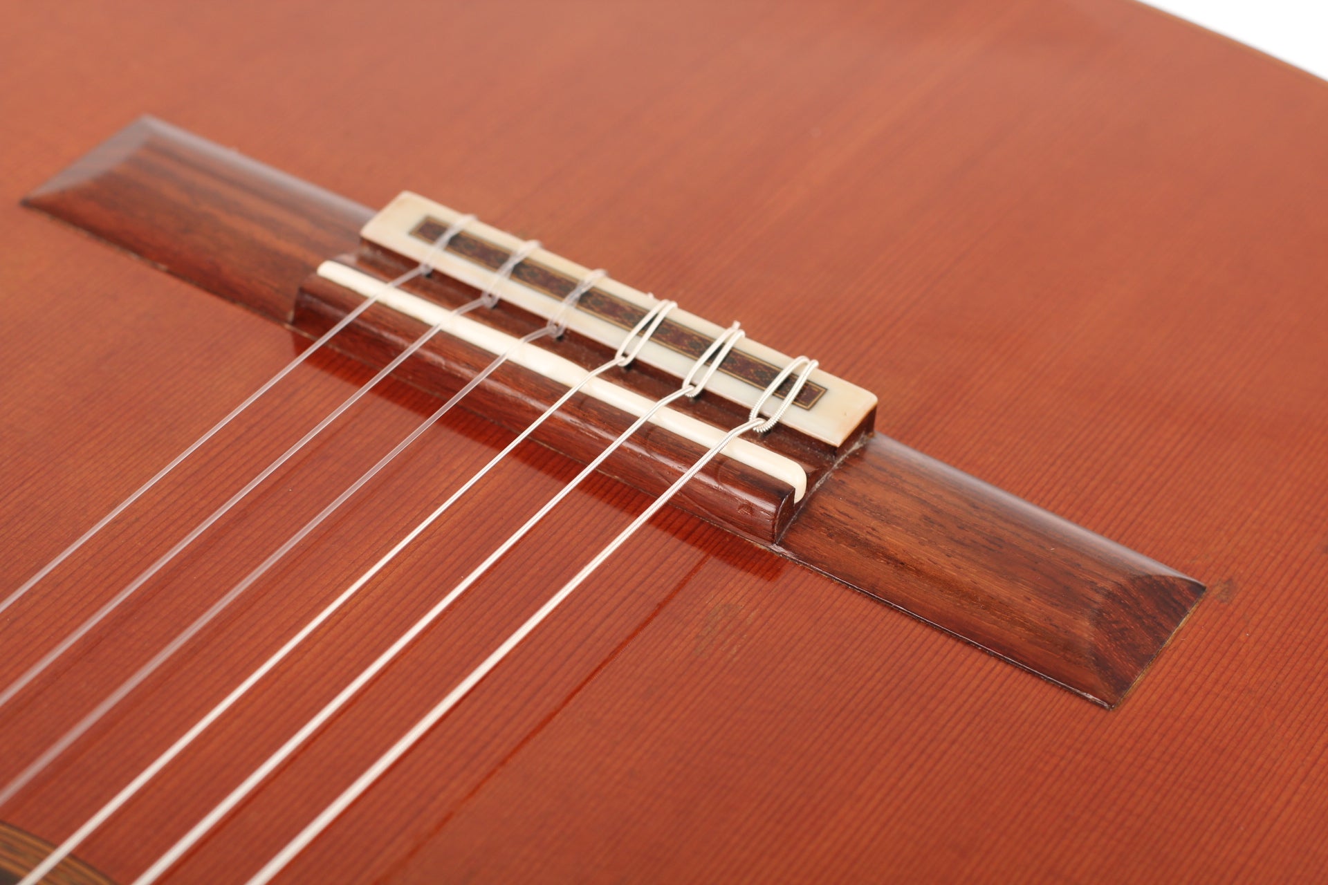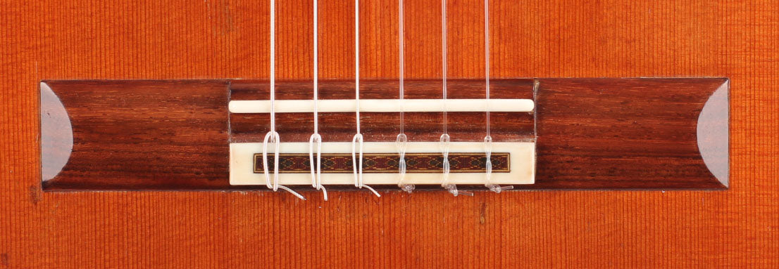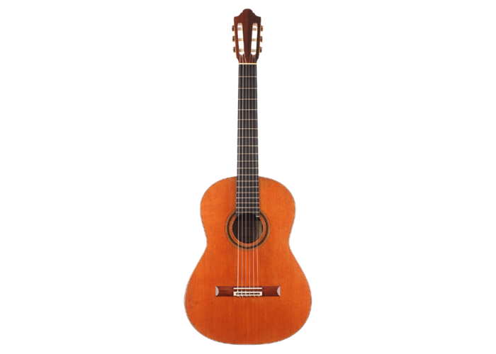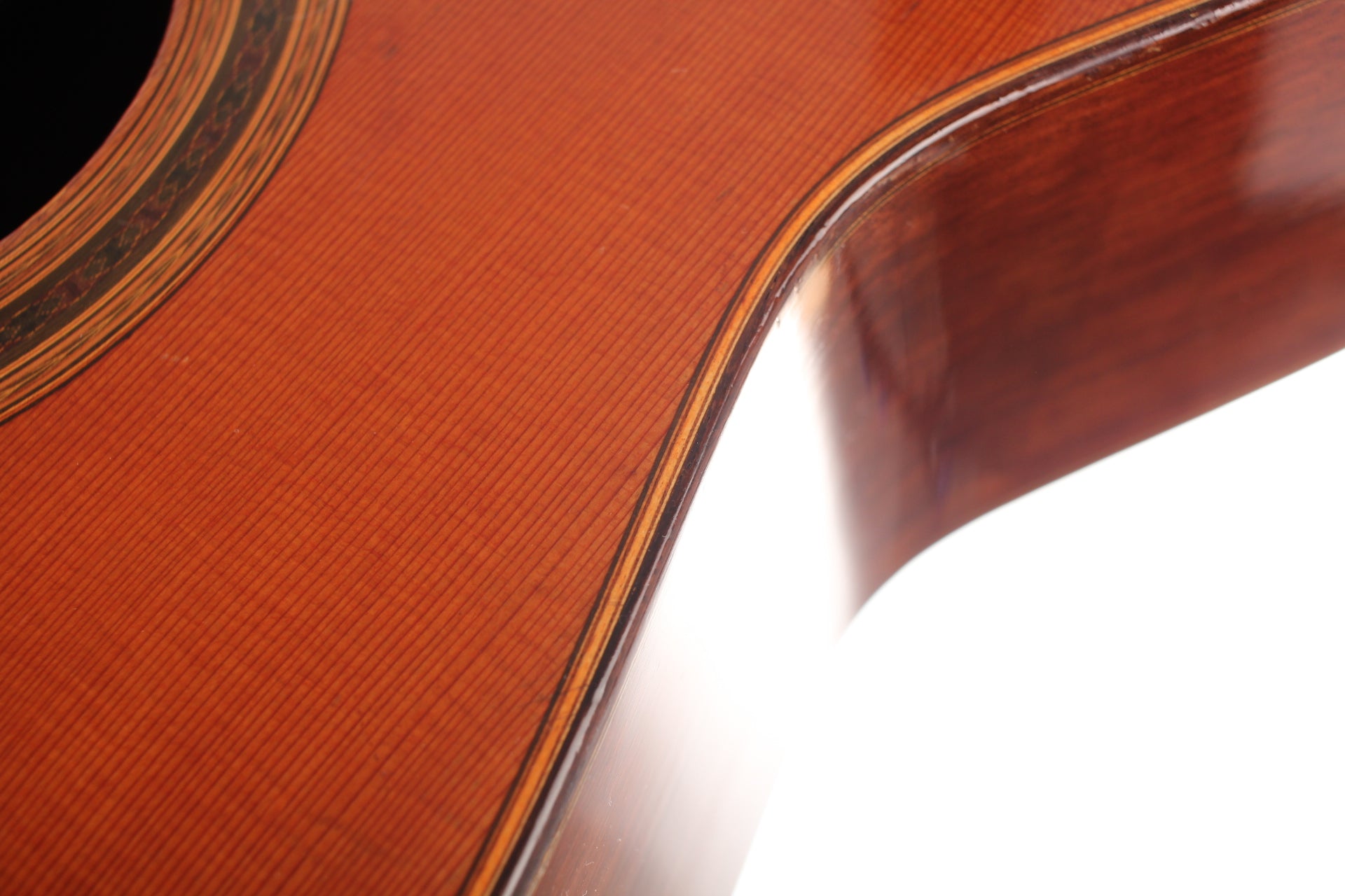 Early in his career, he built some guitars with spruce top, but this changed in 1974 when he finally devoted himself mainly to guitars with cedar top (with only few exceptions that were built on special request. This guitar is one of the examples with a cedar top and is in very good condition. This guitar has a lot of strength and a rich tone of cedar and at the same time the clarity and sustain of spruce.
