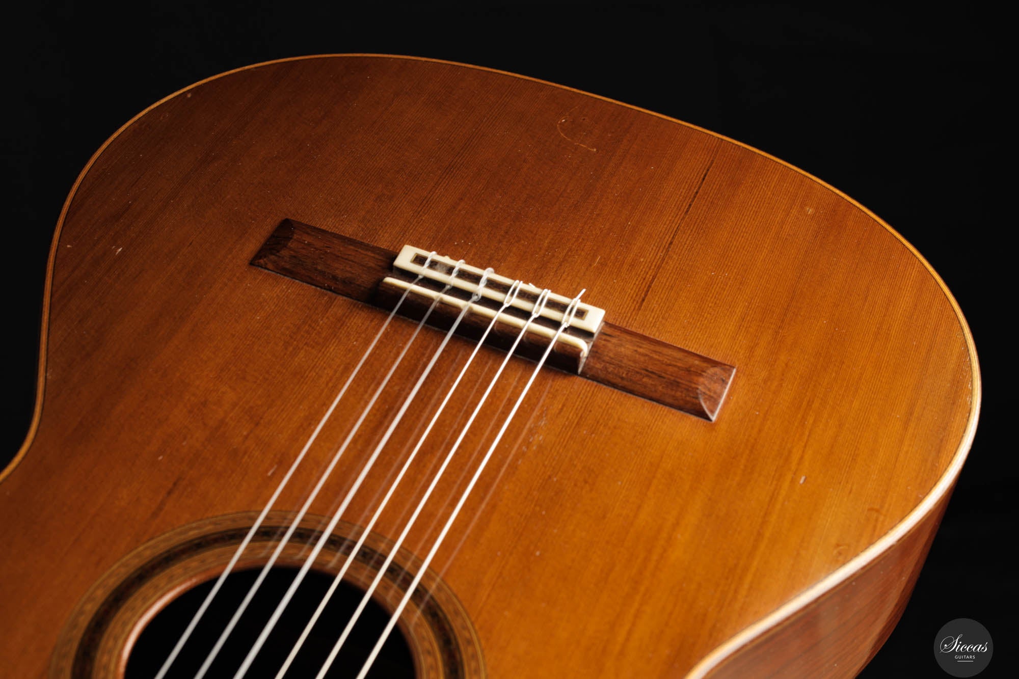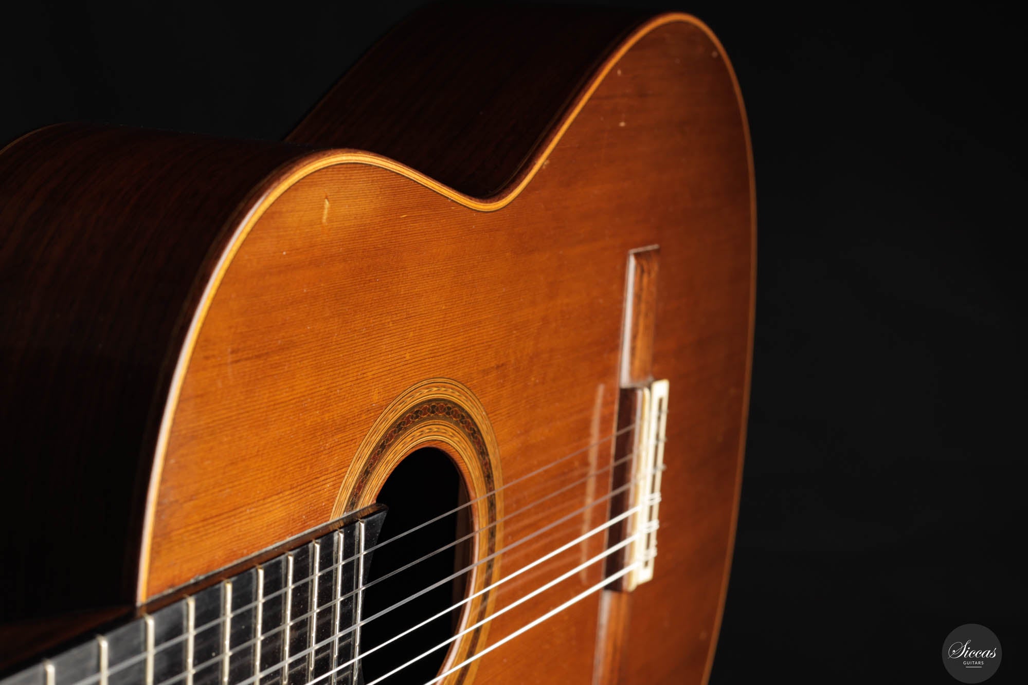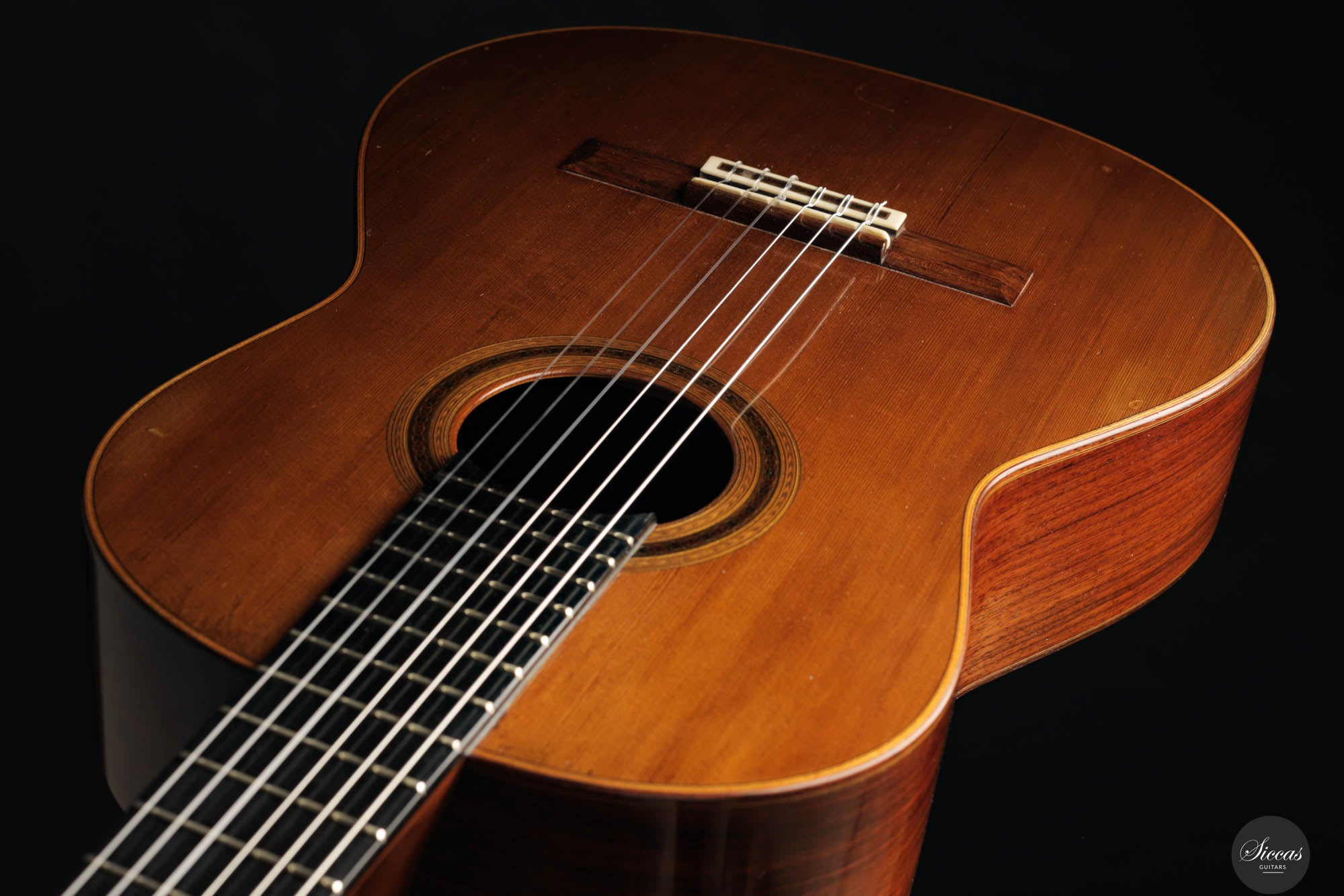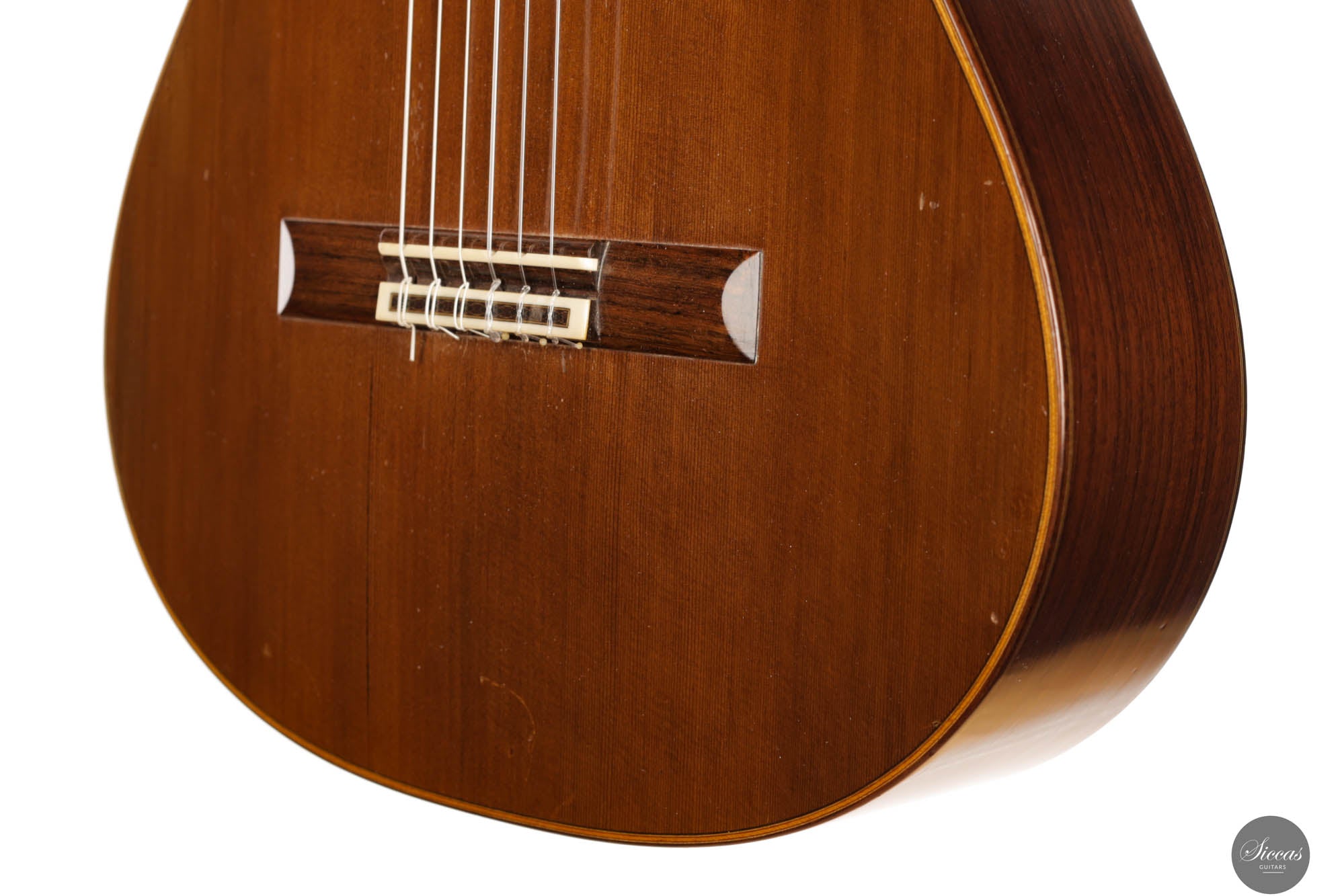 The “Concert Model” No. 462, crafted in 1977 by the renowned luthier Daniel Friederich, is an exquisite example of masterful guitar-making. This instrument, with its captivating cedar top, epitomizes the art of classical guitar construction, offering a tonal richness that resonates with every strum. The sonority of this guitar is akin to a poetic expression, with trebles that sing with a crystalline clarity, producing a luxurious sustain reminiscent of a bell's chime. The robust basses, warm and potent, provide a perfect counterbalance to the trebles, creating an overall sound that is beautifully symphonic. Each note played on this guitar finds its perfect place, weaving together to form a harmonious and captivating soundscape.