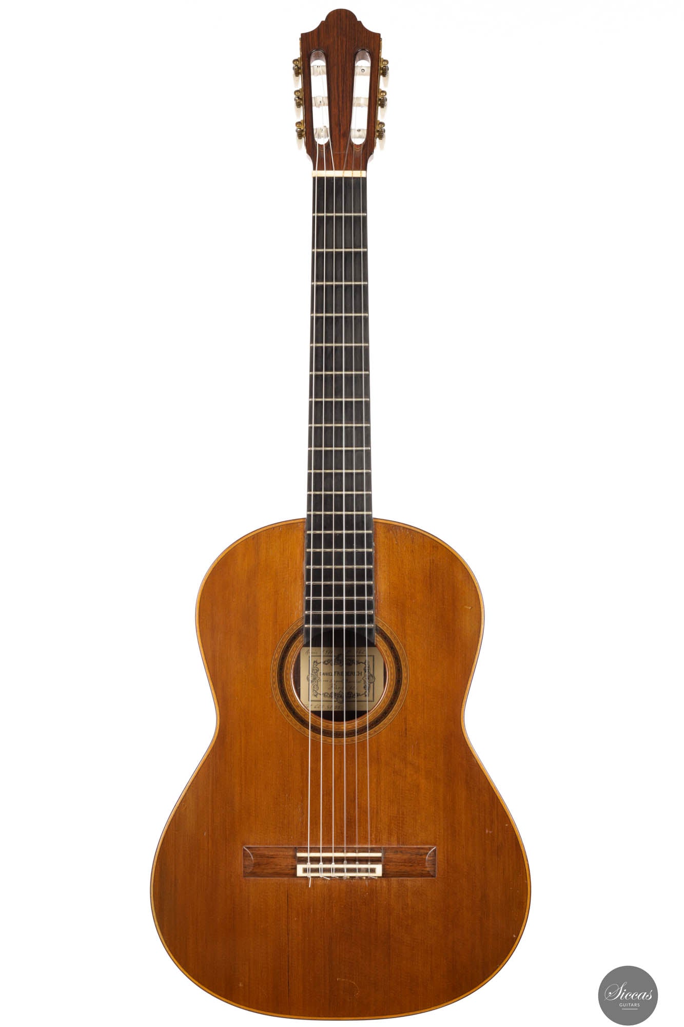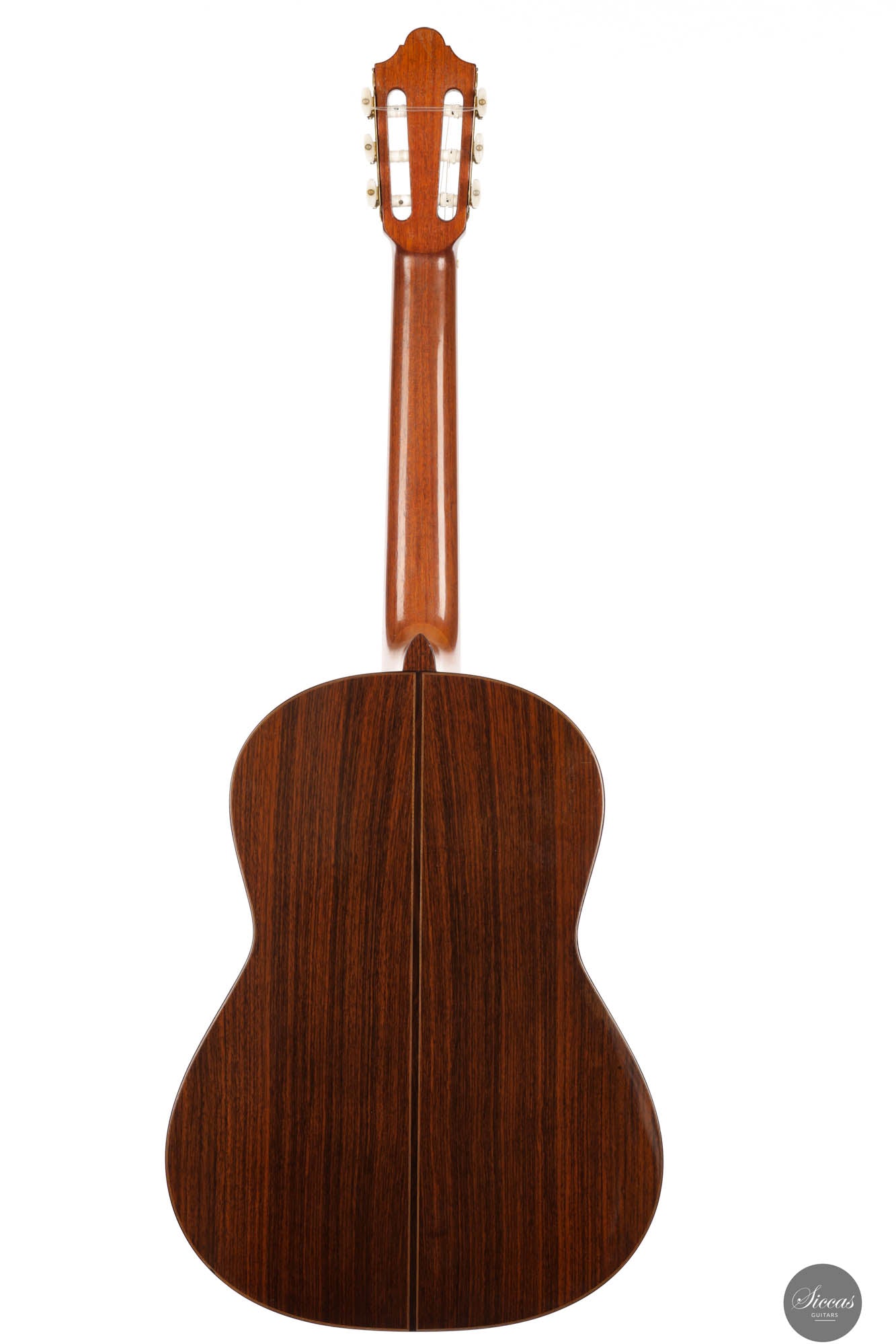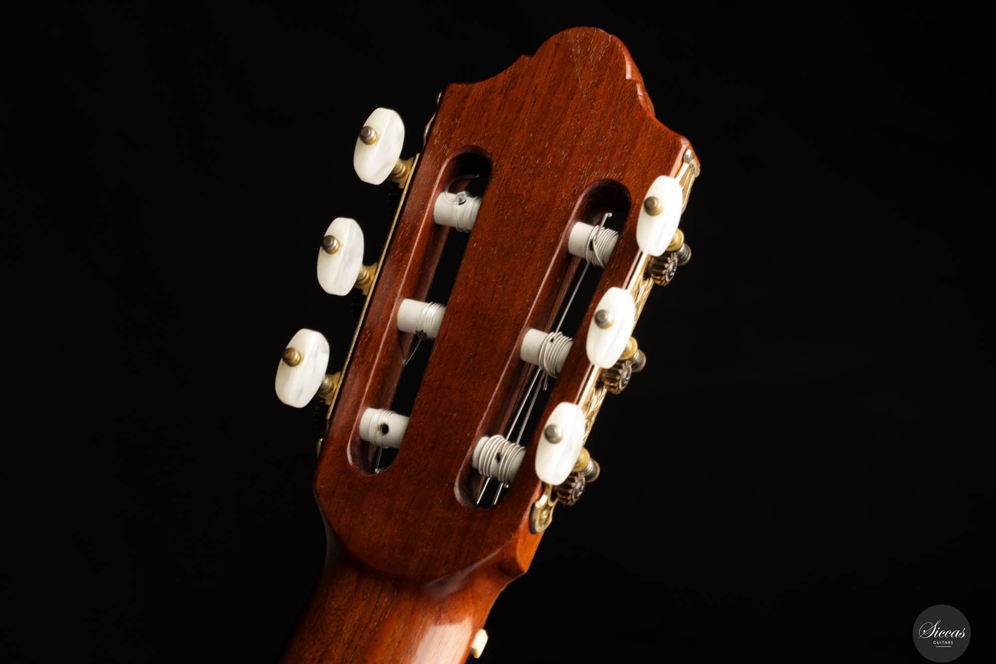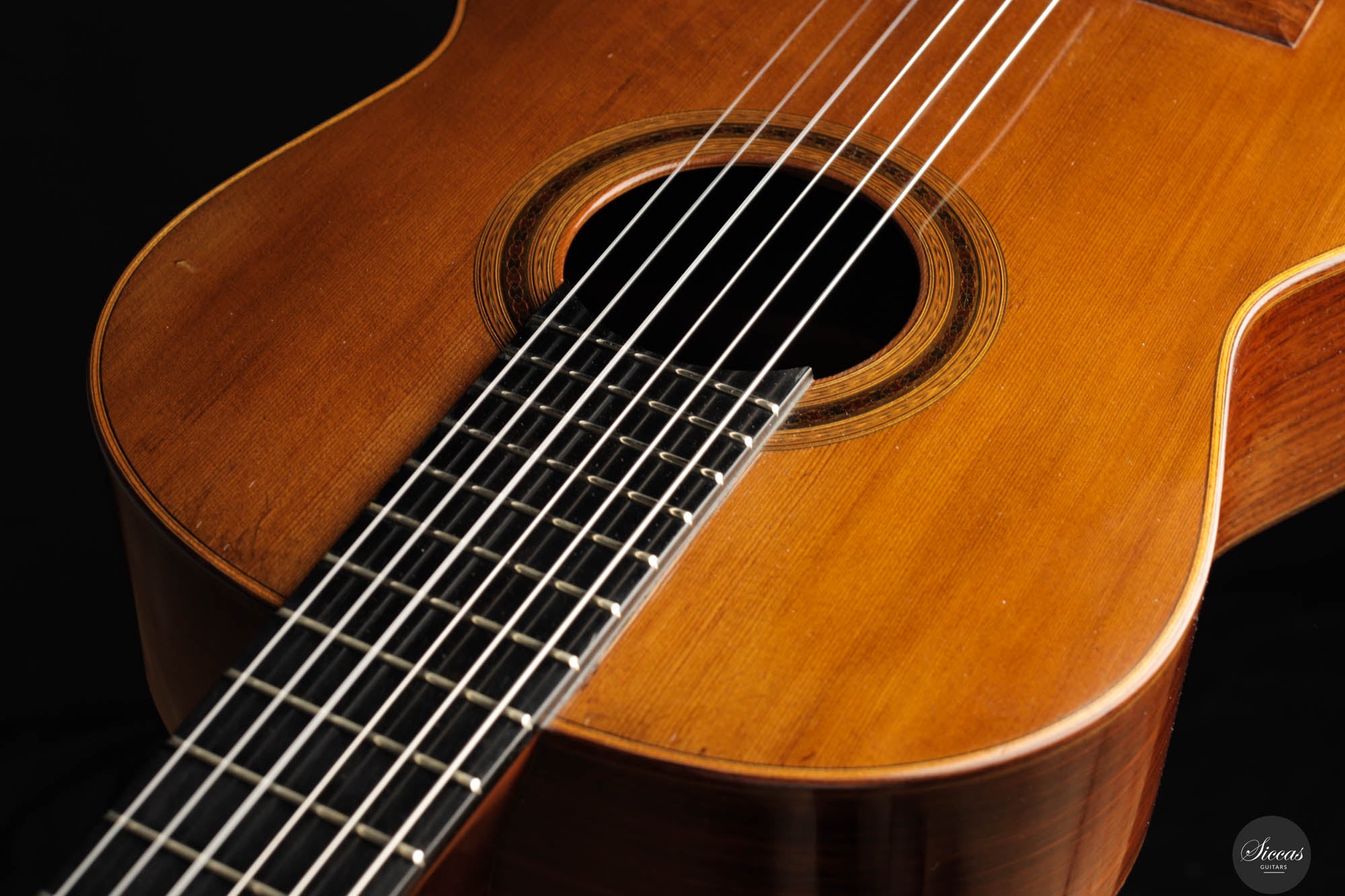 The “Concert Model” No. 462, crafted in 1977 by the renowned luthier Daniel Friederich, is an exquisite example of masterful guitar-making. This instrument, with its captivating cedar top, epitomizes the art of classical guitar construction, offering a tonal richness that resonates with every strum. The sonority of this guitar is akin to a poetic expression, with trebles that sing with a crystalline clarity, producing a luxurious sustain reminiscent of a bell's chime. The robust basses, warm and potent, provide a perfect counterbalance to the trebles, creating an overall sound that is beautifully symphonic. Each note played on this guitar finds its perfect place, weaving together to form a harmonious and captivating soundscape.