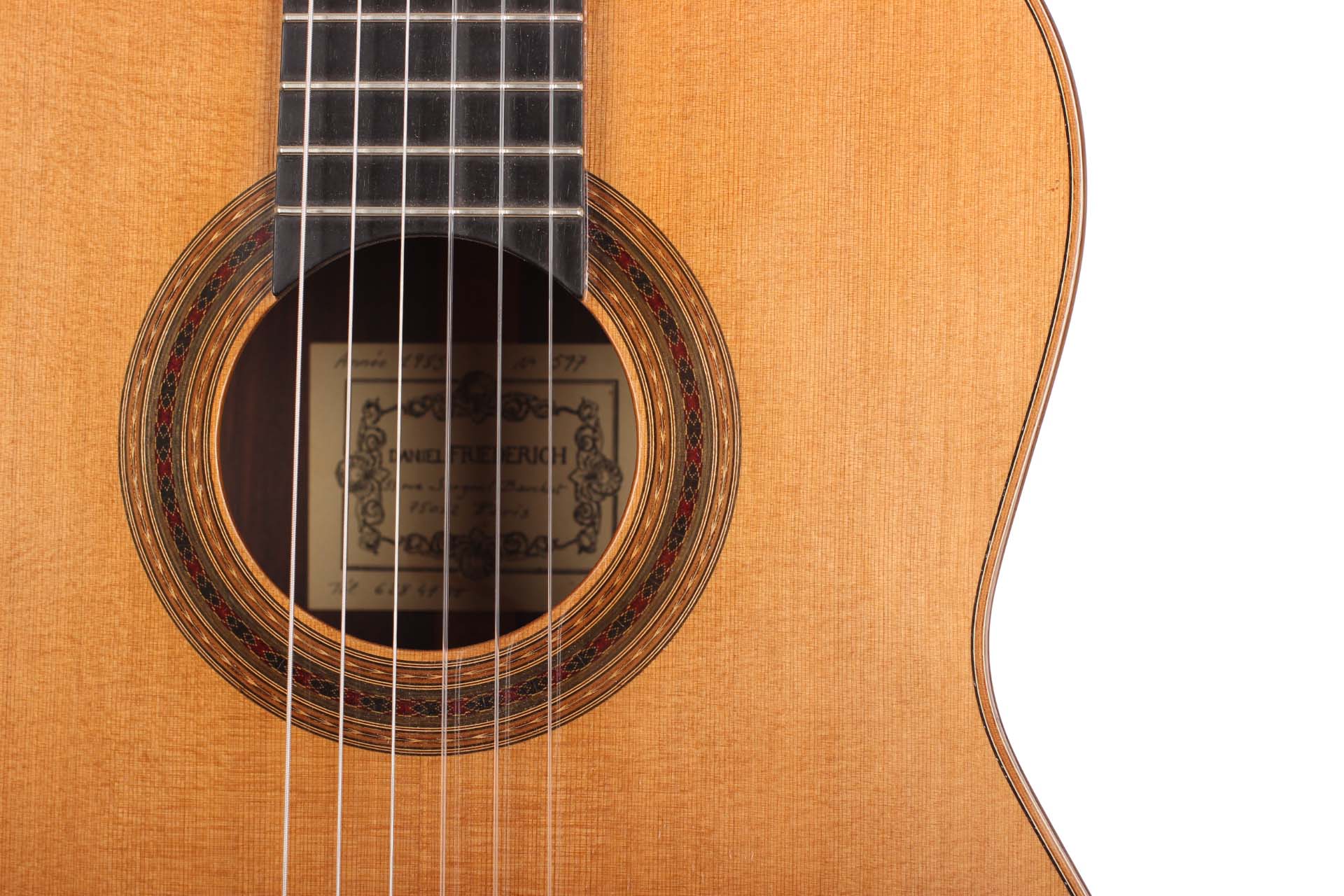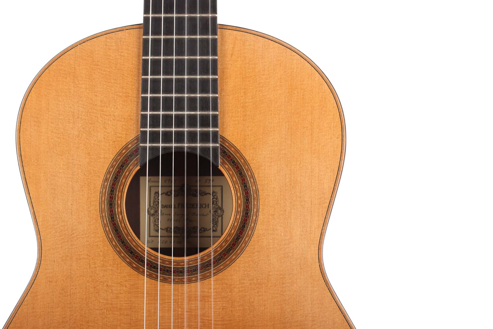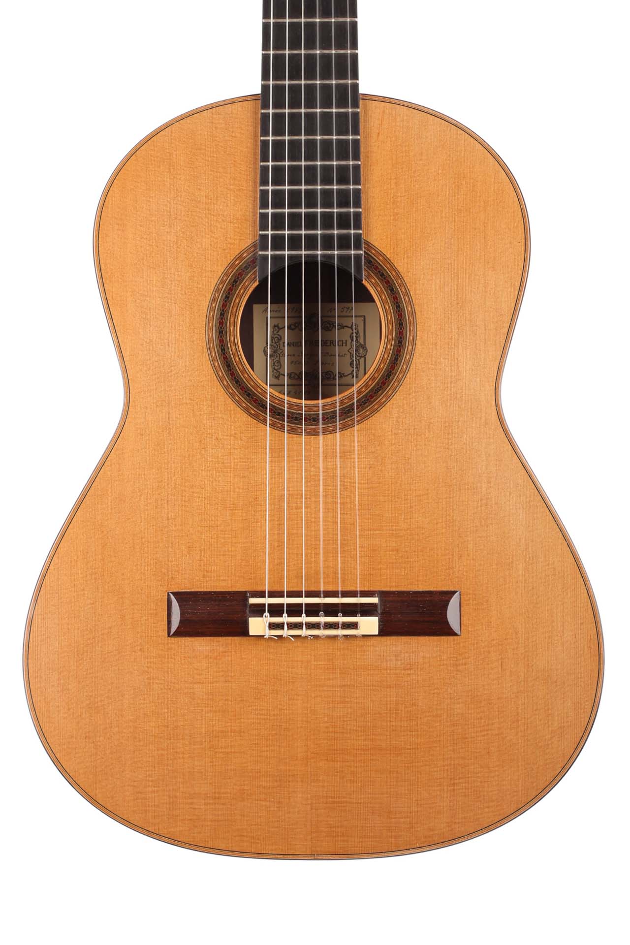 Daniel Friederich was born on January 16, 1932. Although having the strong wish to play guitar, he had to face the shortage of money. However, at the age of 23, Friederich solved this dilemma by building his first guitar himself with the result of a copy of a Simplicio guitar. At the beginning Friederich was helped by his guitar teacher Aubin. Also after the early beginnings of guitar making, Friederich was inspired by the work of his friend Robert Bouchet whose ideas were also further developed by Friederich. For decades, Daniel Friederich has been one of the most important luthiers in the world. In 2015 he stopped to build guitars and sold all his tools.
