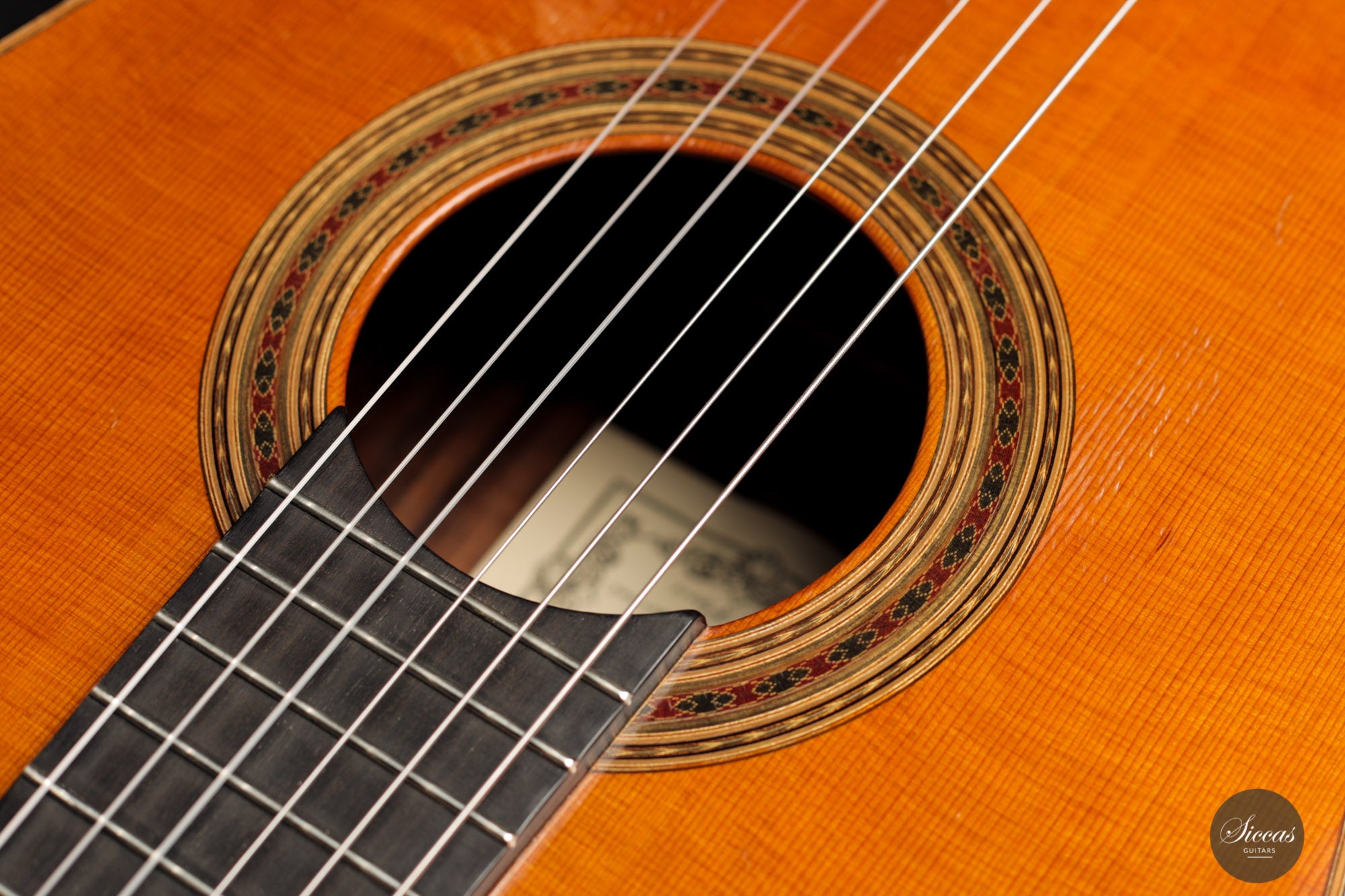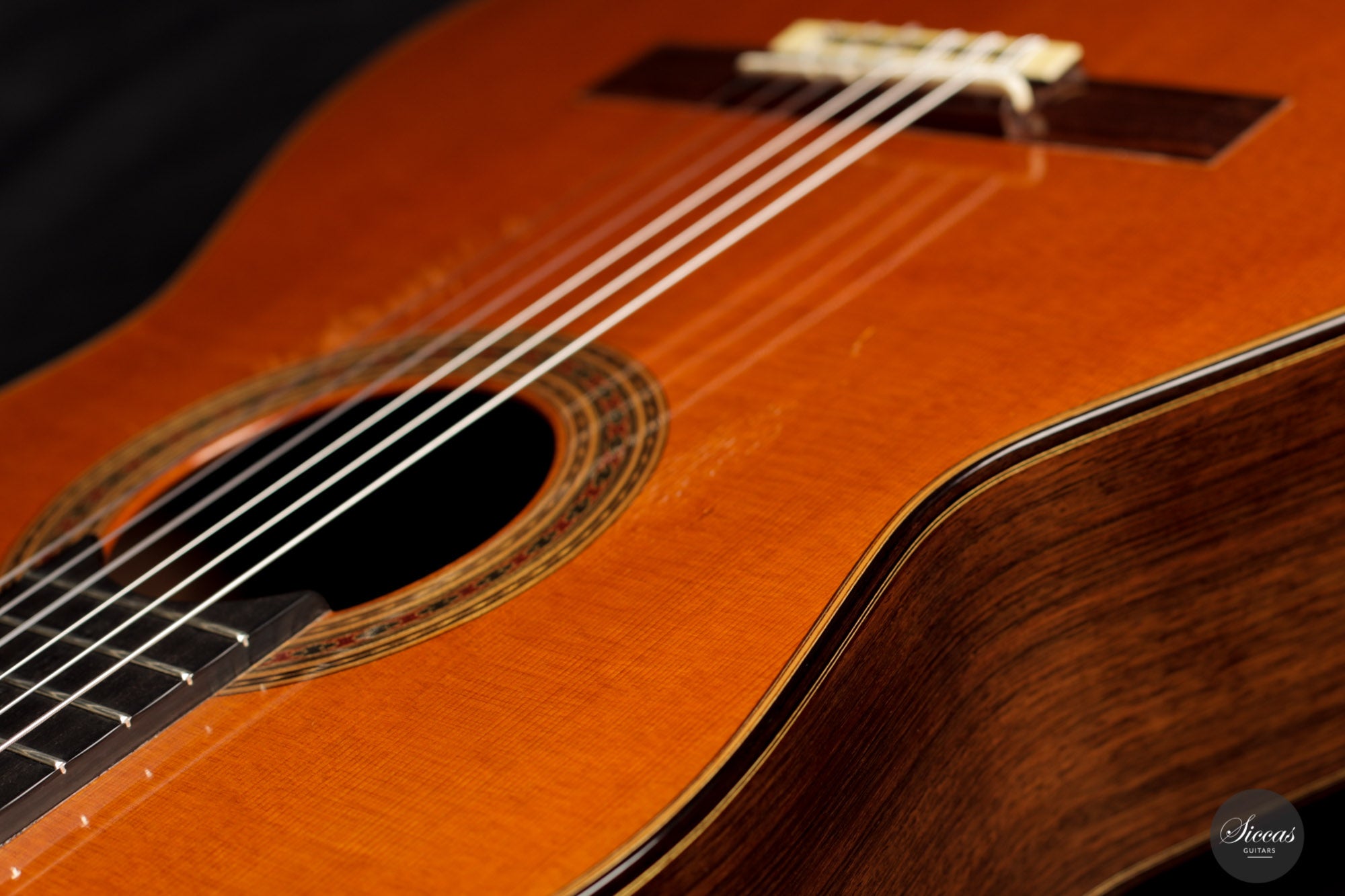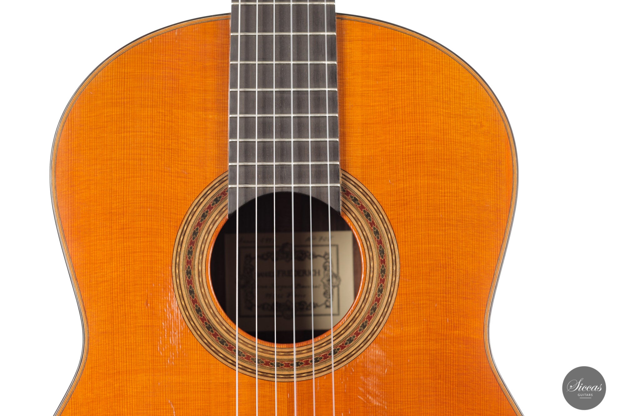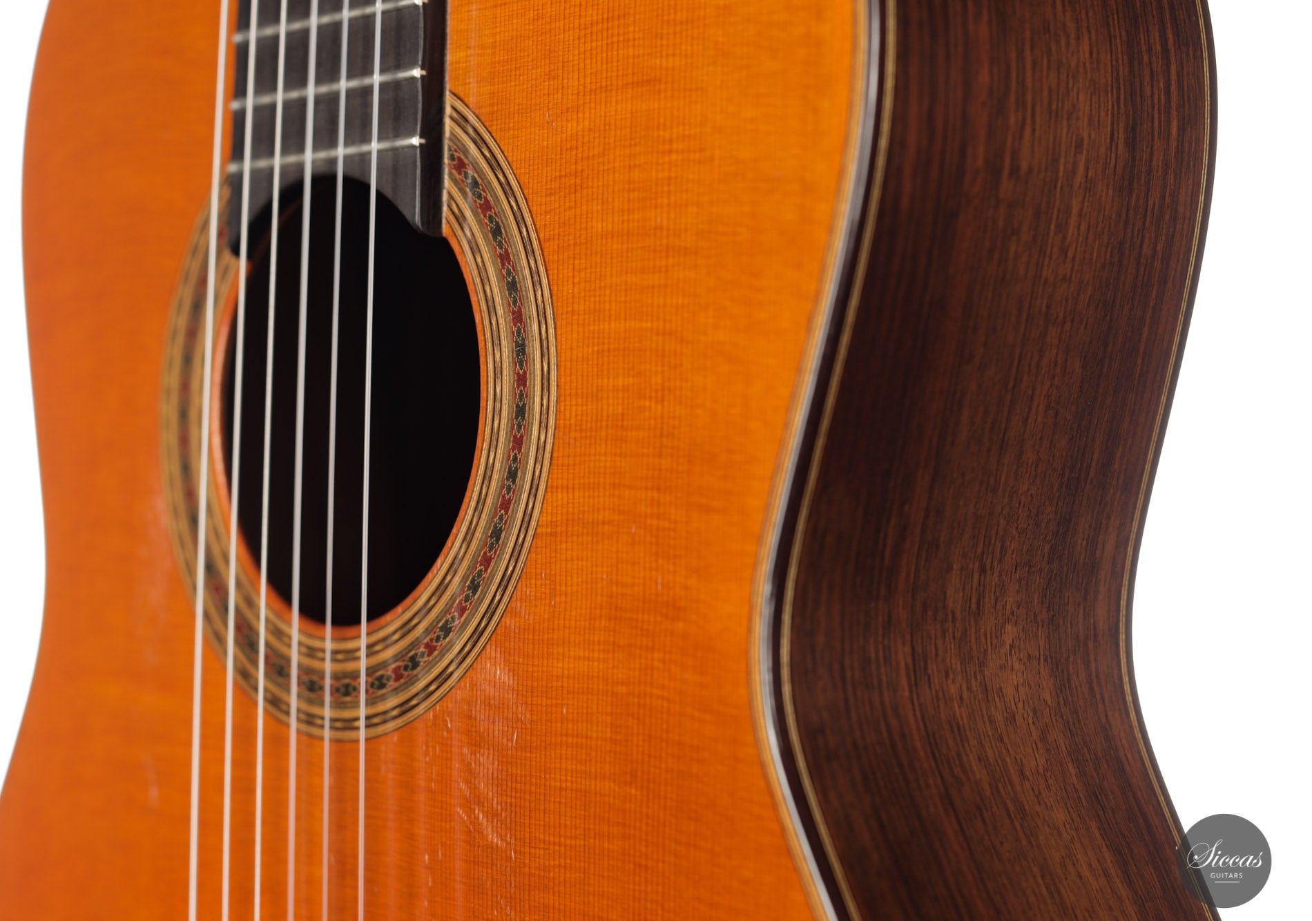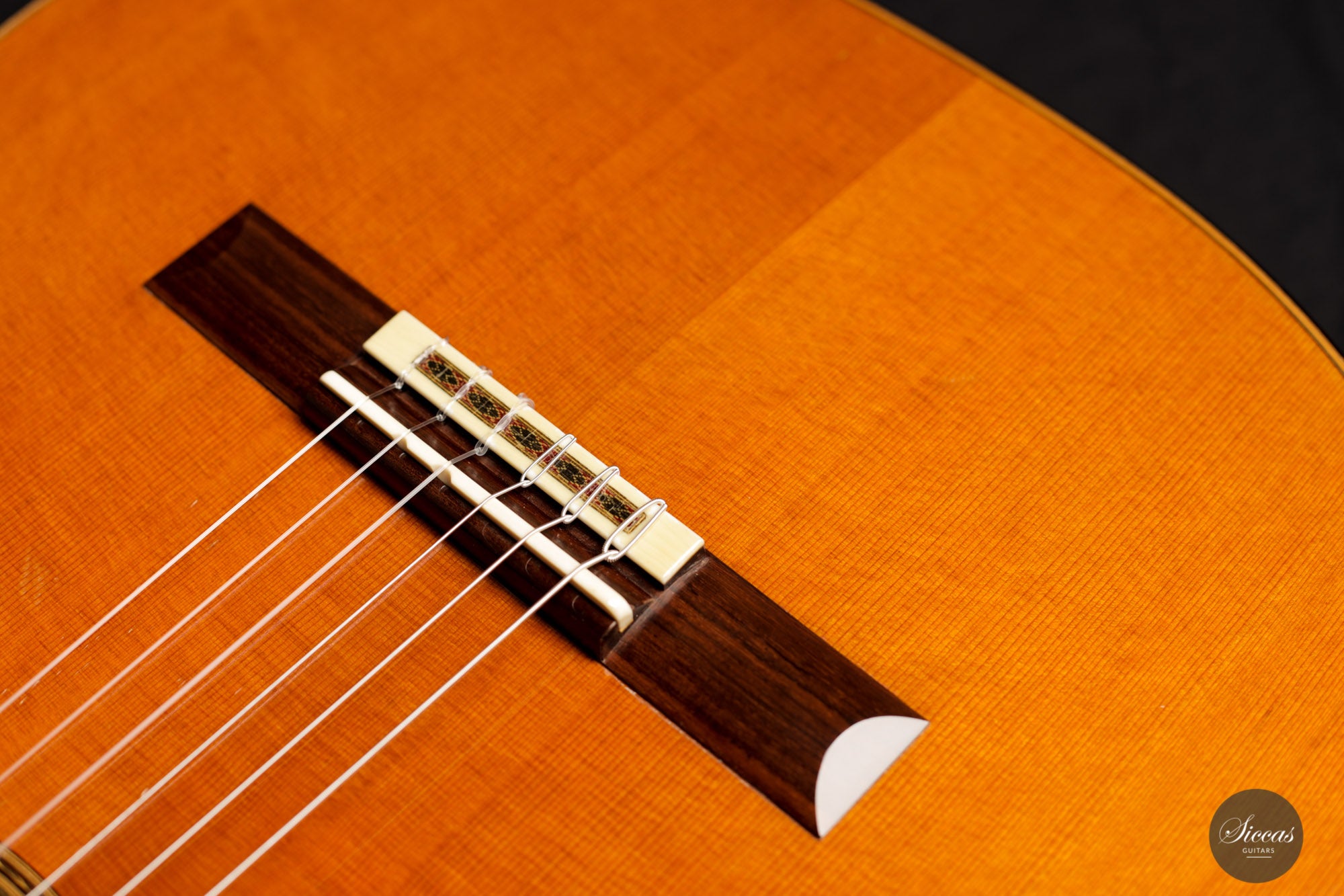 This guitar number 705, built in 1993, is a wonder of spontaneity, openness, and emotion. This sound masterpiece is in very good condition with only a tiny hairline crack on the lower bout of the soundboard, perfectly stable and hardly noticeable. No description can do justice to the quality of sound and charm of this guitar. Suffice to say that it is impeccable.