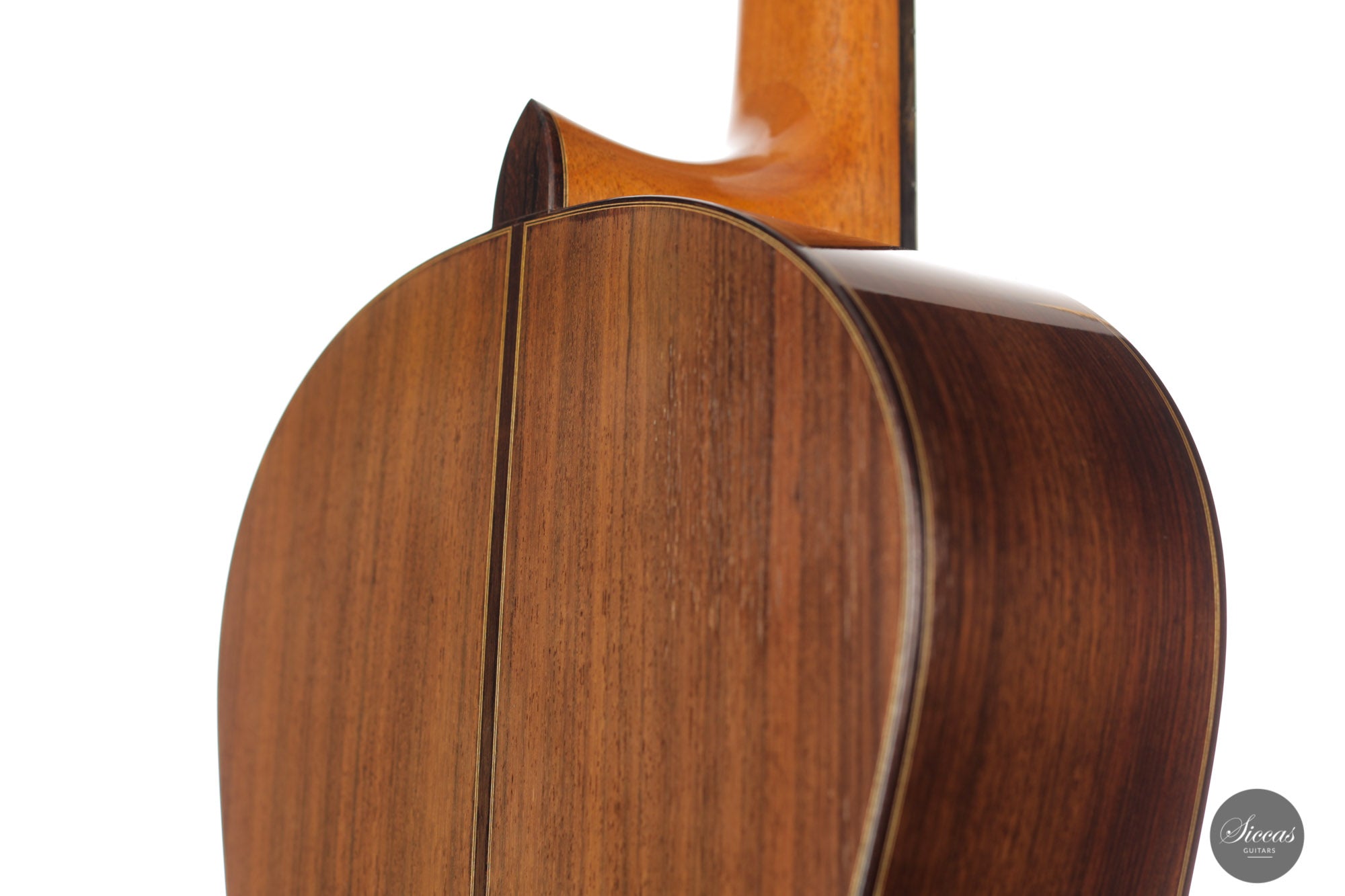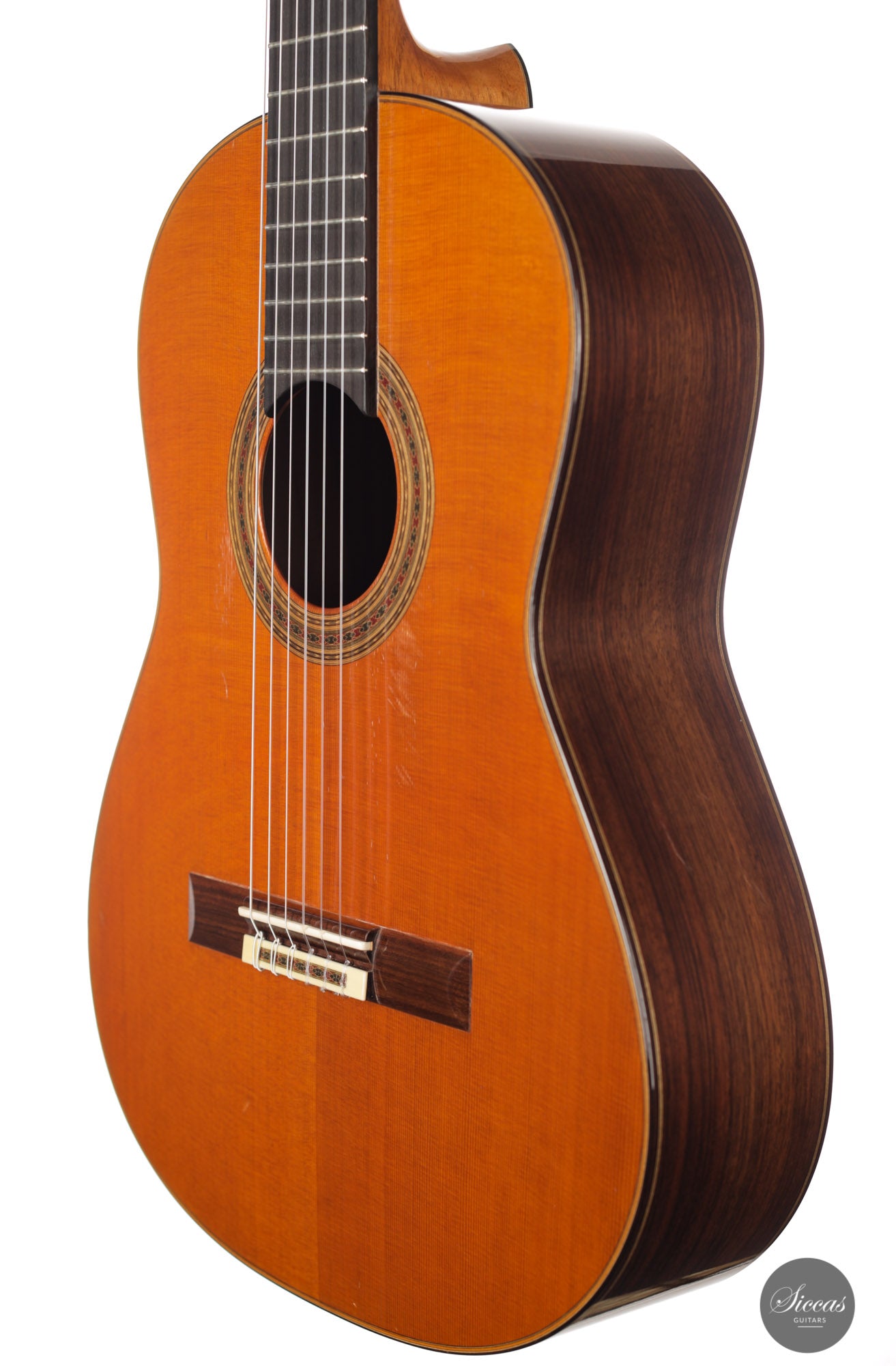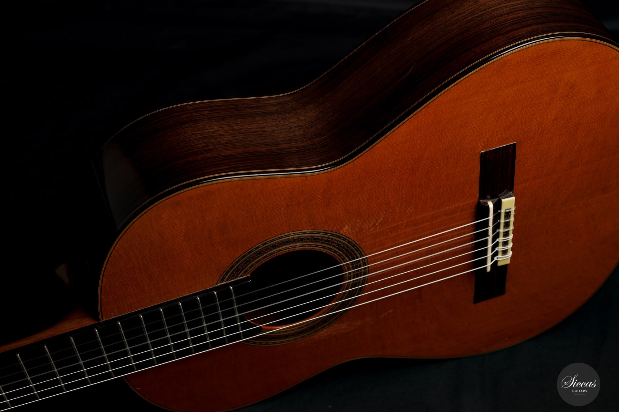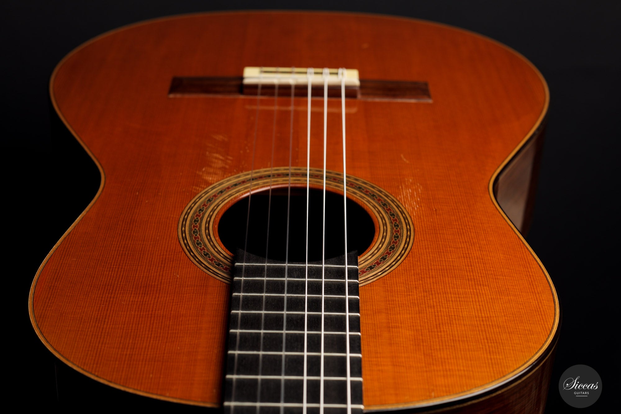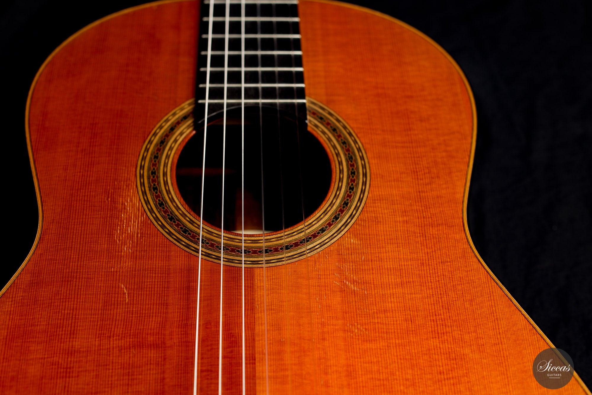This guitar number 705, built in 1993, is a wonder of spontaneity, openness, and emotion. This sound masterpiece is in very good condition with only a tiny hairline crack on the lower bout of the soundboard, perfectly stable and hardly noticeable. No description can do justice to the quality of sound and charm of this guitar. Suffice to say that it is impeccable.