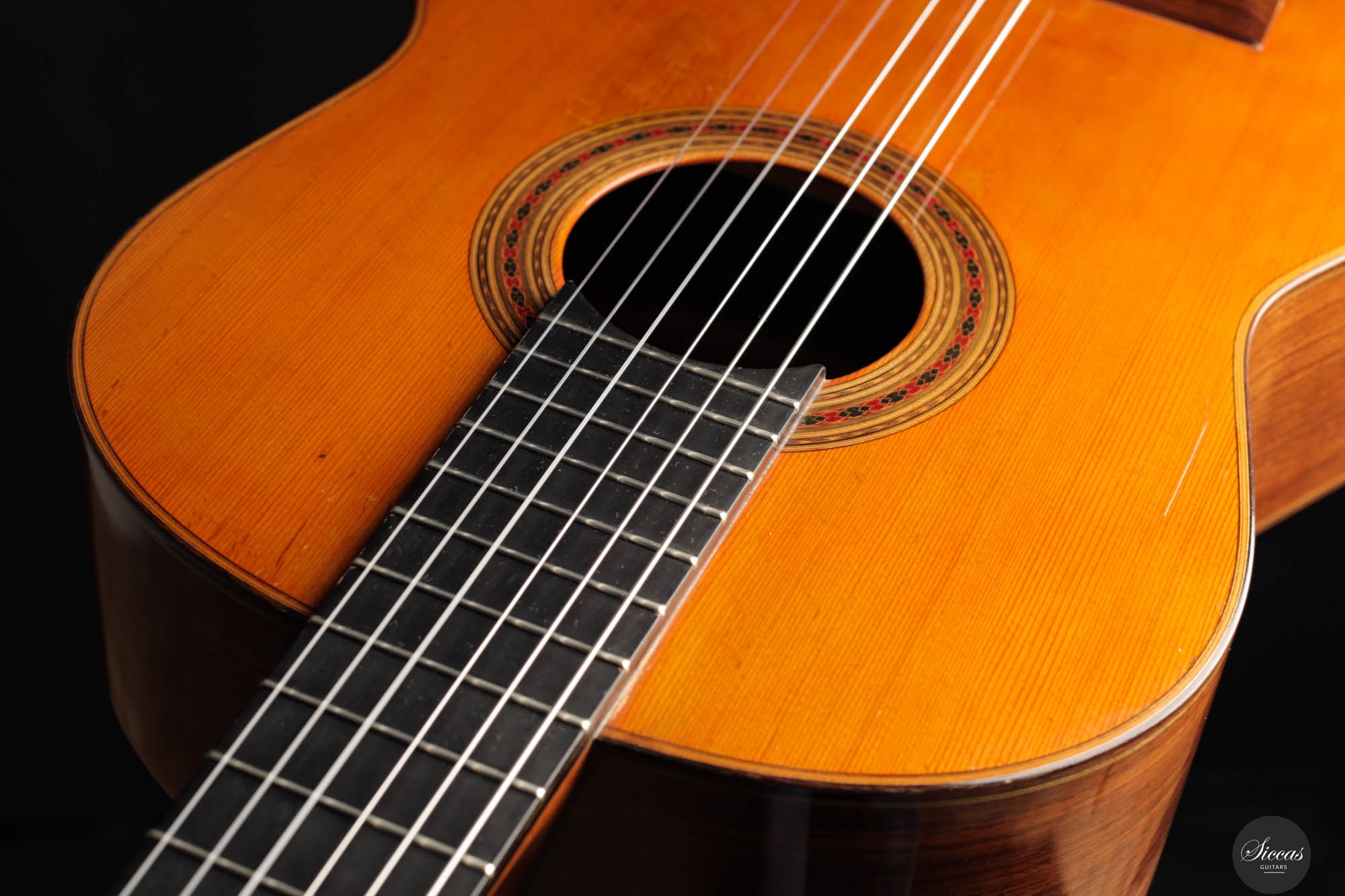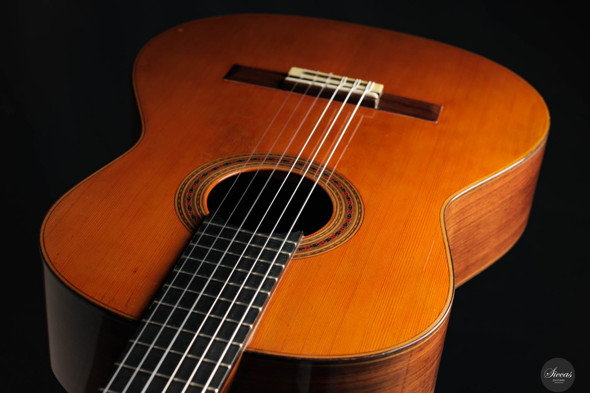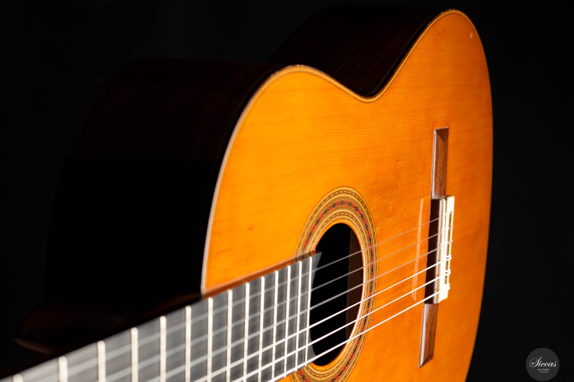 The aesthetic and acoustic beauty of this guitar is further elevated by its Indian rosewood back, a material renowned for its visual and tonal richness. The sides, doubled with mahogany, enhance the guitar's sound projection and resonance, contributing to its full-bodied character. The condition of this guitar is exemplary, with its original integrity preserved, barring several finishing retouch. It remains free from cracks or repairs. Owning the 1994 Daniel Friederich “Concert Model” No. 725 is not just about possessing a high-caliber guitar; it's about embracing a piece of history from one of the most revered guitar makers of our time. This instrument is not merely an object of beauty and sound; it is a legacy, a treasure for any musician or collector who appreciates the artistry and history embedded within the world of classical guitars.