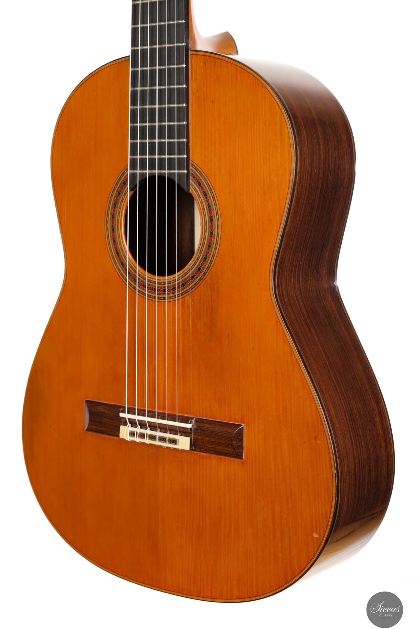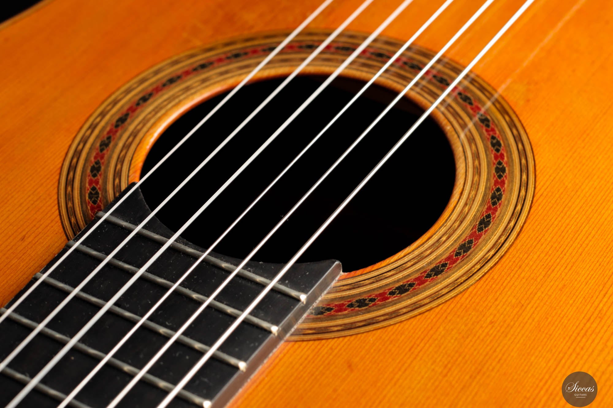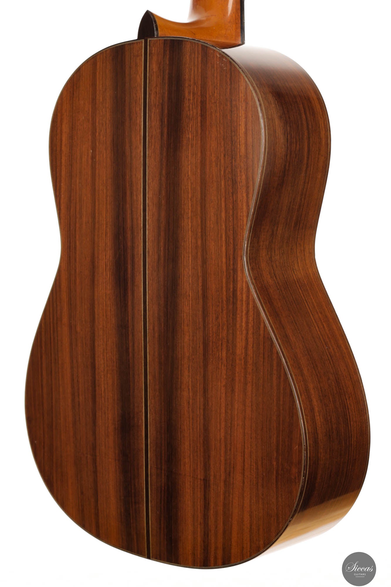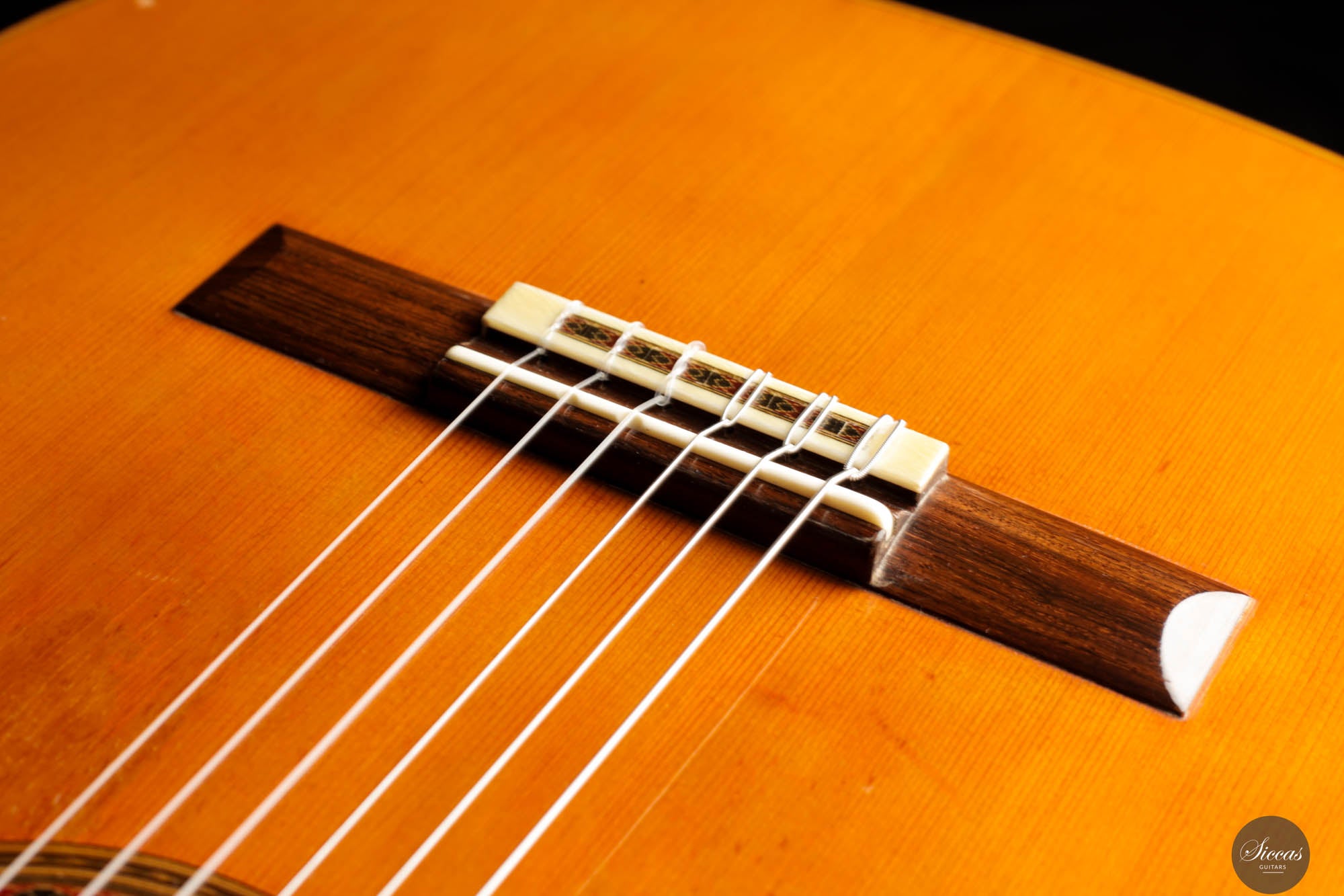 The “Concert Model” No. 725, crafted in 1994 by the esteemed luthier Daniel Friederich, is an exquisite representation of the pinnacle of classical guitar craftsmanship. Celebrated for captivating the hearts of guitar enthusiasts and musicians worldwide, this guitar stands as a testament to Friederich's unparalleled skill and dedication to his craft. Featuring a cedar soundboard, a material chosen for its ability to deliver a bright and clear sound, the guitar is further enhanced by the traditional seven fan bracings. This design significantly amplifies the guitar's resonance and tonal stability, producing a sound that is both rich in depth and vibrancy. The trebles emit pristine clarity and are abundant in overtones, akin to the resonant chime of a bell, while the sustain beautifully enriches the guitar's sonic appeal. The basses, warm and robust, complement the trebles, creating a harmoniously well-rounded sound that is neither overbearing nor lacking in presence.