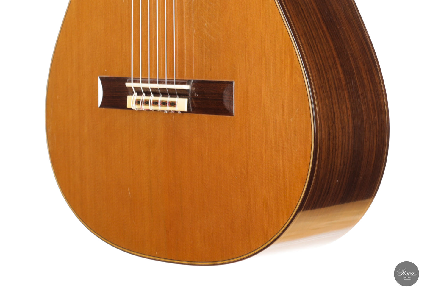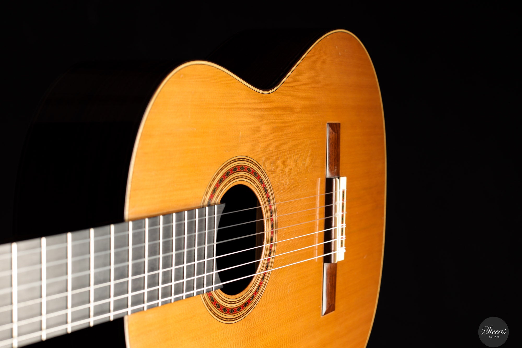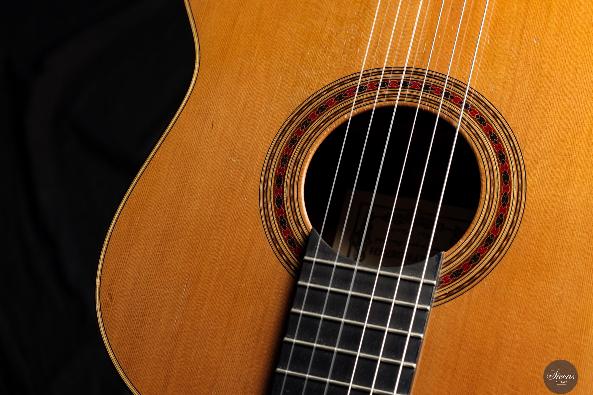This guitar is in excellent condition and has been well maintained by its original owner. It exhibits normal playing marks from professional use. Three extremely fine hairline cracks beneath the bridge have been professionally glued without the need for reinforcements. These are nearly invisible and entirely stable. The instrument comes with a custom-made, high‑quality Accord case.Regular care extends the life of the instrument
