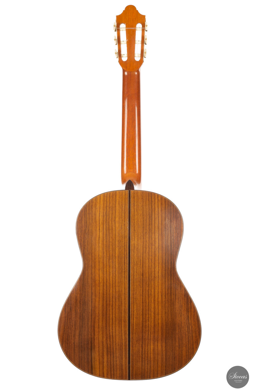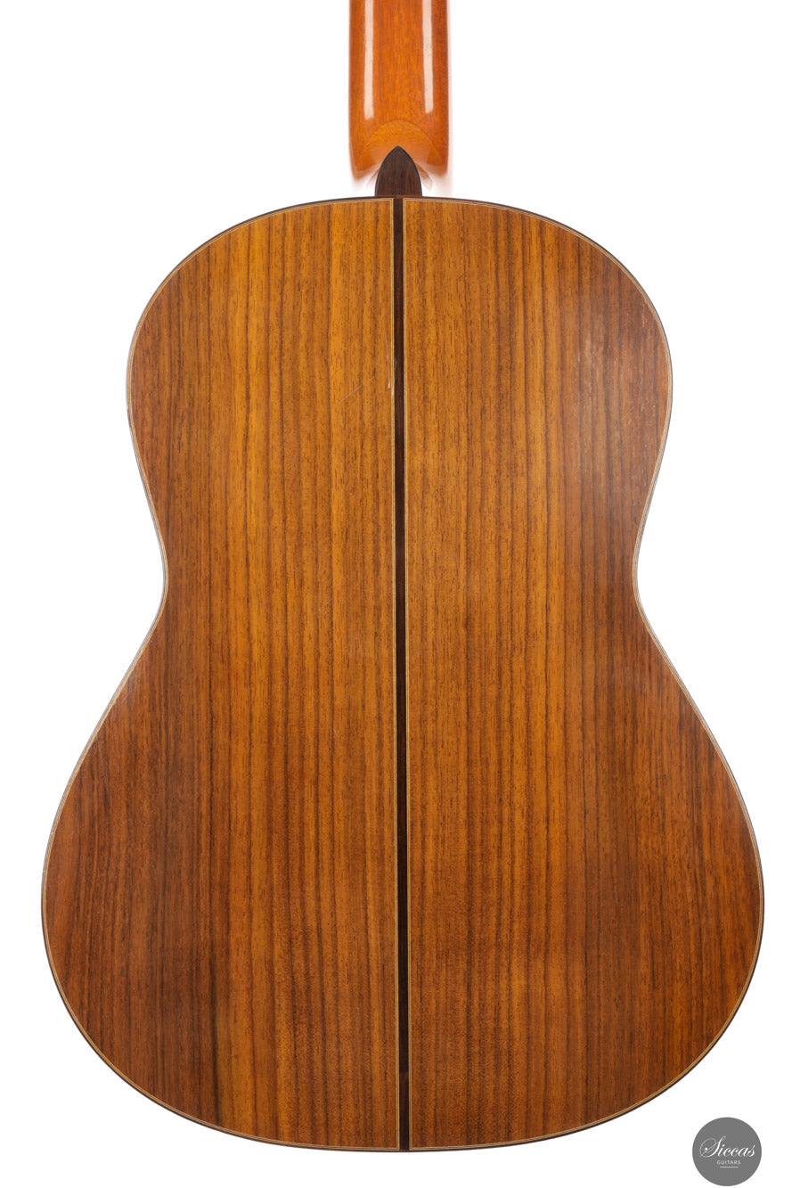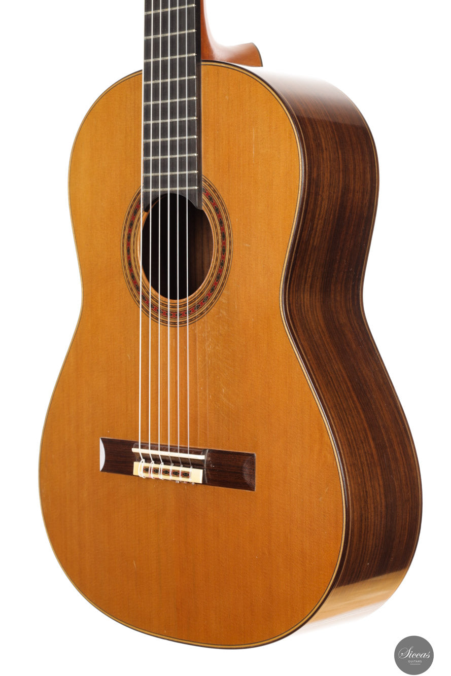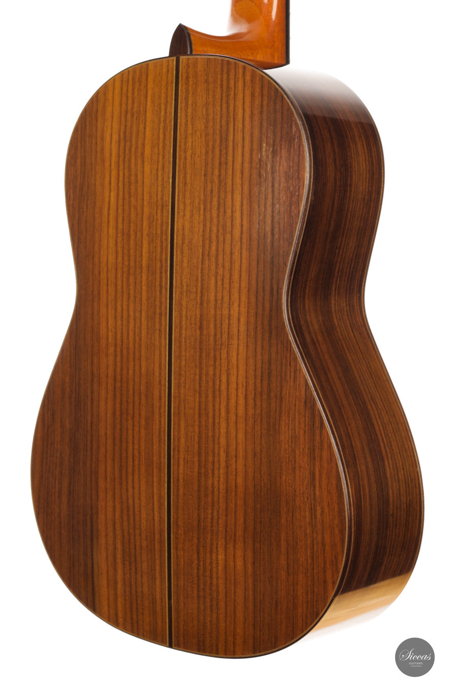This exceptional instrument, Daniel Friederich No. 776 (2001), is a superb example of the luthier’s iconic Concert model. Specially built for the accomplished French guitarist Gaëlle Solal, it has had only one owner since new. The instrument features a cedar top and Indian rosewood back and sides, with French polish and Rodgers tuning machines. Its voice embodies Friederich’s trademark qualities: a round and mellow tone with exceptional sustain, a natural richness in overtones, and balance across all registers. These are coupled with remarkable projection and dynamic range, offering volume levels rarely found in traditionally built instruments. The guitar responds quickly and evenly under the fingers, inviting a wide range of expressive nuance. It is a guitar that supports the player rather than resists, offering clarity, warmth, and presence in equal measure. The build is refined and elegant, entirely in line with the high standard set by Friederich’s most sought‑after instruments.Condition