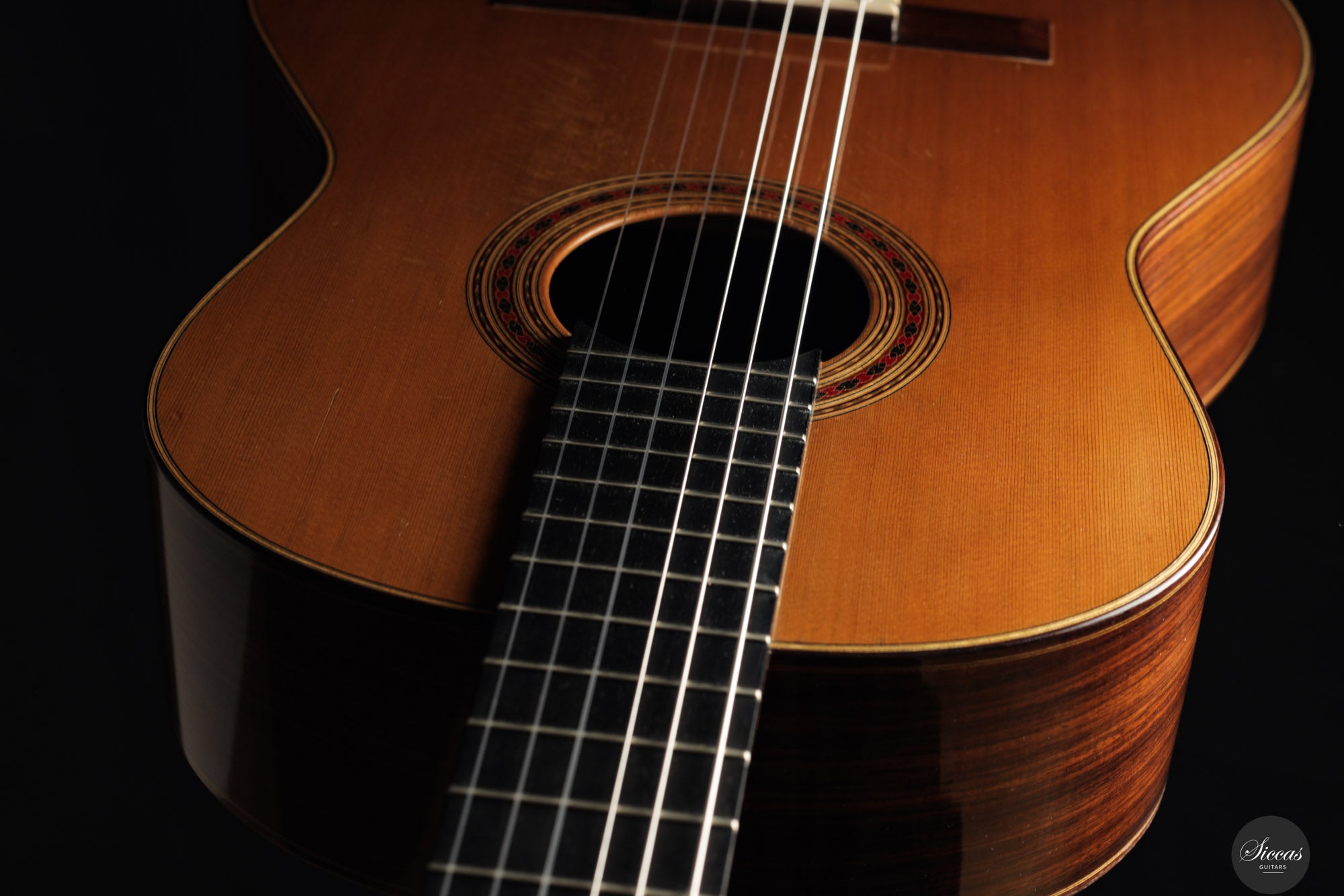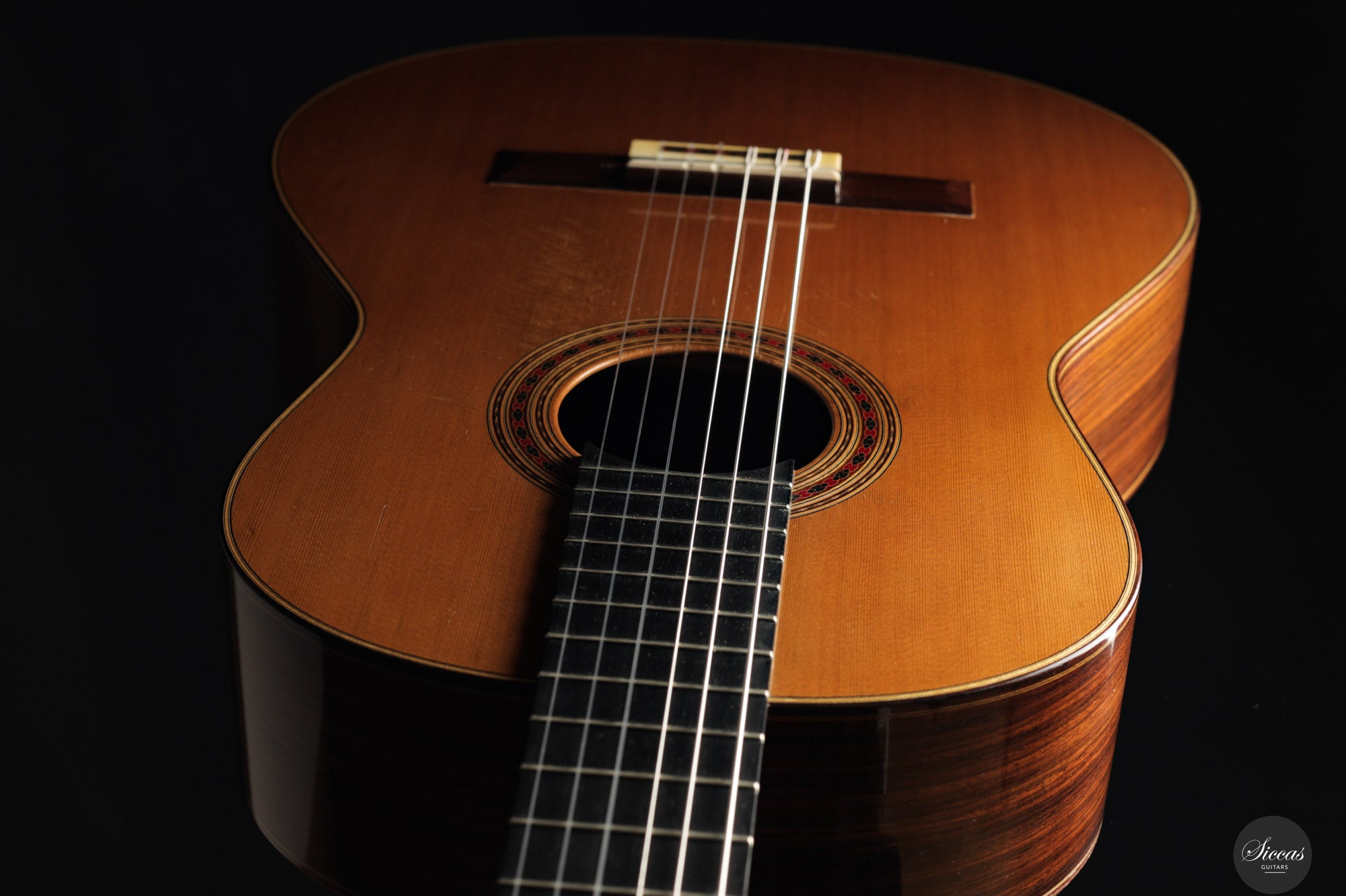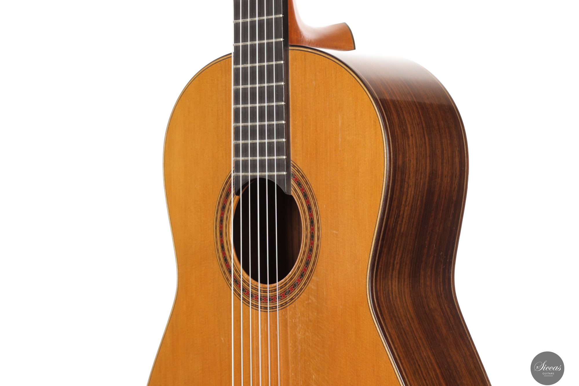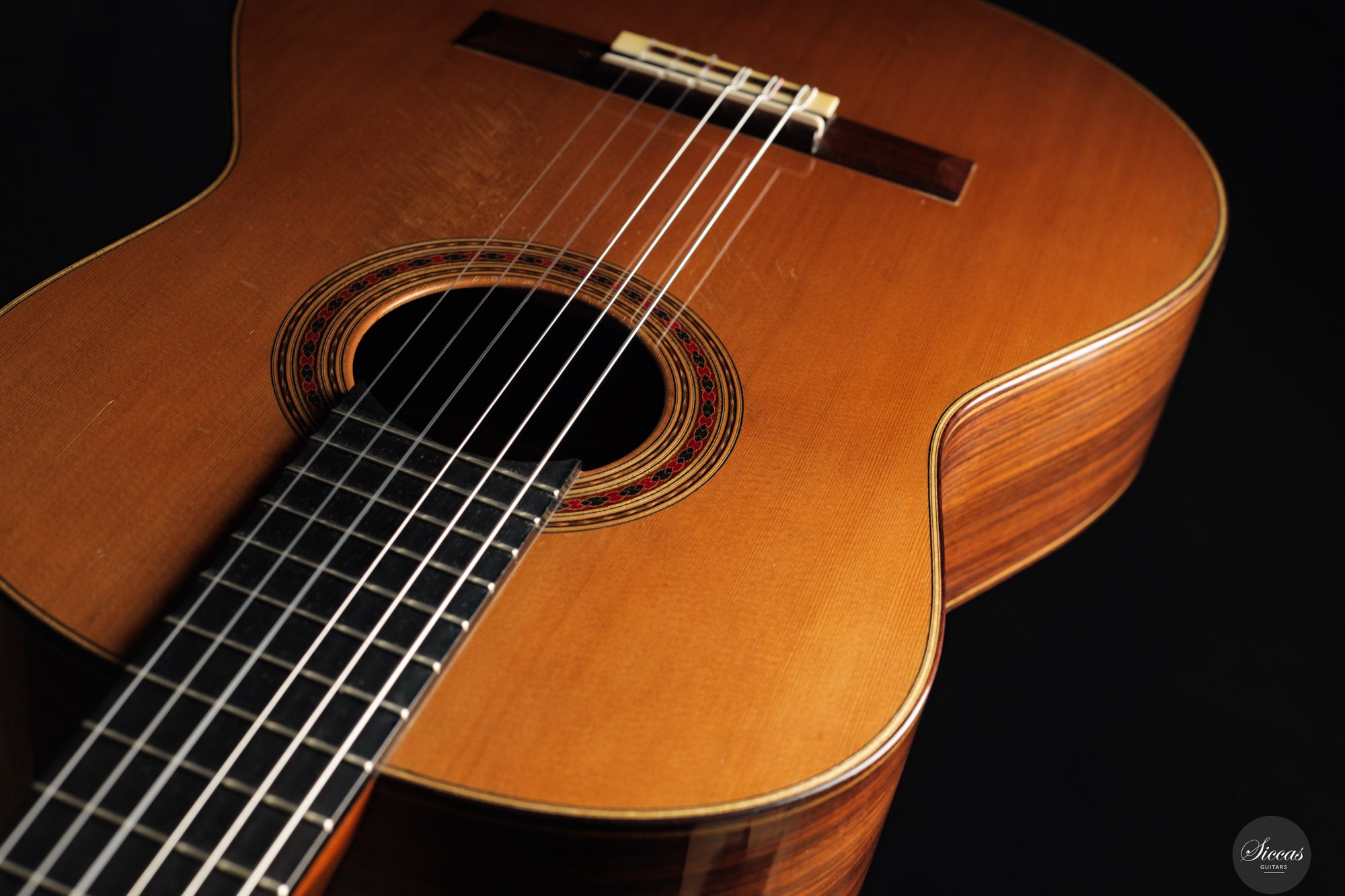This exceptional instrument, Daniel Friederich No. 776 (2001), is a superb example of the luthier’s iconic Concert model. Specially built for the accomplished French guitarist Gaëlle Solal, it has had only one owner since new. The instrument features a cedar top and Indian rosewood back and sides, with French polish and Rodgers tuning machines. Its voice embodies Friederich’s trademark qualities: a round and mellow tone with exceptional sustain, a natural richness in overtones, and balance across all registers. These are coupled with remarkable projection and dynamic range, offering volume levels rarely found in traditionally built instruments. The guitar responds quickly and evenly under the fingers, inviting a wide range of expressive nuance. It is a guitar that supports the player rather than resists, offering clarity, warmth, and presence in equal measure. The build is refined and elegant, entirely in line with the high standard set by Friederich’s most sought‑after instruments.Condition