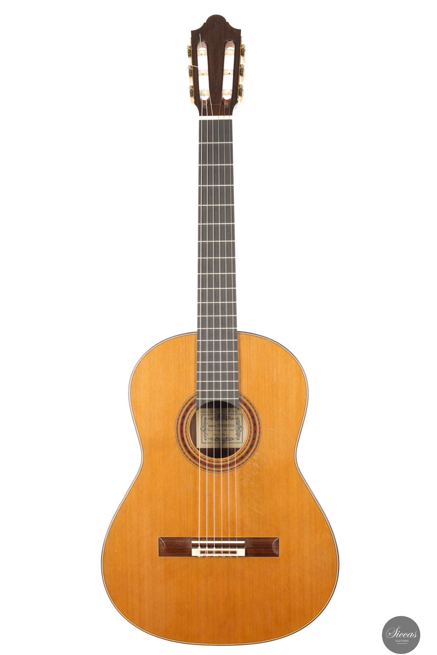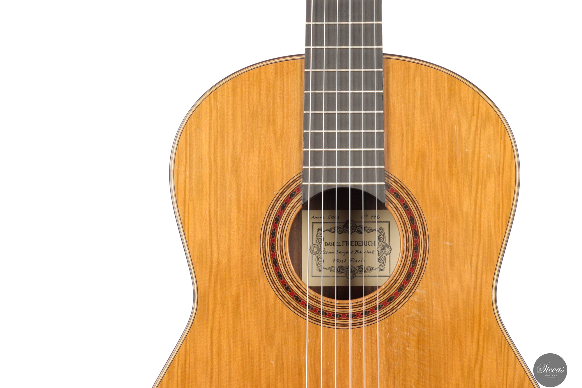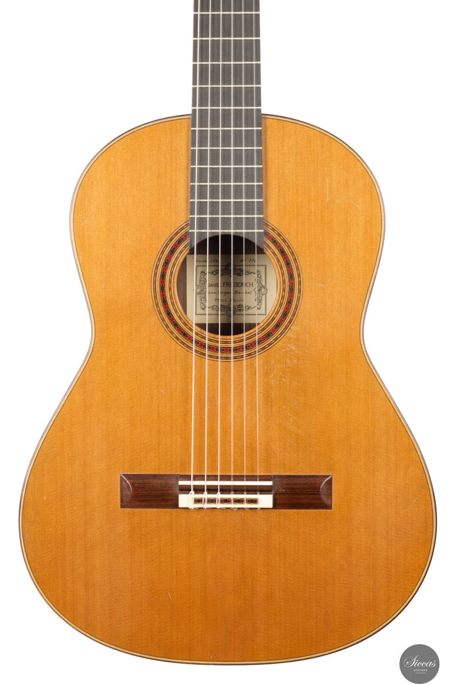 Daniel Friederich was born on January 16, 1932, in Paris, and passed away in 2020. He grew up in a family of cabinetmakers in the Faubourg Saint‑Antoine district. Despite a strong wish to play guitar, he could not afford one, so at age 23 he built his first guitar, a copy of a Simplicio, with help from his teacher Christian Aubin. He later showed one of his early instruments to Robert Bouchet, whose craftsmanship deeply influenced him. From around 1960 onwards Friederich devoted himself full‑time to guitar making, refining his technique via both empirical study and acoustic measurement. Over his decades of work he earned a reputation for instruments of superb tonal balance, clarity, and projection.About the guitar