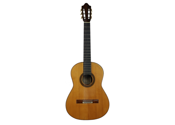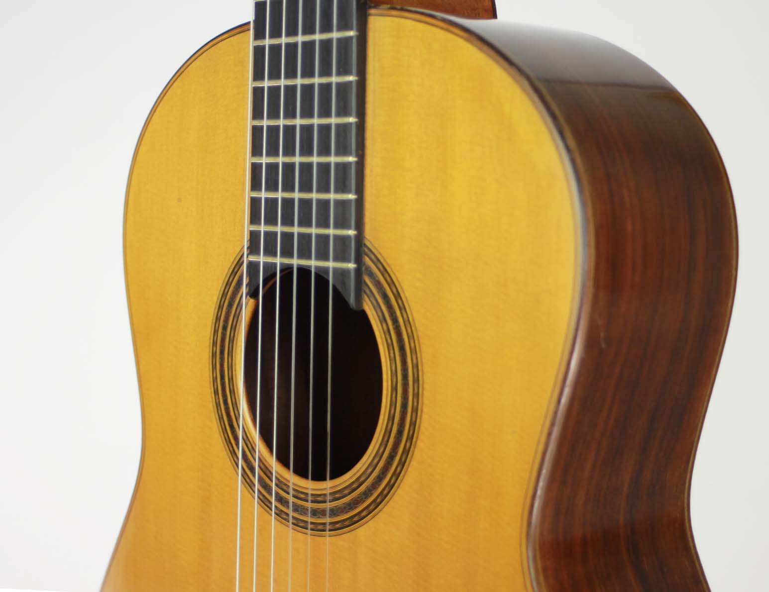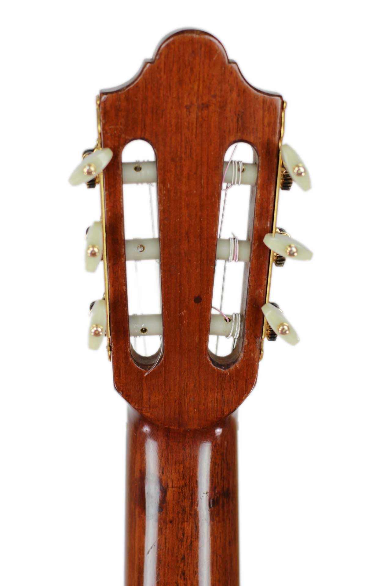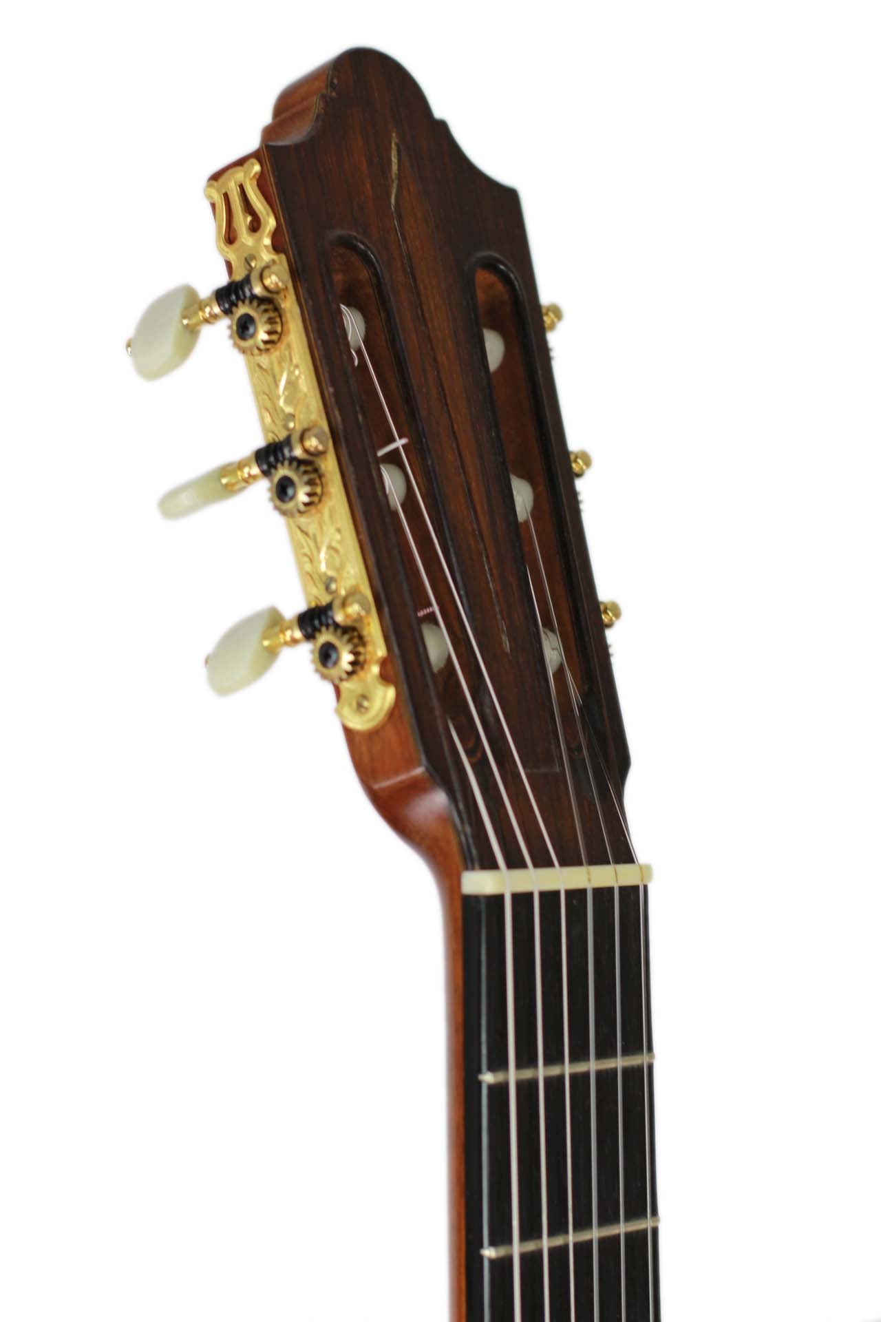 Early in his career, he built some guitars with spruce top, but this changed in 1974 when he finally devoted himself mainly to guitars with cedar top (with only few exceptions that were built on special request. This guitar is one of the rare examples with spruce top and doubled sides. The guitar has only one minor, well repaired crack on the top (right side on the top near the binding at the same height of the bridge). The overall condition is remarkable for its age. Regarding the sound: The volume is quite strong with powerful and sonorous basses and the trebles are sounding quite long and lyrical. The new tuning machines are made by Fustero but the original Fustero tuners are available.
