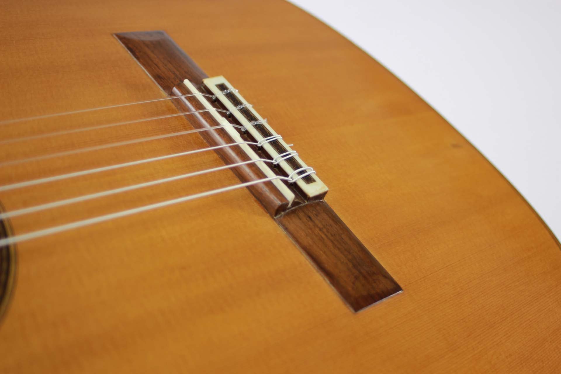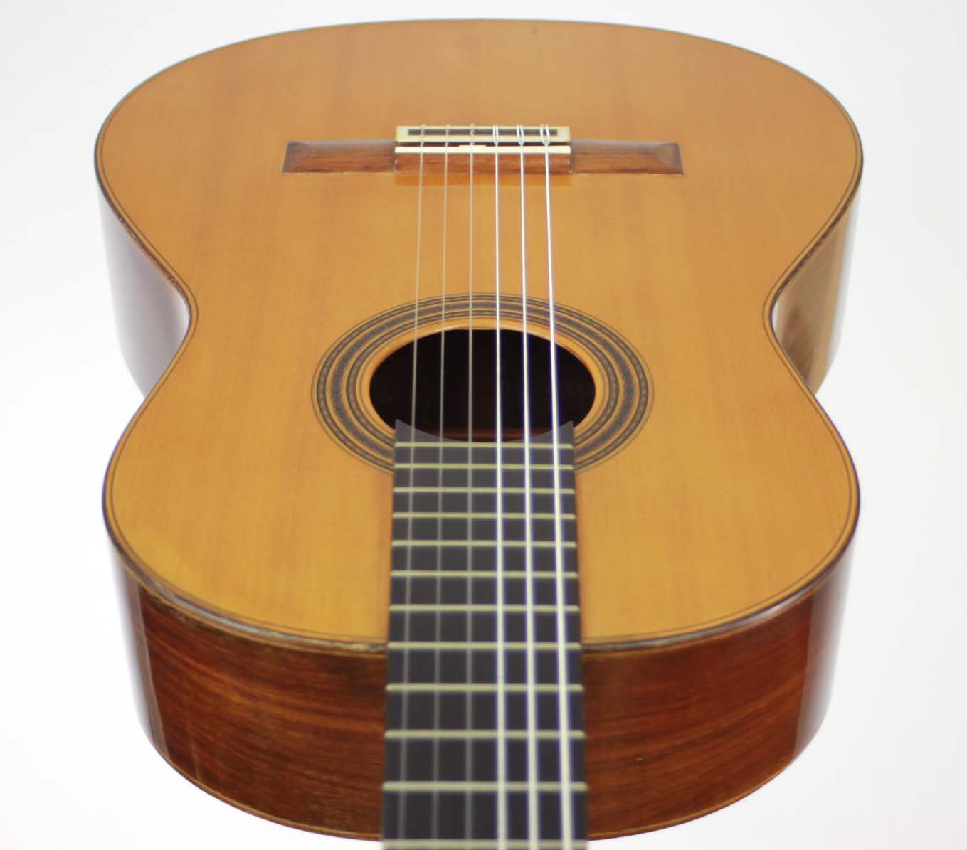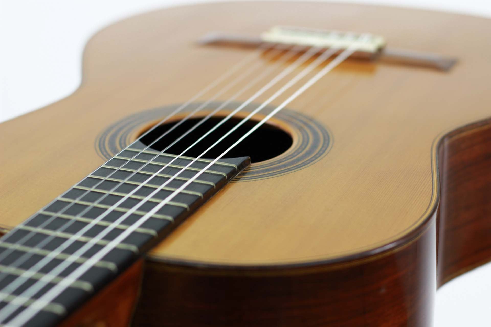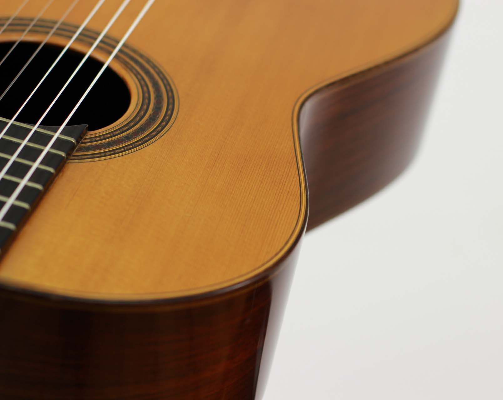 Early in his career, he built some guitars with spruce top, but this changed in 1974 when he finally devoted himself mainly to guitars with cedar top (with only few exceptions that were built on special request. This guitar is one of the rare examples with spruce top and doubled sides. The guitar has only one minor, well repaired crack on the top (right side on the top near the binding at the same height of the bridge). The overall condition is remarkable for its age. Regarding the sound: The volume is quite strong with powerful and sonorous basses and the trebles are sounding quite long and lyrical. The new tuning machines are made by Fustero but the original Fustero tuners are available.