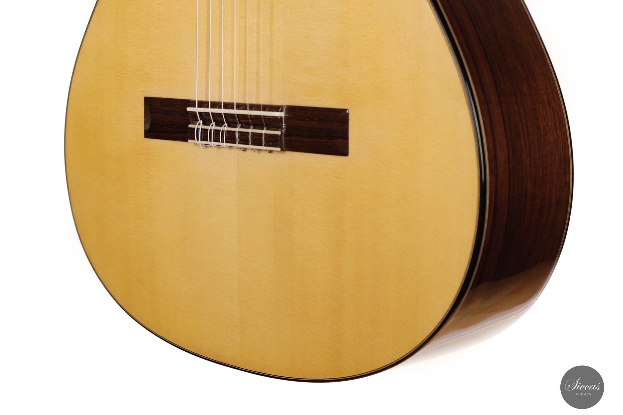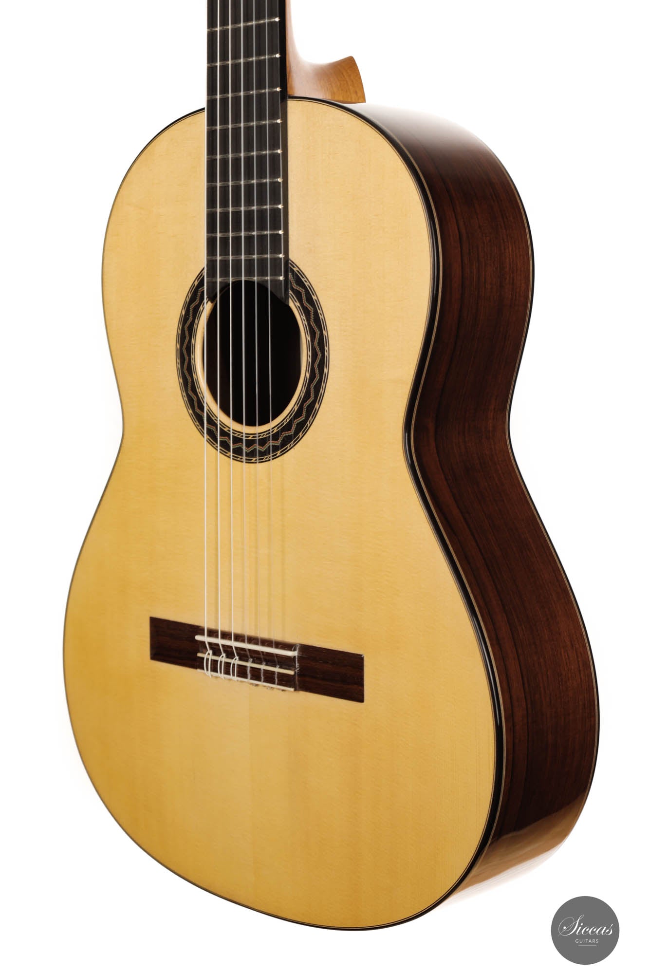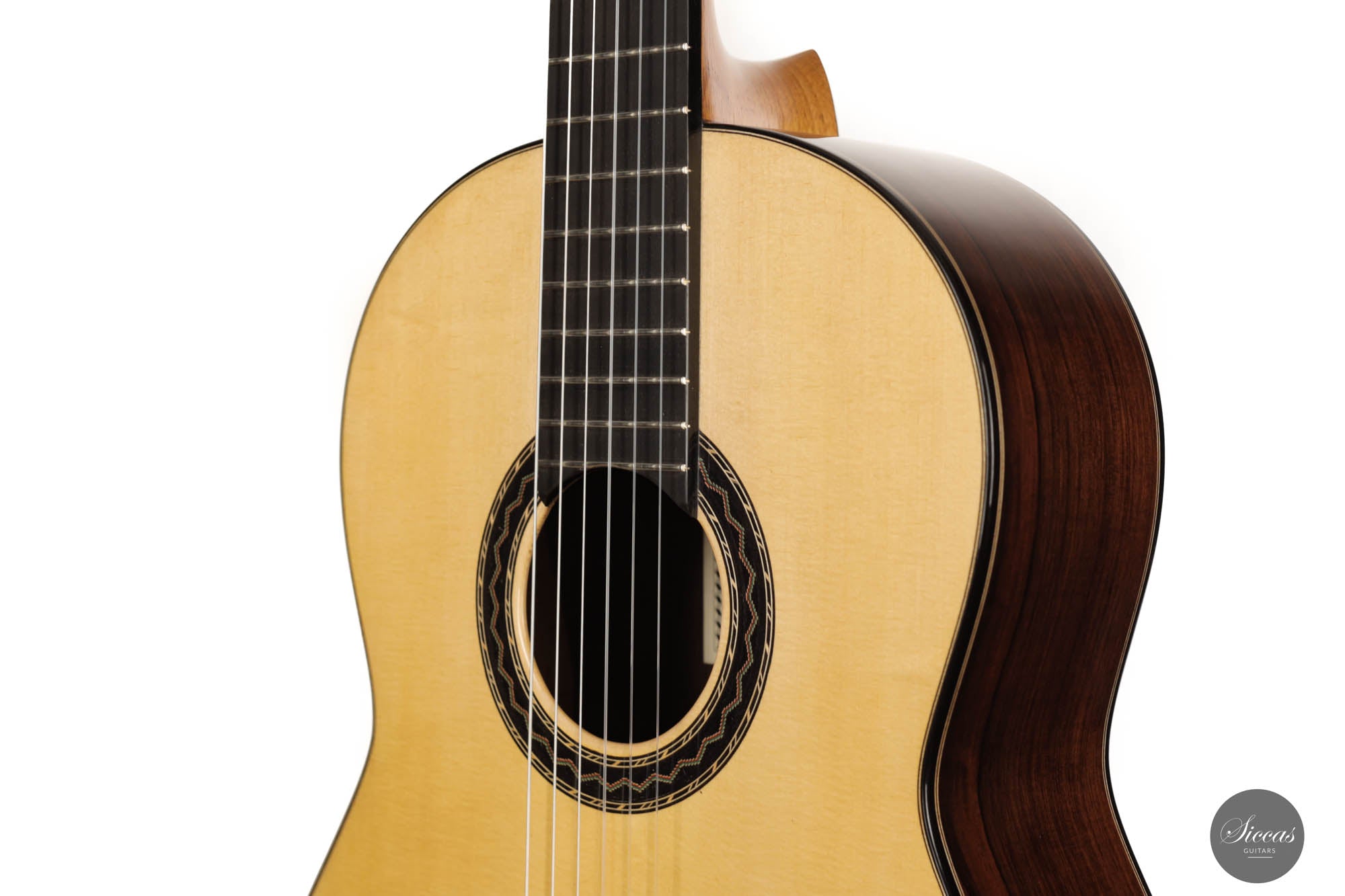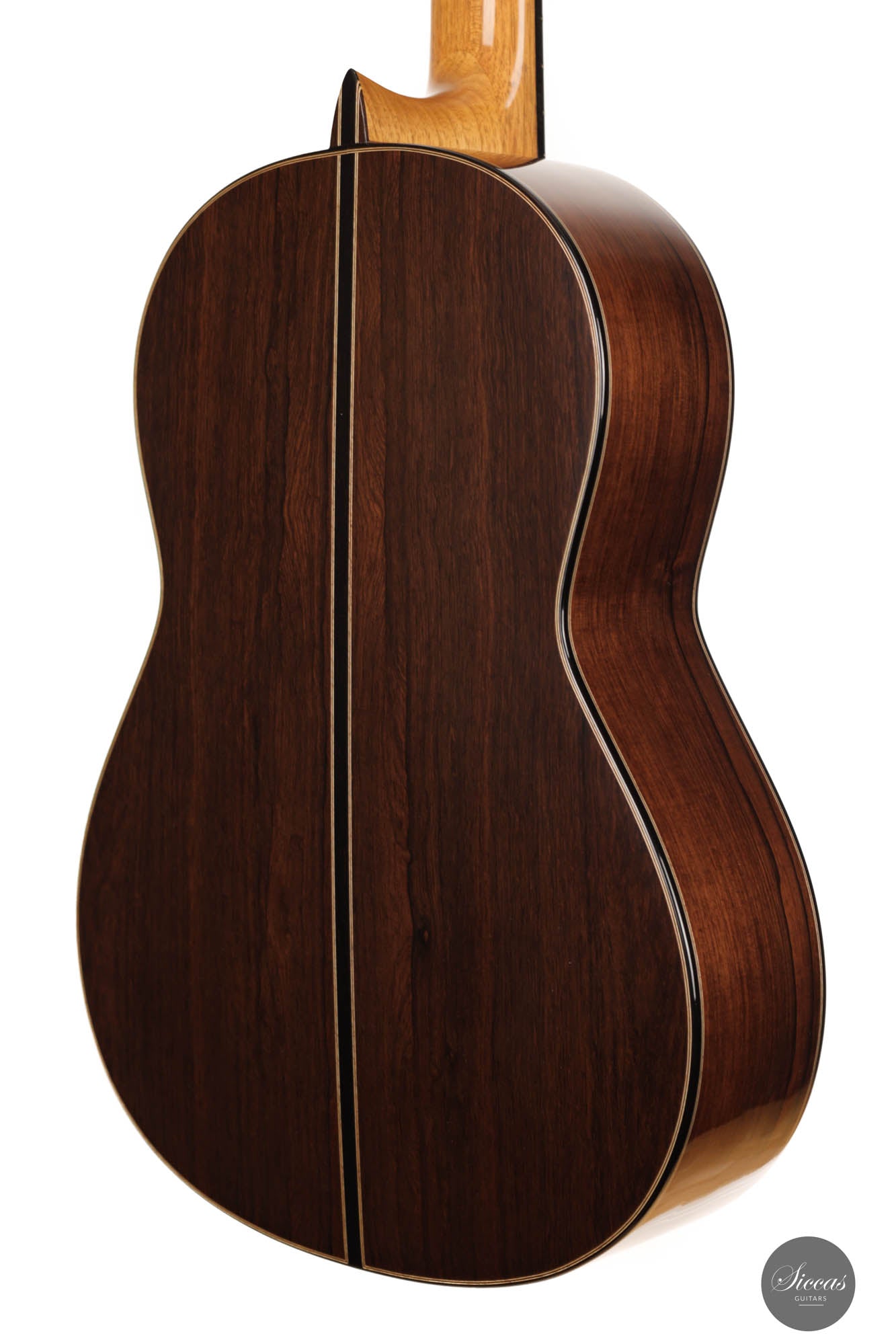 This brand-new guitar was handcrafted with meticulous attention to detail. This exquisite instrument boasts a spruce soundboard that produces crystal-clear yet sweet trebles and dark, crisp bass. The stunning Madagascar rosewood body is as visually striking as it is sonically impressive, adding a touch of elegance to any performance. The 2023 "Premium" guitar is versatile, offering a perfect balance between its voices for a wide range of musical styles. The exceptional tonal qualities will make any piece sing with life and character. Crafted with the finest materials, this “Premium” model has been thoughtfully considered, from the exquisite soundboard to the carefully carved bracing and meticulous finish. This guitar is a work of art that is both a joy to play and a pleasure to behold.