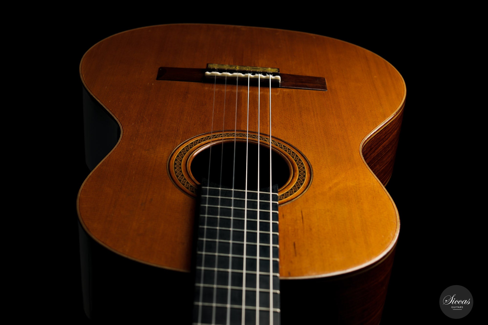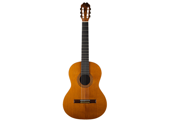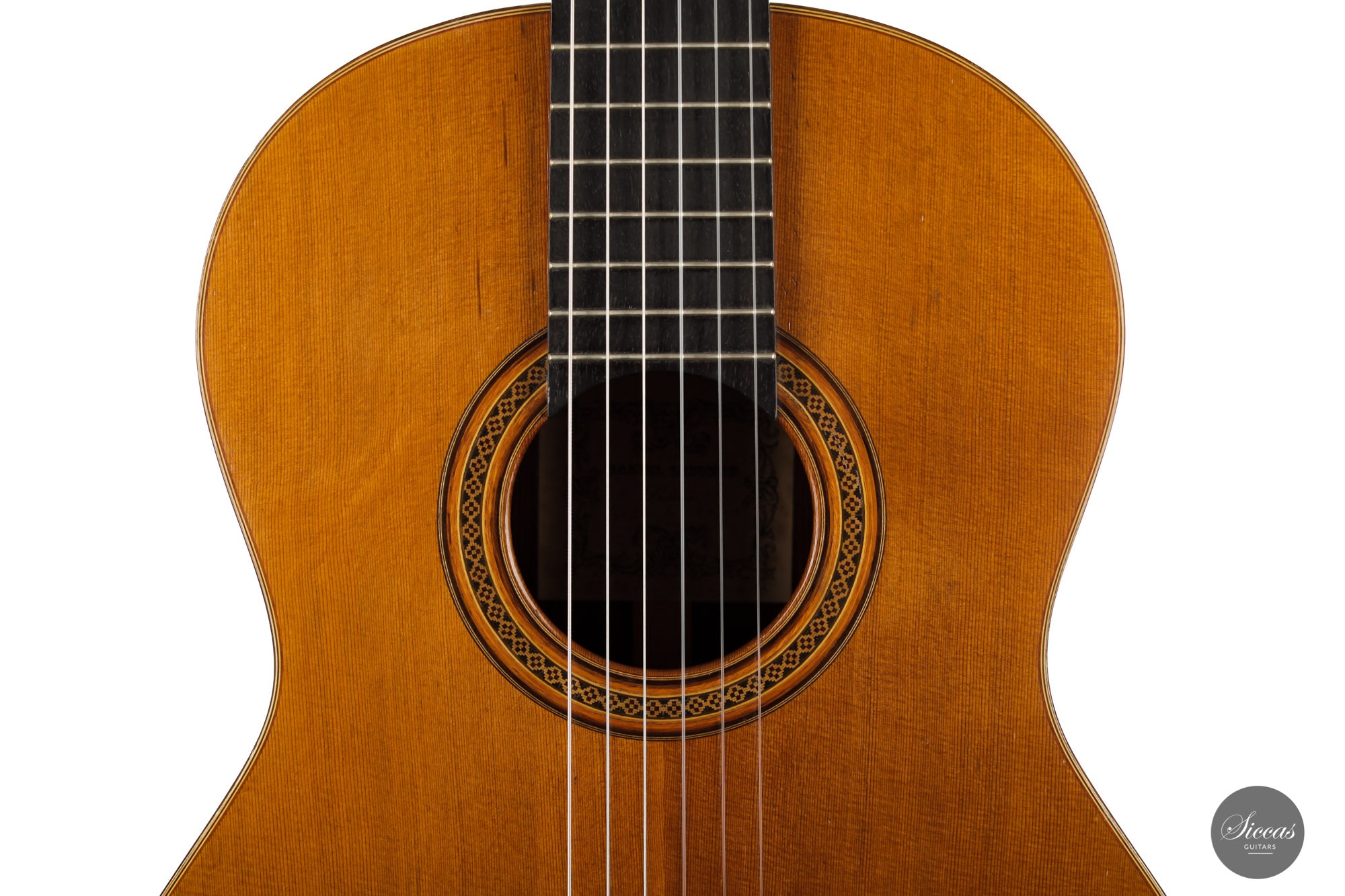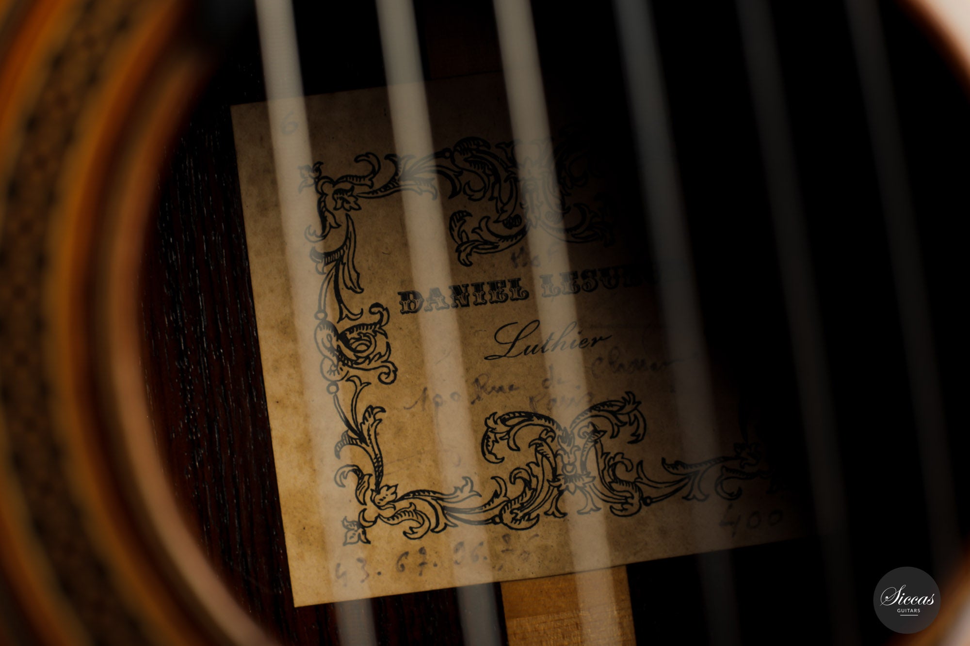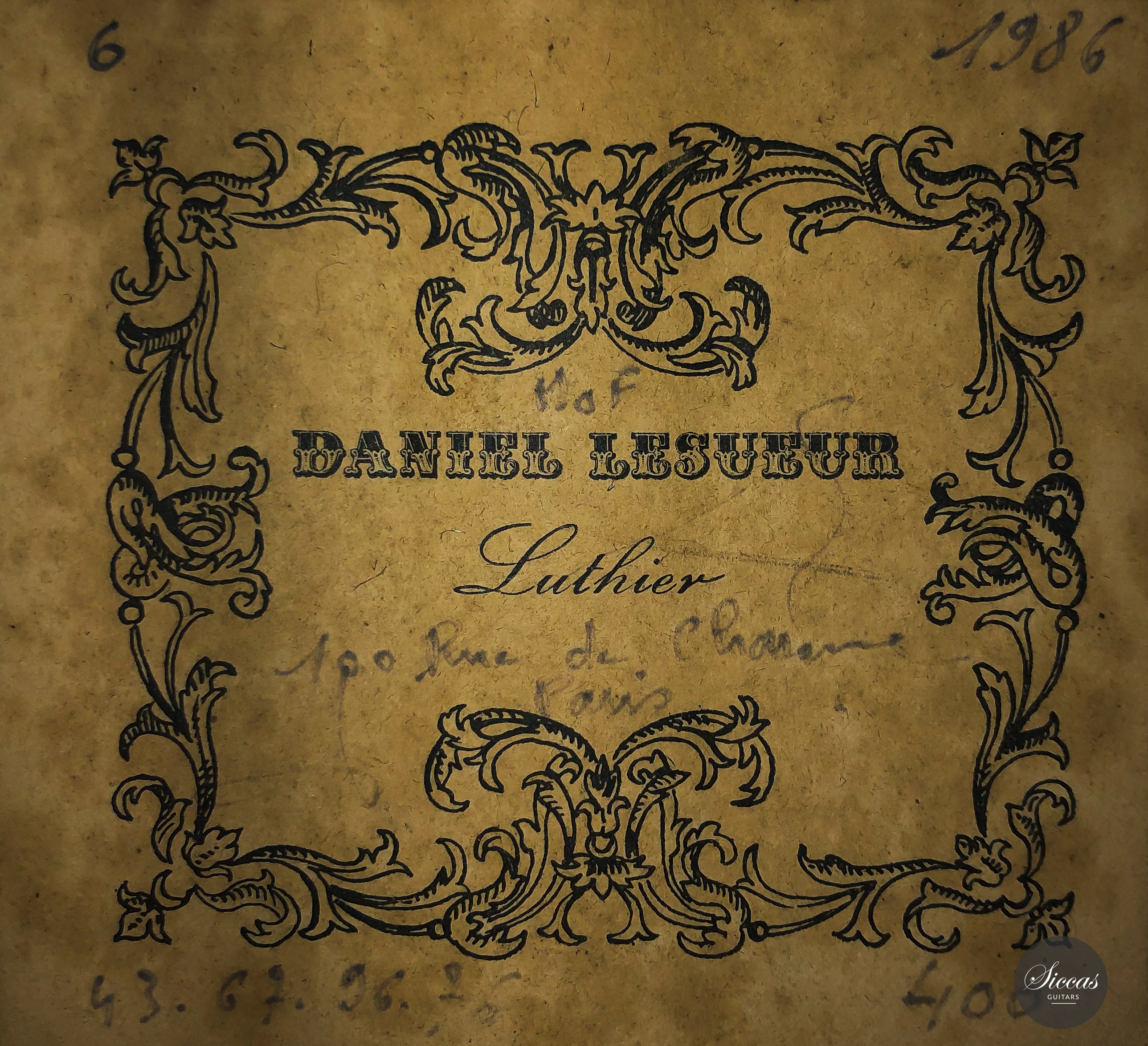 Built in 1986 and bearing the number 400, this magnificent instrument is a perfect example of Daniel Lesueur's guitars at their finest. Undoubtedly inspired in its bracing by Daniel Friederich, we find the same character in the timbre and balance of this guitar. The power and warmth of the tones is astonishing, and the sound color possibilities are inspiring. This guitar is in very good condition with no cracks and was refinished a few years ago. With its exciting sound, this guitar takes us back to Paris and the golden age of French-built cedar top guitars with a refined, elegant, and expressive character.