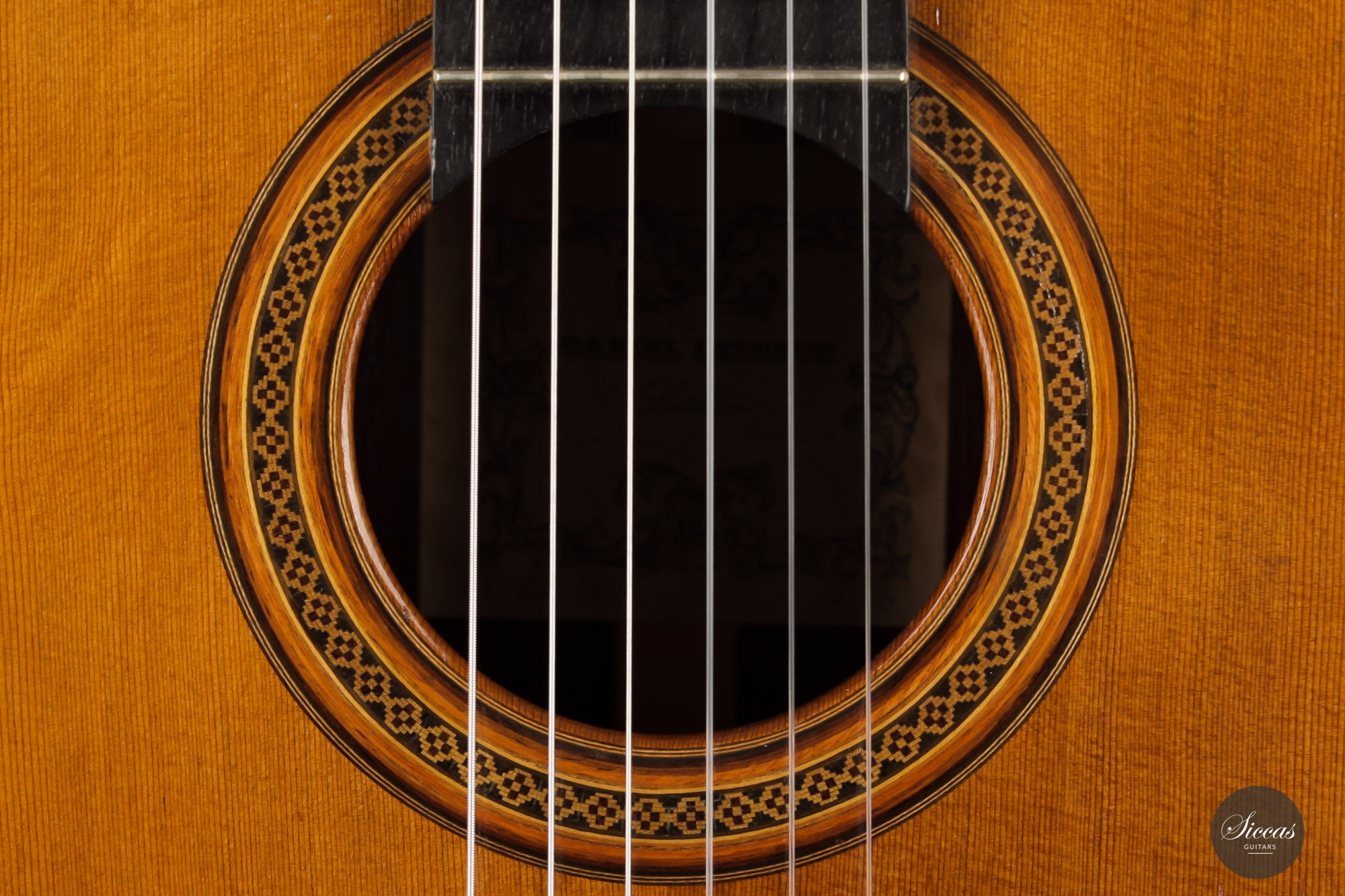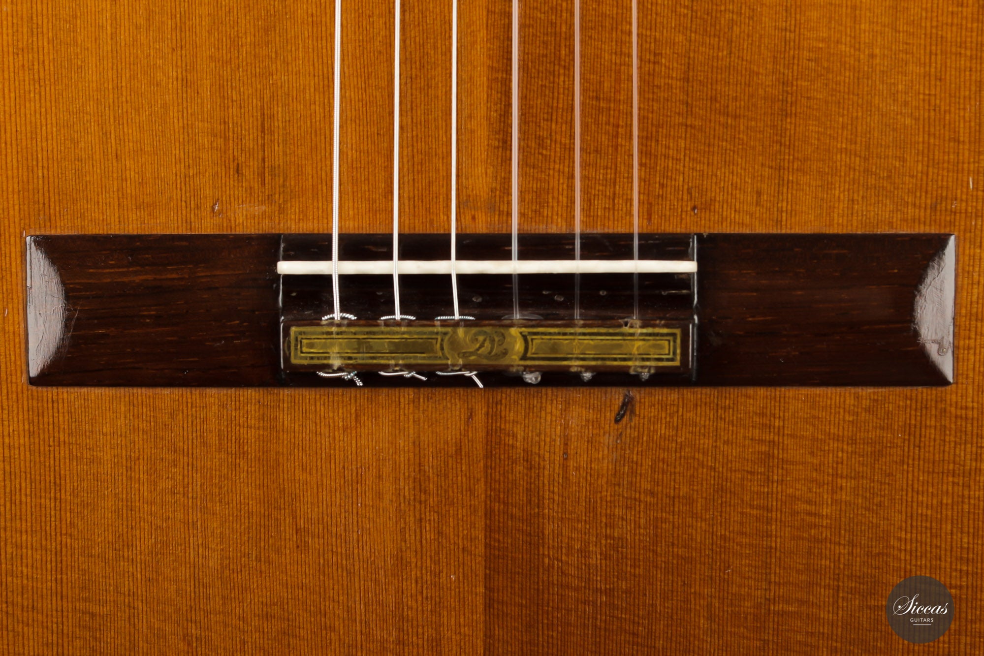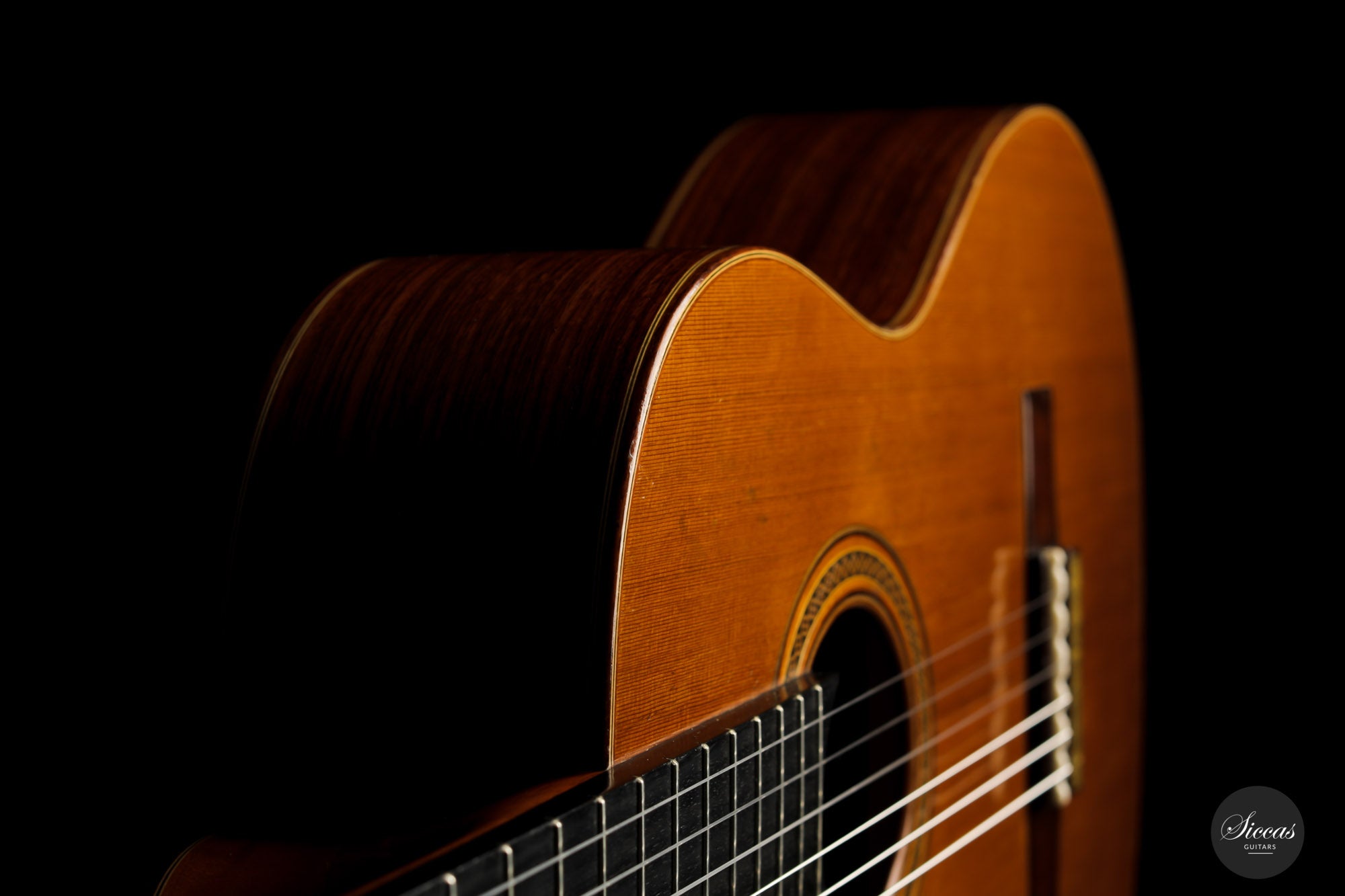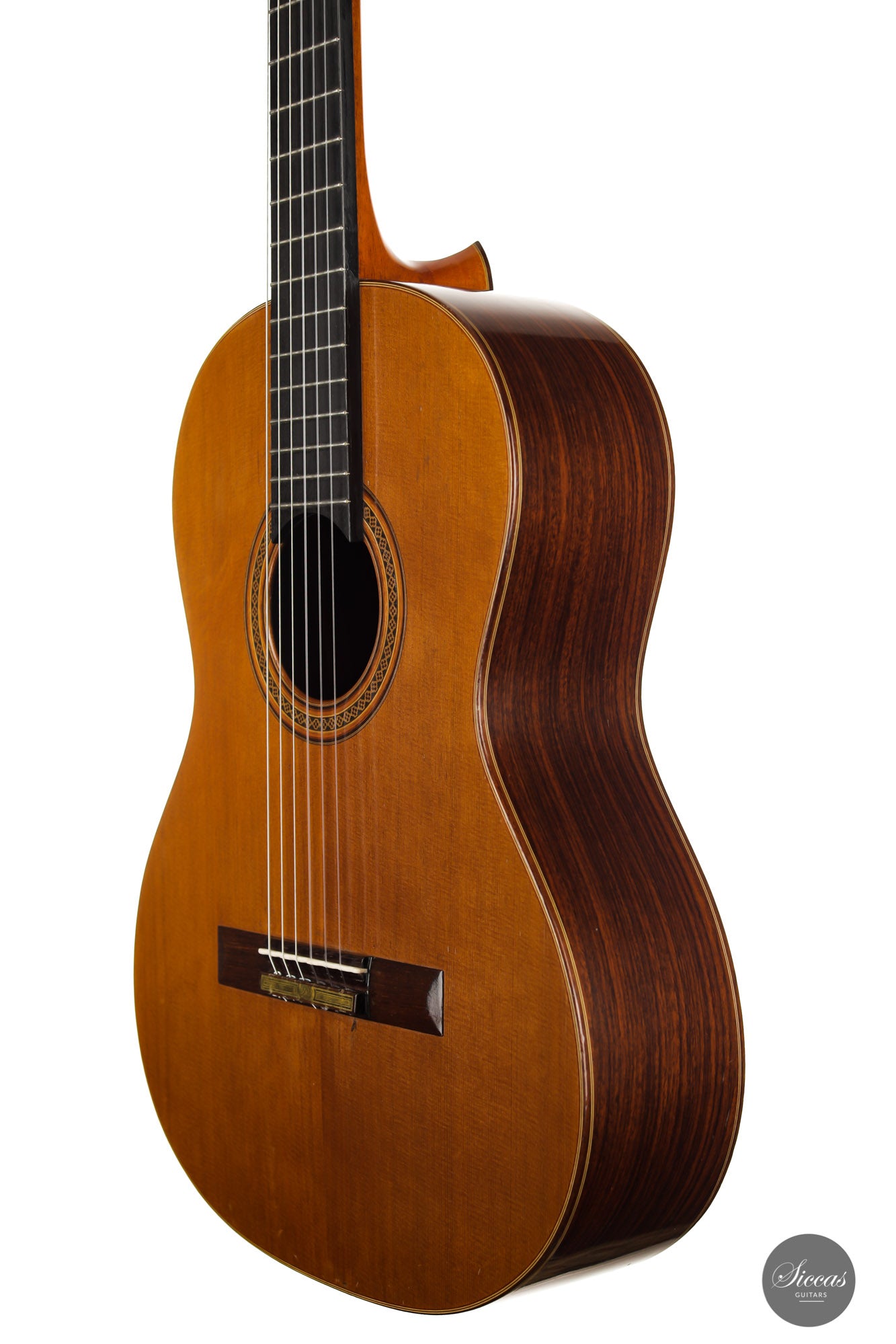 Built in 1986 and bearing the number 400, this magnificent instrument is a perfect example of Daniel Lesueur's guitars at their finest. Undoubtedly inspired in its bracing by Daniel Friederich, we find the same character in the timbre and balance of this guitar. The power and warmth of the tones is astonishing, and the sound color possibilities are inspiring. This guitar is in very good condition with no cracks and was refinished a few years ago. With its exciting sound, this guitar takes us back to Paris and the golden age of French-built cedar top guitars with a refined, elegant, and expressive character.