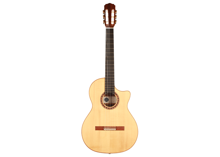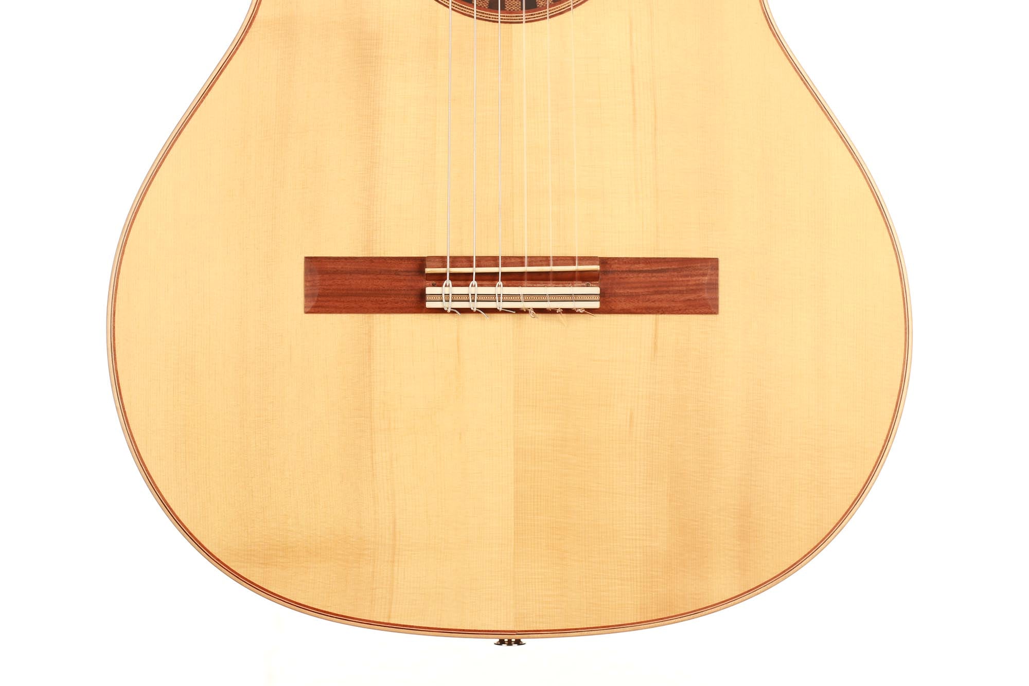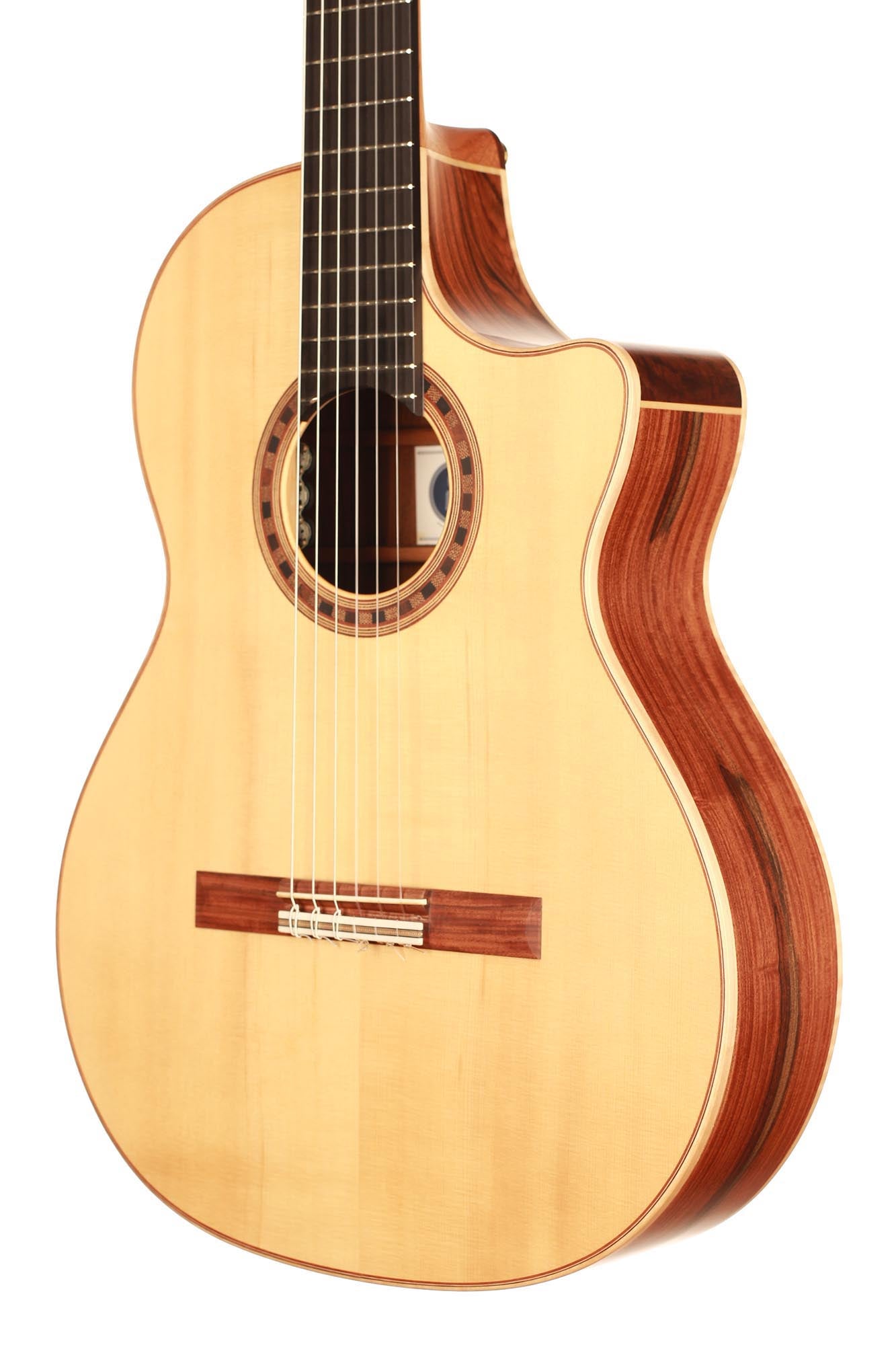 In addition, the guitar has an additional frame sound hole so that the guitarist can hear himself better when playing. The pickup is a high-quality Carlos VIP DM, with coaxial (VIP) transducer and mini-micro, MONO output, 3 controls on the sound hole (master, sound, micro amplification). This versatile model is also CITES-free.