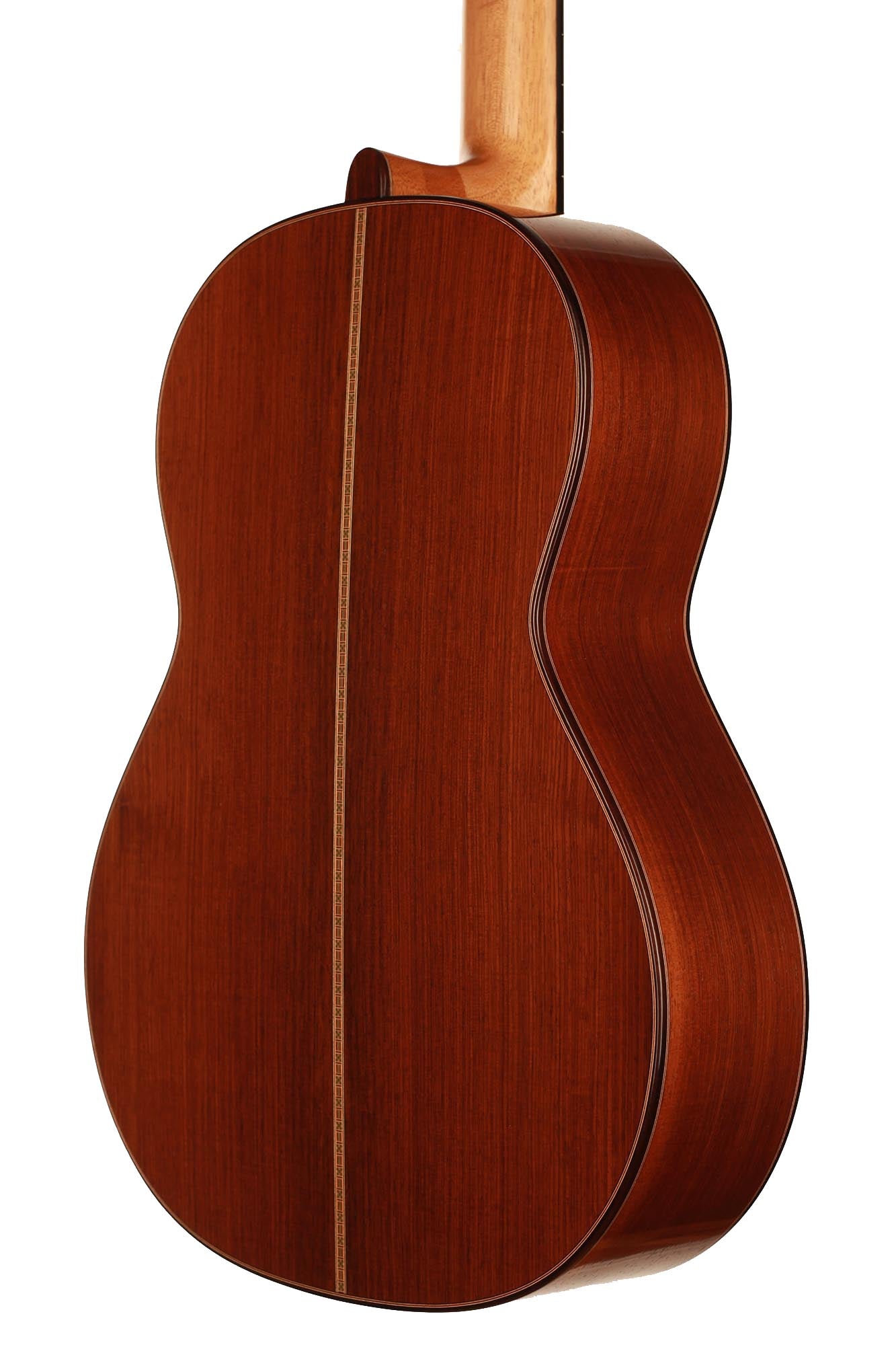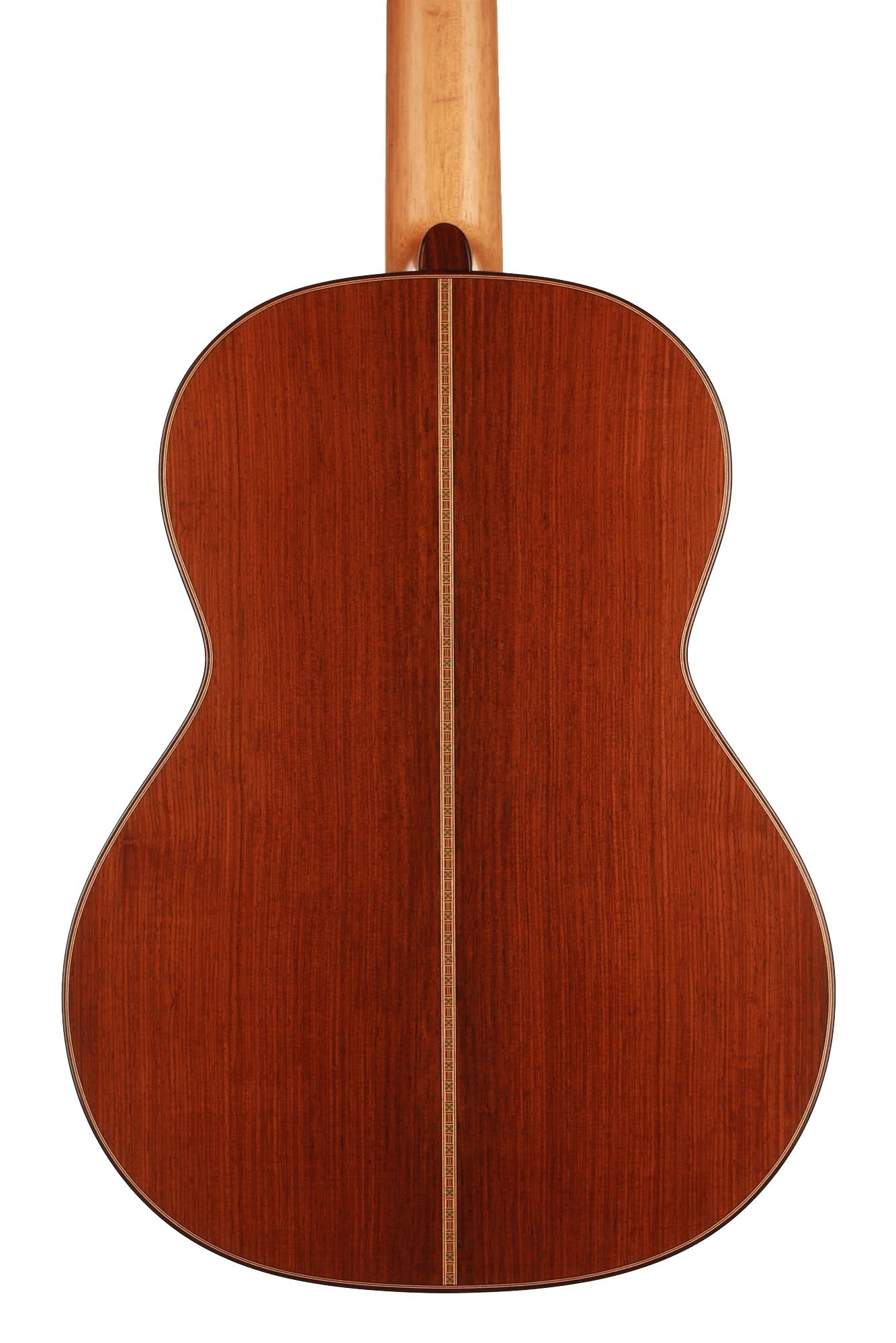 This guitar, which was built at the end of 2018, is especially decorated and very interesting in its construction. The top is slightly sloping on the treble side so that access to the treble is easier in the higher registers. On the bass side, however, the top is shaped as usual, so that the guitarist keeps his orientation when looking at the fingerboard. The volume and projection of this guitar are impressive. The precise response, the accuracy of the tones and the ease of playing make this guitar an extremely vibrant instrument, ideal for ambitious guitarists.