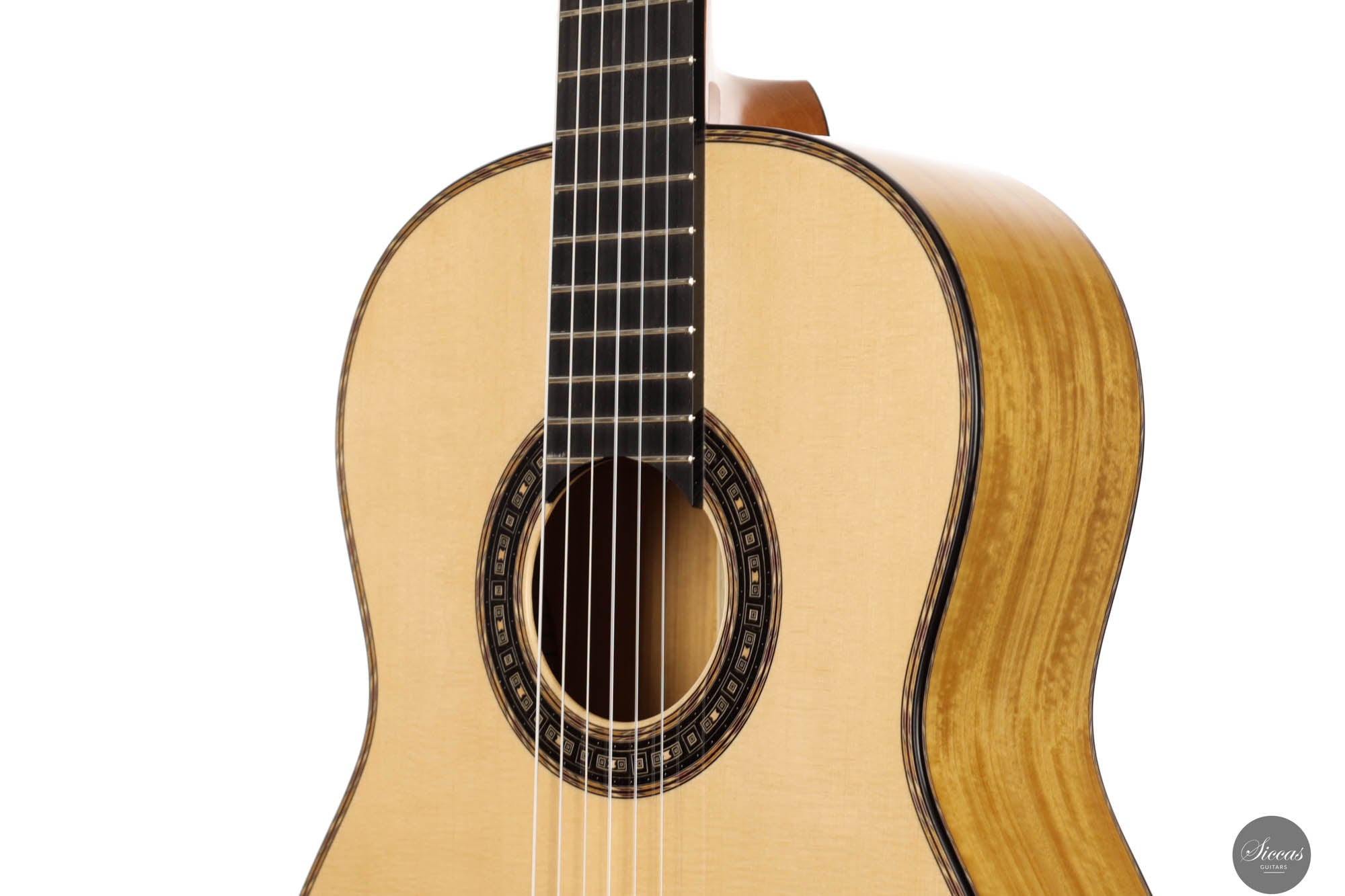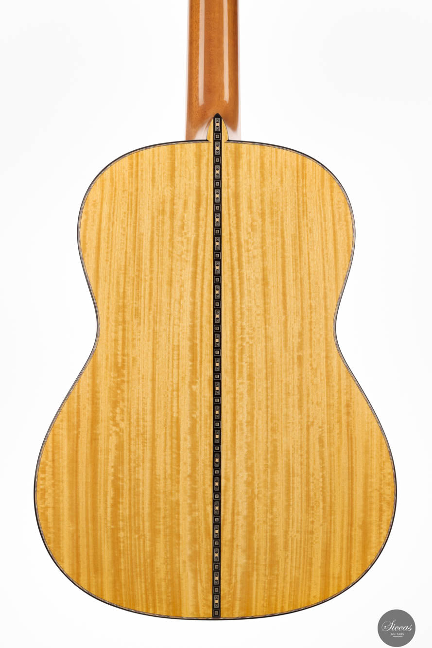The "Milano" features a premium Satinwood back and sides, complemented by a hand-split Master grade Swiss spruce top and a smoothly contoured Honduran mahogany V-jointed neck. Its rosette, inspired by the paving of Milan's Piazza del Duomo, incorporates concentric squares and geometric figures framed by a colorful double half herringbone made of movingui, purpleheart, maple, and rosewood, creating an illusion of movement that captivates the observer. This guitar not only has a striking appearance but also delivers acoustically; it produces crystal clear trebles and deep, resonant basses, with an F primary resonance that lays a solid, colorful foundation. The trebles are exceptionally vibrant, ringing bell-like yet possessing the smoothness of velvety leather. Owning this instrument means possessing not just an outstanding musical tool but a piece of art that reflects profound aesthetic research and innovative craftsmanship.