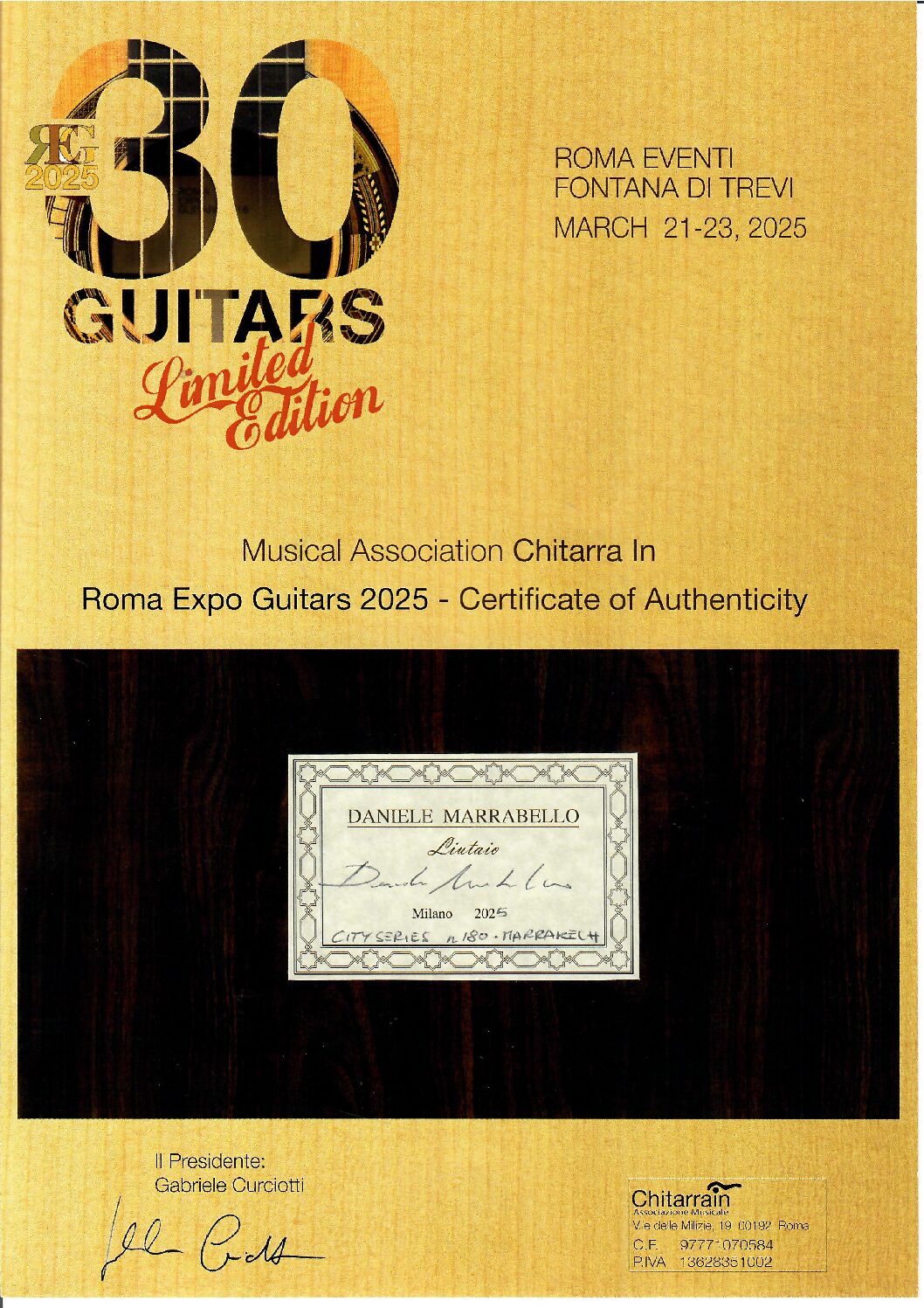 This brand-new guitar is the latest creation by Daniele Marrabello and a continuation of his acclaimed “City Series”. The model “Marrakech” was unveiled for the first time at the Roma Expo Guitars 2025 and serves as a tribute to the enchanting Moroccan city of Marrakesh, inspired by a recent journey Daniele took with his family.