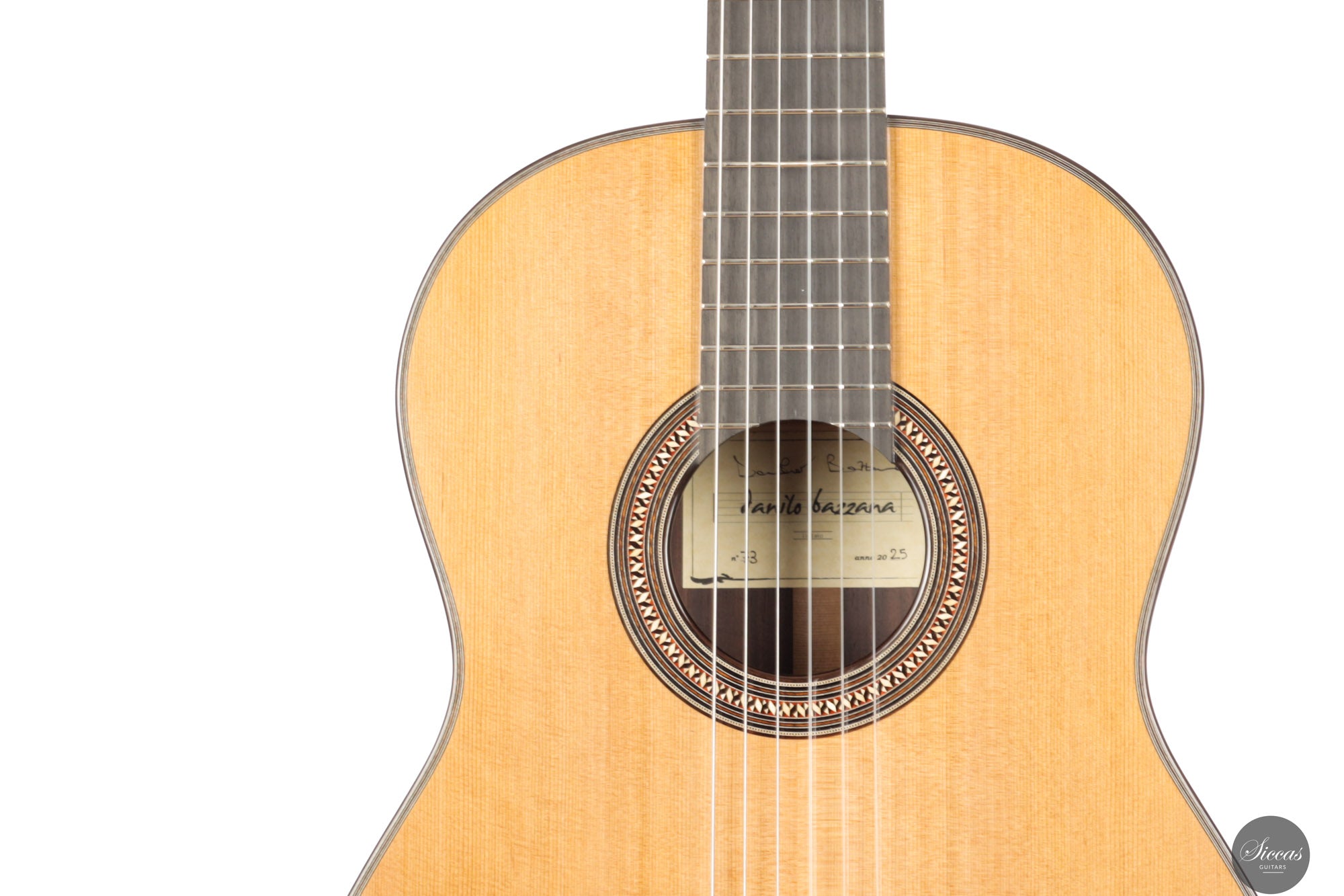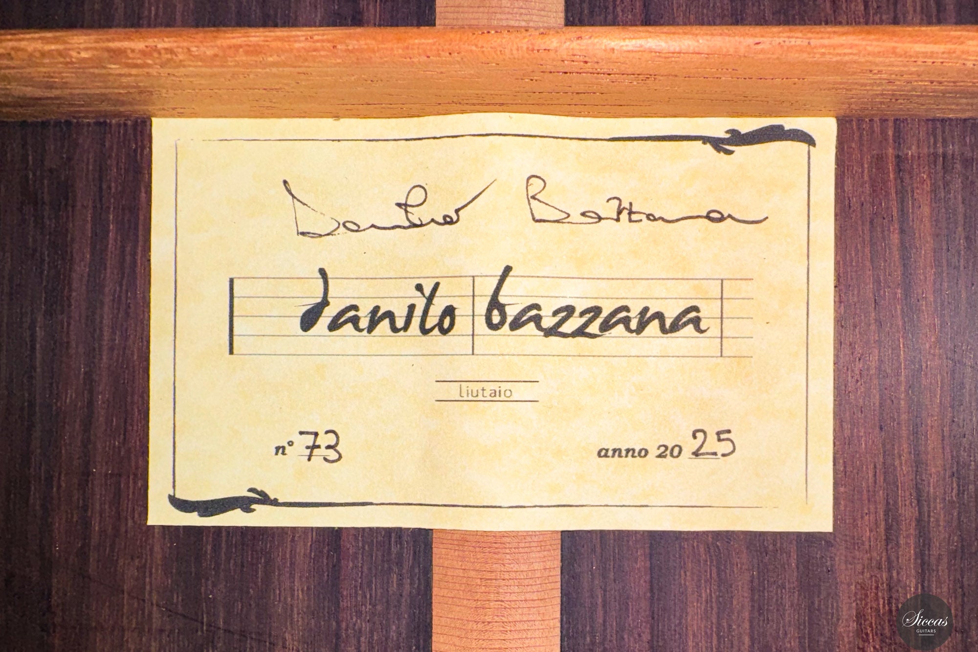 Danilo Bazzana, born in Milan in 1985, began playing the guitar at the age of thirteen, an early passion that later developed into his career. In 2015 he opened his workshop in Paderno Dugnano, near Milan, where he builds classical guitars and also carries out fine adjustments, restoration, and repair of plucked instruments. His guitars are rooted in the traditional style, inspired by the great masters, yet marked by his meticulous attention to the selection of materials and detail in construction. Bazzana follows the philosophy that every component of a guitar “must vibrate in its entirety,” guiding his search for harmony in sound and integrity in craftsmanship. Influenced by the French school of lutherie, particularly Robert Bouchet and Daniel Friederich, his instruments combine clarity, projection, and sensitivity with elegant design.