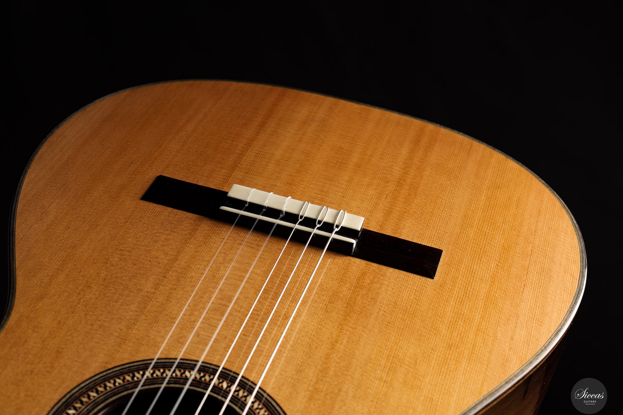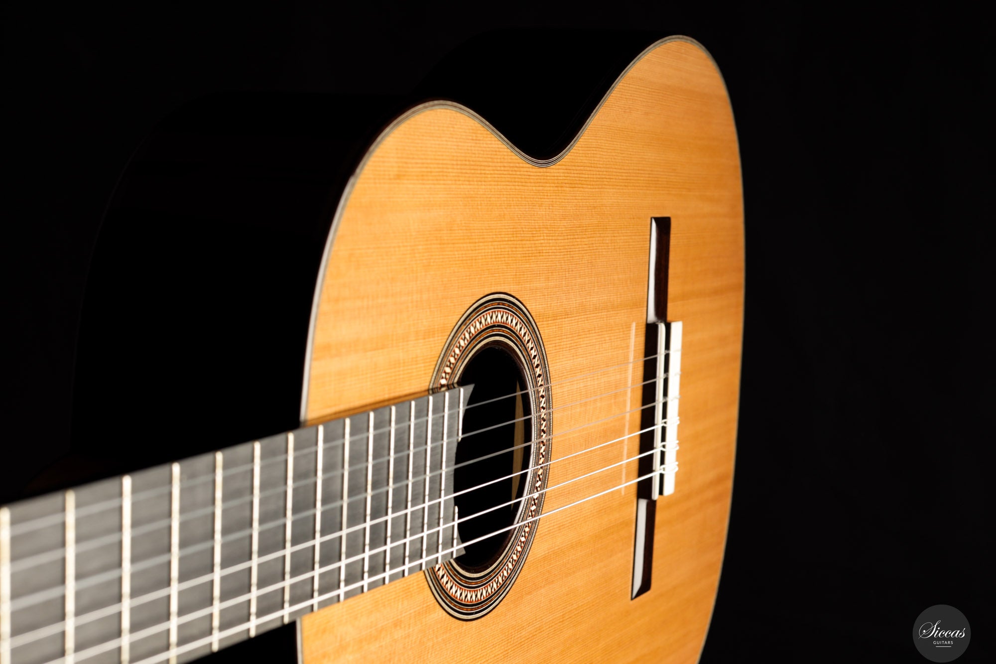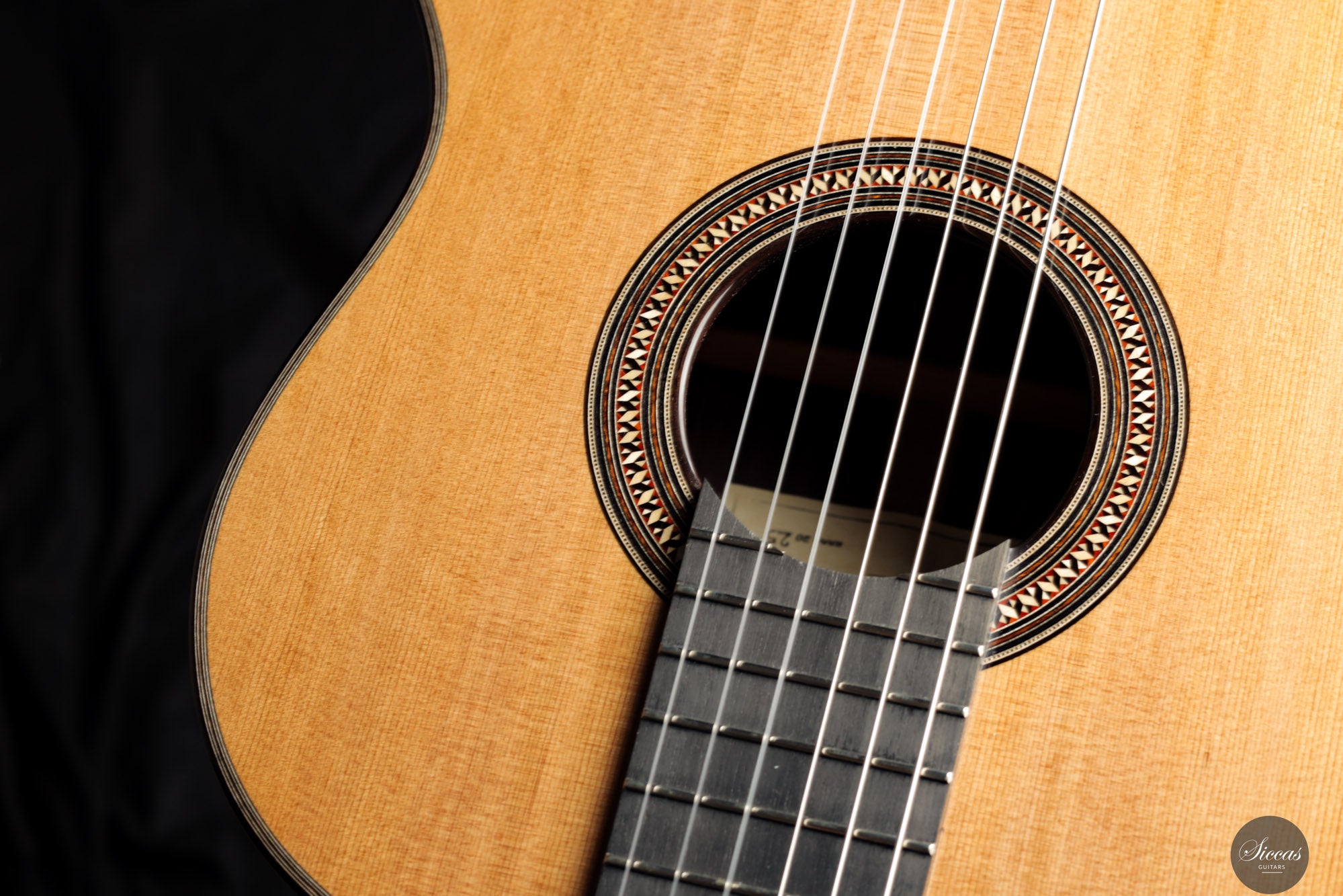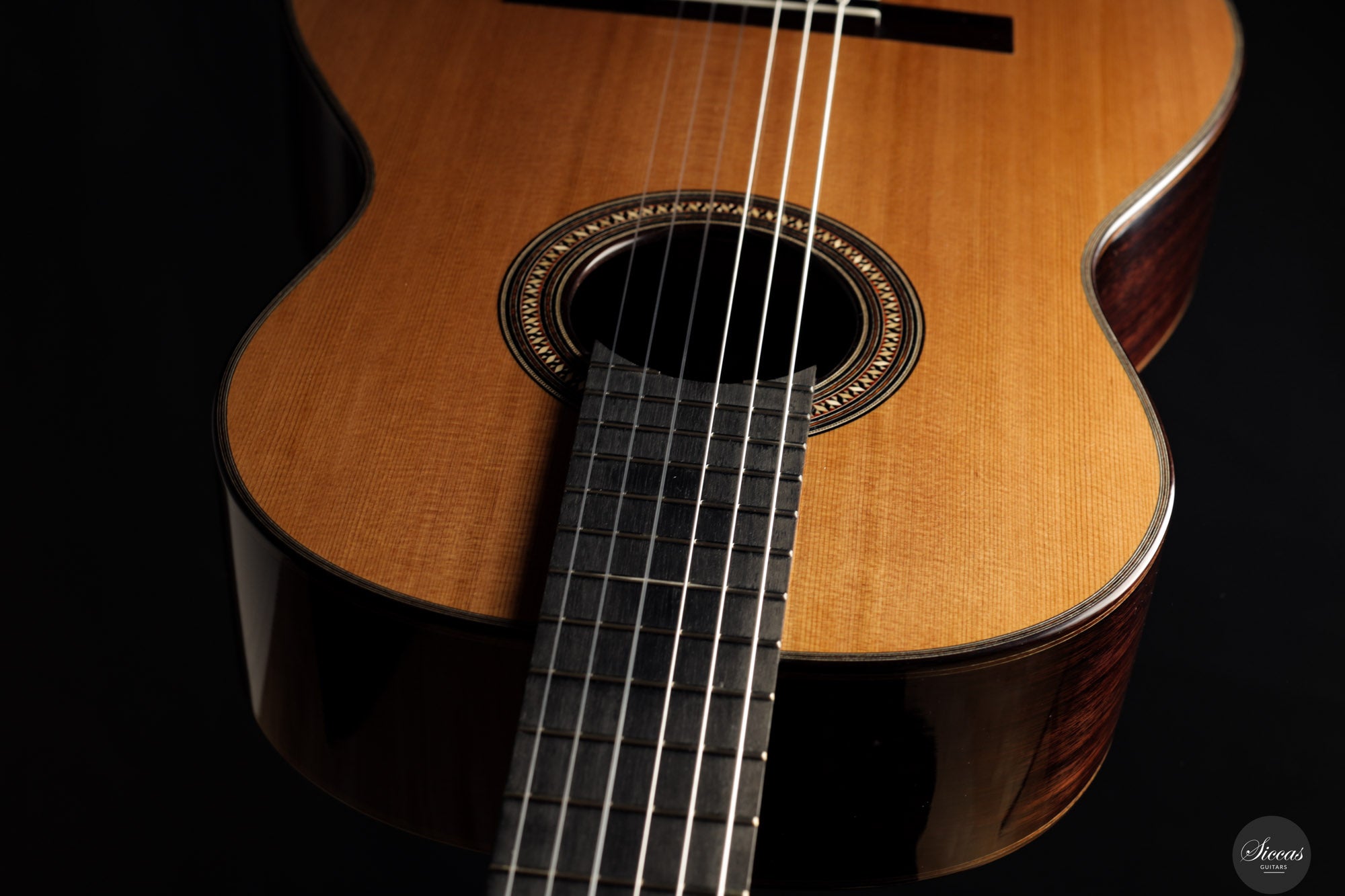 This 2025 guitar, numbered 73, is a traditionally built instrument with a cedar top and Indian rosewood back and sides, finished with French polish. The sides are doubled with cypress, a feature that enhances projection and attack. The scale length of 640 mm with a nut width of 51.5 mm offers enhanced comfort for the left hand while retaining secure string spacing. At 1395 grams it is lightweight, supporting both sensitivity and projection. The instrument is fitted with Alessi tuning machines and delivered in a hardshell case. The bracing, inspired by French designs, provides both power and clarity. The tonal palette is wide and colorful, with clear separation and crystalline projection, while retaining warmth in the cedar voice. The trebles are luminous, the basses resonant, and the midrange rich, resulting in a sound that is loud yet refined. The response is quick and elastic, giving the impression of an instrument that “breathes” freely and reacts immediately to even small variations of touch. Higher registers maintain fullness and intensity, while polyphonic textures remain balanced and distinct. The sensitivity of the guitar rewards careful right-hand preparation, allowing the performer to shape tone with precision.
