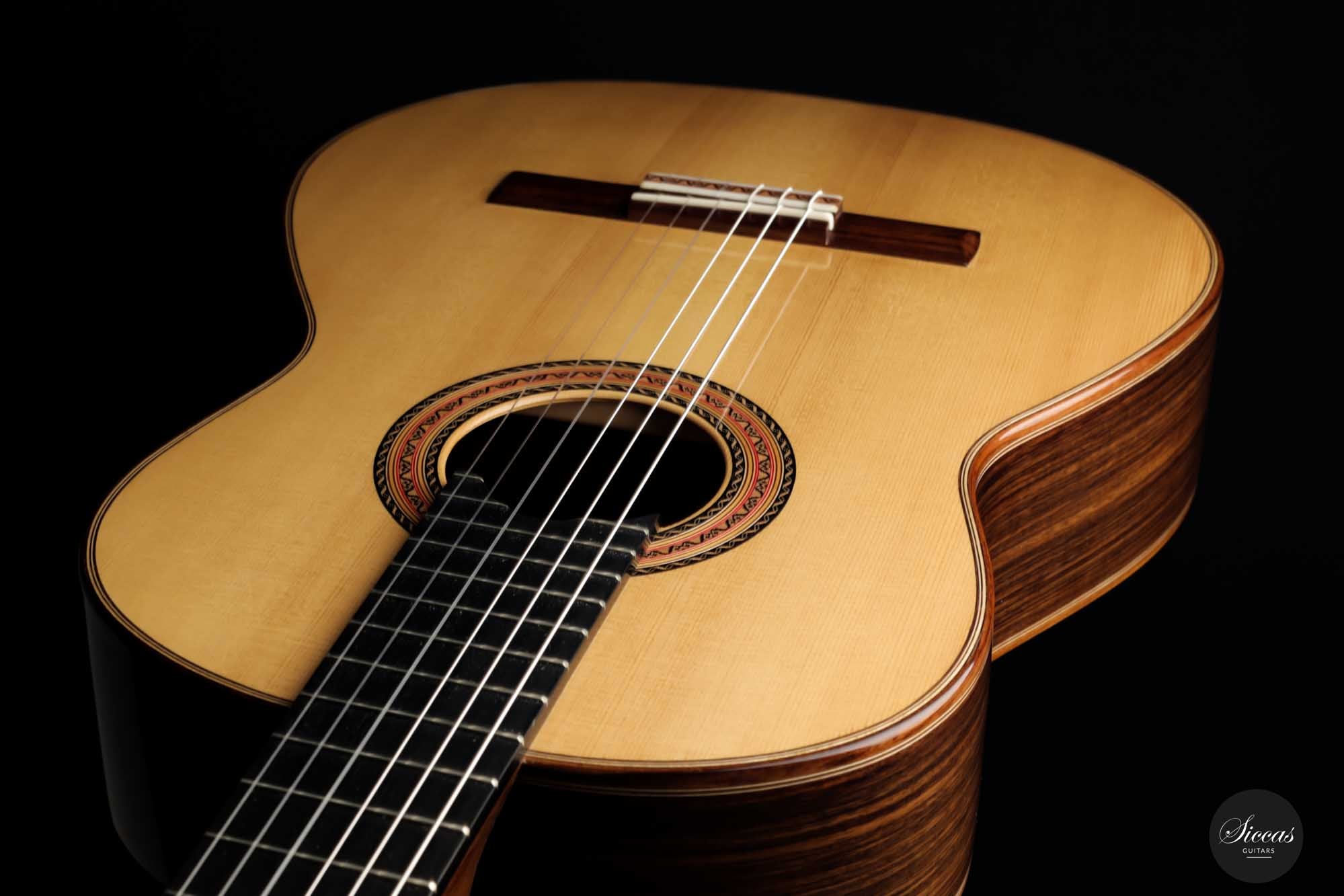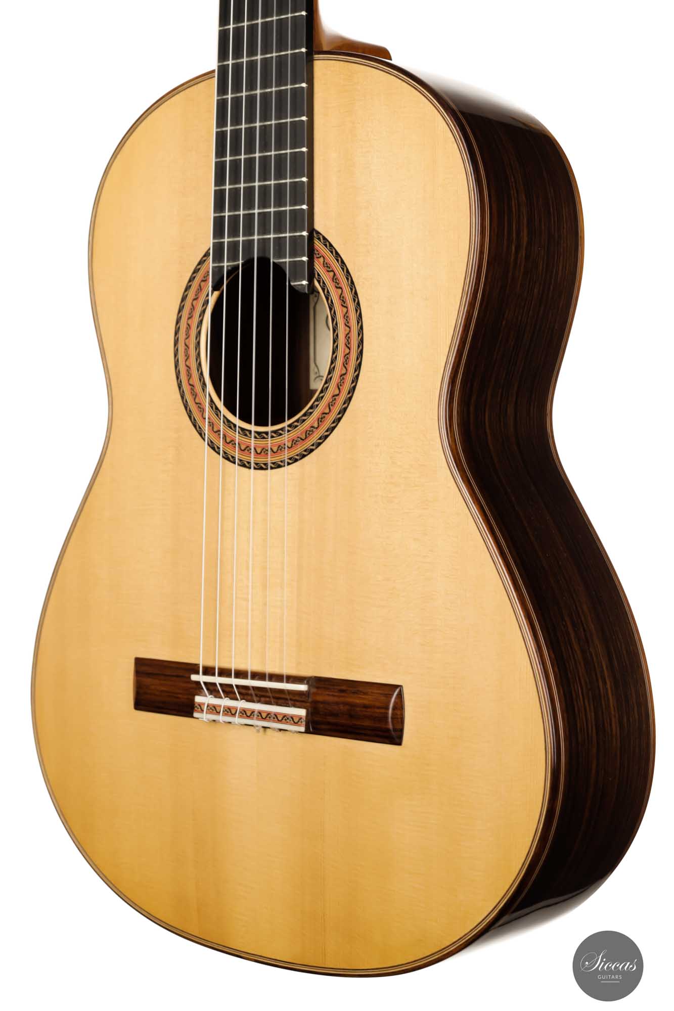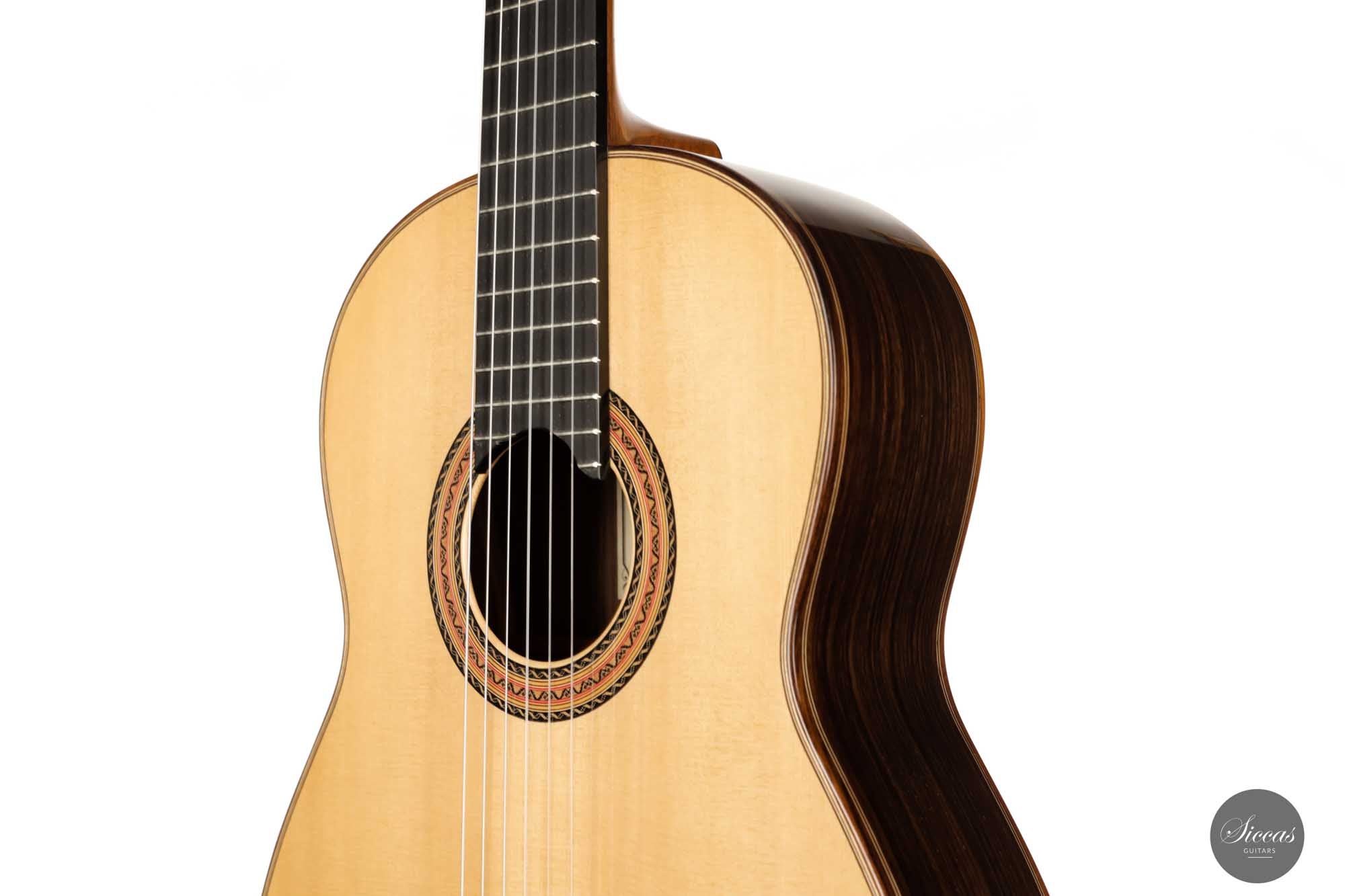 This beautiful modern concert instrument was built following the Spanish tradition yet incorporates modern features, such as double sides construction with a cypress inner layer. As a result, a guitar that has a significant volume and projection, and at the same time, remains faithful to its Spanish roots. The premium spruce soundboard and Indian rosewood back and sides have been chosen with the utmost care. The clear trebles sing lively, while the deep and punchy basses provide a solid sound foundation to this guitar. One will also note this guitar's exceptional playability, making it an instrument whose quality is definitely beyond its price tag.