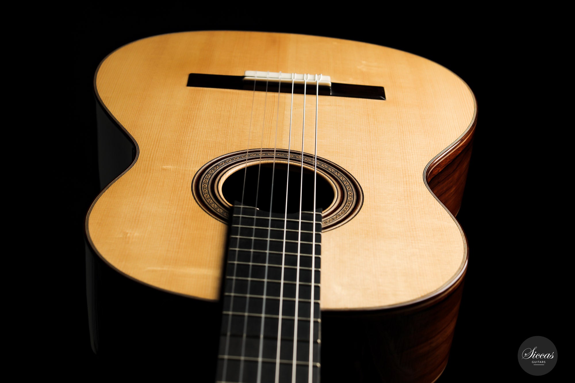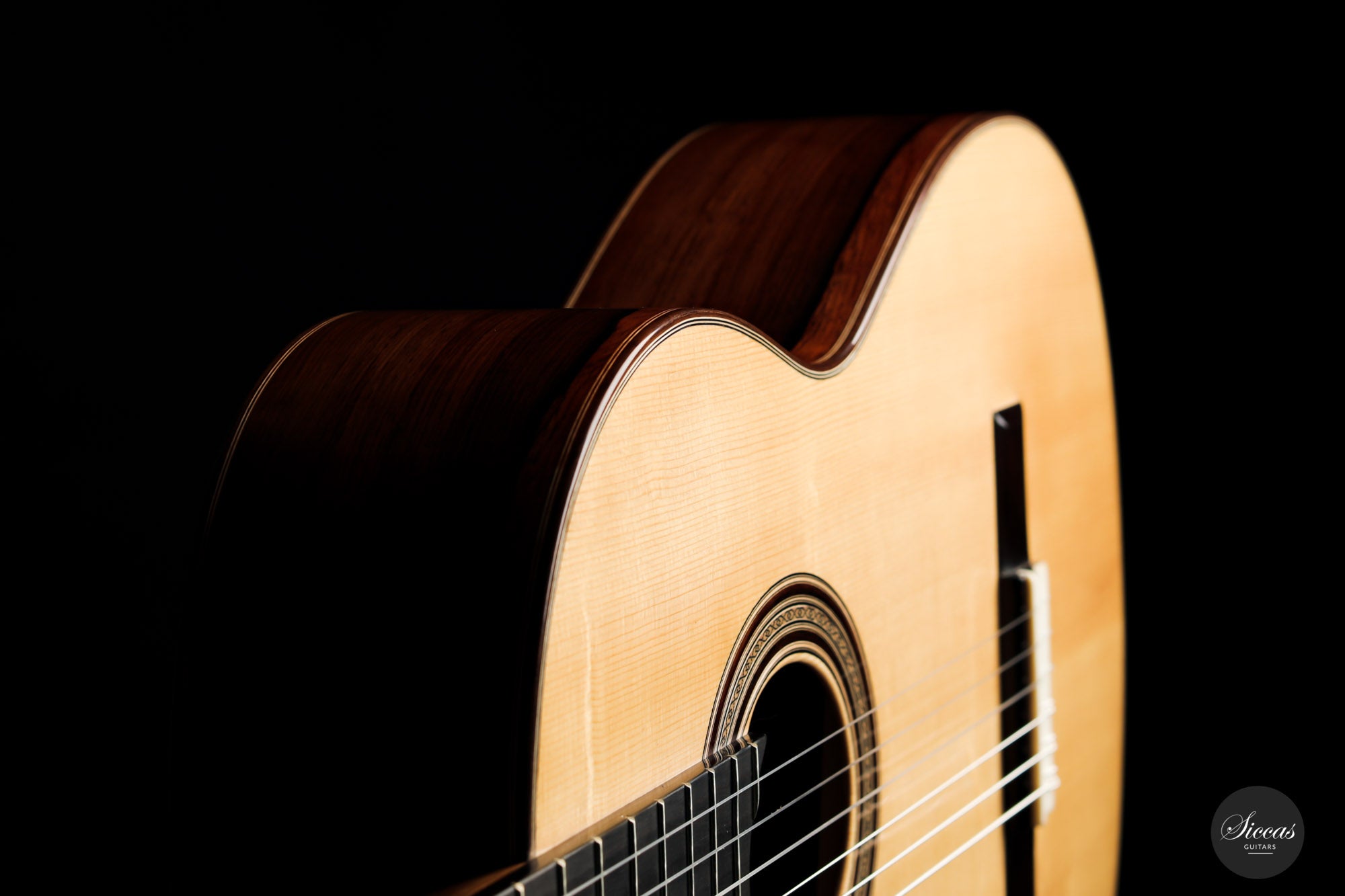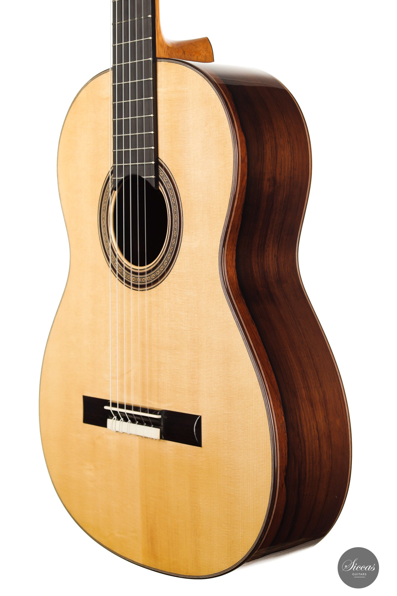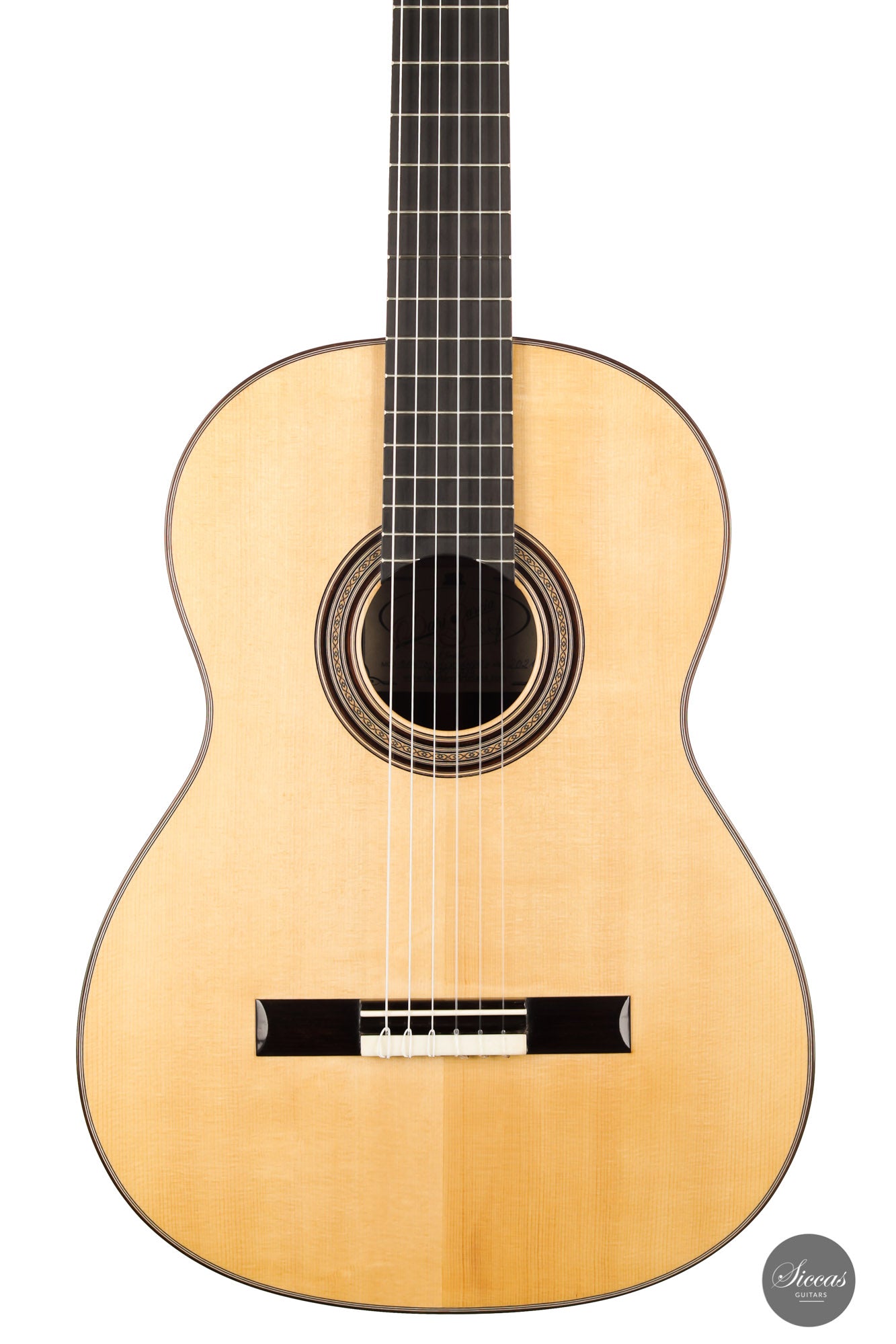 Darío García built this elegant guitar as a faithful copy of the Santos Hernández guitar from 1924, which belonged to Andrés Segovia and was donated by Segovia to the Victor Espinós Music Library in Madrid, where it is still preserved today. This beautiful instrument is made of fine spruce and stunning African rosewood. It is characterised by its light weight due to the thinly crafted woods. When playing, the sound of the instrument is surprisingly powerful with a present harmonic content. A truly inspiring guitar that has a charming vintage timbre that is rarely found in new instruments.
