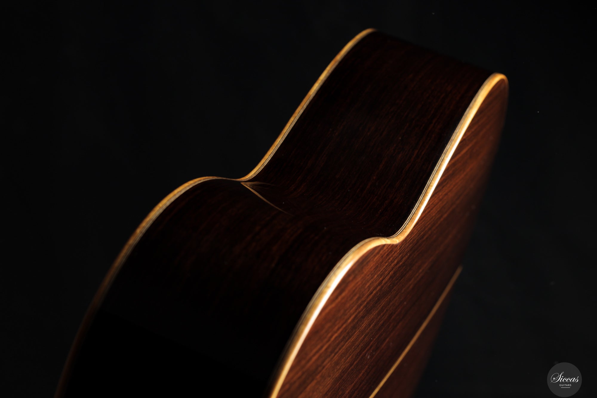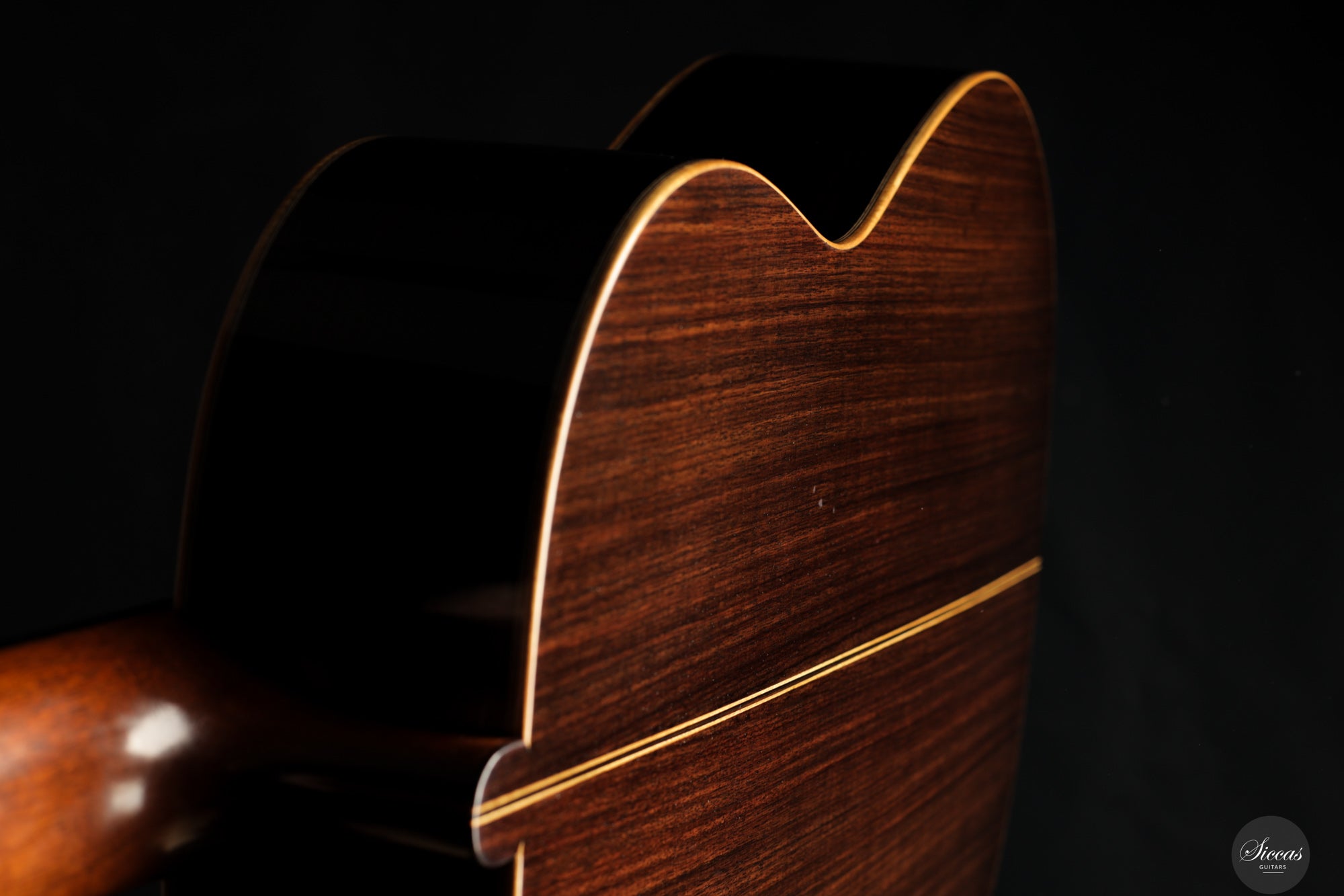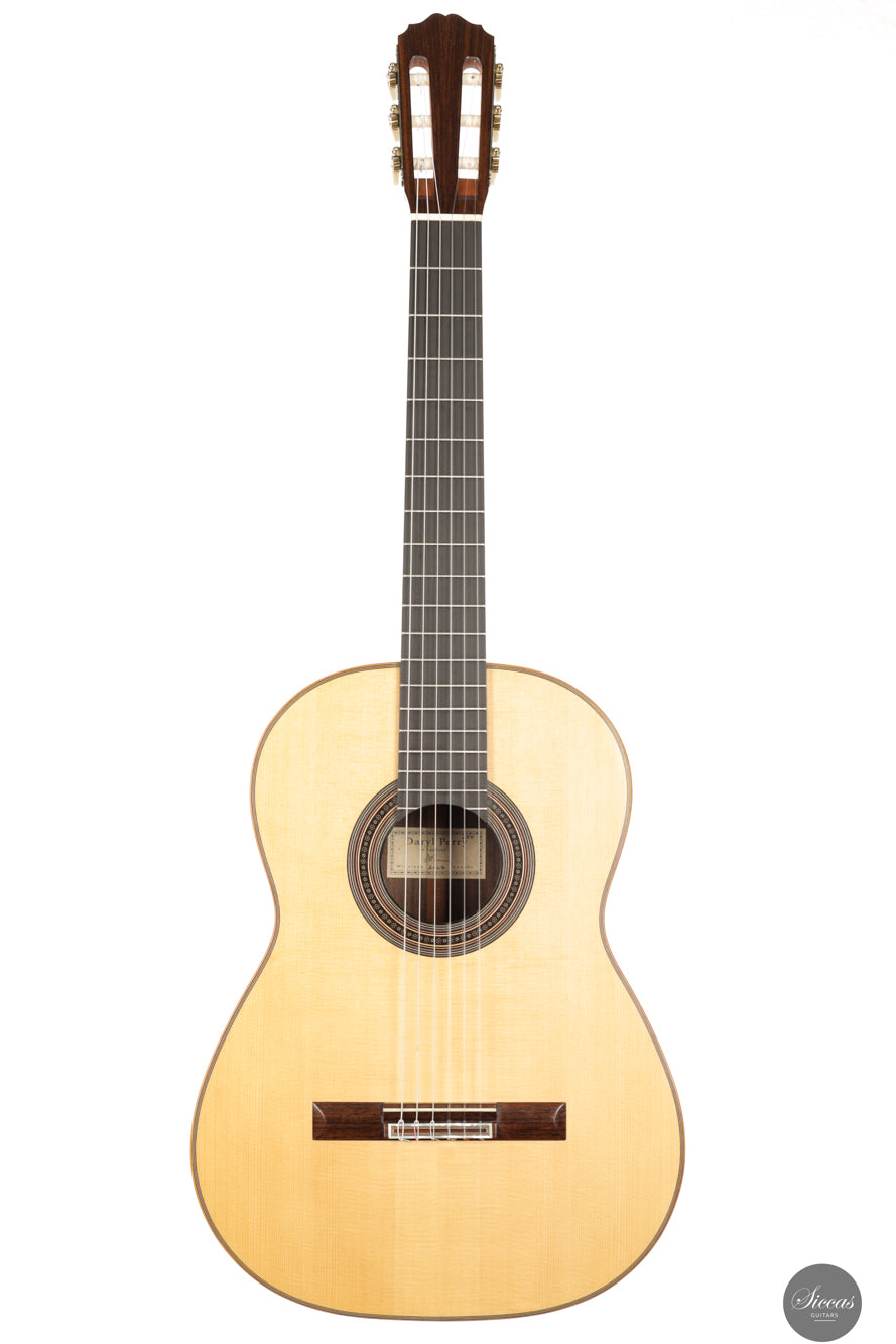This instrument from 2024 bearing the number 255 is a traditionally built concert guitar that clearly expresses Daryl Perry’s artistic vision. The spruce soundboard is finished with French polish and paired with Indian rosewood which provides warmth colour and a natural singing quality. The design reveals a clear sense of proportion and an elegant restraint that recalls historical instruments while maintaining a distinct contemporary refinement. Rodgers tuning machines complete the instrument with smooth and reliable tuning.