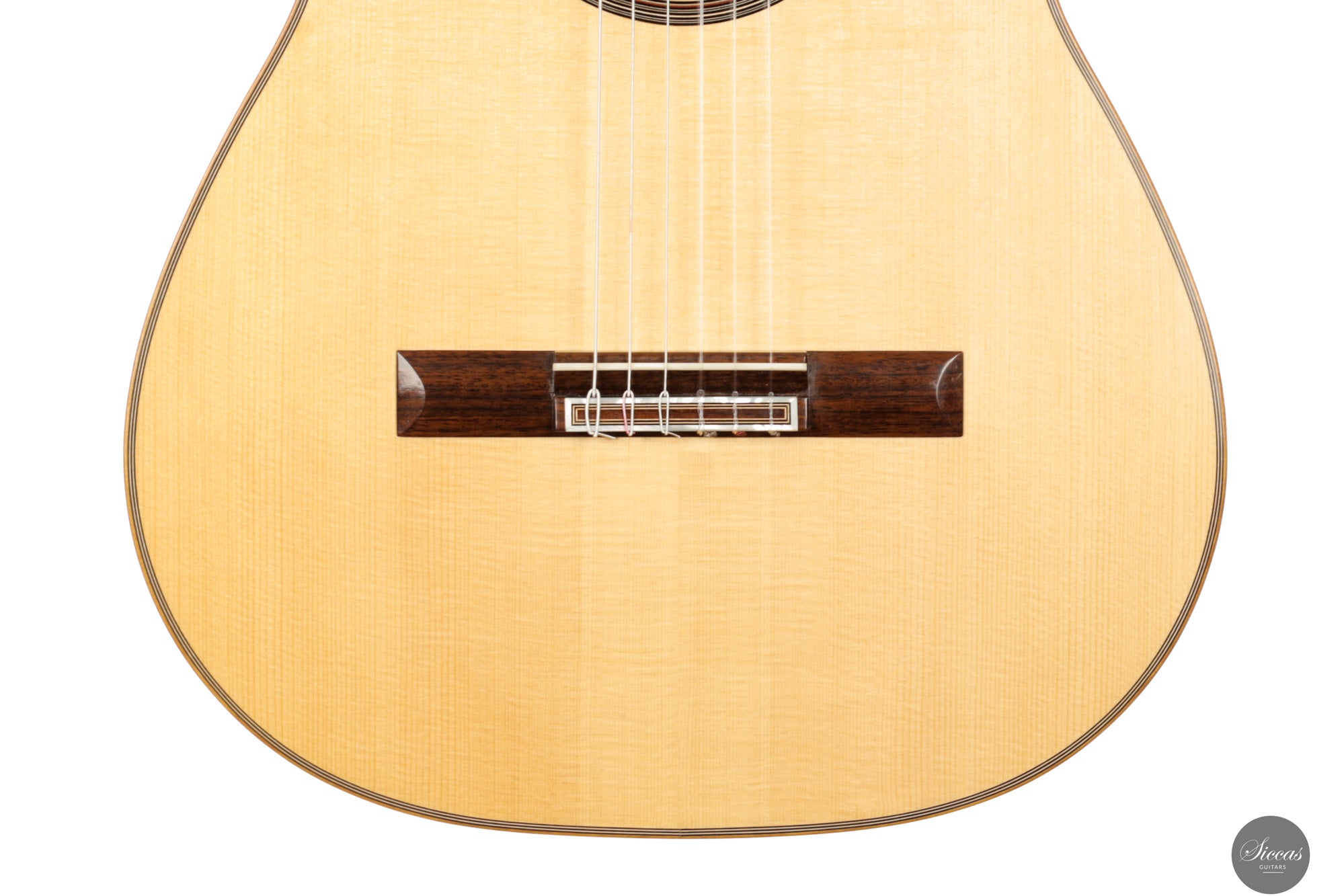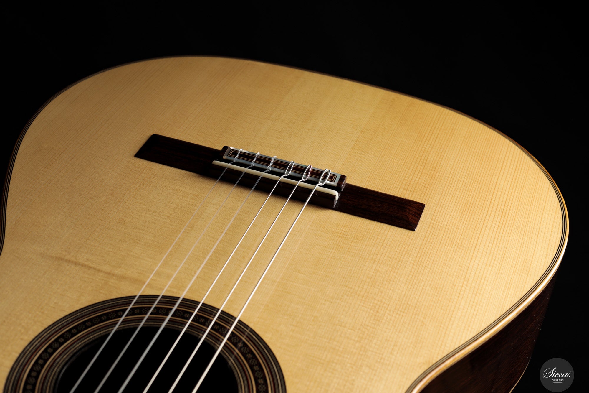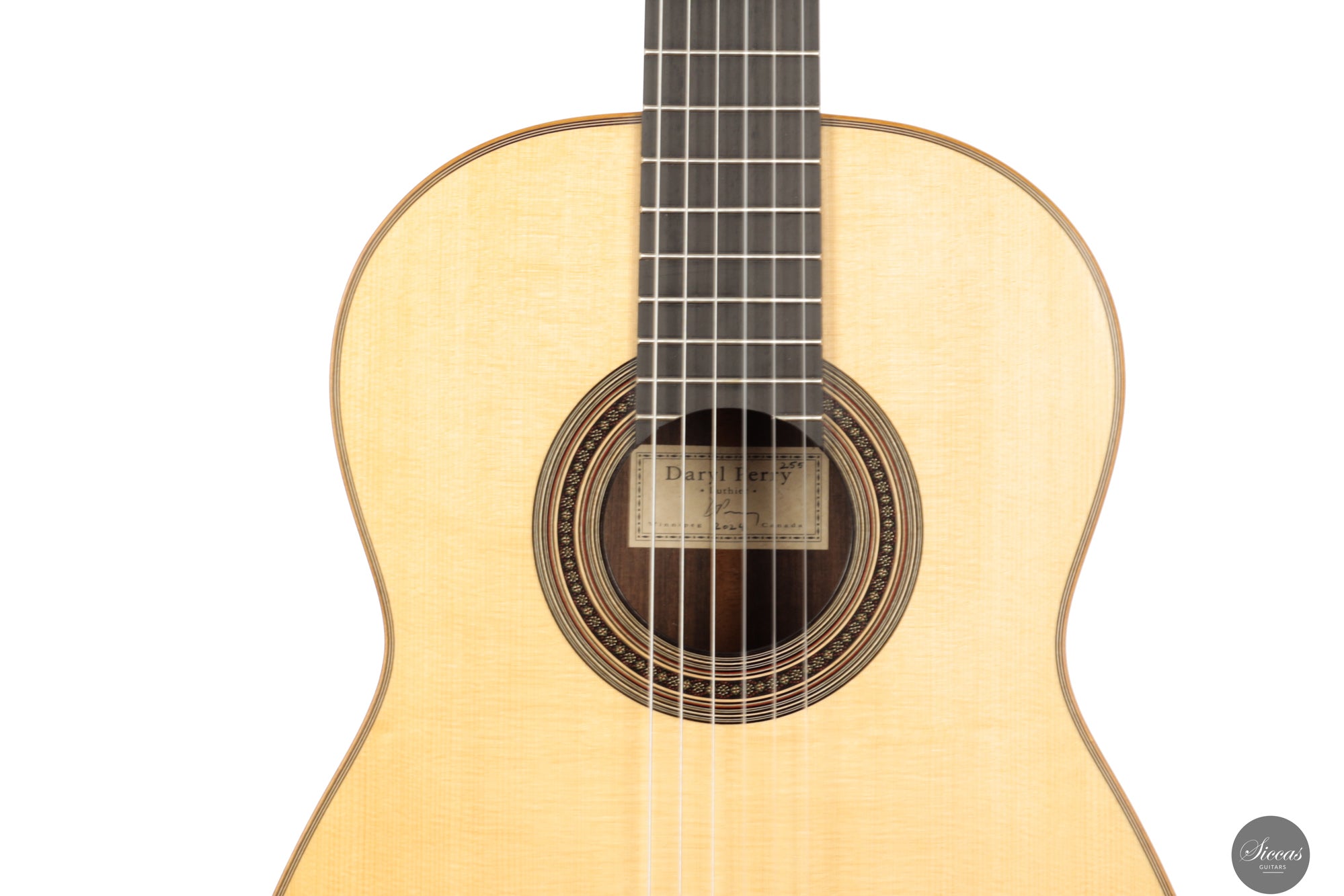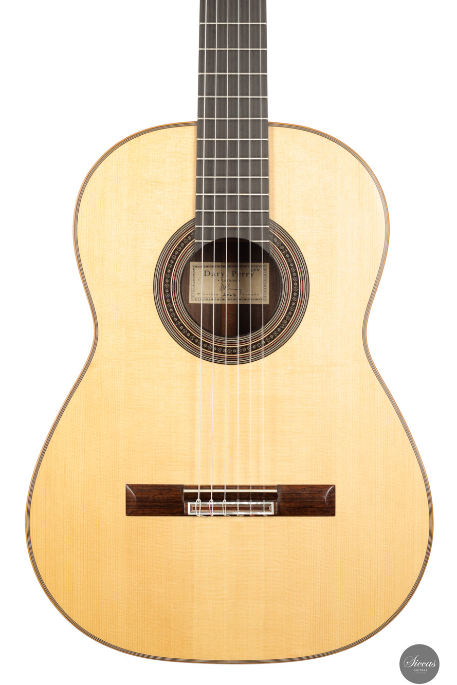 A 2024 concert guitar by Daryl Perry with spruce top and Indian rosewood that offers clear singing trebles supportive basses and an elegant traditional voice. It responds with refinement and balance and delivers excellent separation and sustain for expressive concert playing.