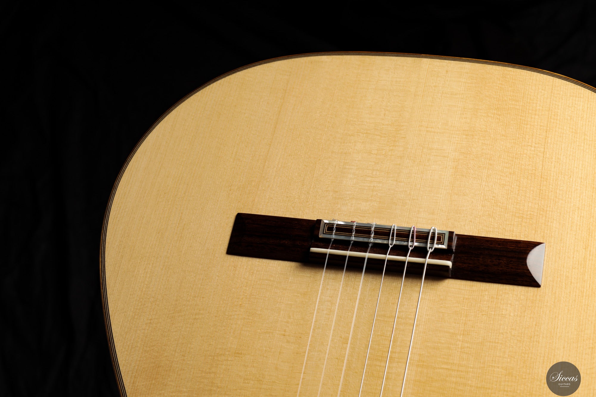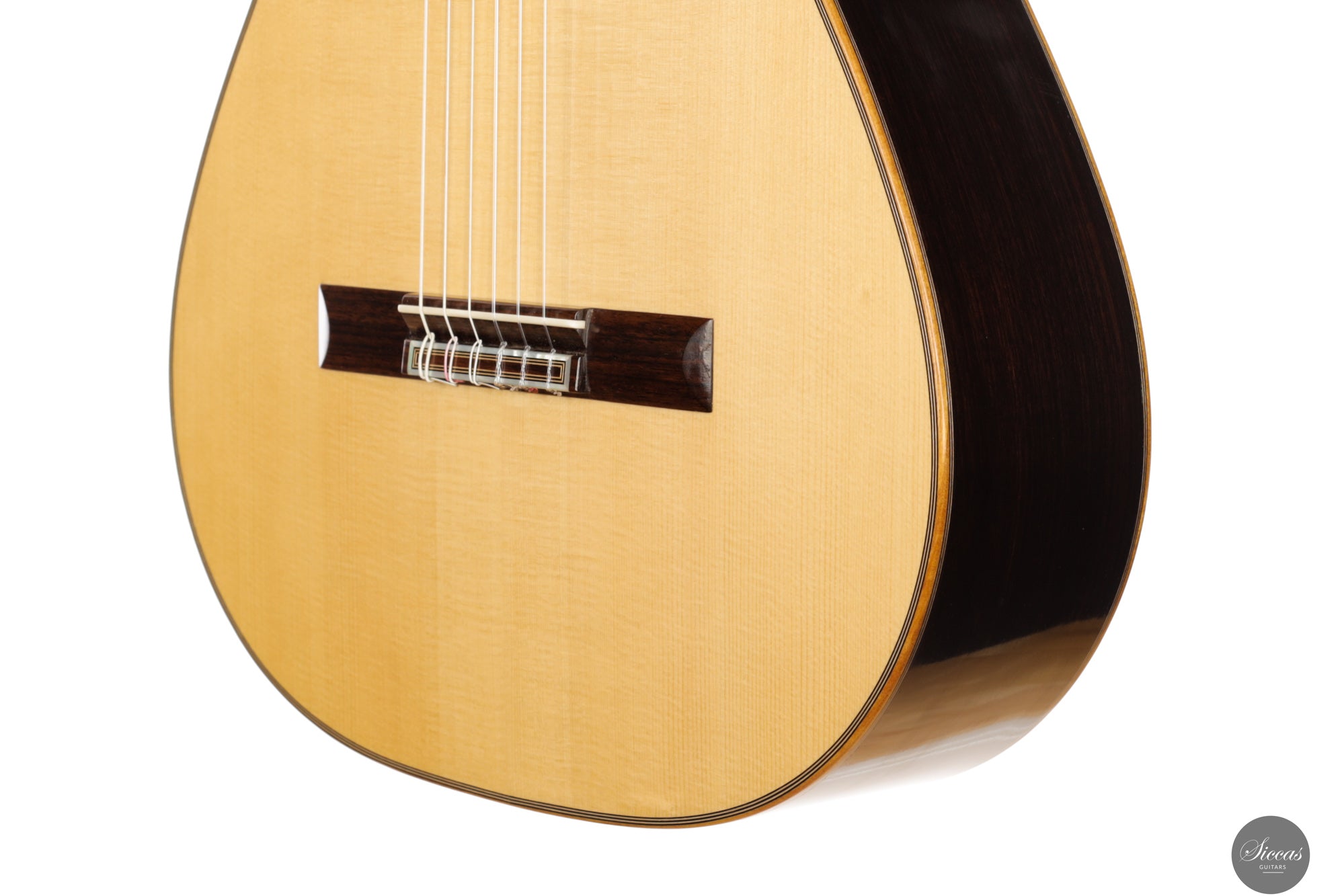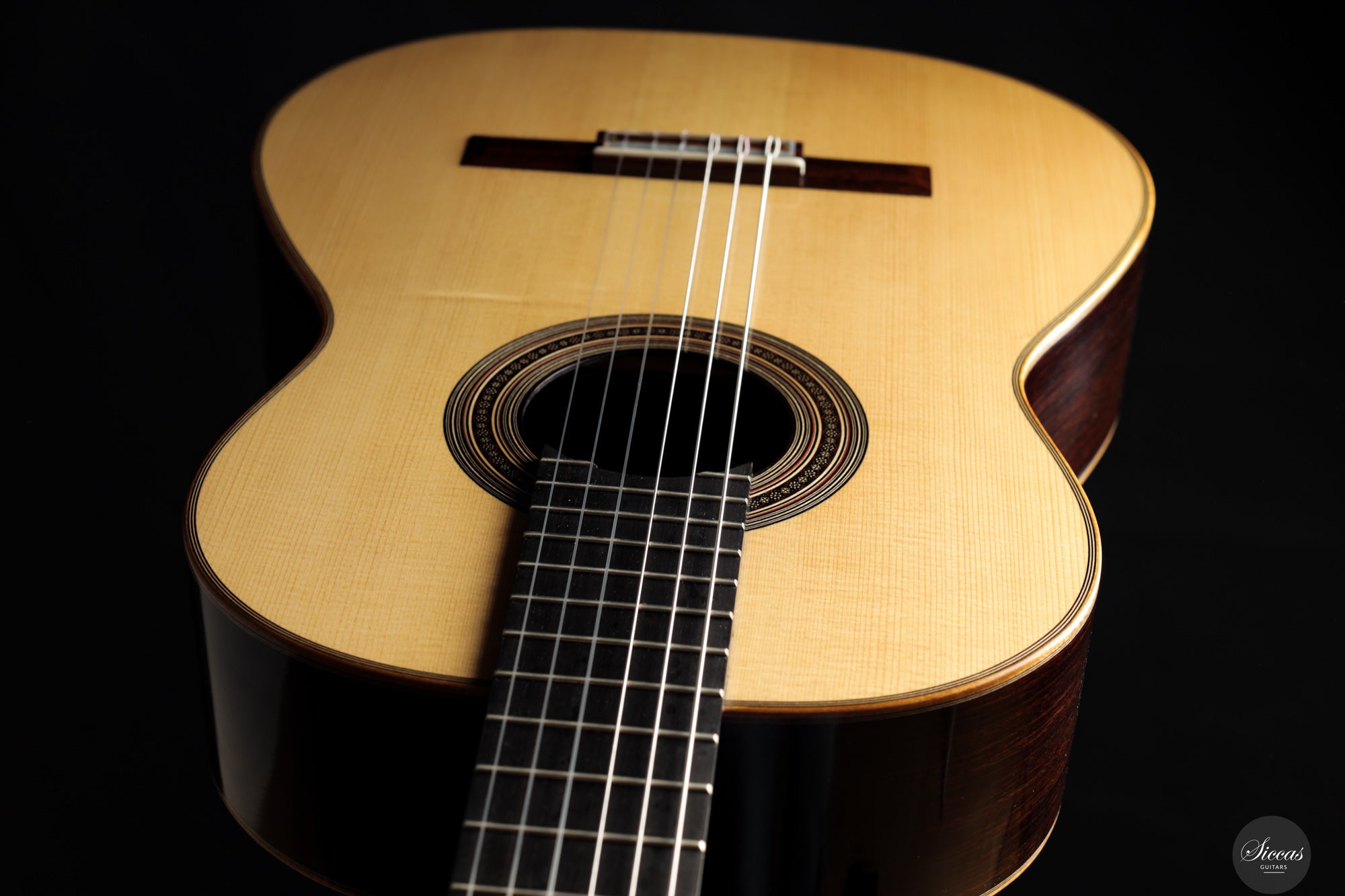 A 2024 concert guitar by Daryl Perry with spruce top and Indian rosewood that offers clear singing trebles supportive basses and an elegant traditional voice. It responds with refinement and balance and delivers excellent separation and sustain for expressive concert playing.