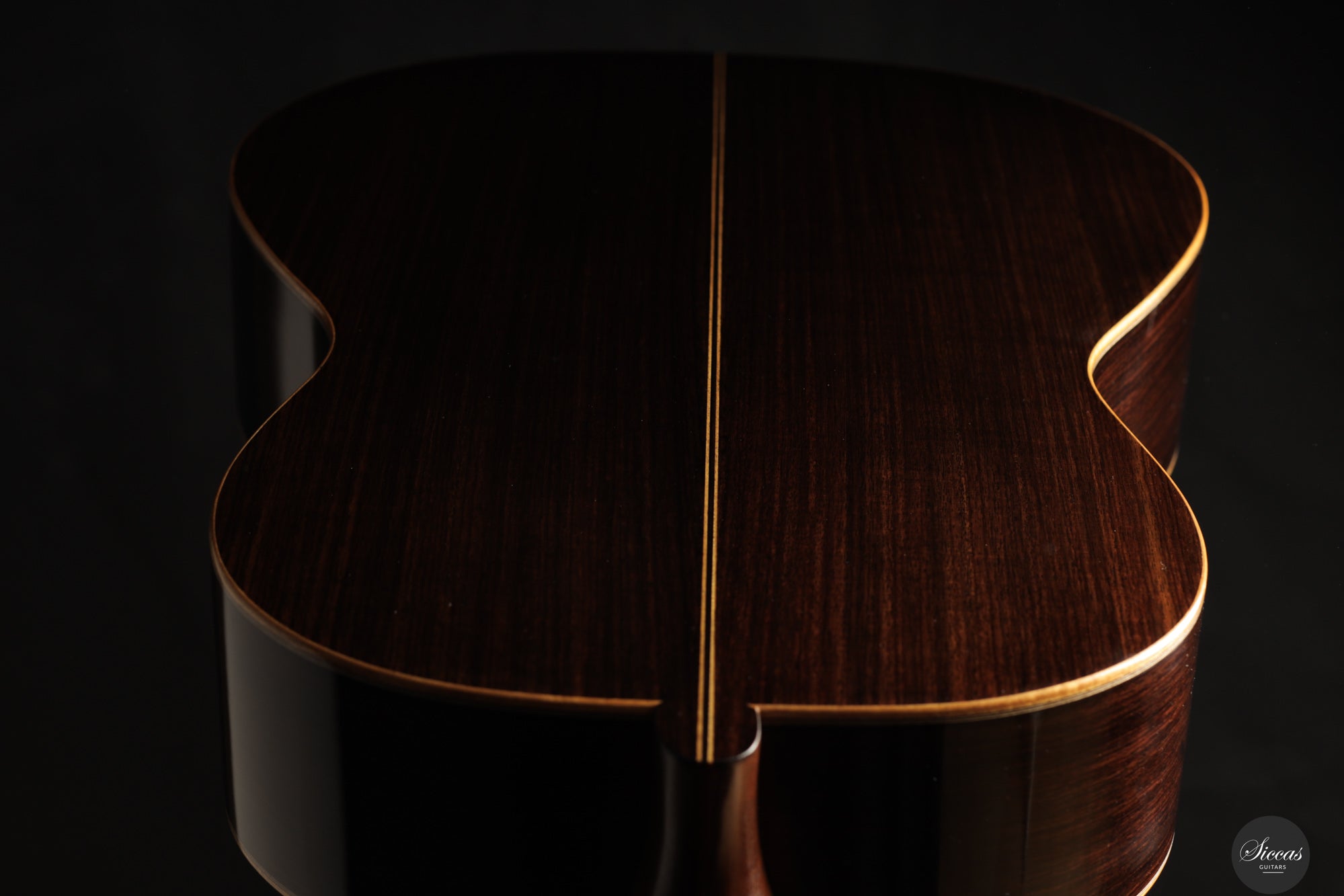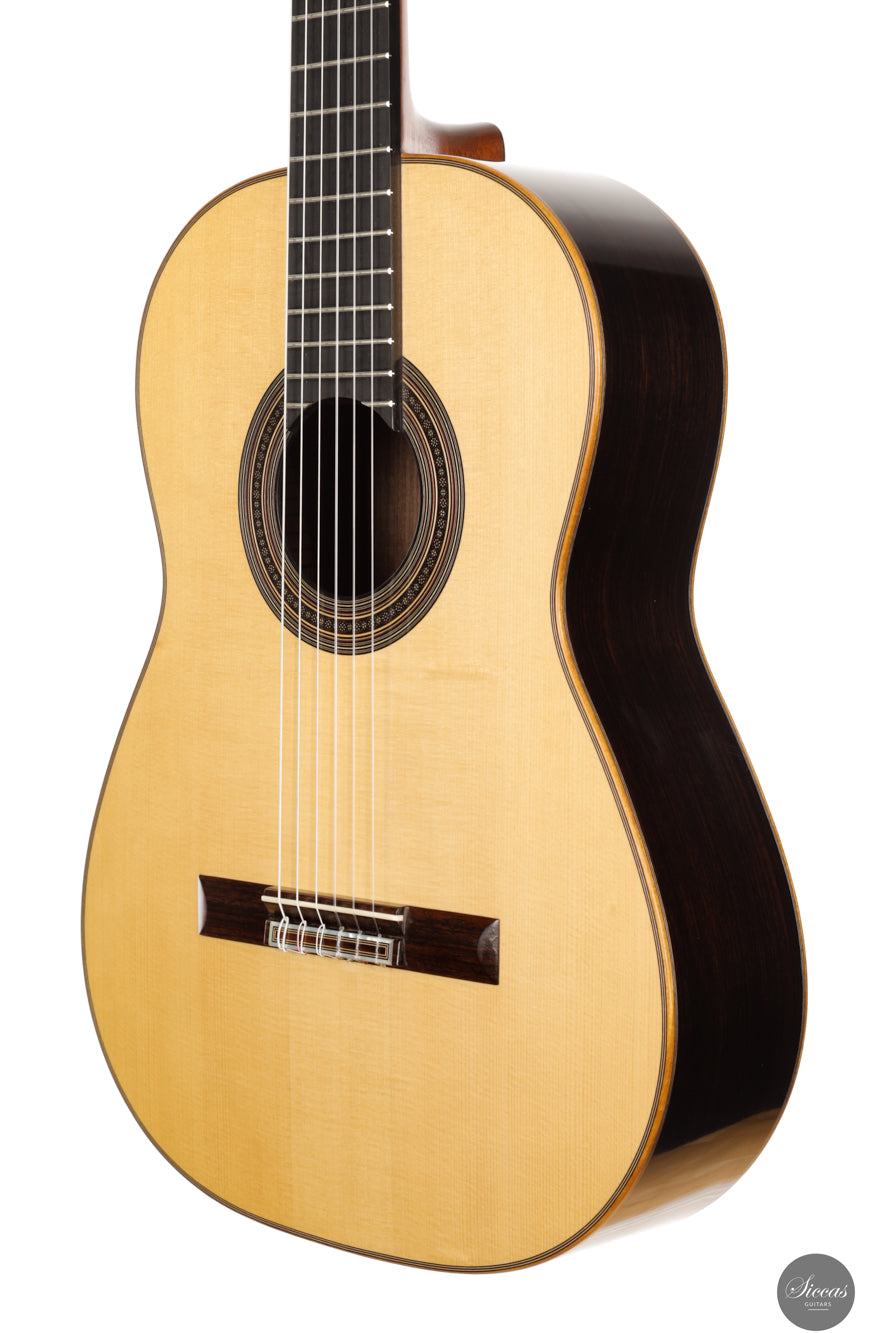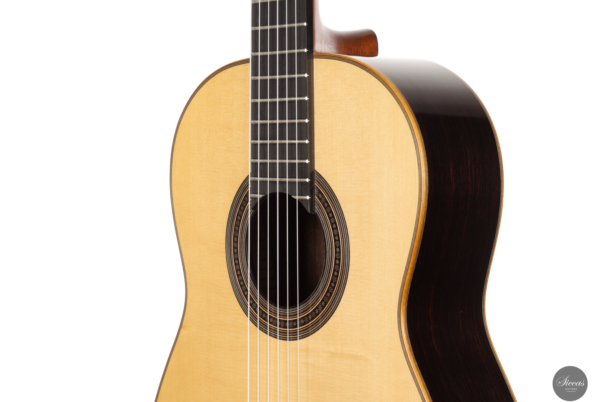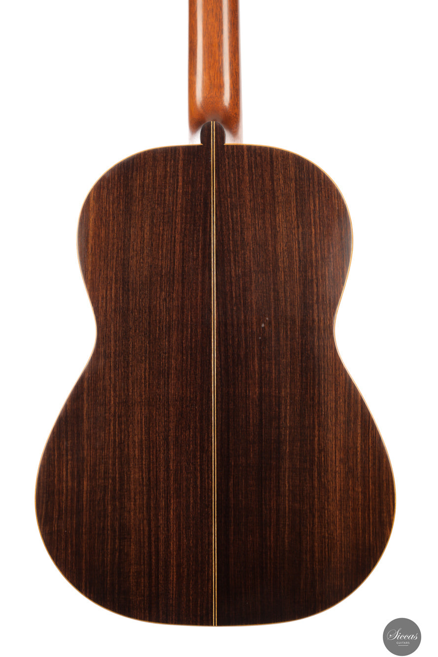 A 2024 concert guitar by Daryl Perry with spruce top and Indian rosewood that offers clear singing trebles supportive basses and an elegant traditional voice. It responds with refinement and balance and delivers excellent separation and sustain for expressive concert playing.