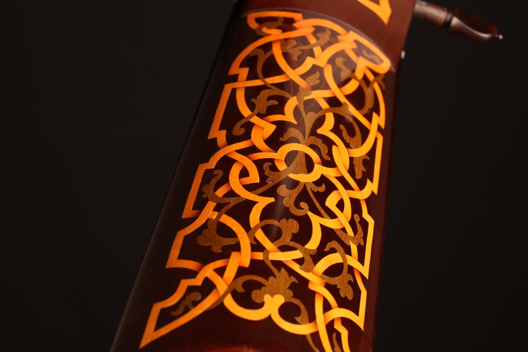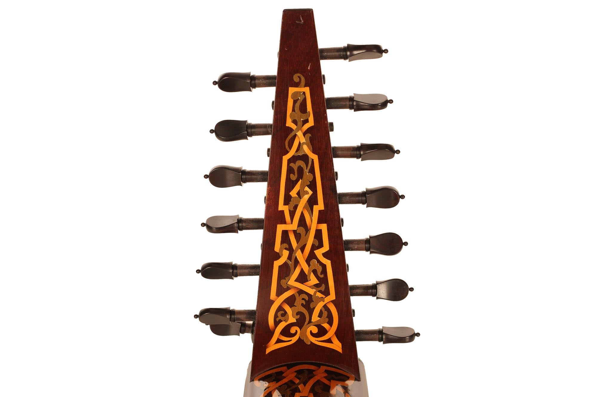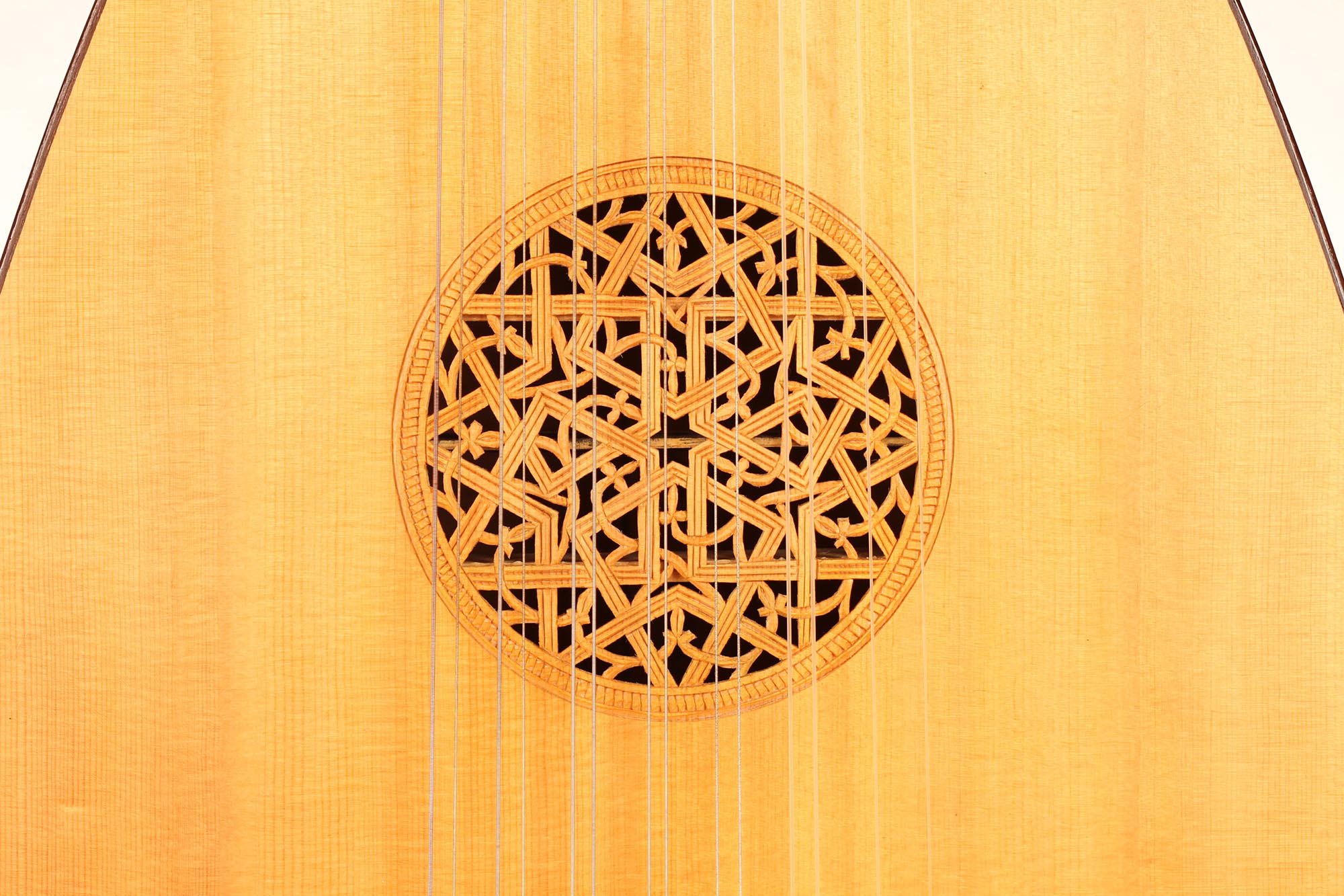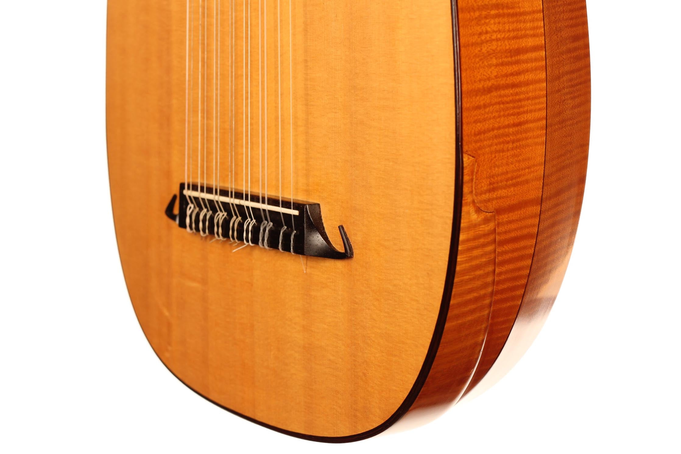 Diese 8-chörige Laute ist ein wunderschönes Beispiel für die hochwertige Arbeit von David José Rubio. Sie ist mit feinen Intarsien an Kopf und Hals verziert. Dieses Instrument wurde nach dem Vorbild der 8-chörigen Laute von Bream aus dem Jahr 1967 gebaut, mit den beiden ersten einfachen Saiten, den eingelegten Bünden und dem erhöhten ersten Saitenwirbel. Diese Laute ist in ausgezeichnetem Zustand. Sie hat weder Risse noch Reparaturen, es sind nur wenige Spielspuren an der Oberseite des Kopfes und einige wenige Spielspuren auf der Decke. Es ist eine seltene Gelegenheit, eine Laute dieses großen englischen Meisters zu sehen, und eine noch größere Gelegenheit, sich einem so wunderschön verzierten Instrument zu erleben, das nach dem Vorbild von Julian Breams Laute gebaut wurde.