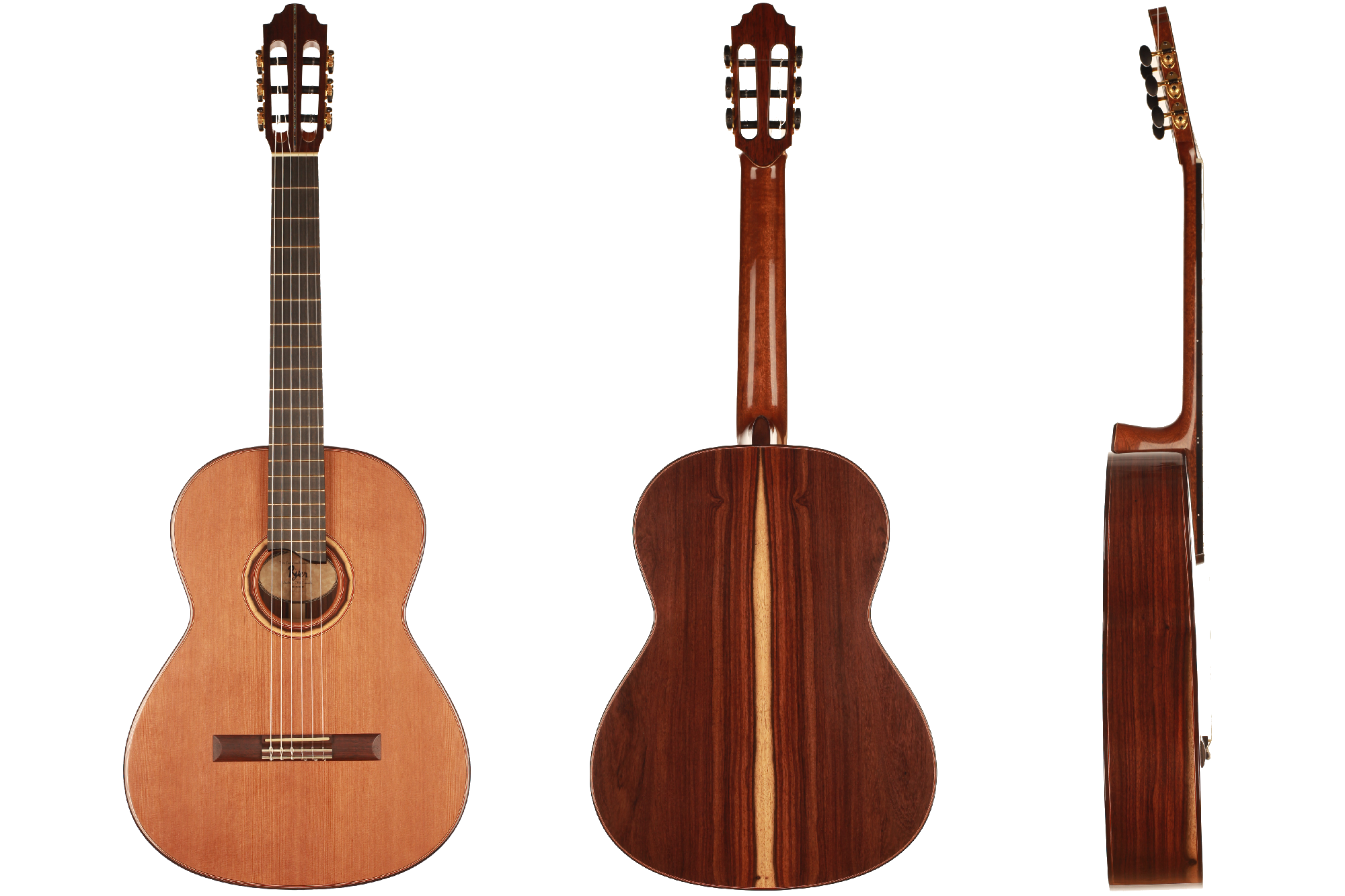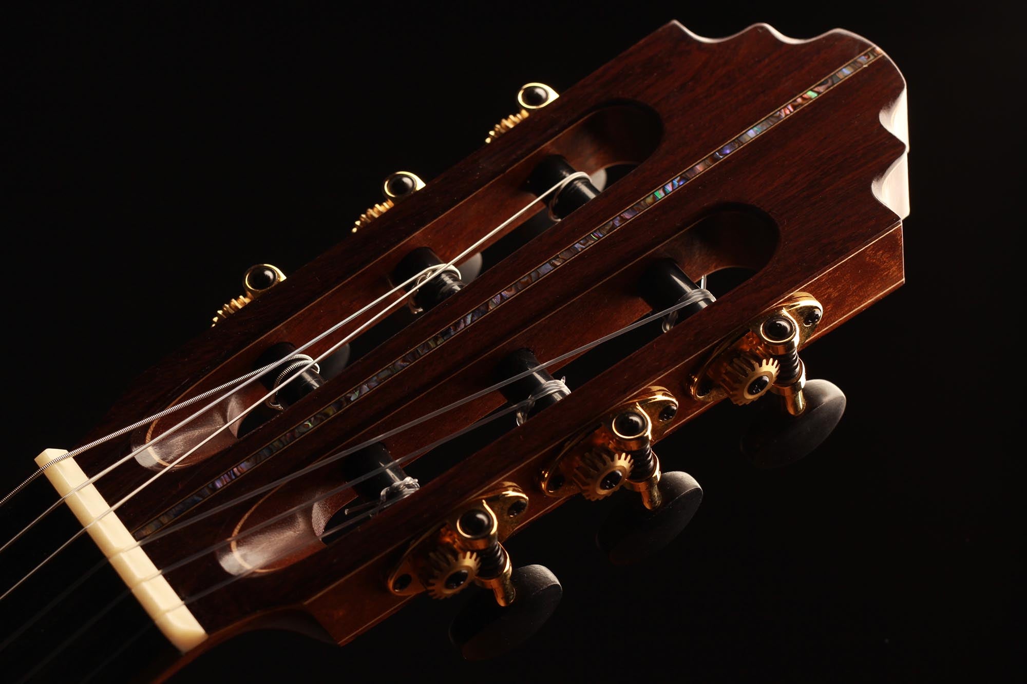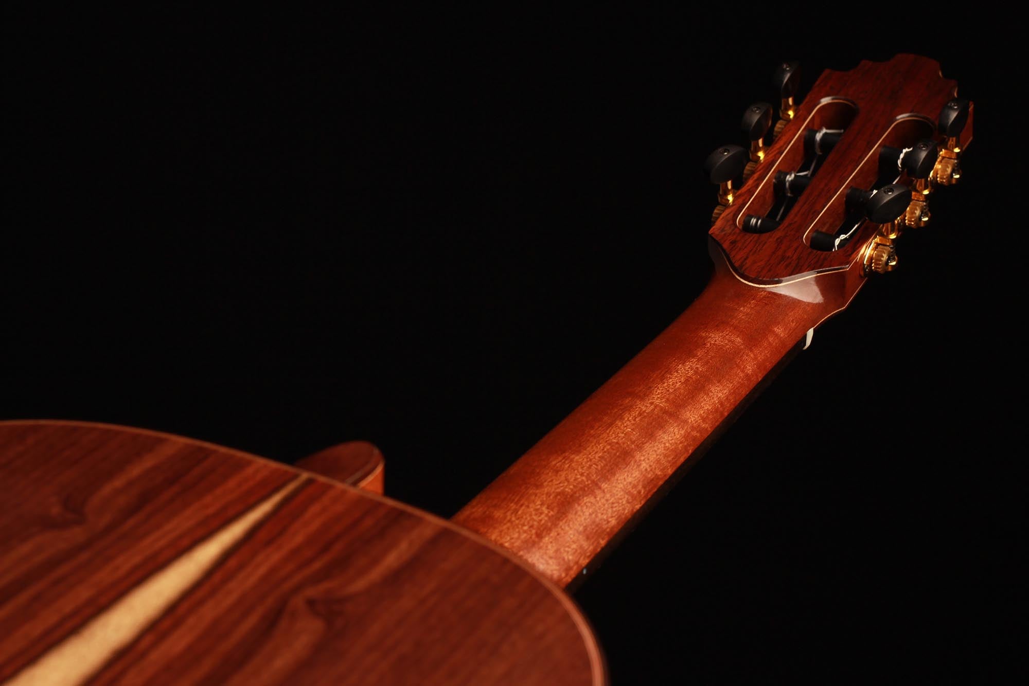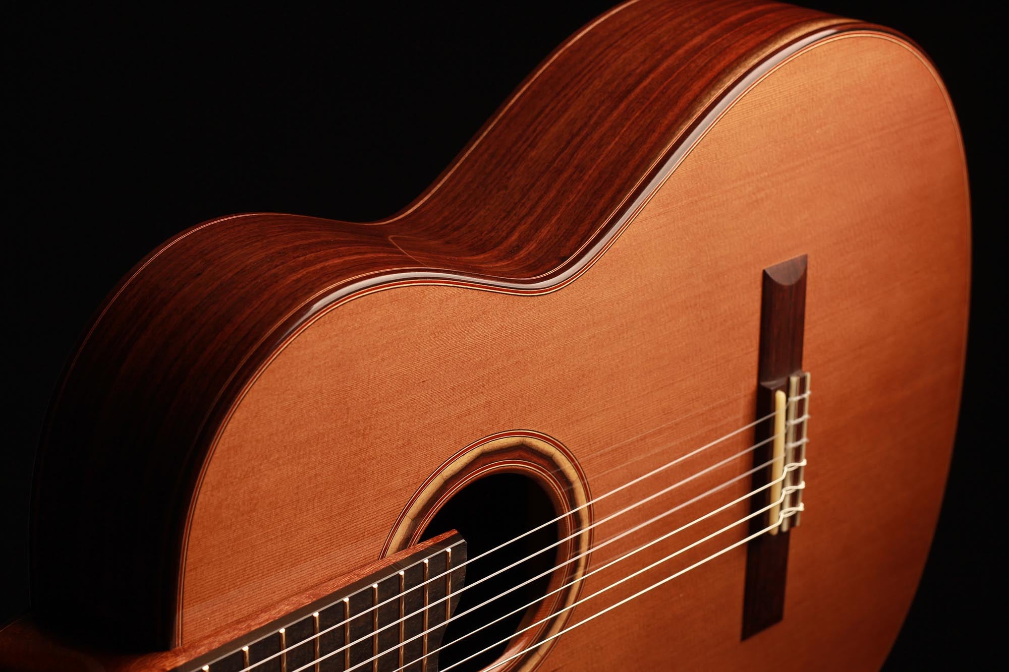 This very fine 2018 Cedar doubletop guitar is one of the easiest-to-play classical guitars that one can imagine. Thanks to its thin neck, the elevated fingerboard and the very sensitive doubletop, this instrument is suitable for guitarists, who particularly value a comfortable guitar or for players with smaller hands aiming for a true concert guitar. The doubletop’s inner core is made of feather-light Paulownia wood, in opposition to the usual Nomex composite. This gives the sound a “woody” timbre with a warm tone and a huge projection. The dynamic range, colour possibilities and amazing playability of this instrument make it a wonderful concert guitar.