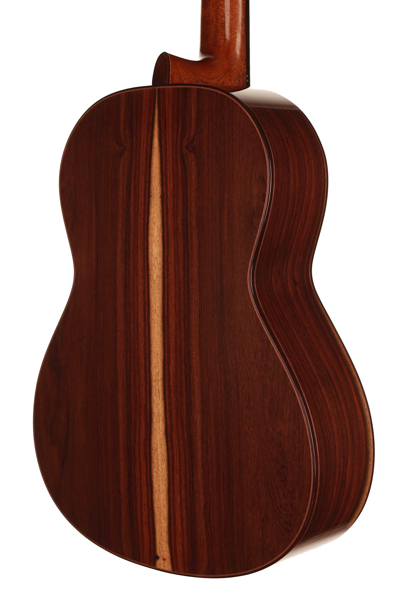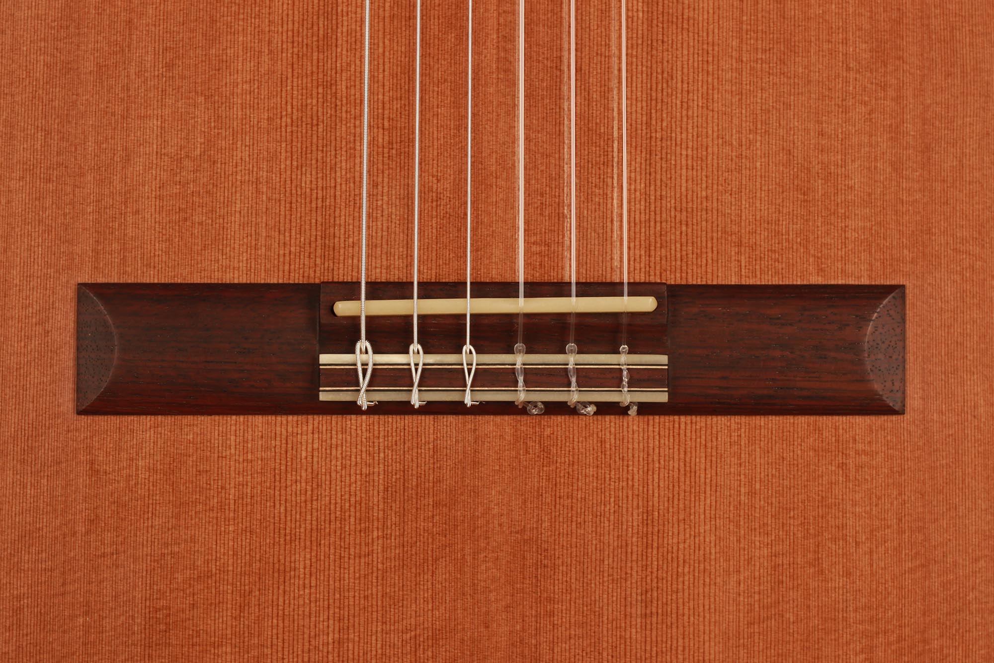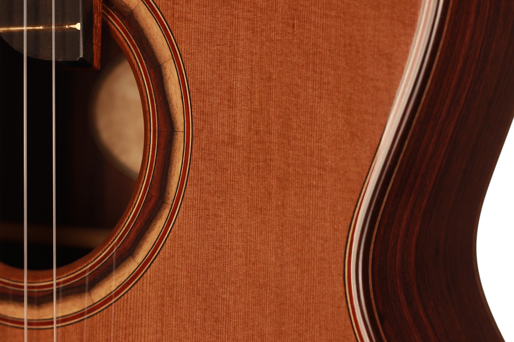 This very fine 2018 Cedar doubletop guitar is one of the easiest-to-play classical guitars that one can imagine. Thanks to its thin neck, the elevated fingerboard and the very sensitive doubletop, this instrument is suitable for guitarists, who particularly value a comfortable guitar or for players with smaller hands aiming for a true concert guitar. The doubletop’s inner core is made of feather-light Paulownia wood, in opposition to the usual Nomex composite. This gives the sound a “woody” timbre with a warm tone and a huge projection. The dynamic range, colour possibilities and amazing playability of this instrument make it a wonderful concert guitar.