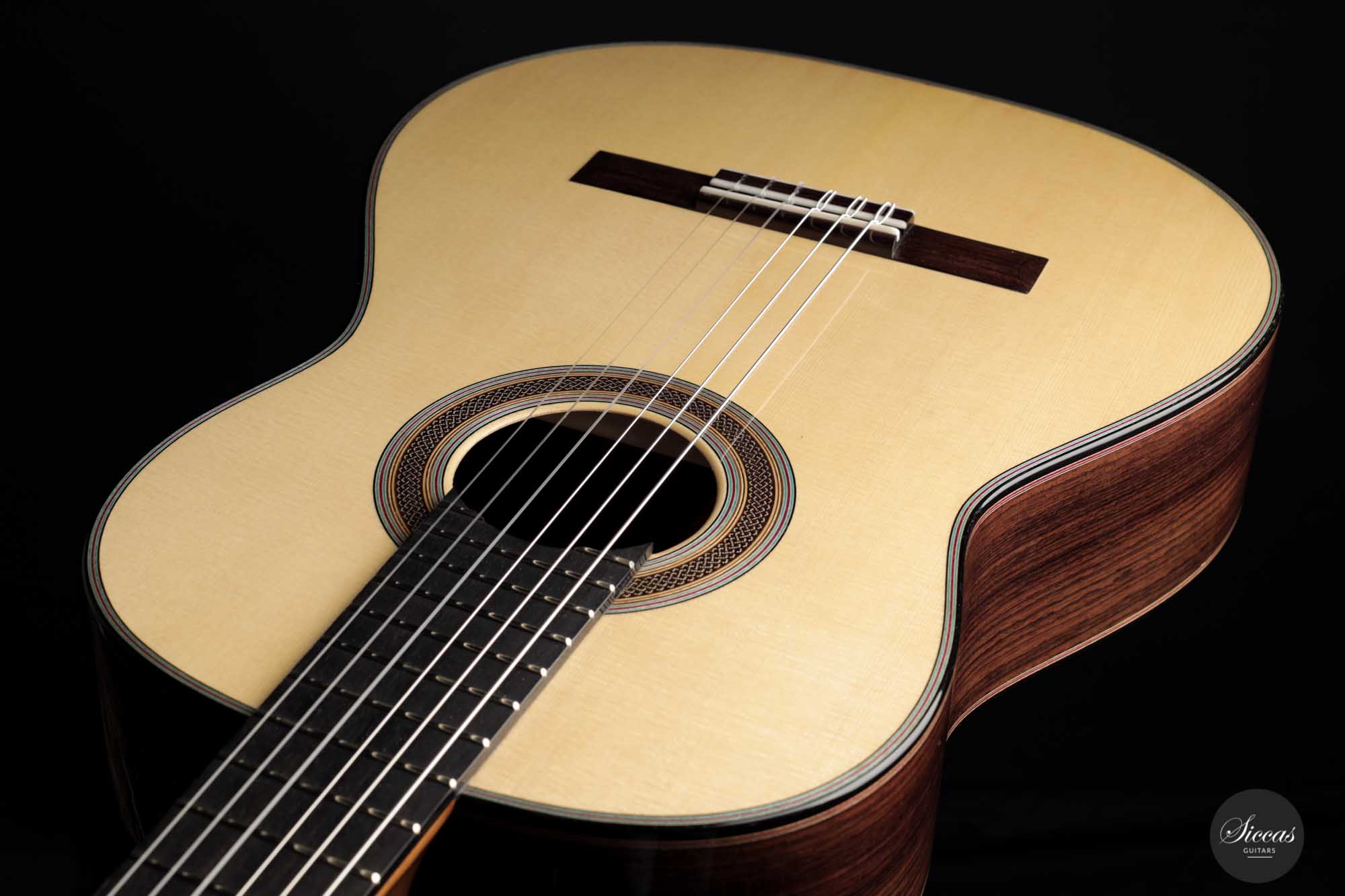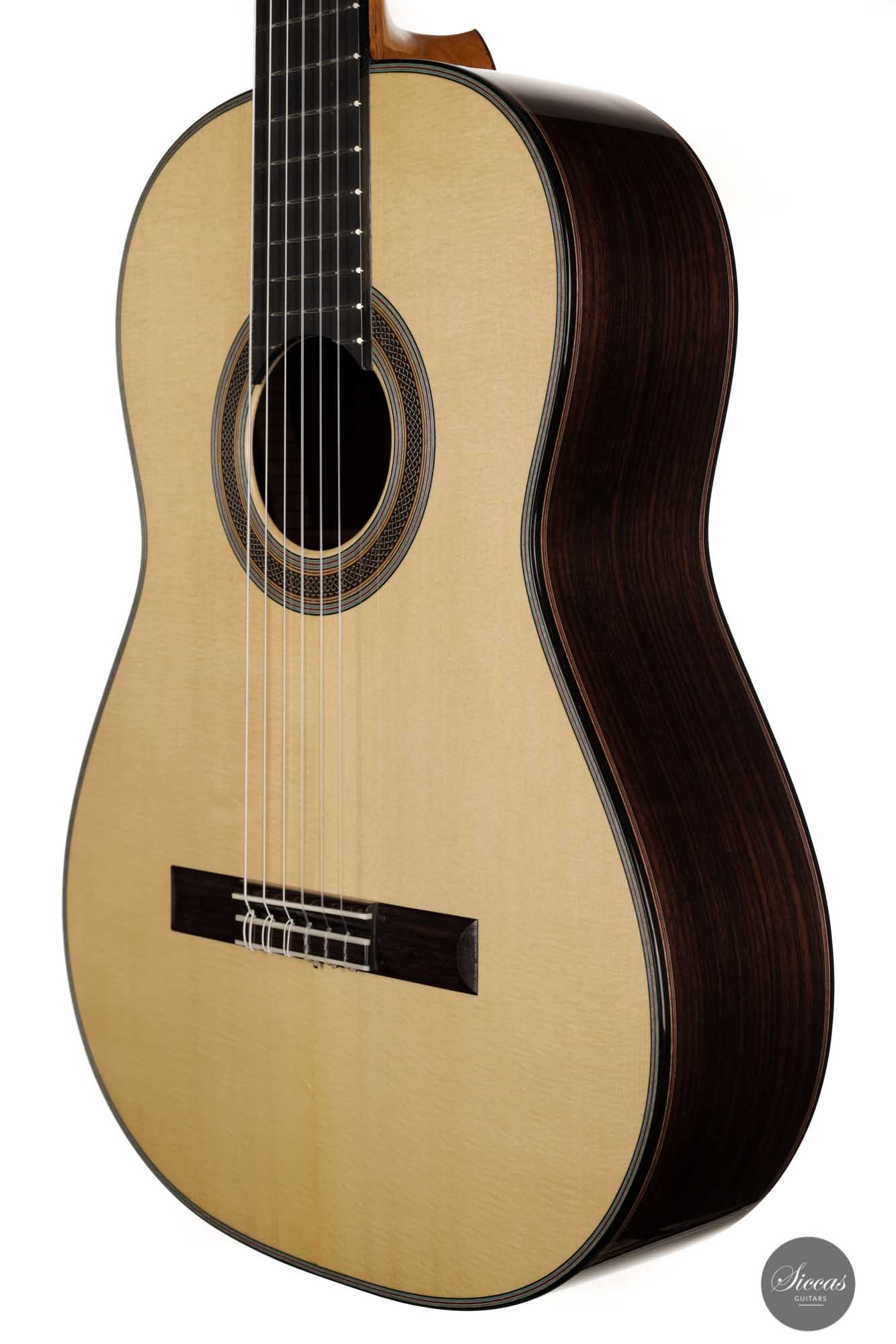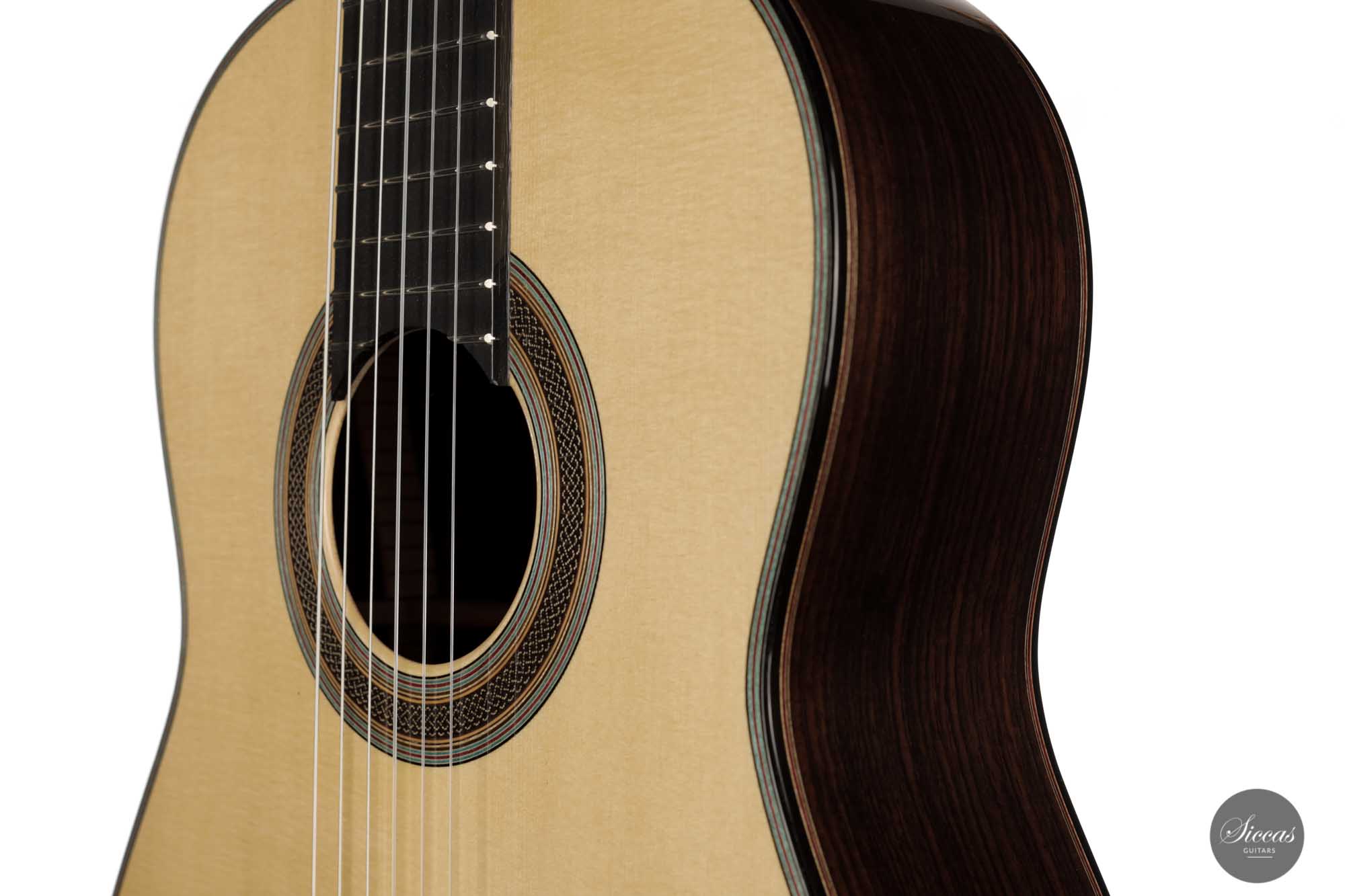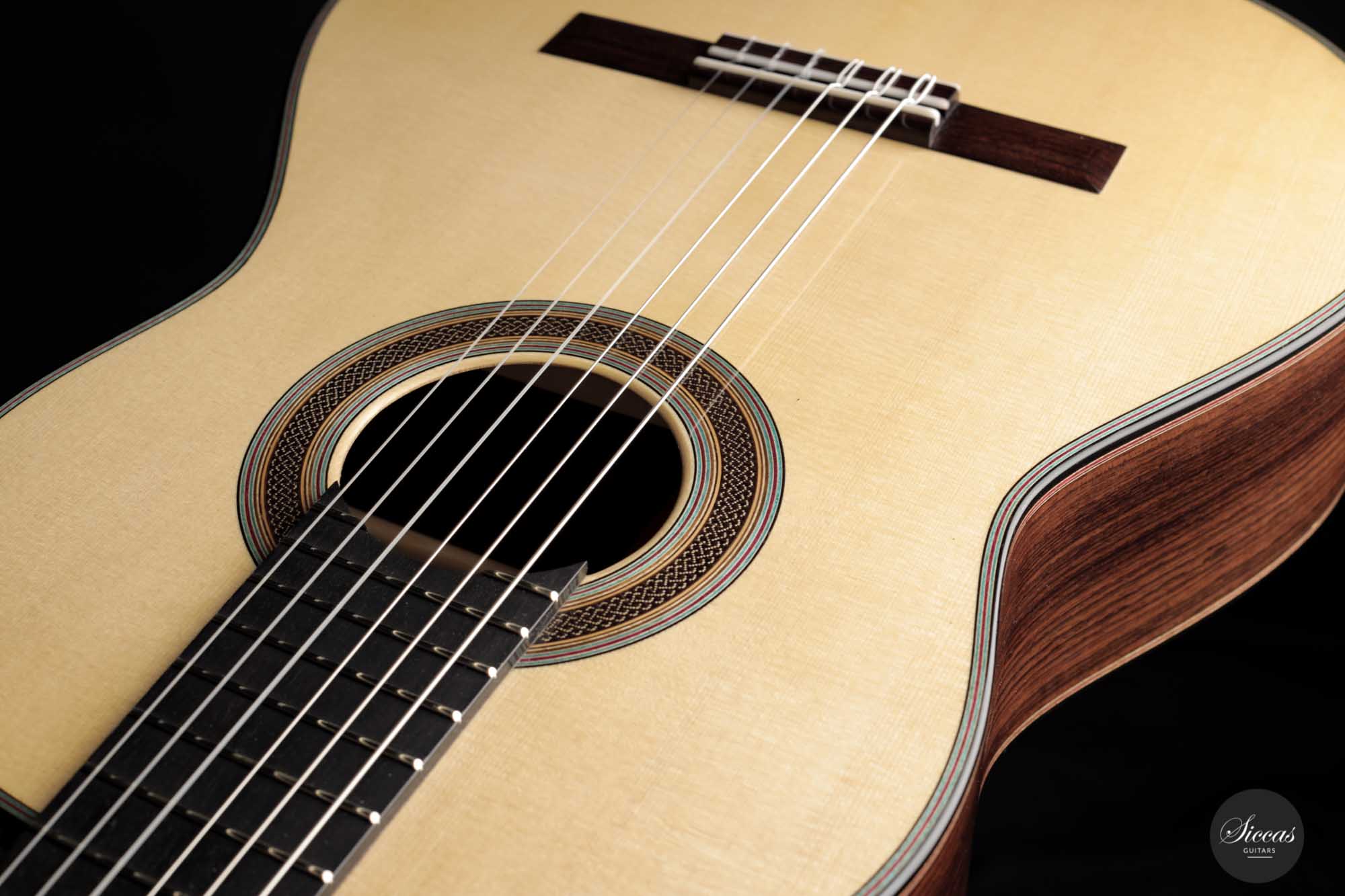 What an incredibly light and resonating guitar! The responsiveness and immediacy of tone are striking, and the maturity of this instrument is remarkable. It shows incredible potential, and if it already develops such a full tone as a brand new instrument, it will be monumental after a year of playing. Everything about this guitar meets high standards: woods, marquetry, tuners, french polish, sound, and playability. It is definitely a great guitar, especially in this price range.