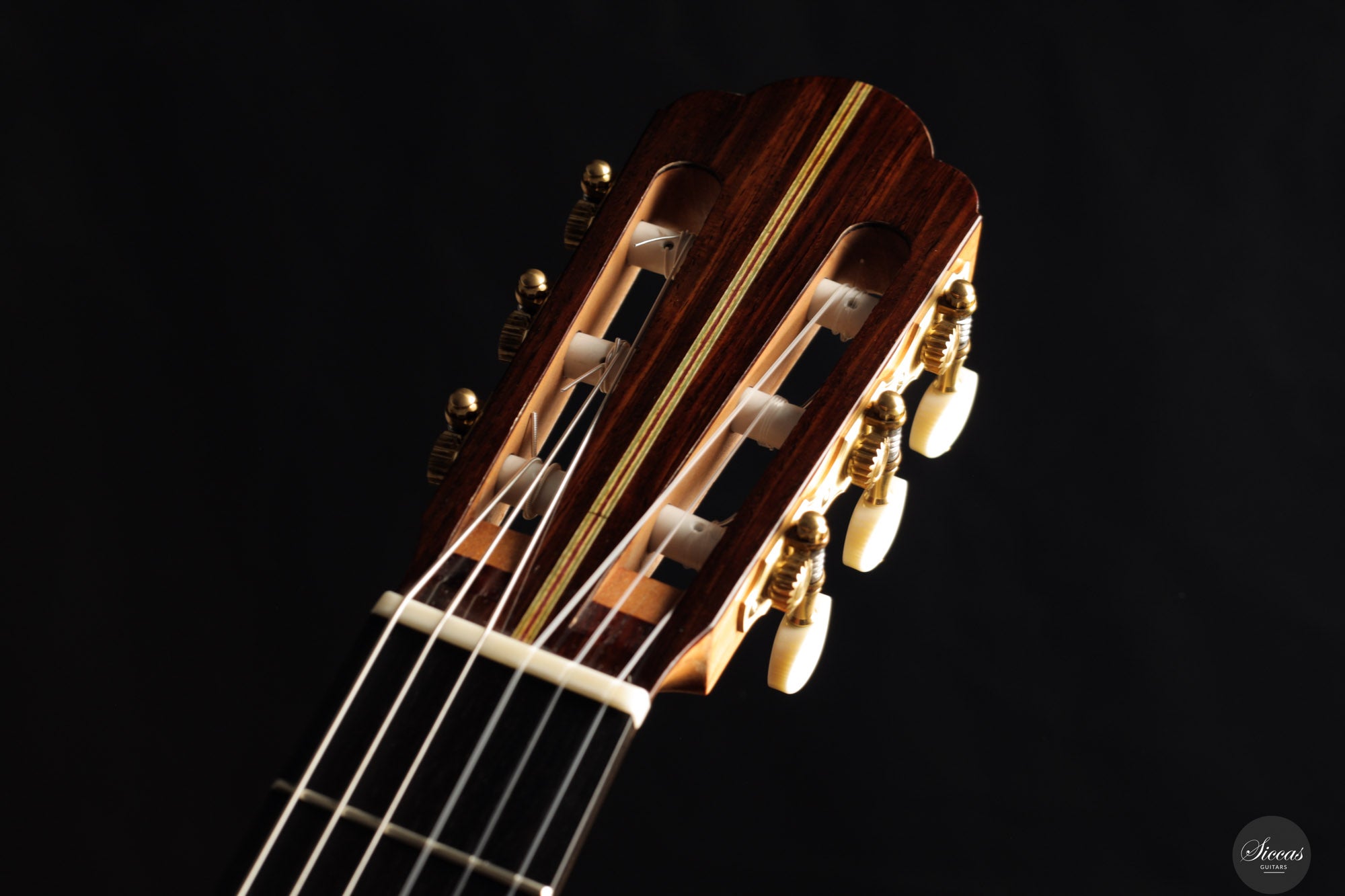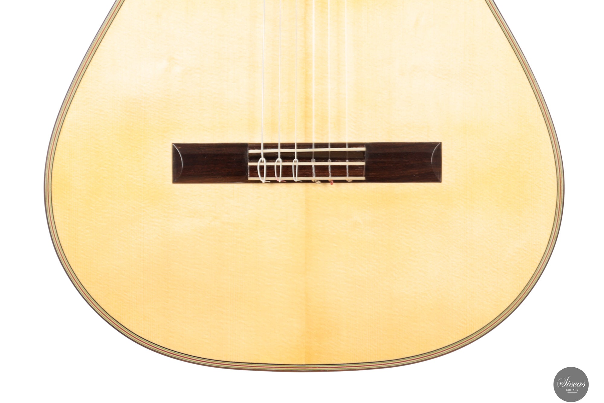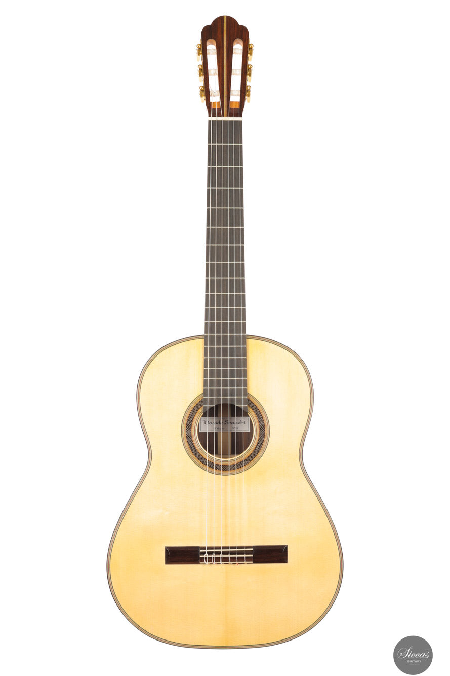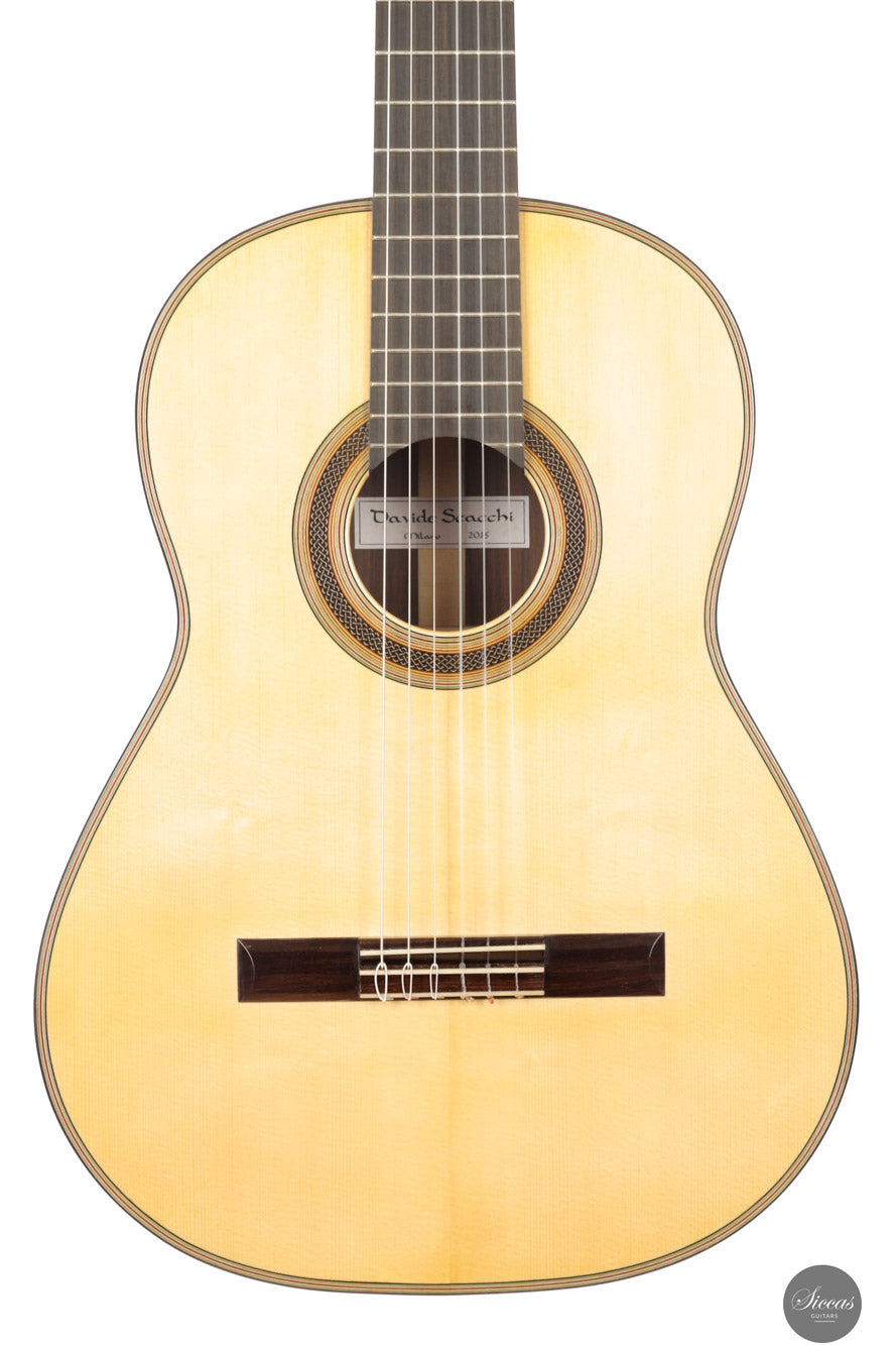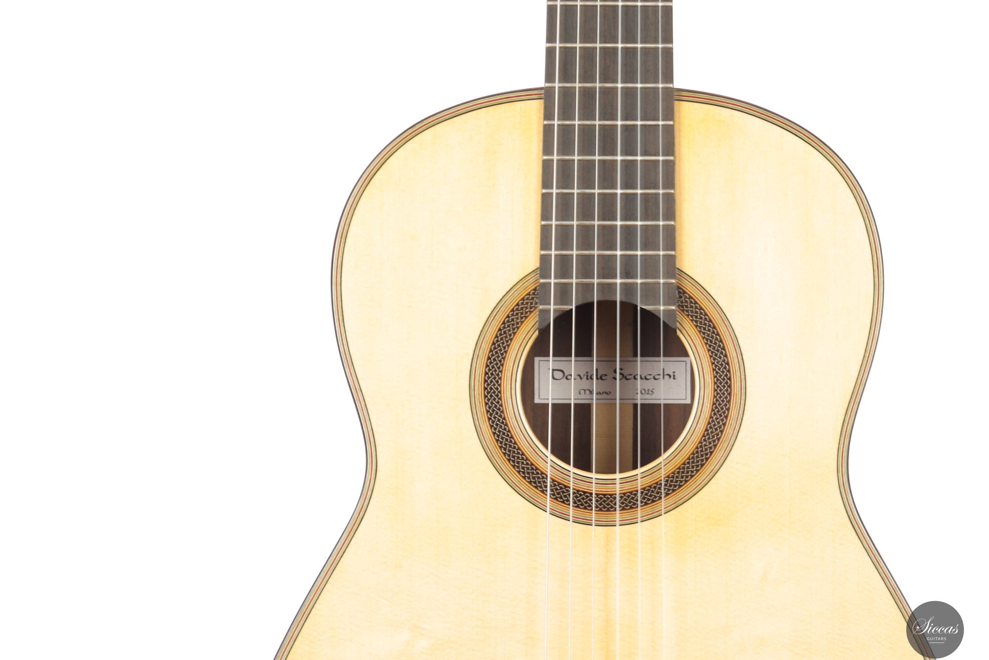 This concert guitar by Davide Scacchi embodies the refined elegance of the Milanese school while presenting a distinctive voice of its own. Exceptionally lightweight, it resonates deeply around F to F#, lending power and depth to its basses while maintaining immediacy and brilliance across the registers. The tone is nuanced, responsive, and alive under the hands, allowing the player to shape phrases with great subtlety and control. Though newly built, the instrument already conveys a maturity and complexity often found in seasoned guitars, with a wide expressive range and balanced projection. Completed with French polish, refined detailing, and Perona tuning machines, it represents both a high-level concert instrument and a clear expression of Scacchi’s artistry.