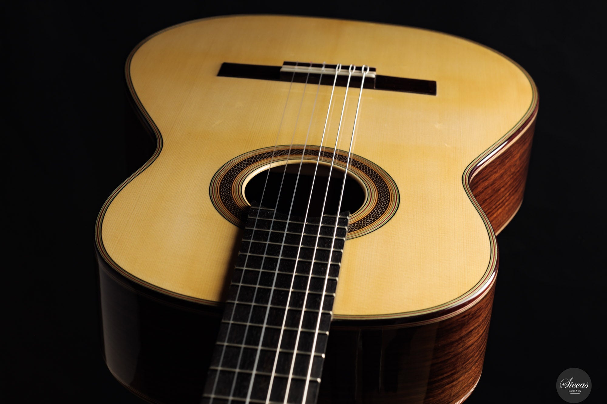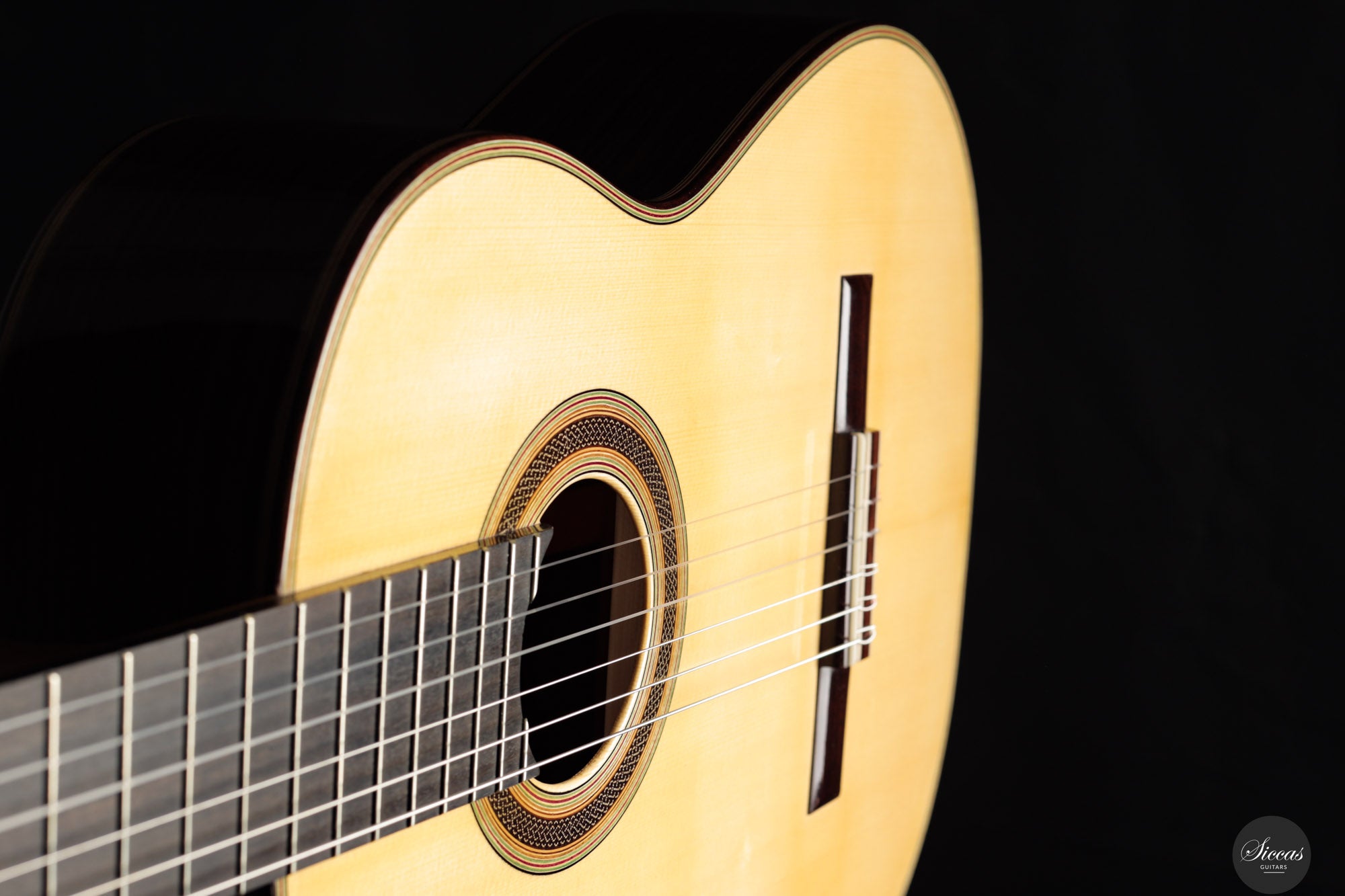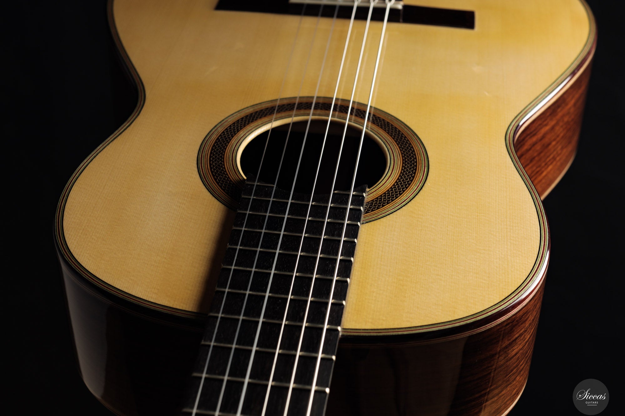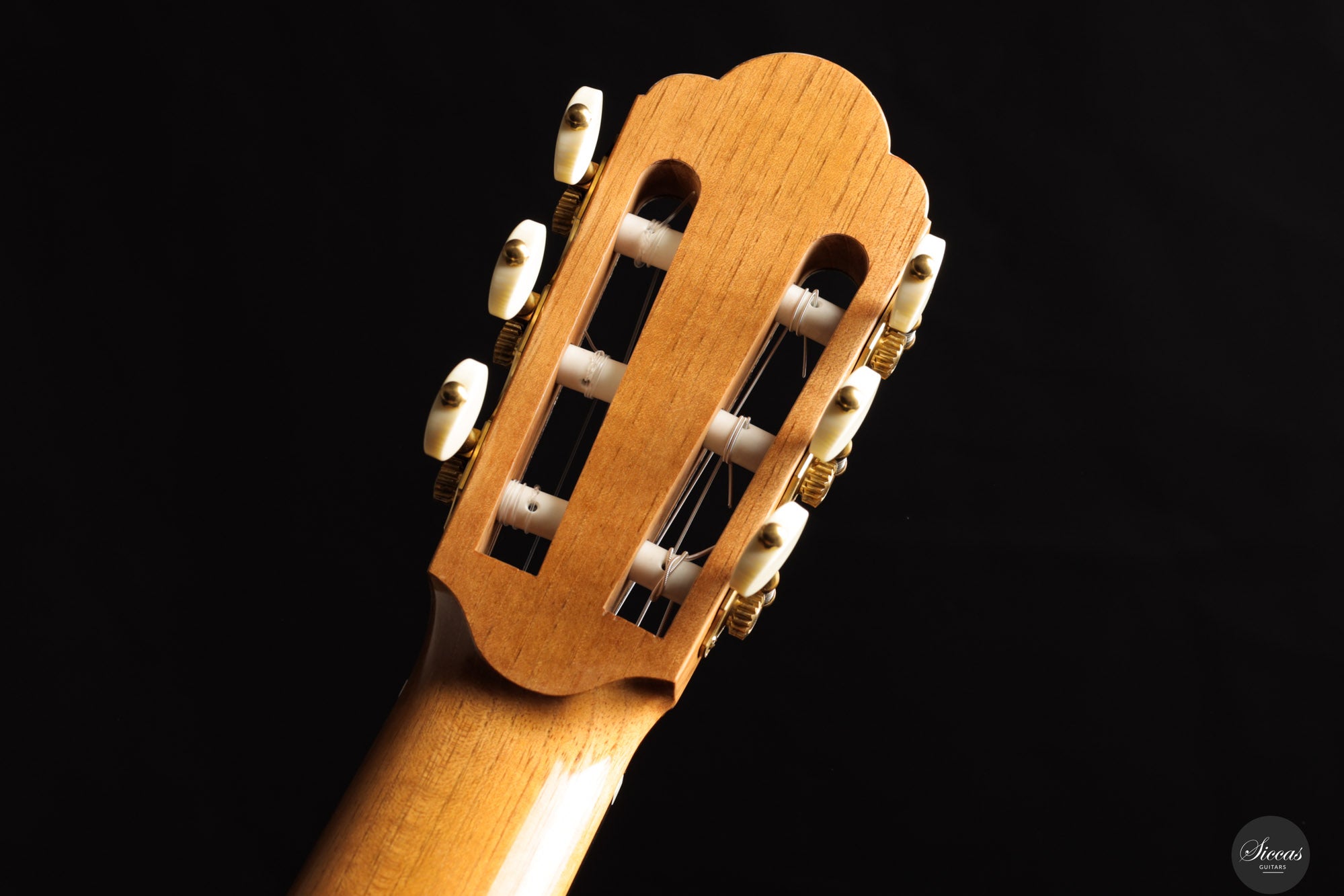 This concert guitar by Davide Scacchi embodies the refined elegance of the Milanese school while presenting a distinctive voice of its own. Exceptionally lightweight, it resonates deeply around F to F#, lending power and depth to its basses while maintaining immediacy and brilliance across the registers. The tone is nuanced, responsive, and alive under the hands, allowing the player to shape phrases with great subtlety and control. Though newly built, the instrument already conveys a maturity and complexity often found in seasoned guitars, with a wide expressive range and balanced projection. Completed with French polish, refined detailing, and Perona tuning machines, it represents both a high-level concert instrument and a clear expression of Scacchi’s artistry.